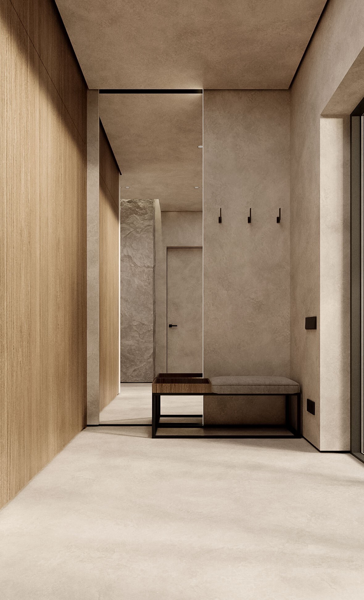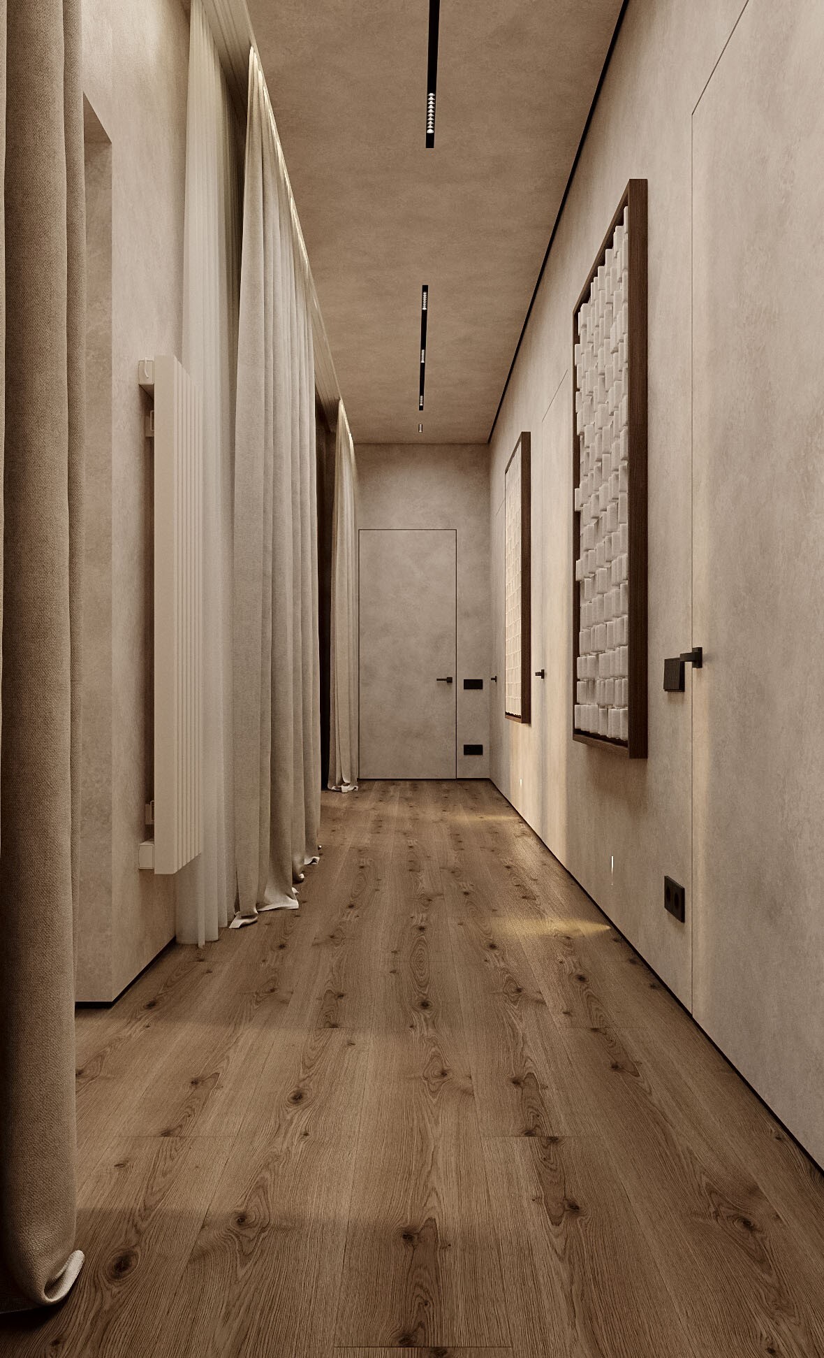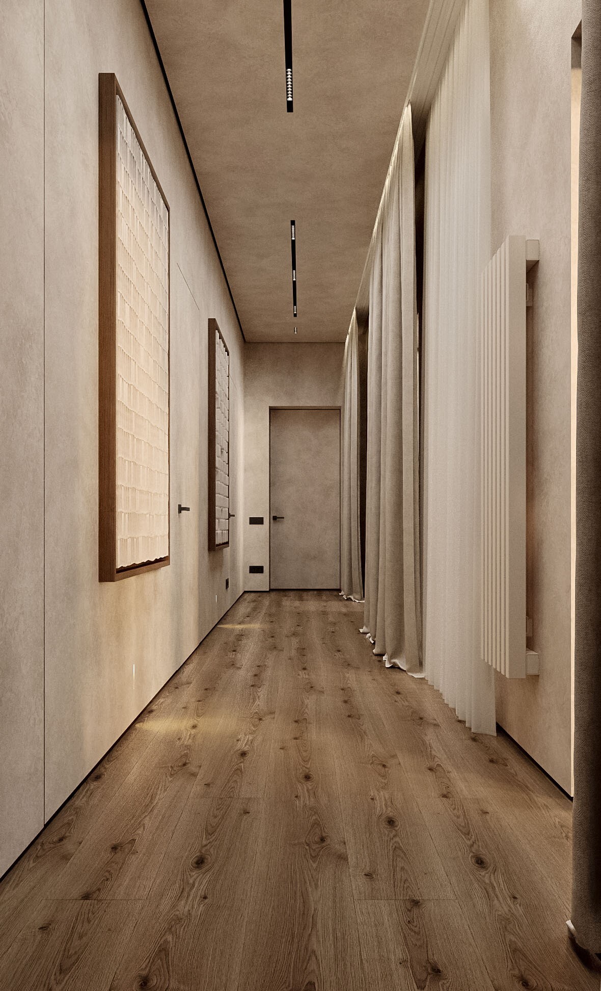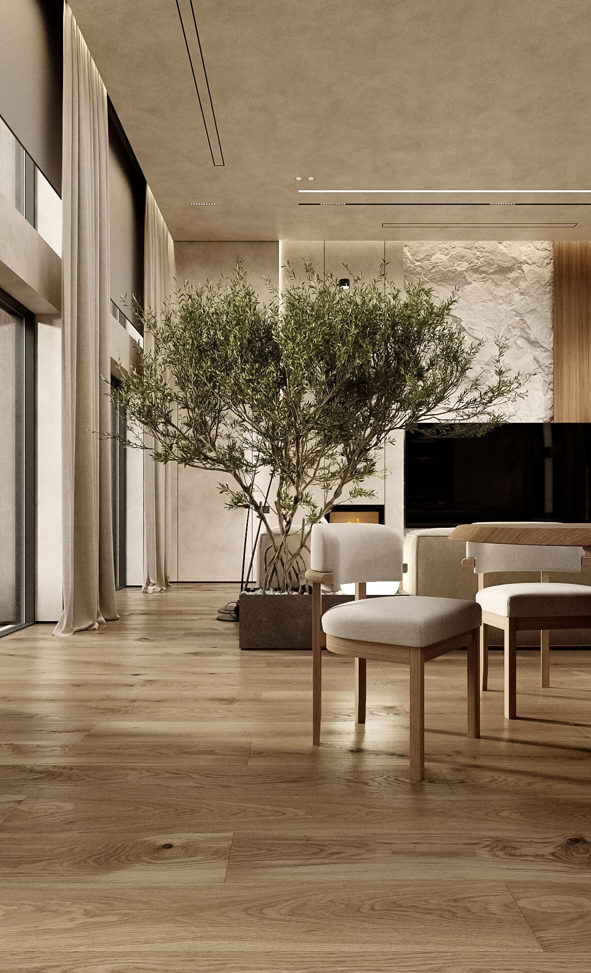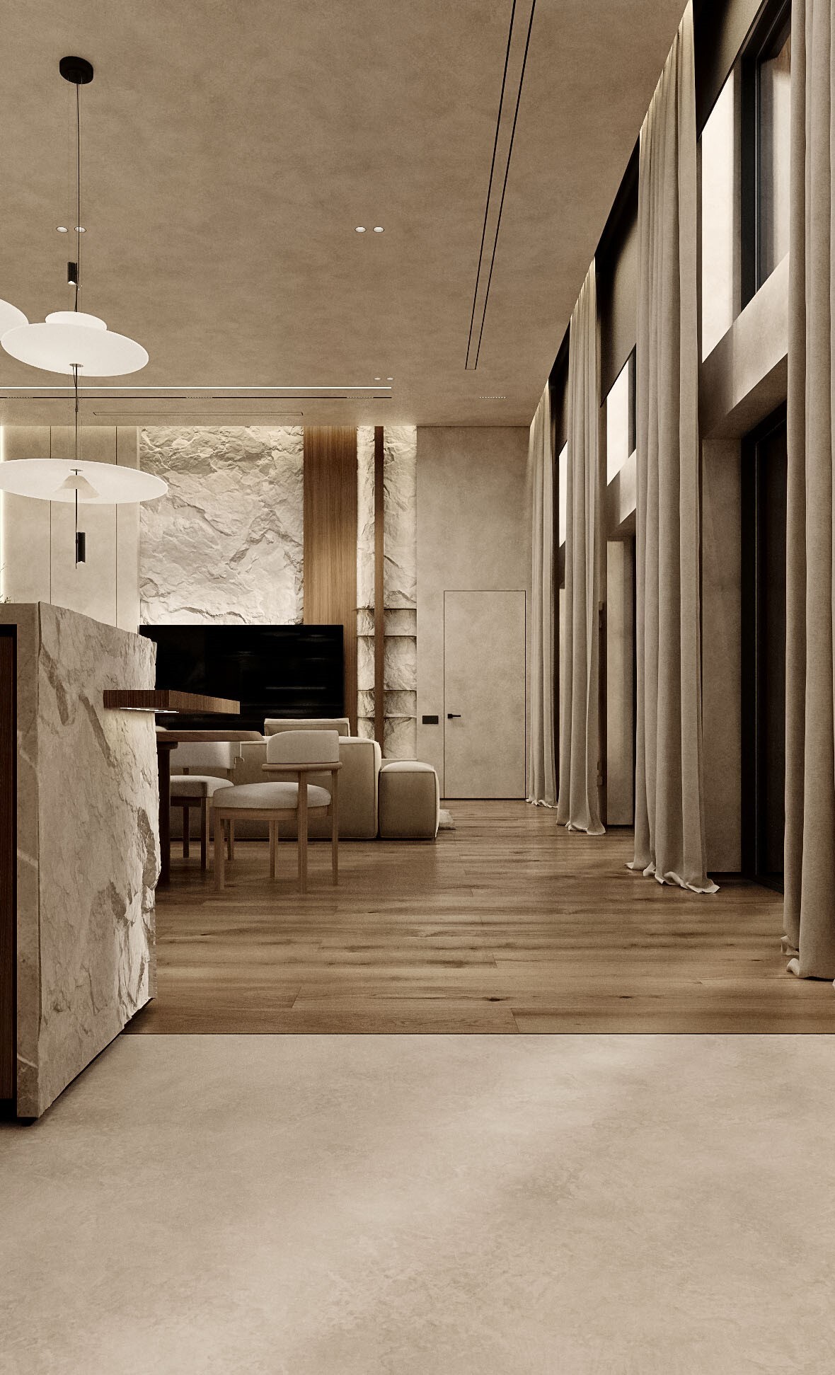 Концепция: В основе проекта — стремление создать вневременное пространство, сочетающее принципы ультра-минимализма, ваби-саби и вдохновение Бали. Главный вызов — интеграция 20 стальных колонн — был решен путем их искусного маскирования. Благодаря доступу к техэтажу и плоской крыше, удалось реализовать гибкую планировку, установить настоящий камин и создать уникальный зимний сад с зенитным окном. Каждый элемент, от скрытых систем хранения до инновационных инженерных решений, подчеркивает философию чистоты форм и функциональности. В отделке использованы исключительно натуральные материалы: фактурный шпон дуба, светлый паркет, микроцемент, травертин и обожженное дерево, создающие богатую тактильную палитру.