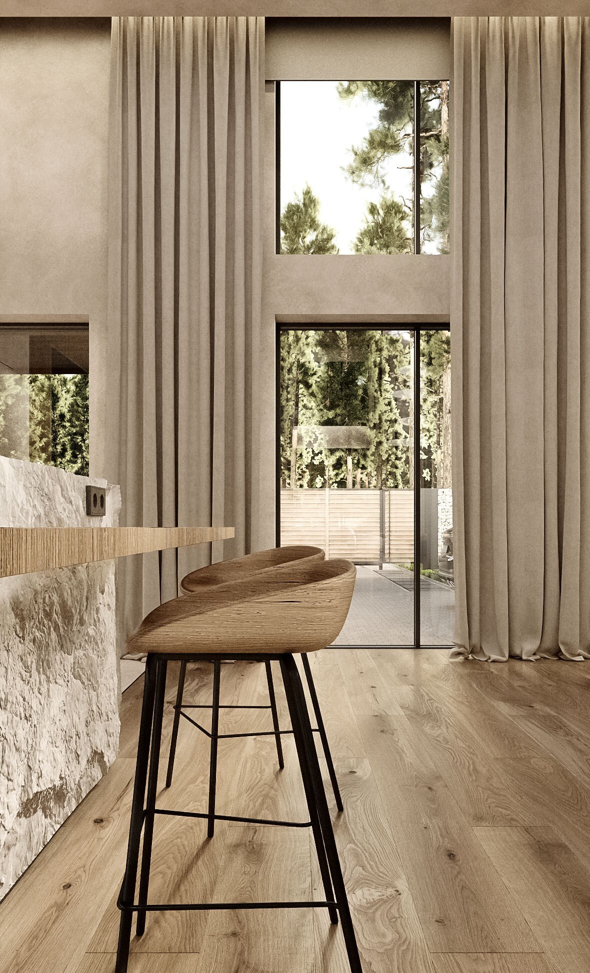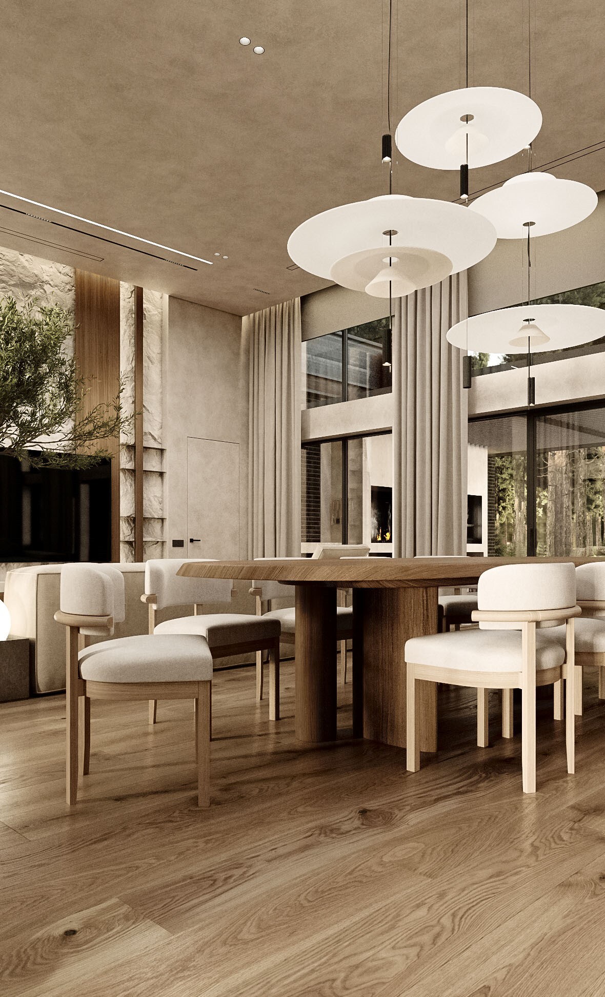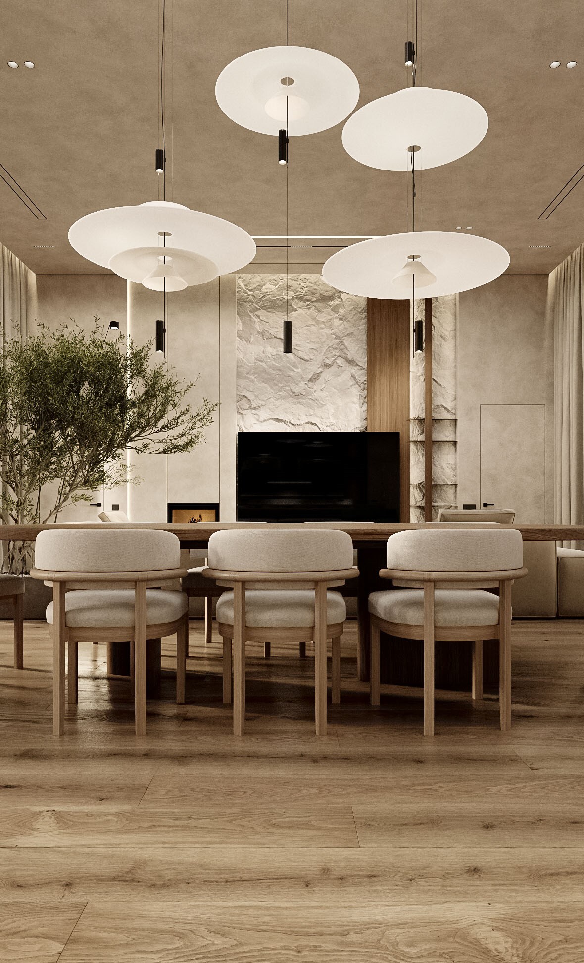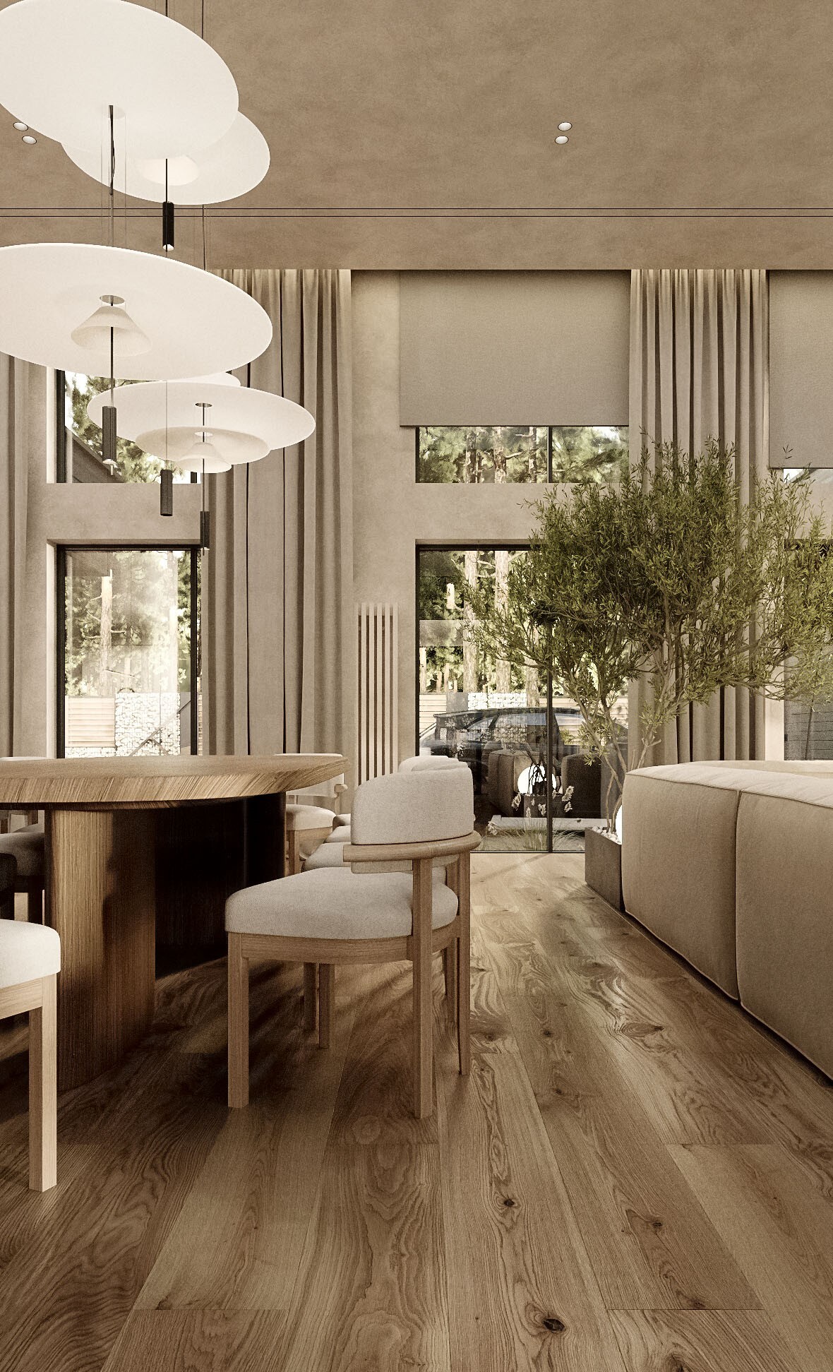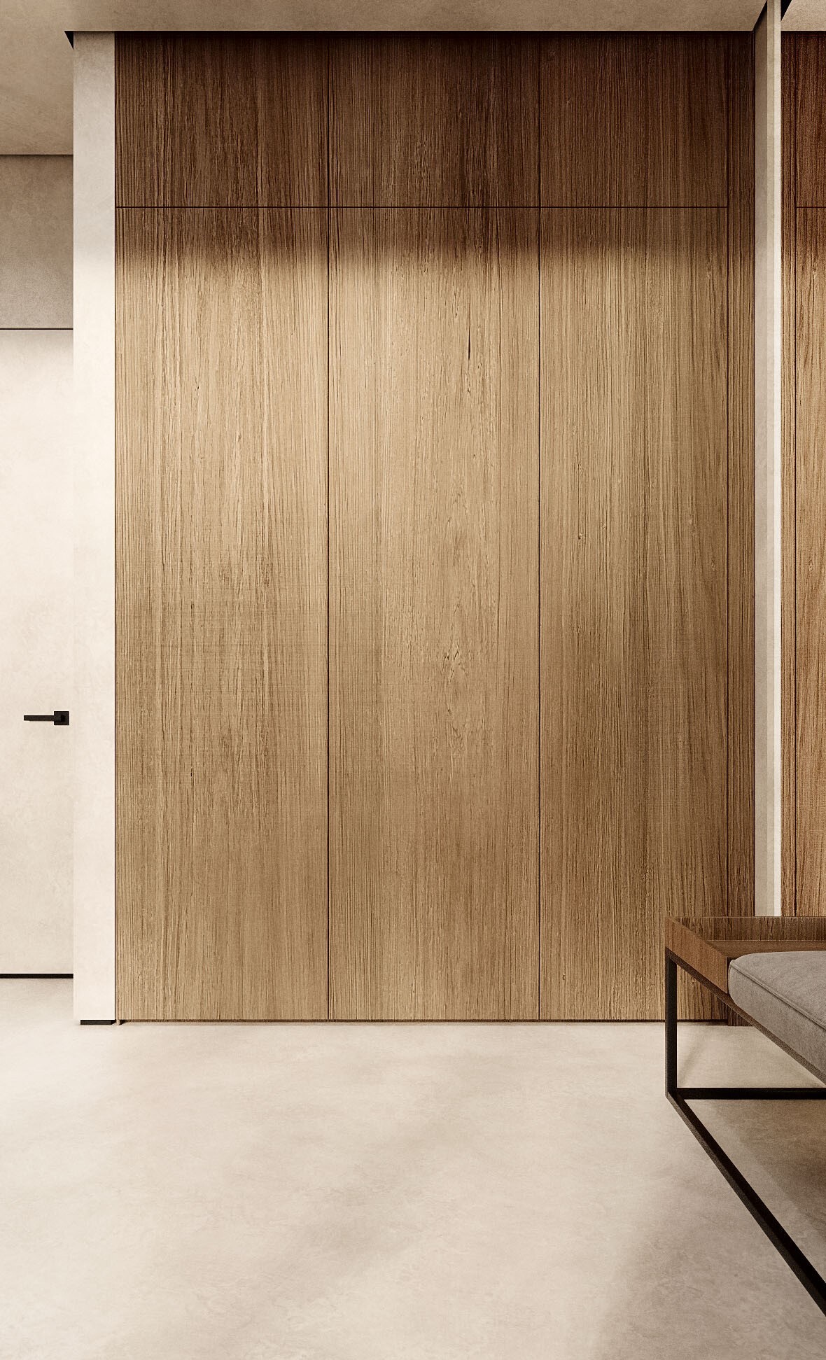 Концепция: В основе проекта — стремление создать вневременное пространство, сочетающее принципы ультра-минимализма, ваби-саби и вдохновение Бали. Главный вызов — интеграция 20 стальных колонн — был решен путем их искусного маскирования. Благодаря доступу к техэтажу и плоской крыше, удалось реализовать гибкую планировку, установить настоящий камин и создать уникальный зимний сад с зенитным окном. Каждый элемент, от скрытых систем хранения до инновационных инженерных решений, подчеркивает философию чистоты форм и функциональности. В отделке использованы исключительно натуральные материалы: фактурный шпон дуба, светлый паркет, микроцемент, травертин и обожженное дерево, создающие богатую тактильную палитру.