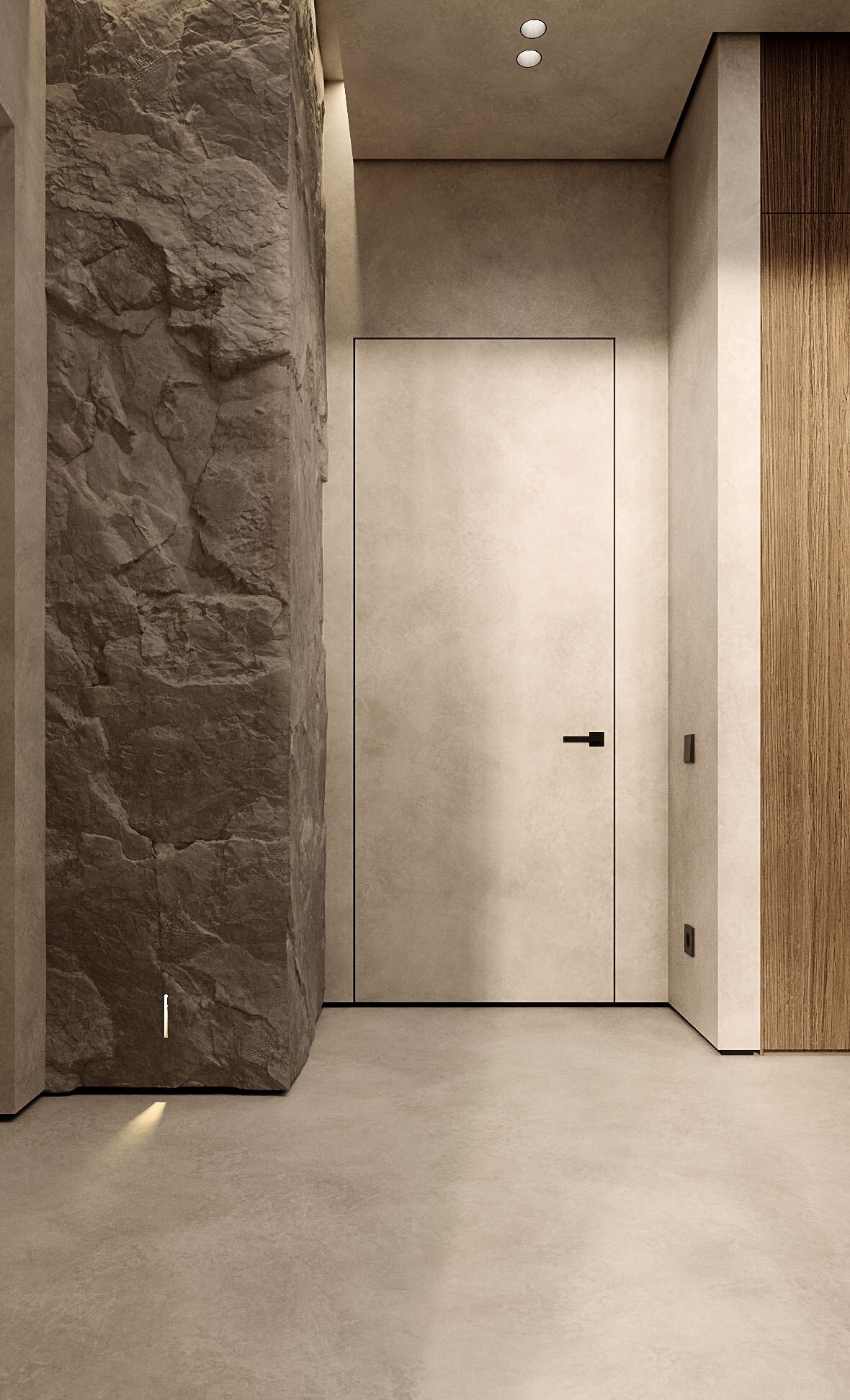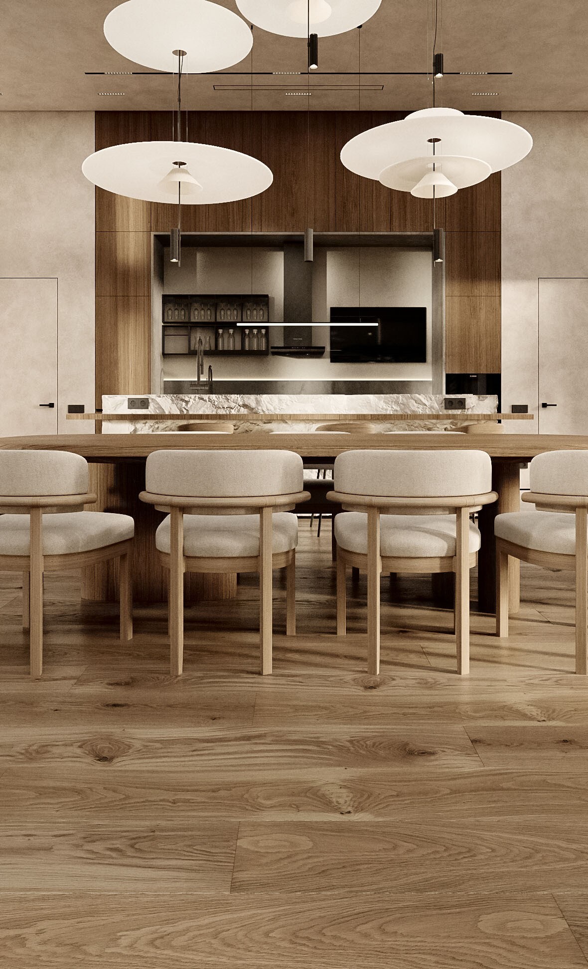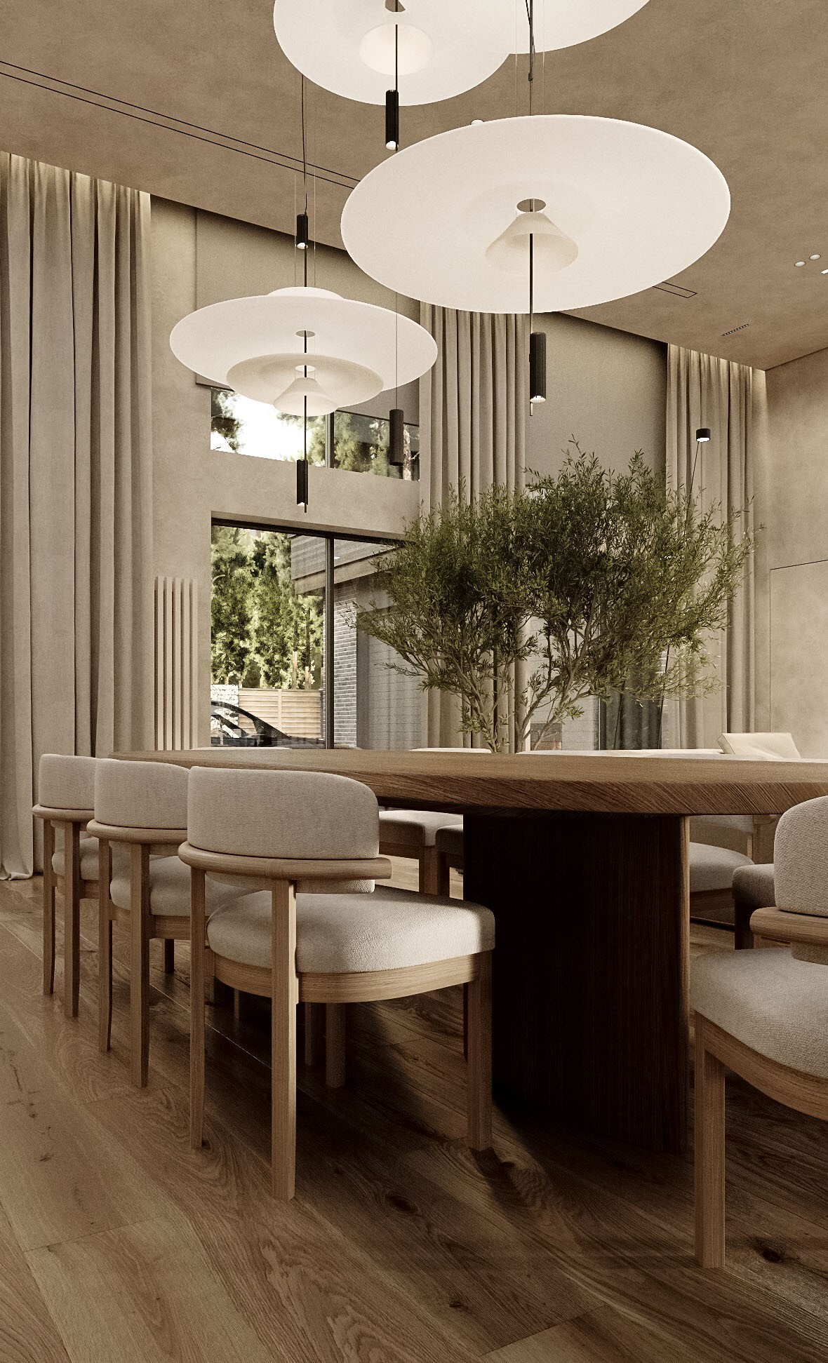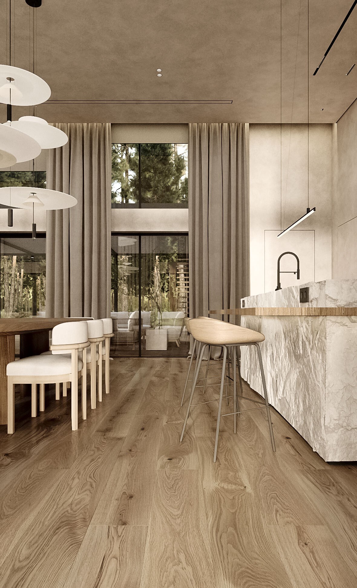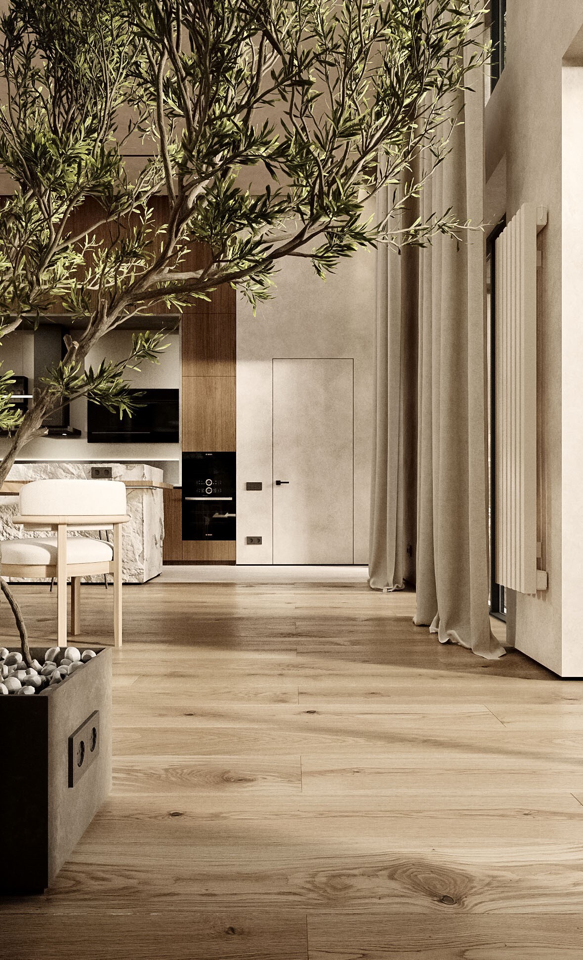 Концепция: В основе проекта — стремление создать вневременное пространство, сочетающее принципы ультра-минимализма, ваби-саби и вдохновение Бали. Главный вызов — интеграция 20 стальных колонн — был решен путем их искусного маскирования. Благодаря доступу к техэтажу и плоской крыше, удалось реализовать гибкую планировку, установить настоящий камин и создать уникальный зимний сад с зенитным окном. Каждый элемент, от скрытых систем хранения до инновационных инженерных решений, подчеркивает философию чистоты форм и функциональности. В отделке использованы исключительно натуральные материалы: фактурный шпон дуба, светлый паркет, микроцемент, травертин и обожженное дерево, создающие богатую тактильную палитру.