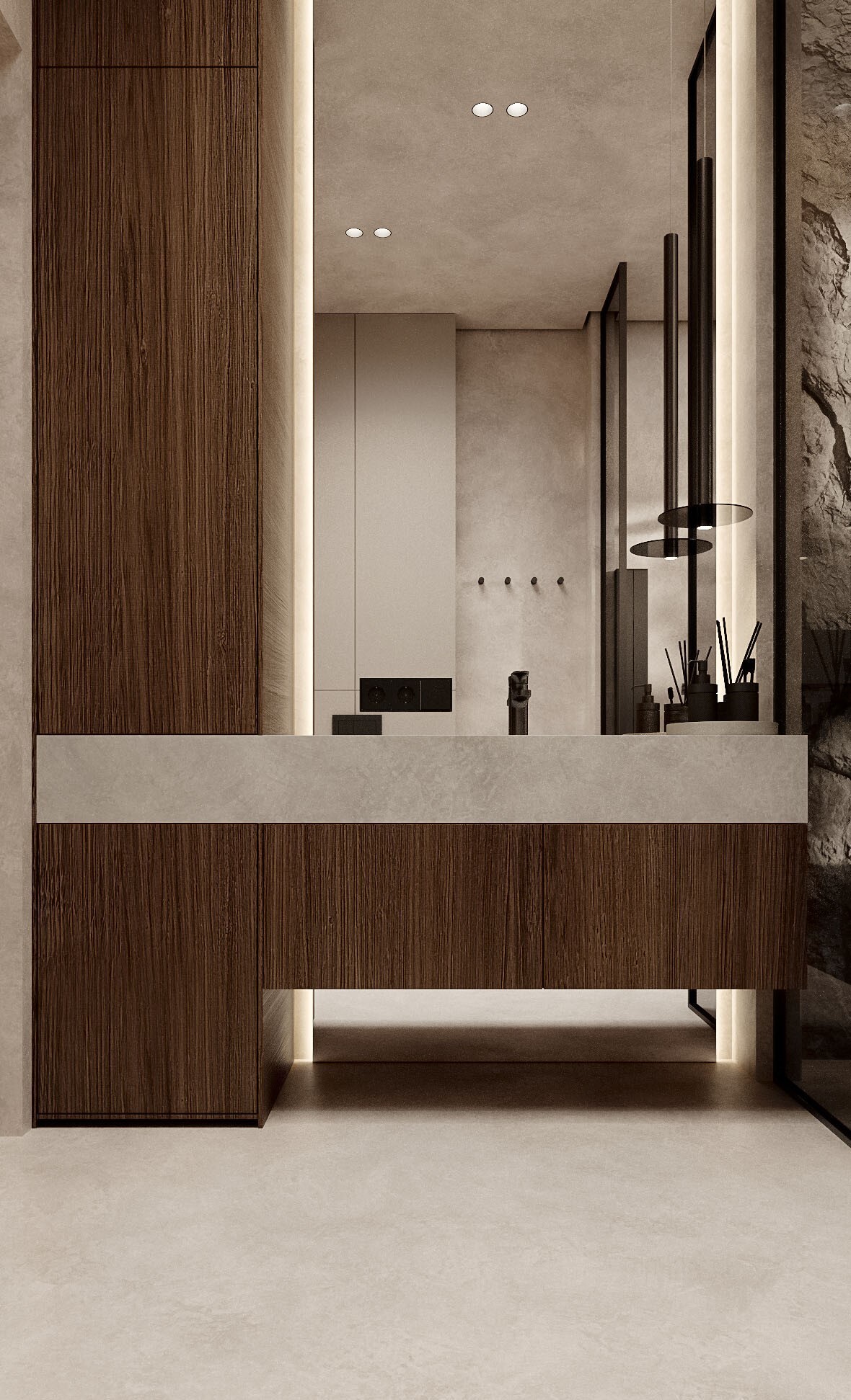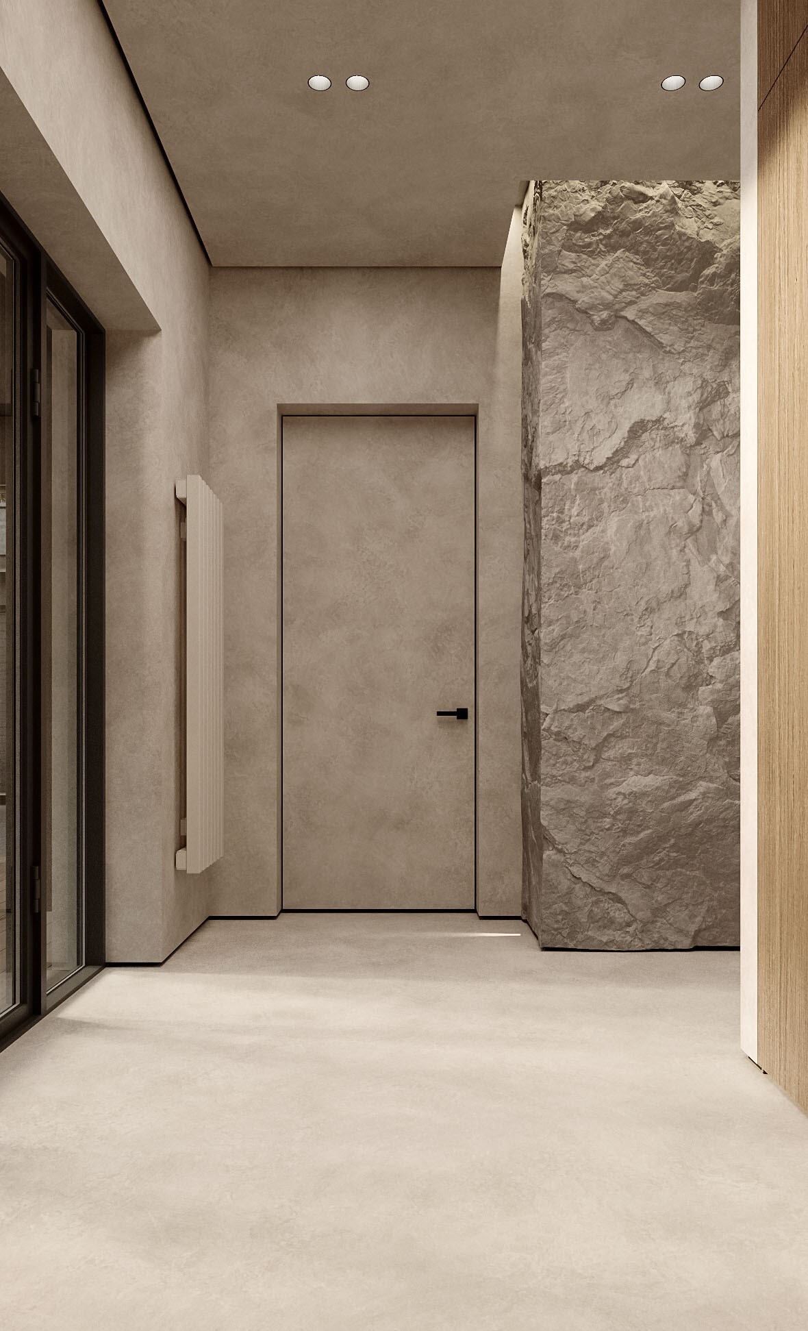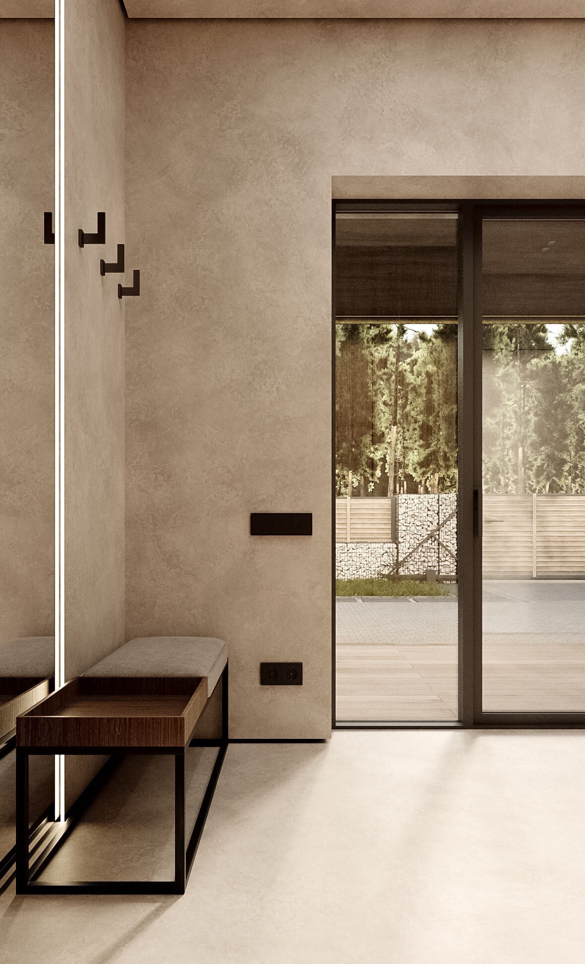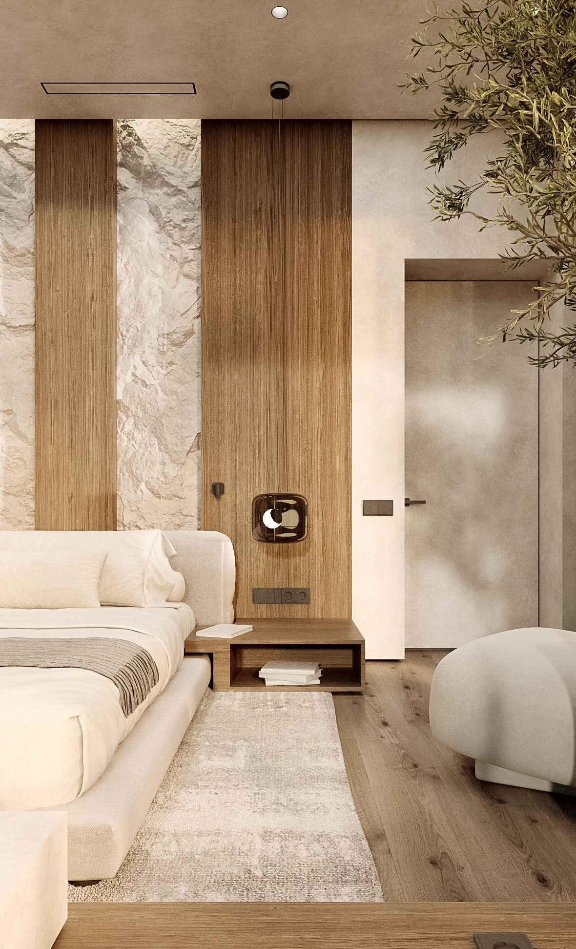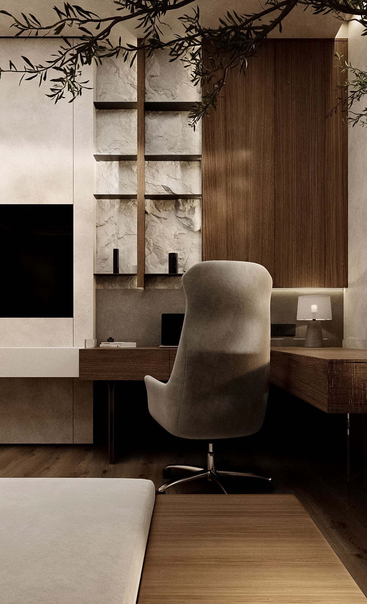 Концепция: В основе проекта — стремление создать вневременное пространство, сочетающее принципы ультра-минимализма, ваби-саби и вдохновение Бали. Главный вызов — интеграция 20 стальных колонн — был решен путем их искусного маскирования. Благодаря доступу к техэтажу и плоской крыше, удалось реализовать гибкую планировку, установить настоящий камин и создать уникальный зимний сад с зенитным окном. Каждый элемент, от скрытых систем хранения до инновационных инженерных решений, подчеркивает философию чистоты форм и функциональности. В отделке использованы исключительно натуральные материалы: фактурный шпон дуба, светлый паркет, микроцемент, травертин и обожженное дерево, создающие богатую тактильную палитру.