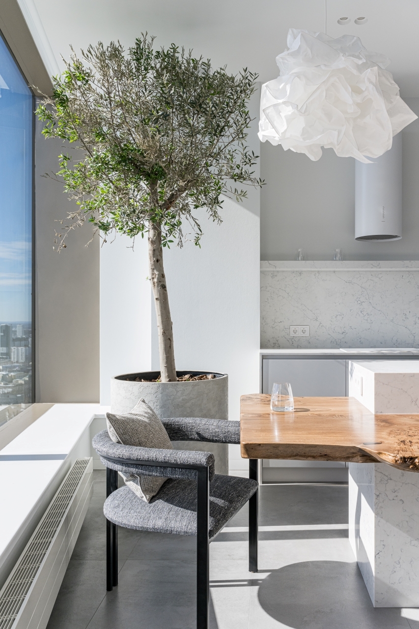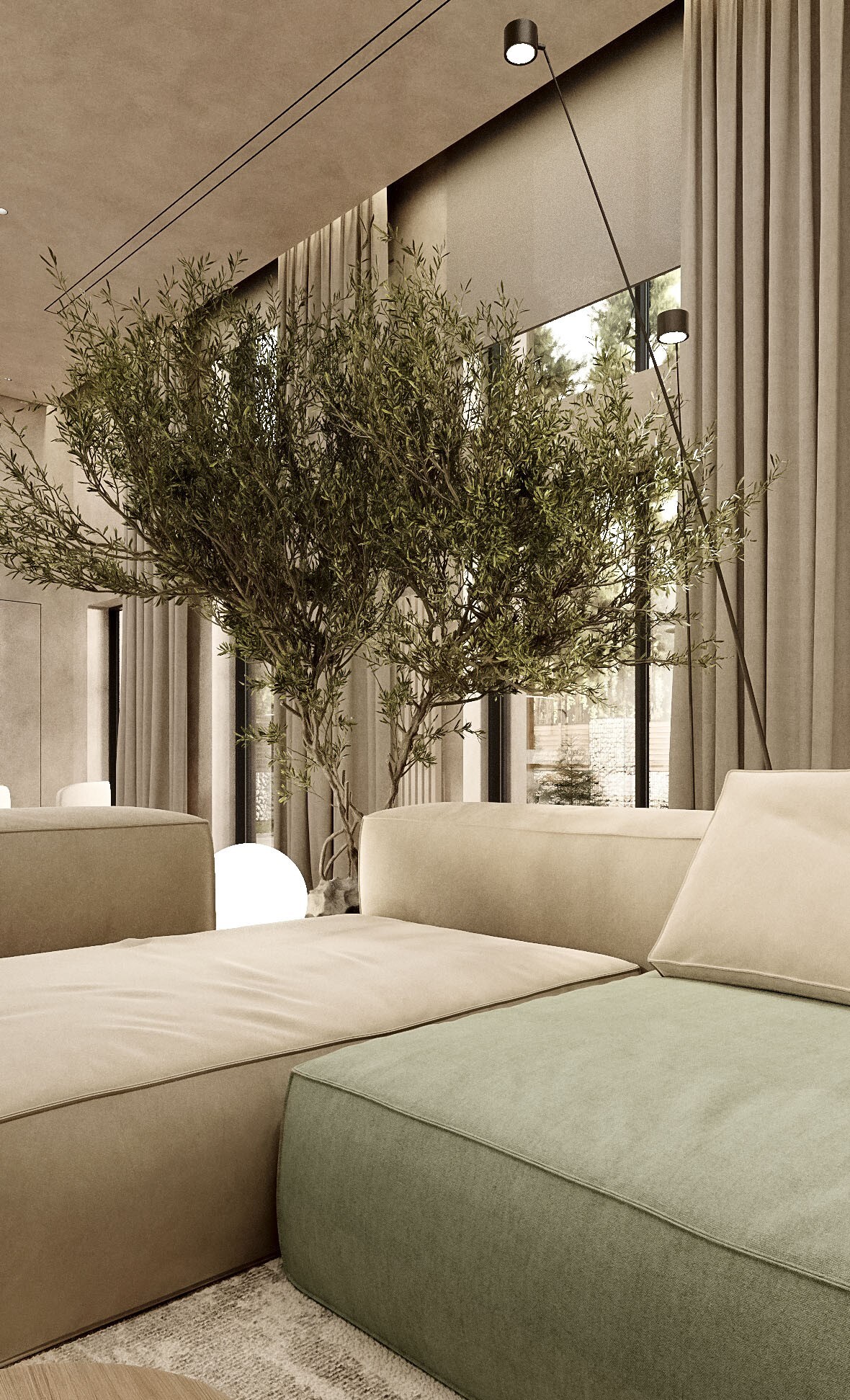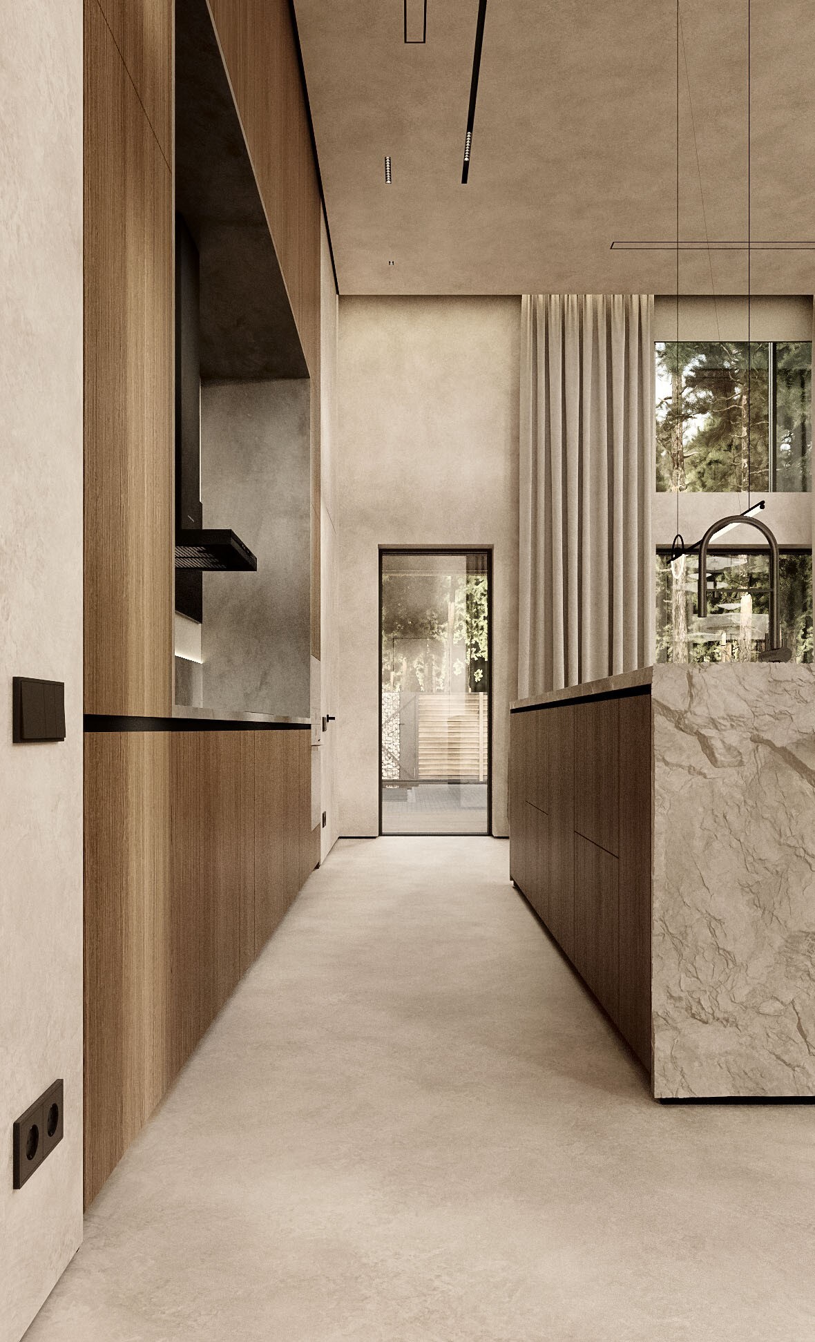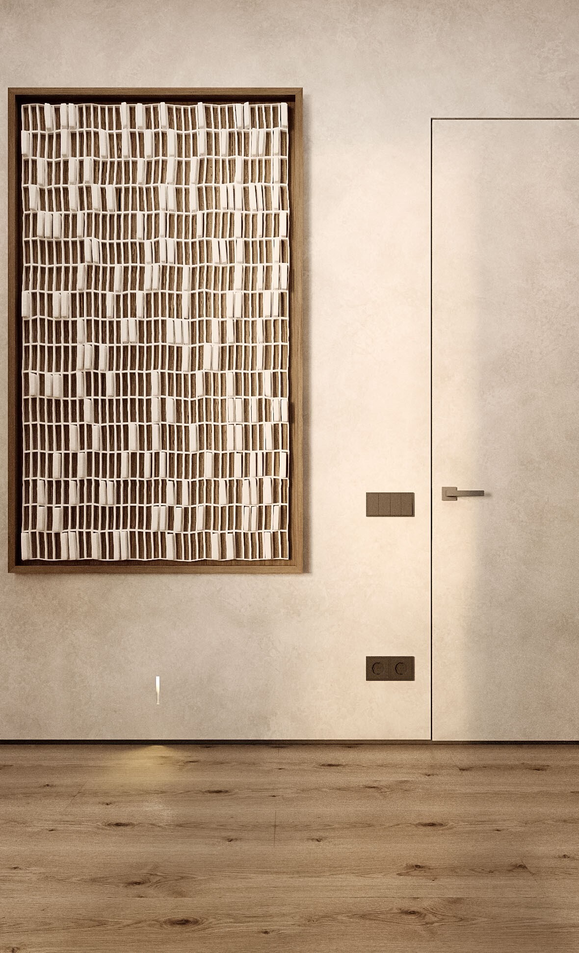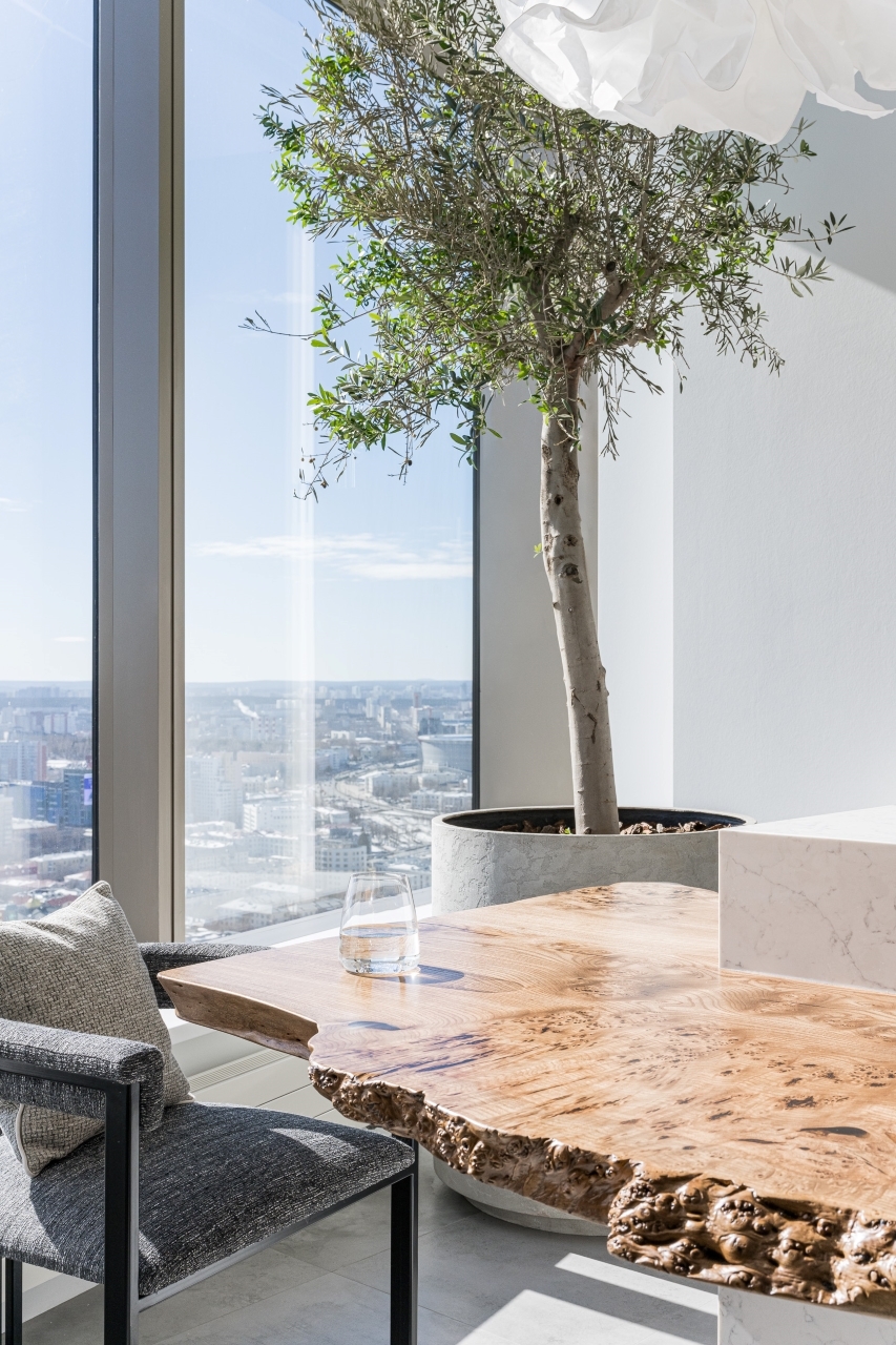 Концепция: В основе проекта — стремление создать вневременное пространство, сочетающее принципы ультра-минимализма, ваби-саби и вдохновение Бали. Главный вызов — интеграция 20 стальных колонн — был решен путем их искусного маскирования. Благодаря доступу к техэтажу и плоской крыше, удалось реализовать гибкую планировку, установить настоящий камин и создать уникальный зимний сад с зенитным окном. Каждый элемент, от скрытых систем хранения до инновационных инженерных решений, подчеркивает философию чистоты форм и функциональности. В отделке использованы исключительно натуральные материалы: фактурный шпон дуба, светлый паркет, микроцемент, травертин и обожженное дерево, создающие богатую тактильную палитру.