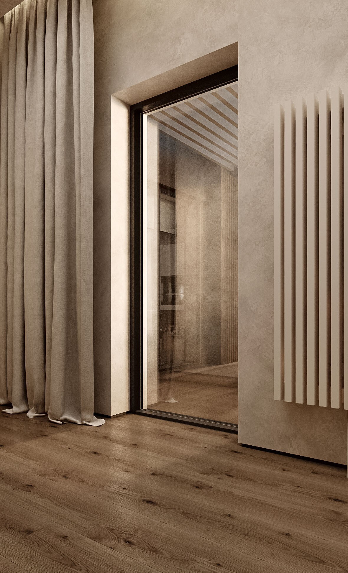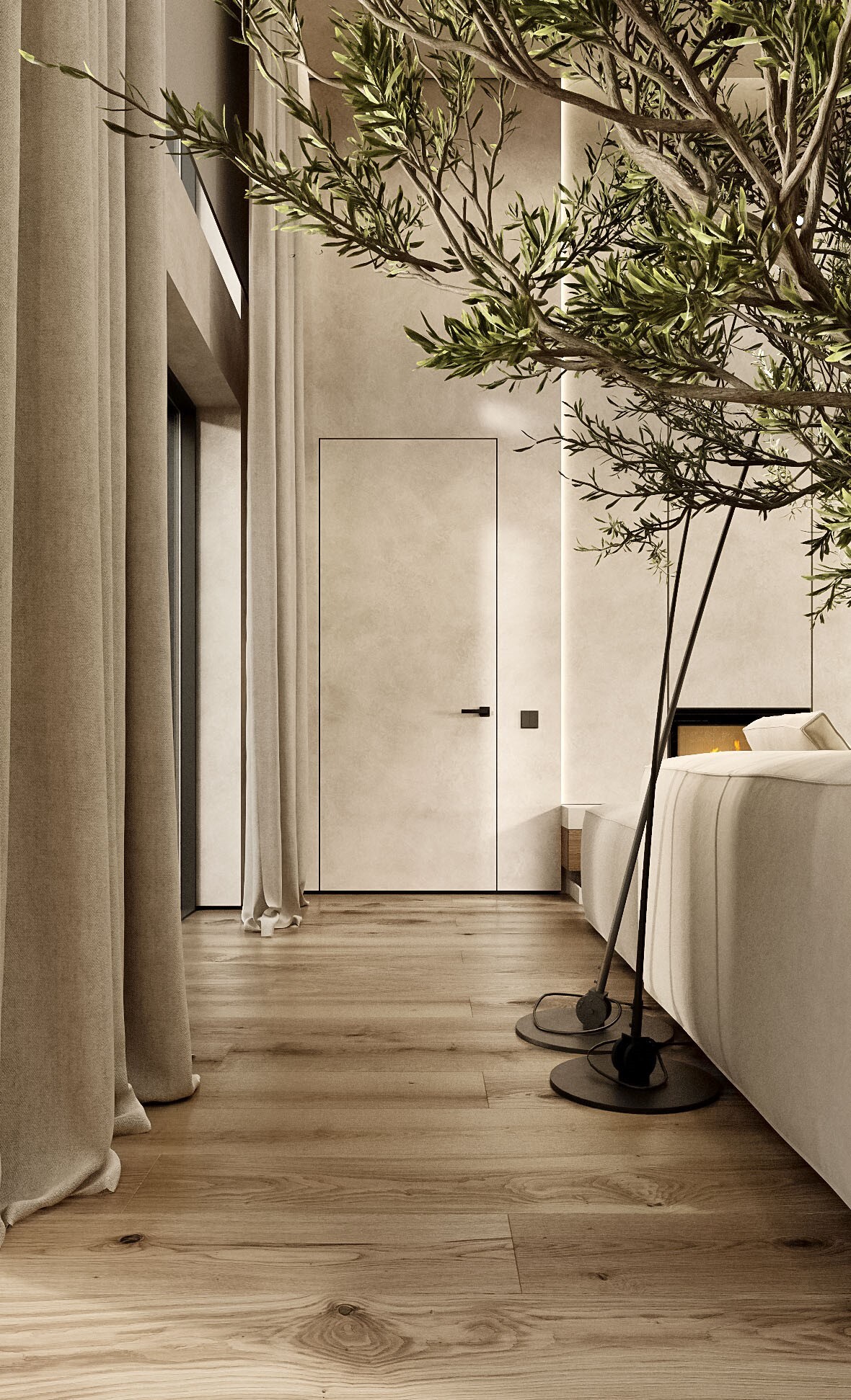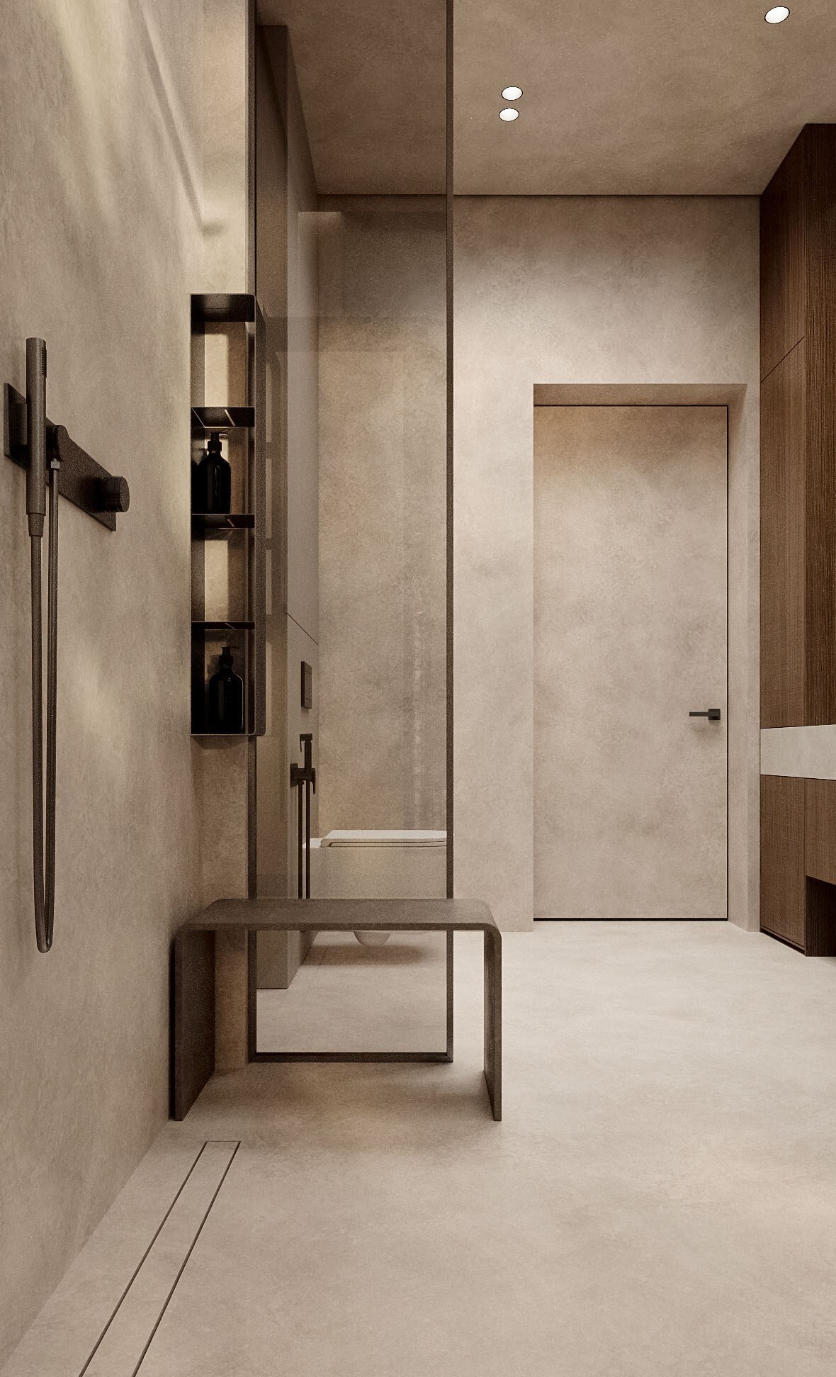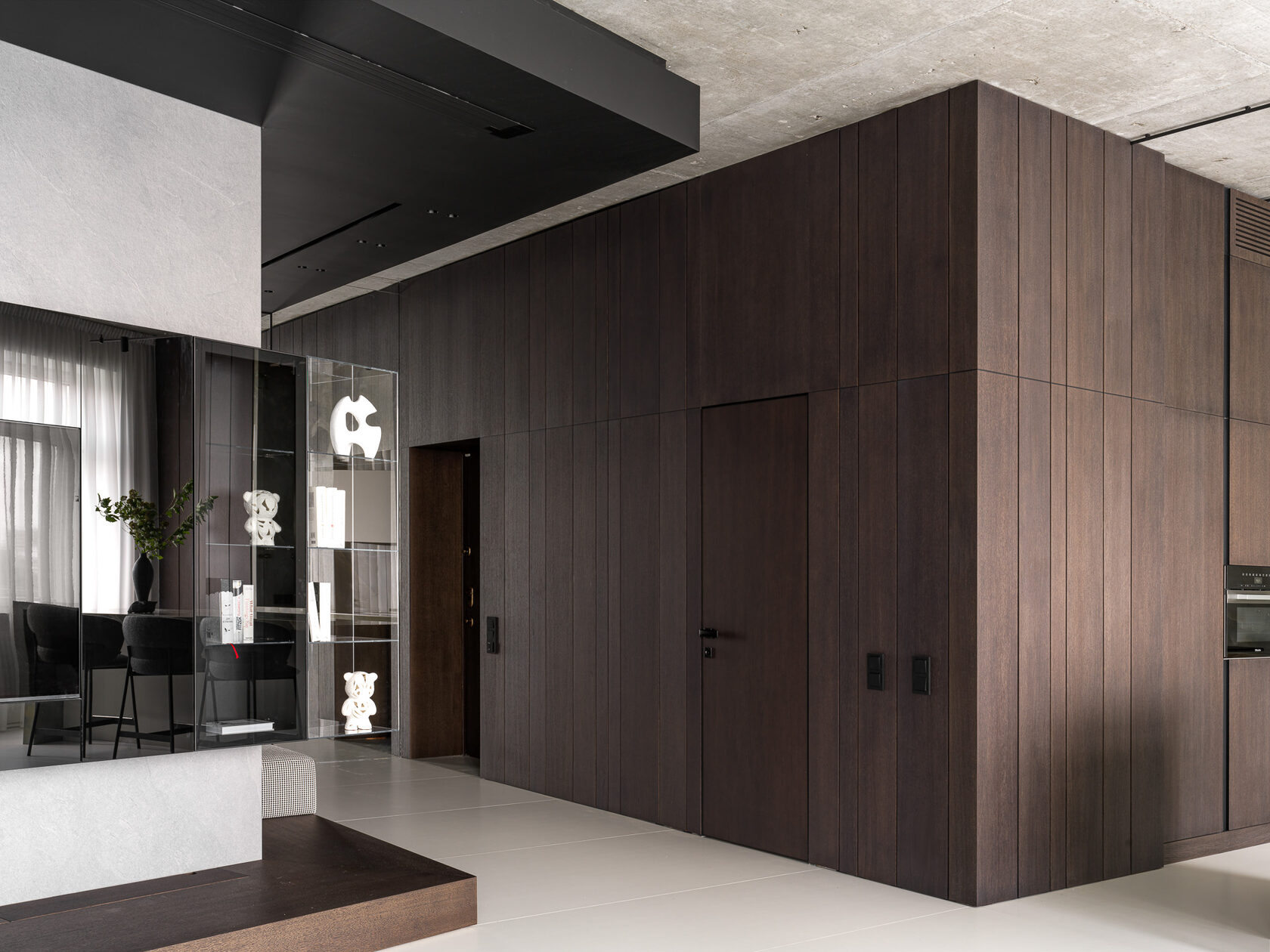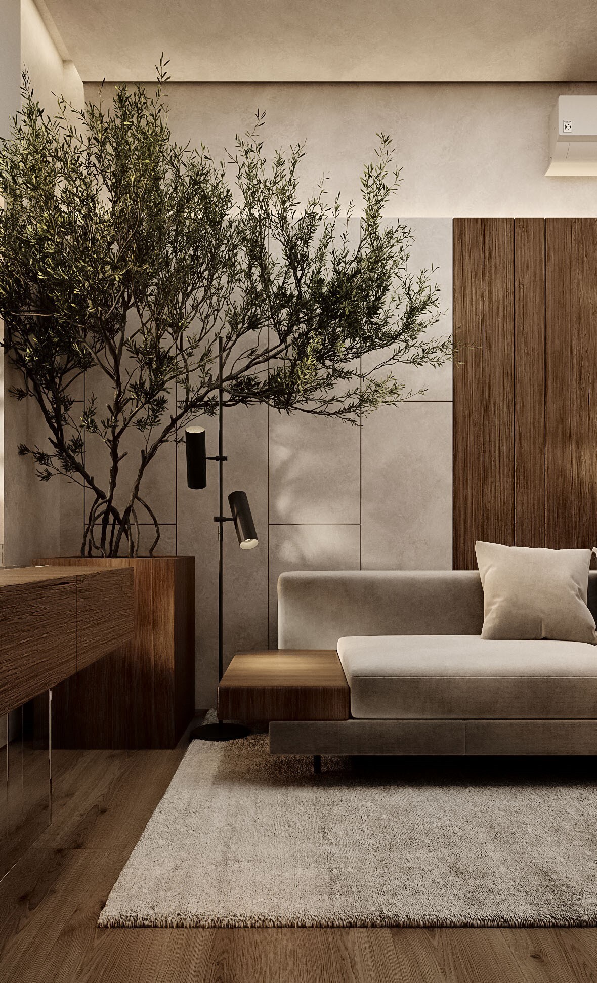 Концепция: В основе проекта — стремление создать вневременное пространство, сочетающее принципы ультра-минимализма, ваби-саби и вдохновение Бали. Главный вызов — интеграция 20 стальных колонн — был решен путем их искусного маскирования. Благодаря доступу к техэтажу и плоской крыше, удалось реализовать гибкую планировку, установить настоящий камин и создать уникальный зимний сад с зенитным окном. Каждый элемент, от скрытых систем хранения до инновационных инженерных решений, подчеркивает философию чистоты форм и функциональности. В отделке использованы исключительно натуральные материалы: фактурный шпон дуба, светлый паркет, микроцемент, травертин и обожженное дерево, создающие богатую тактильную палитру.