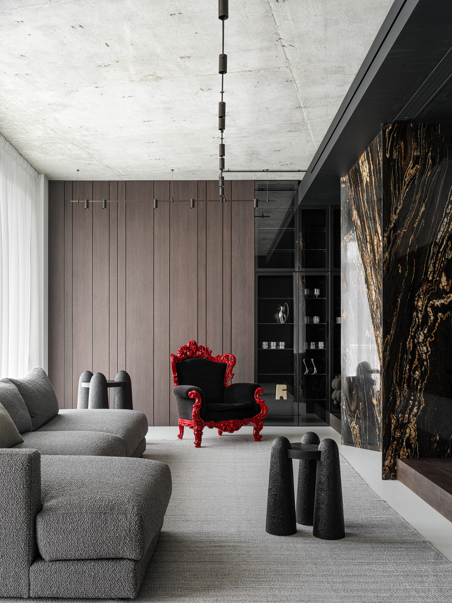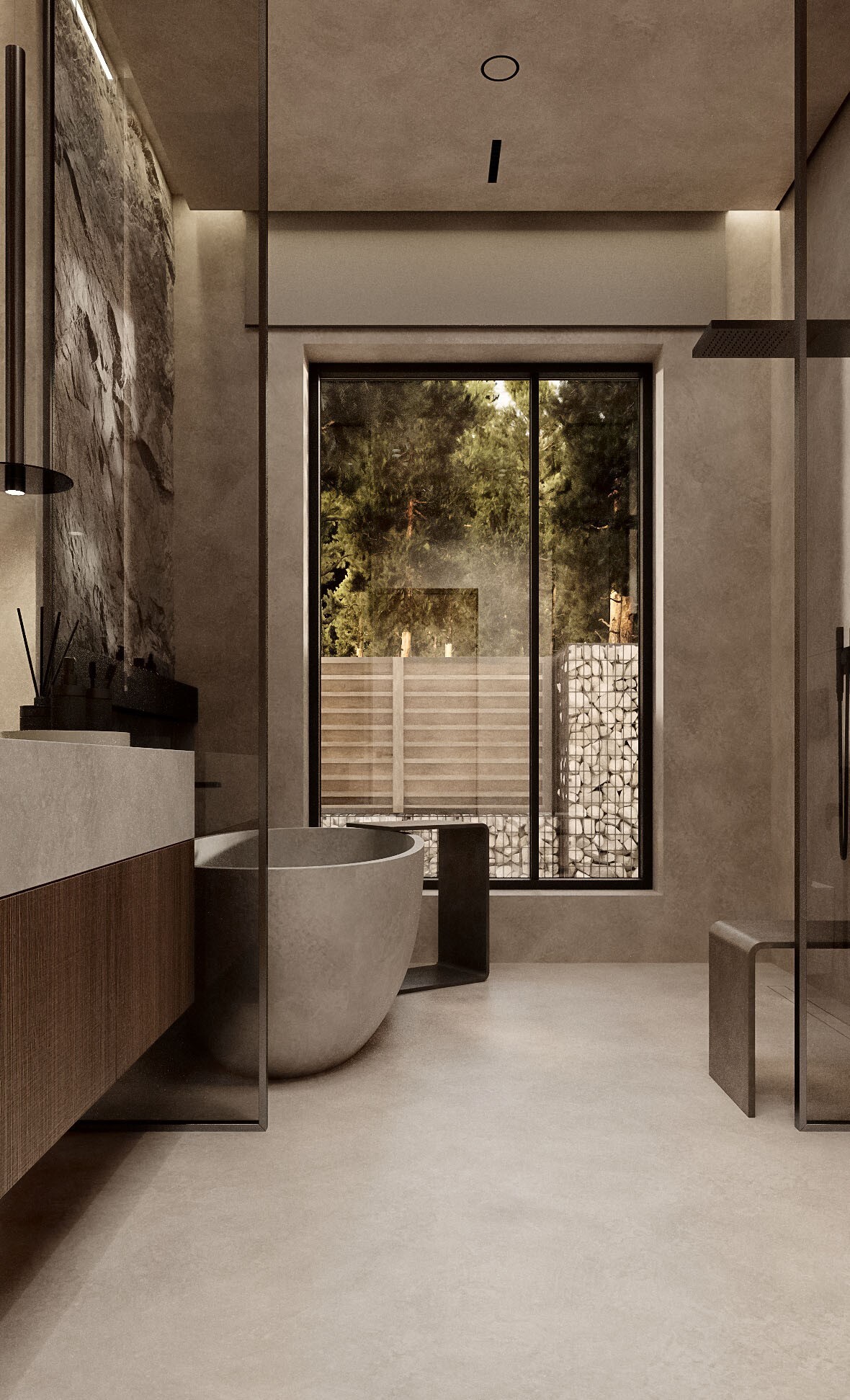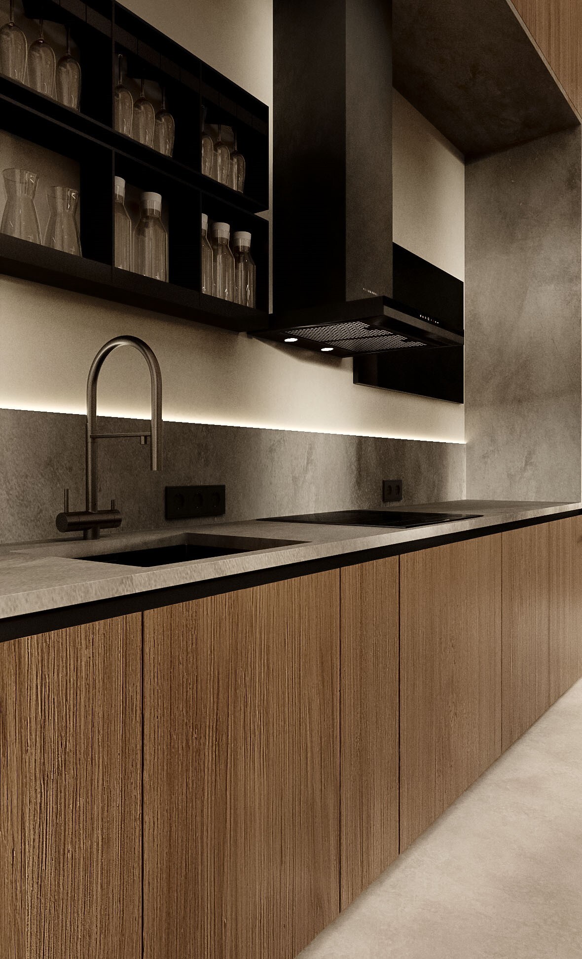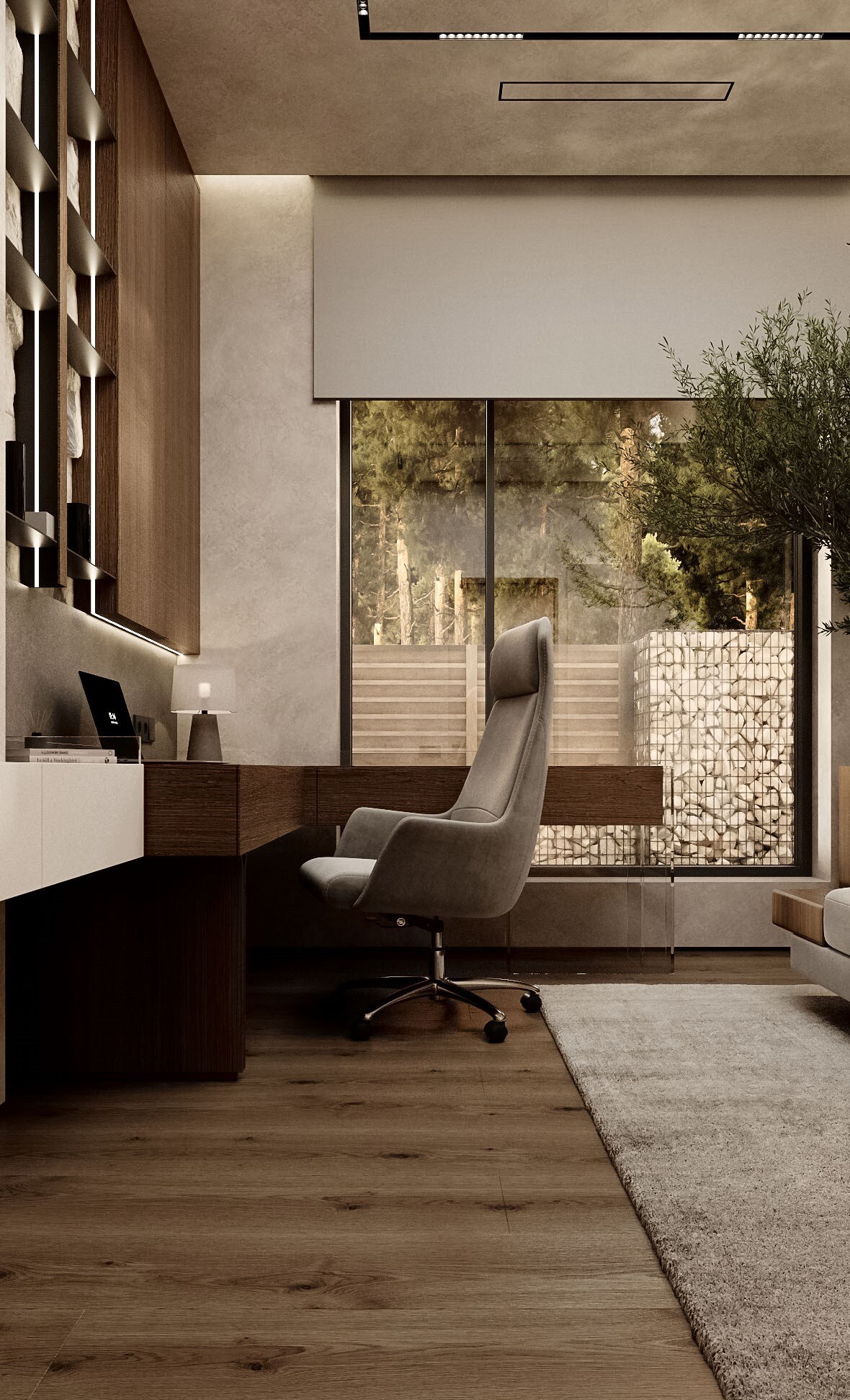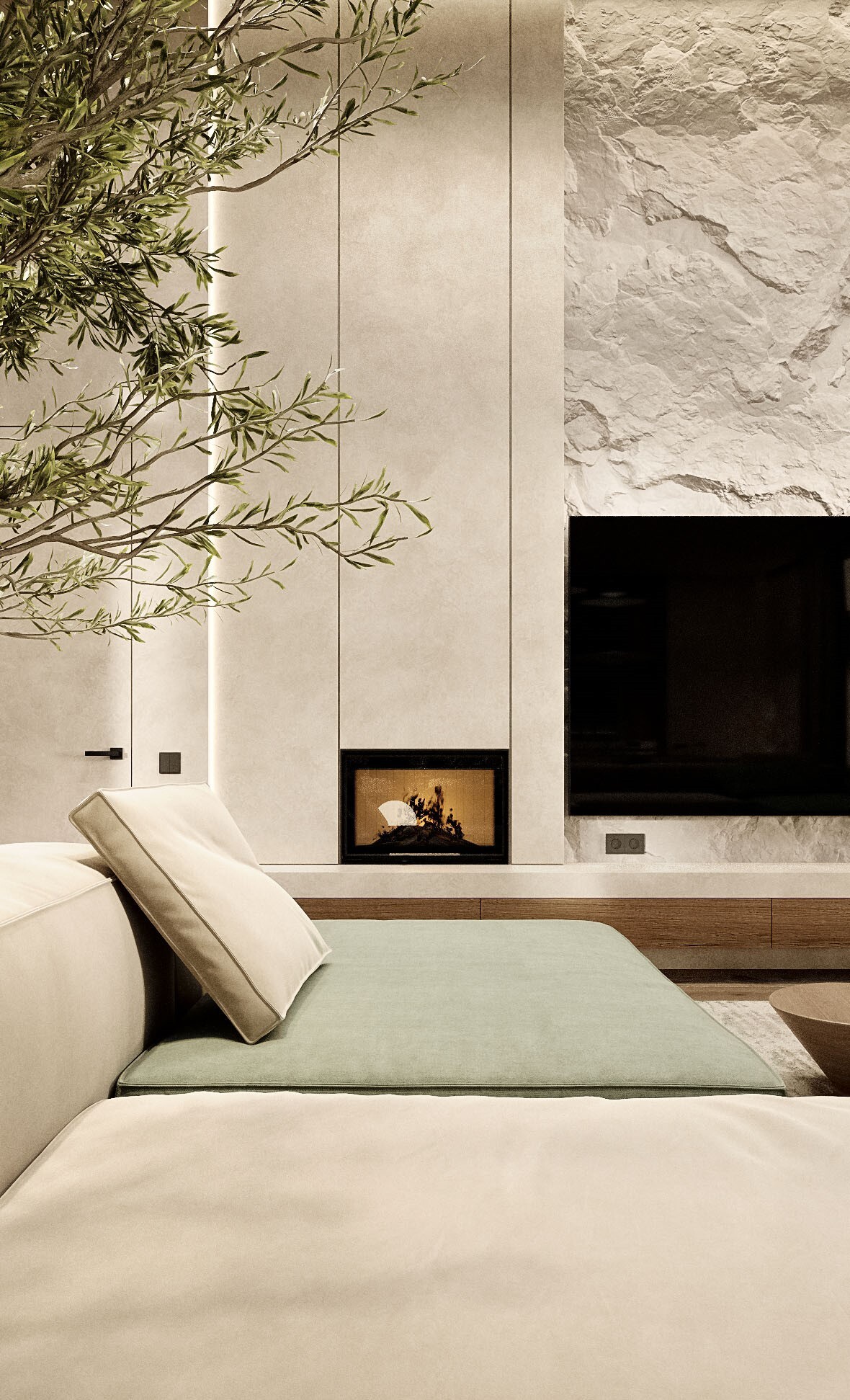 Концепция: В основе проекта — стремление создать вневременное пространство, сочетающее принципы ультра-минимализма, ваби-саби и вдохновение Бали. Главный вызов — интеграция 20 стальных колонн — был решен путем их искусного маскирования. Благодаря доступу к техэтажу и плоской крыше, удалось реализовать гибкую планировку, установить настоящий камин и создать уникальный зимний сад с зенитным окном. Каждый элемент, от скрытых систем хранения до инновационных инженерных решений, подчеркивает философию чистоты форм и функциональности. В отделке использованы исключительно натуральные материалы: фактурный шпон дуба, светлый паркет, микроцемент, травертин и обожженное дерево, создающие богатую тактильную палитру.