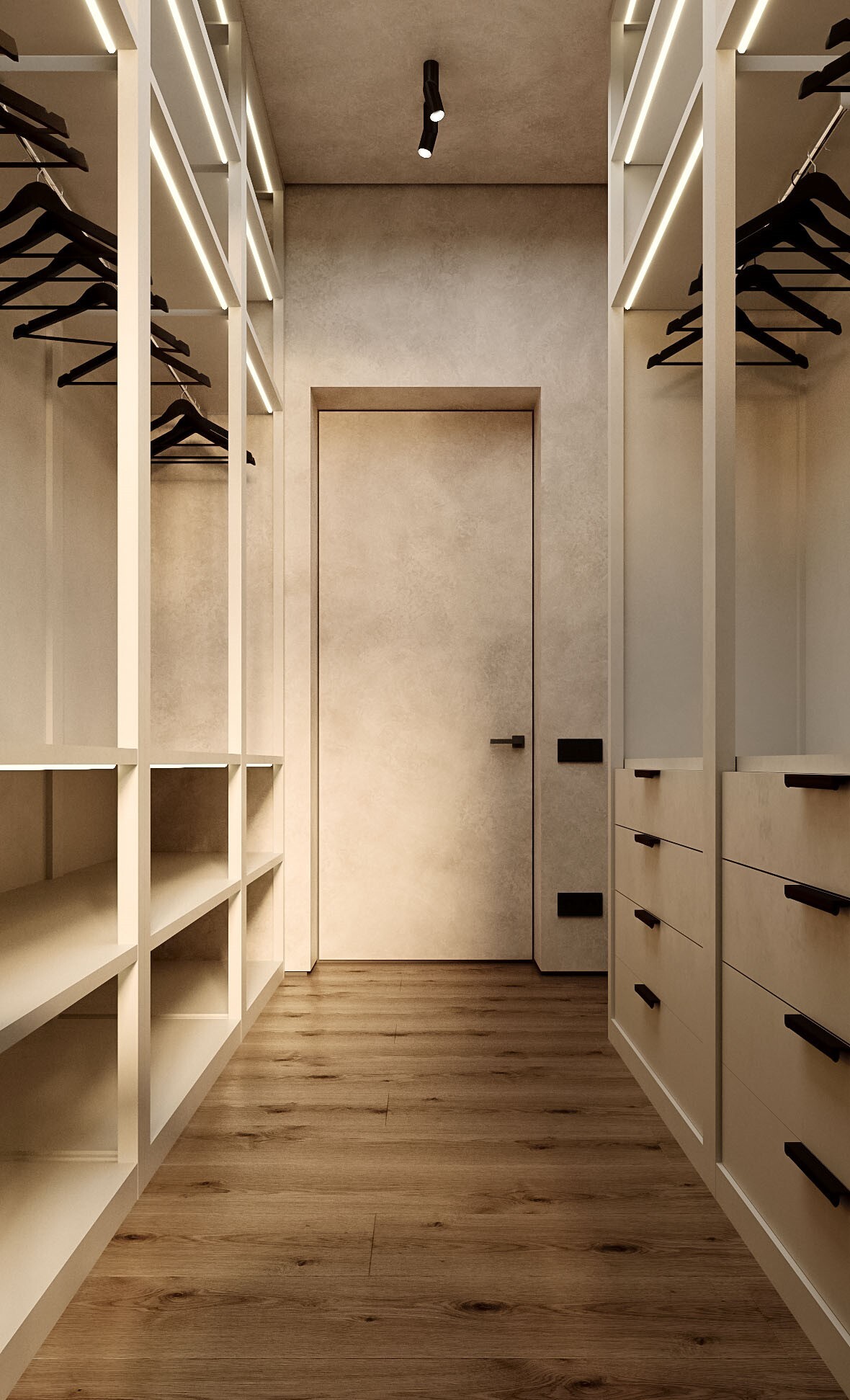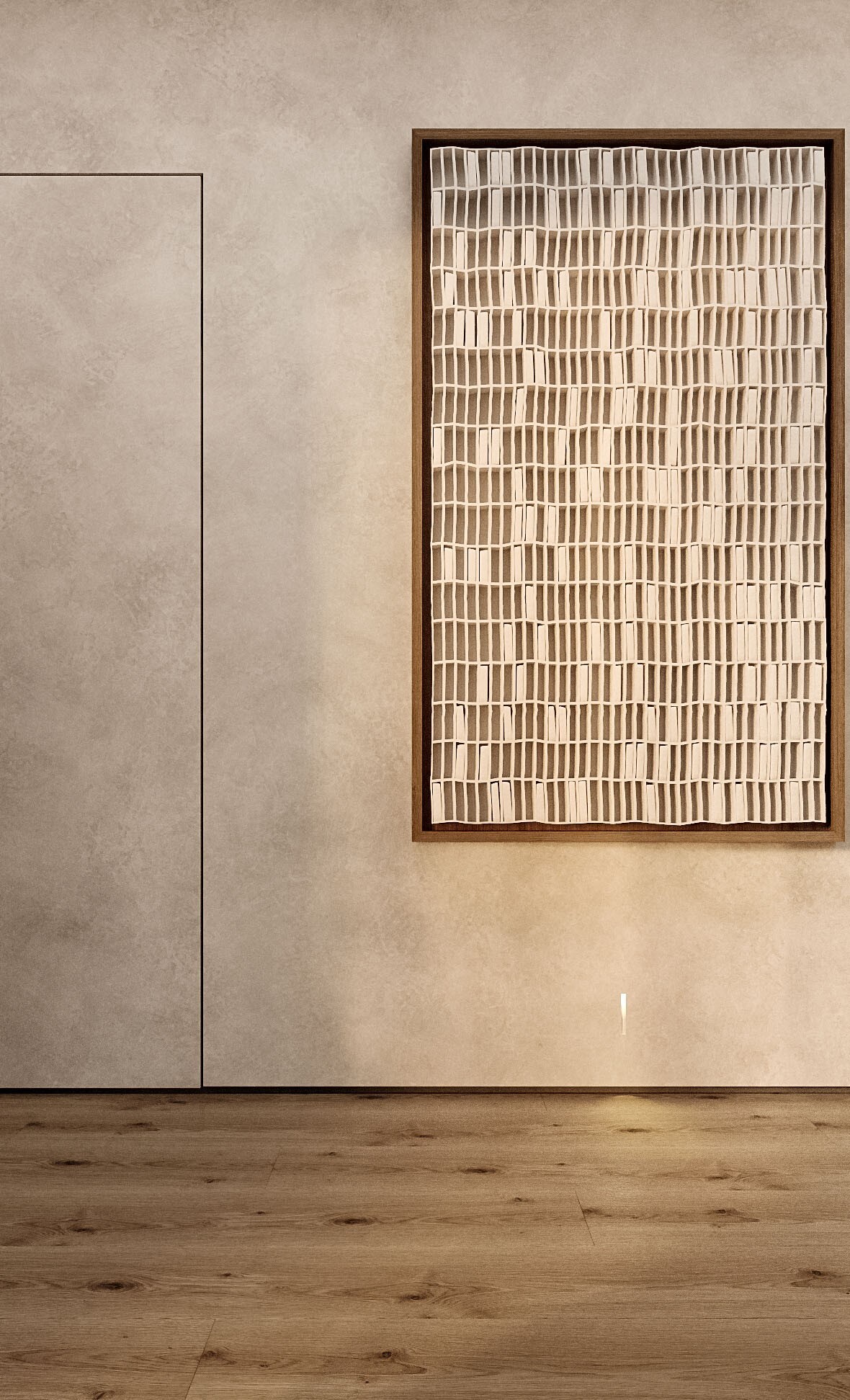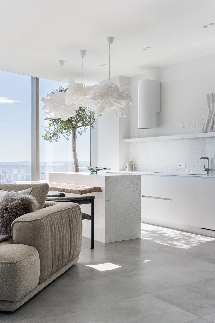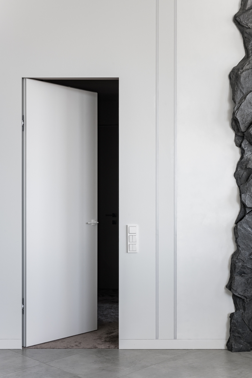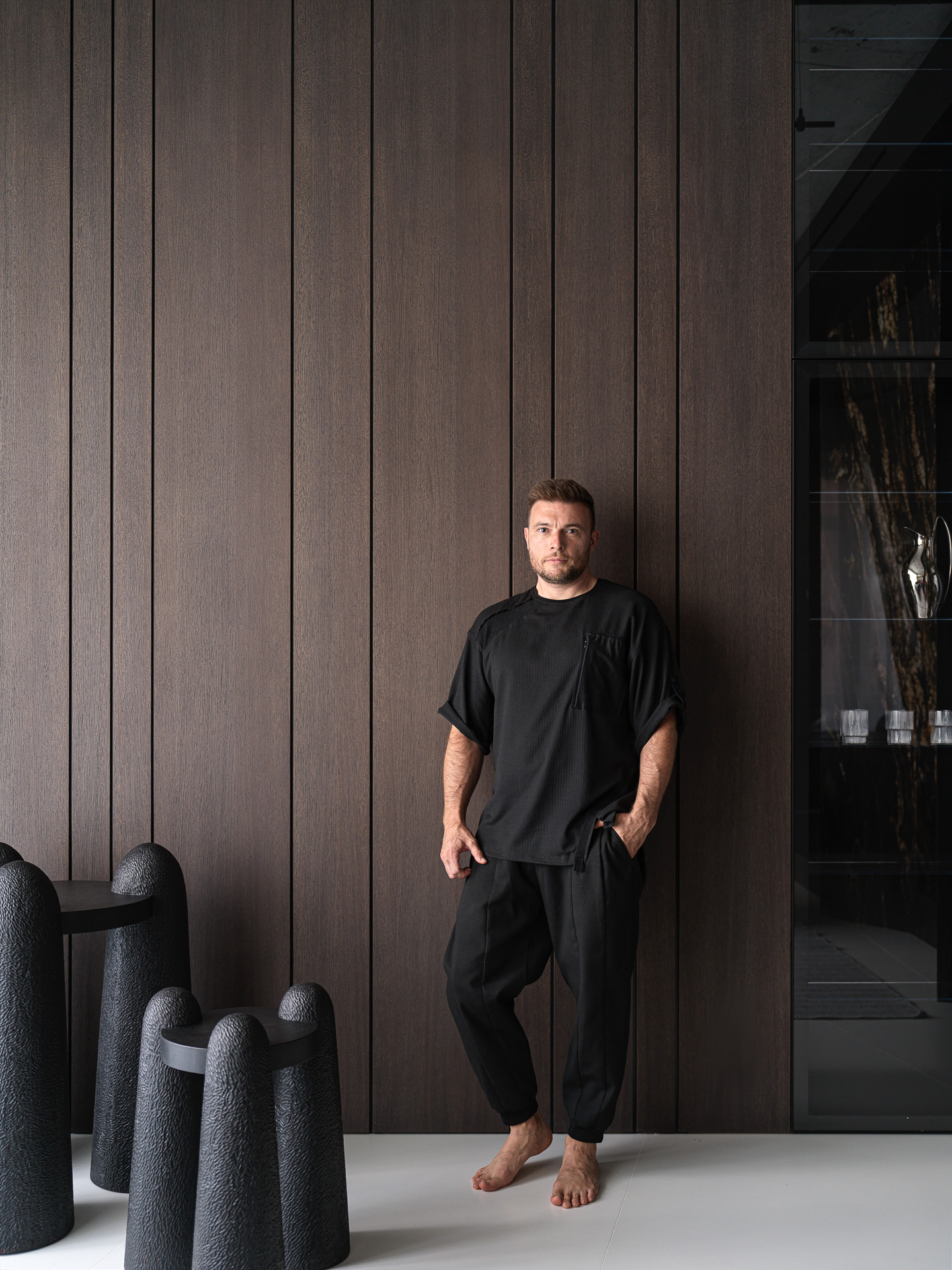 Концепция: В основе проекта — стремление создать вневременное пространство, сочетающее принципы ультра-минимализма, ваби-саби и вдохновение Бали. Главный вызов — интеграция 20 стальных колонн — был решен путем их искусного маскирования. Благодаря доступу к техэтажу и плоской крыше, удалось реализовать гибкую планировку, установить настоящий камин и создать уникальный зимний сад с зенитным окном. Каждый элемент, от скрытых систем хранения до инновационных инженерных решений, подчеркивает философию чистоты форм и функциональности. В отделке использованы исключительно натуральные материалы: фактурный шпон дуба, светлый паркет, микроцемент, травертин и обожженное дерево, создающие богатую тактильную палитру.