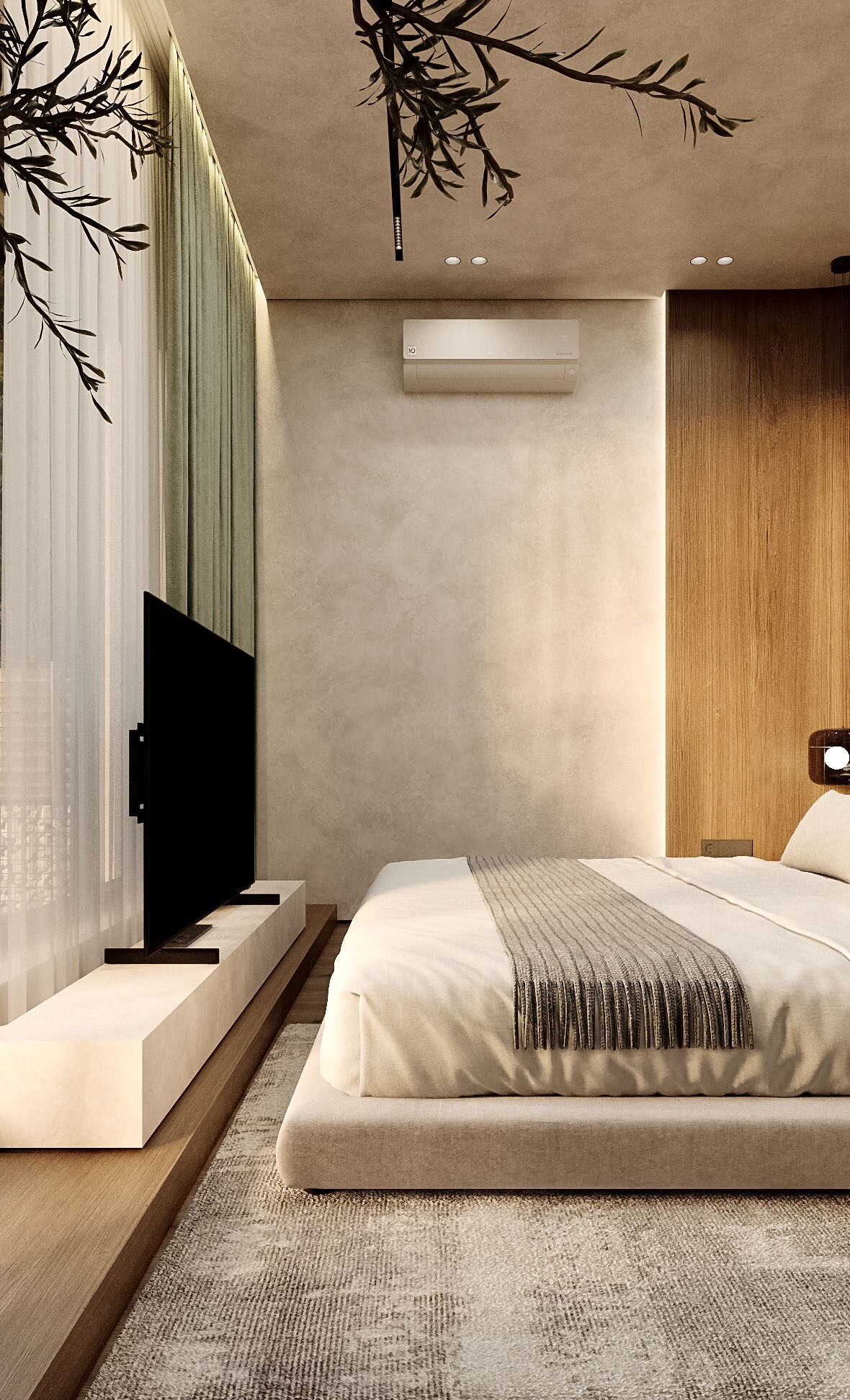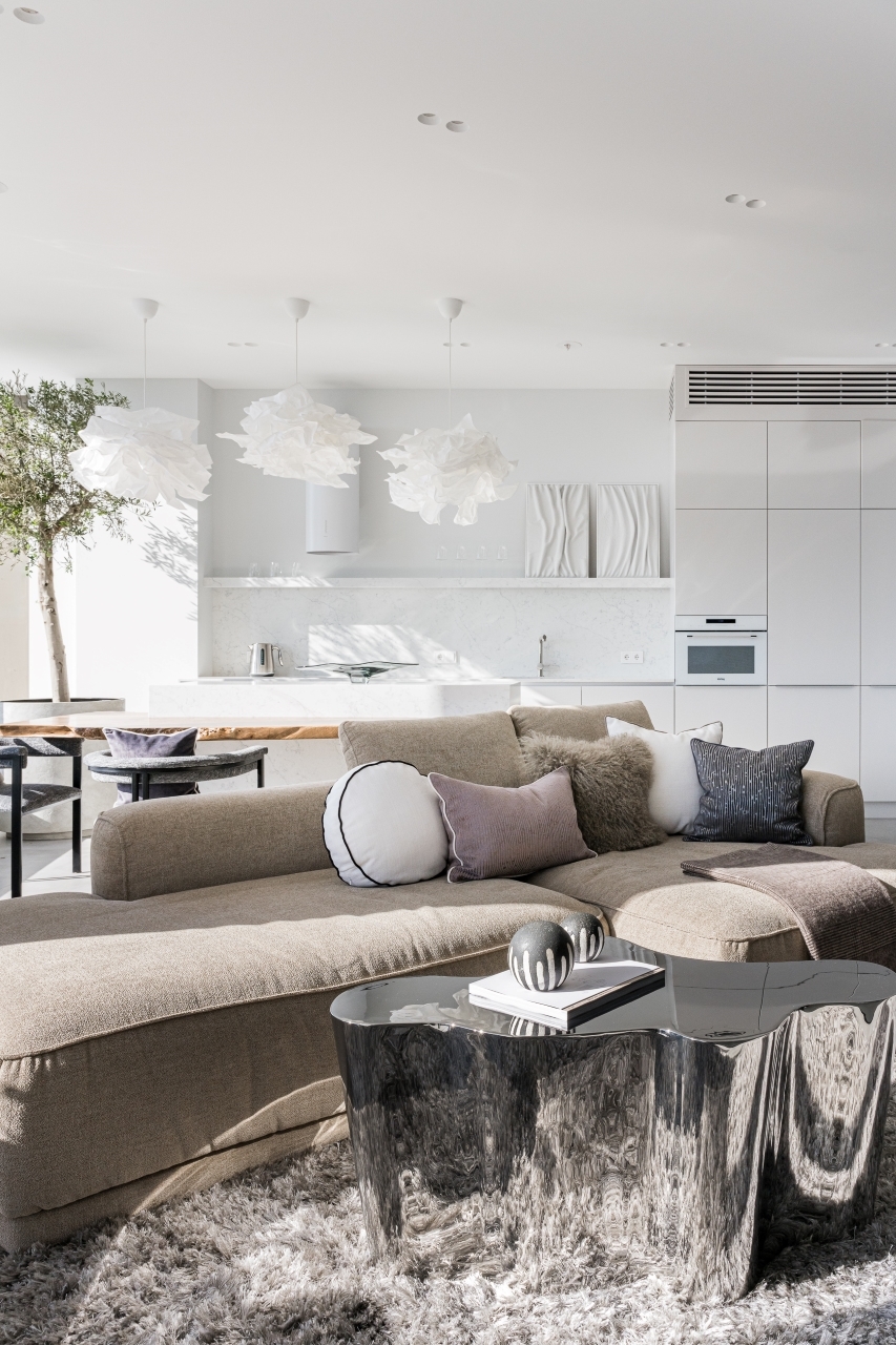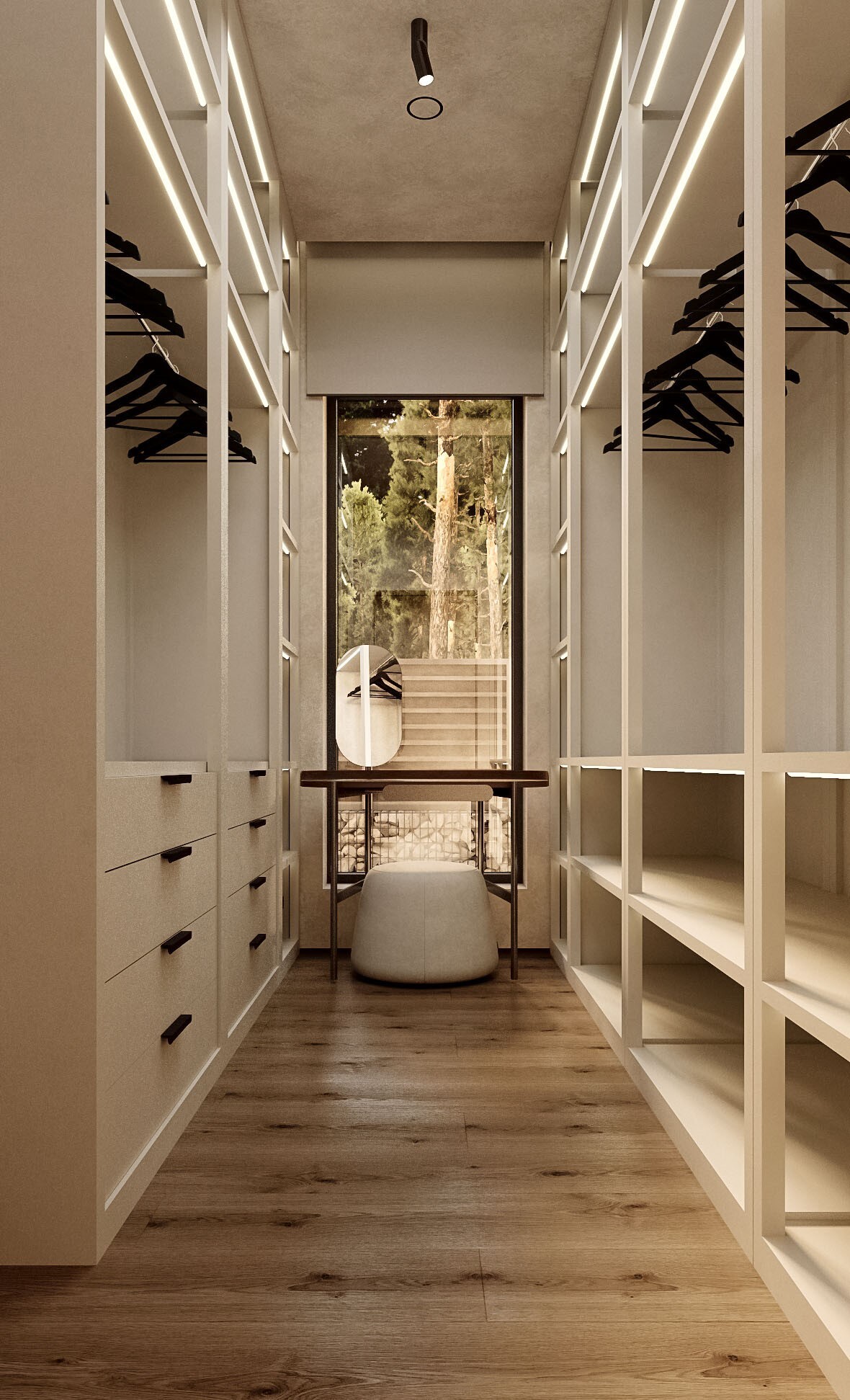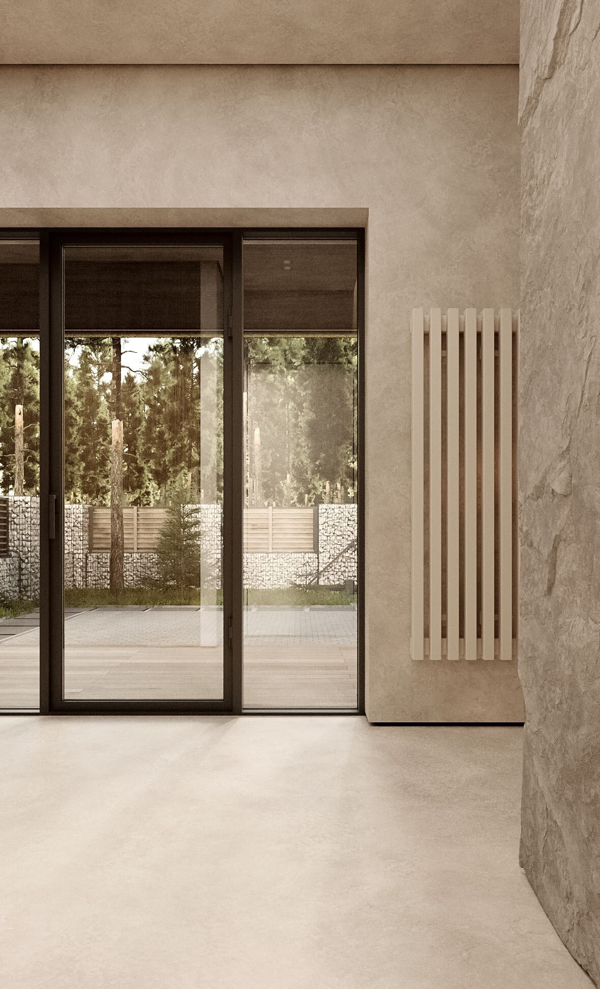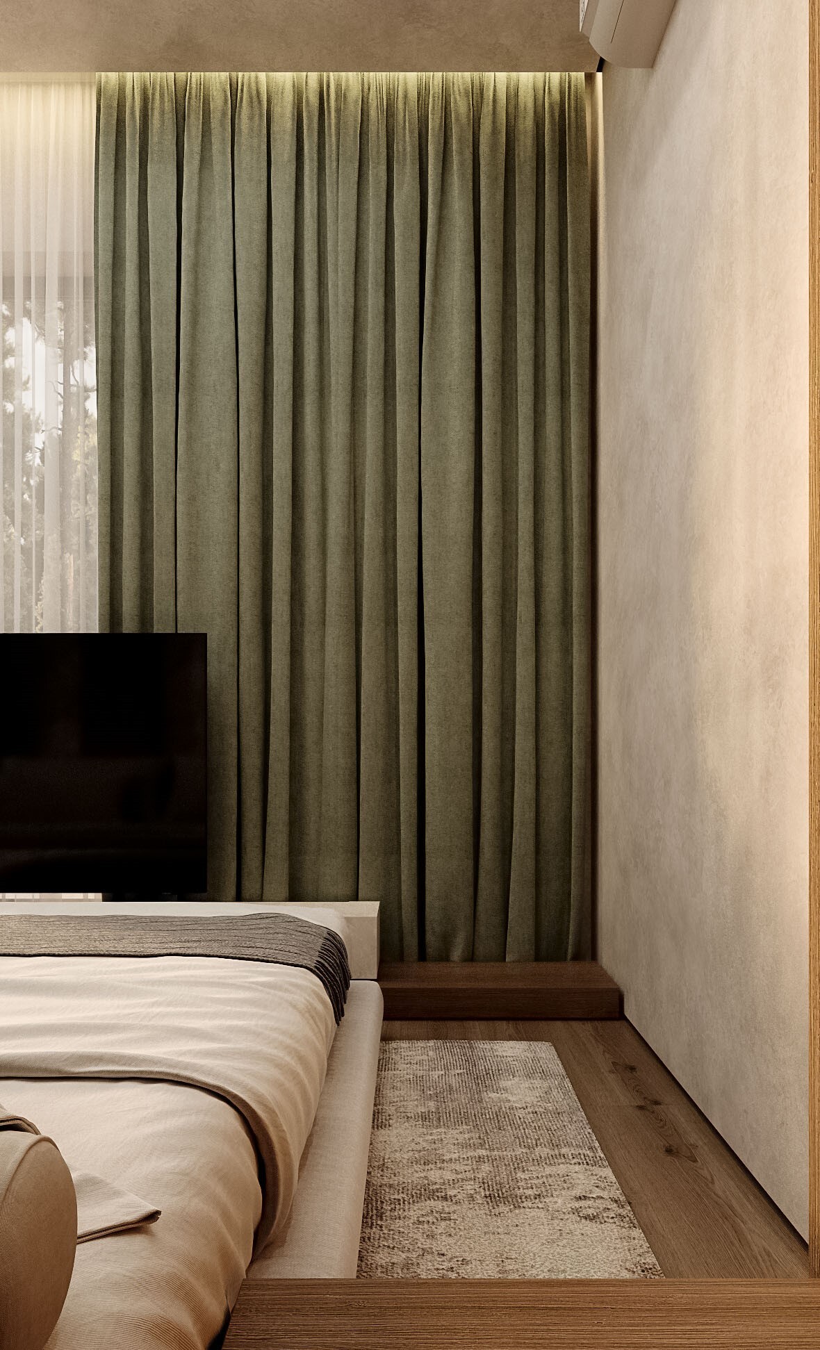 Концепция: В основе проекта — стремление создать вневременное пространство, сочетающее принципы ультра-минимализма, ваби-саби и вдохновение Бали. Главный вызов — интеграция 20 стальных колонн — был решен путем их искусного маскирования. Благодаря доступу к техэтажу и плоской крыше, удалось реализовать гибкую планировку, установить настоящий камин и создать уникальный зимний сад с зенитным окном. Каждый элемент, от скрытых систем хранения до инновационных инженерных решений, подчеркивает философию чистоты форм и функциональности. В отделке использованы исключительно натуральные материалы: фактурный шпон дуба, светлый паркет, микроцемент, травертин и обожженное дерево, создающие богатую тактильную палитру.
