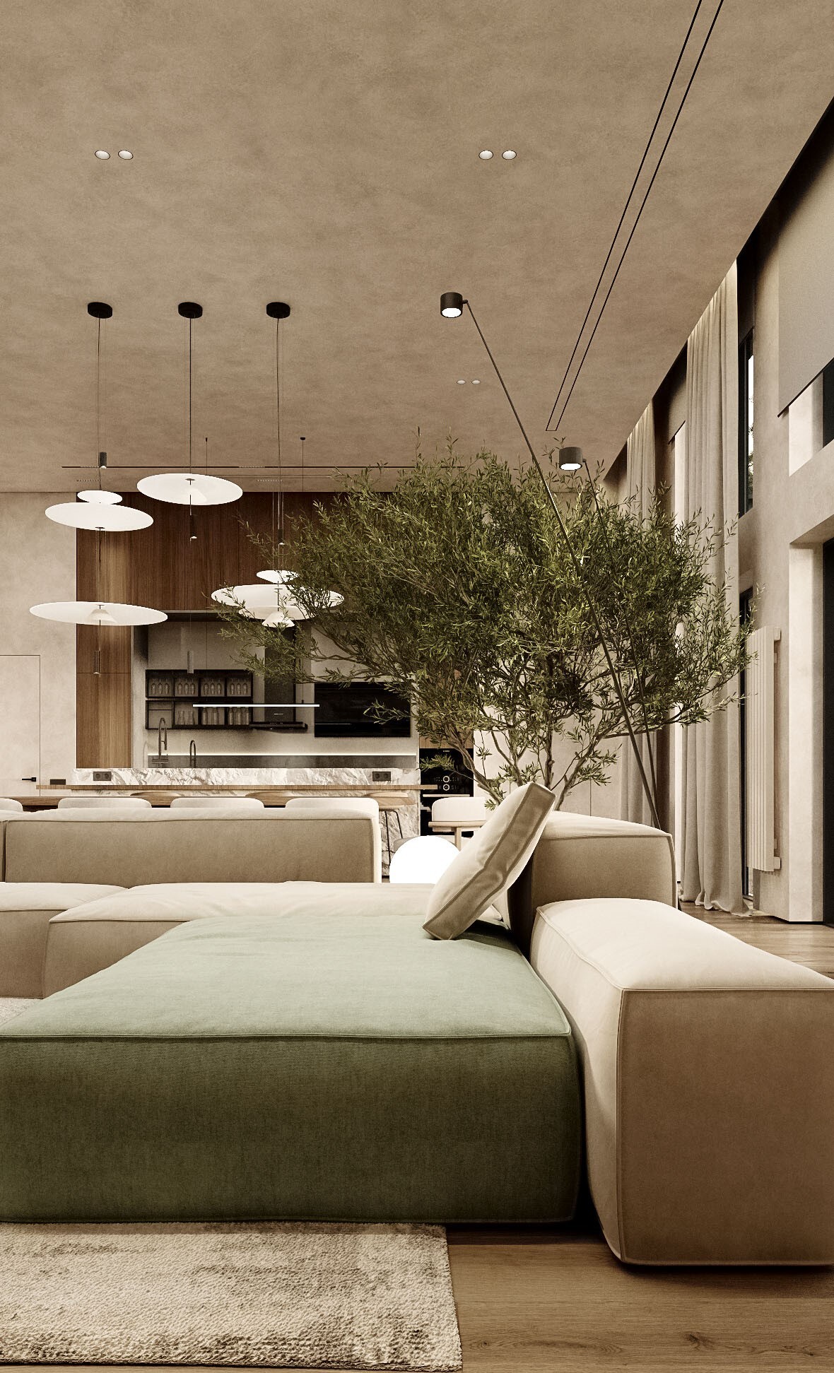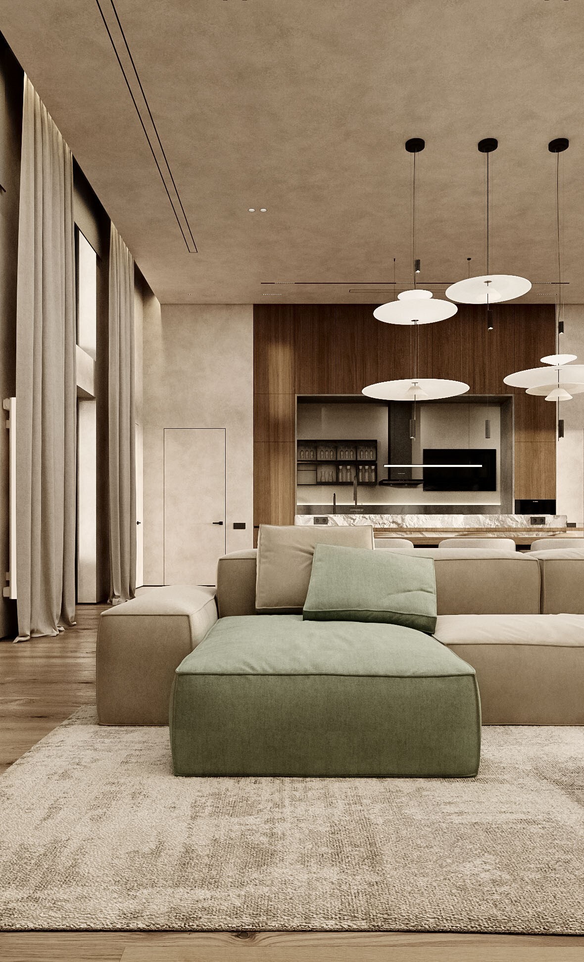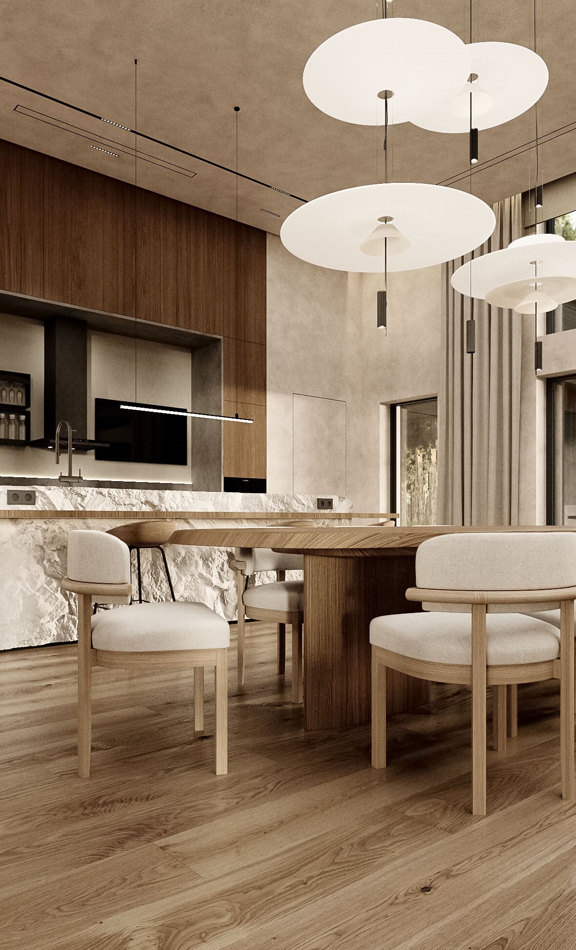 Концепция: Основная идея проекта — формирование вневременного интерьера, где каждый объект не только функционален, но и символичен. В центральной зоне кухни-гостиной акцентами служат воздушная люстра Nelson Ball и пластичный модульный диван Flow+, создающие мягкую и уютную атмосферу. Деревянные акценты и кресла добавляют теплоту и структуру, а изысканный контраст камня и древесины подчеркивает минималистичную эстетику, привнося естественность и утонченность.