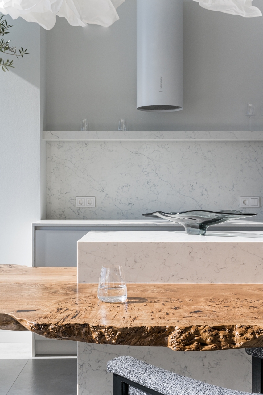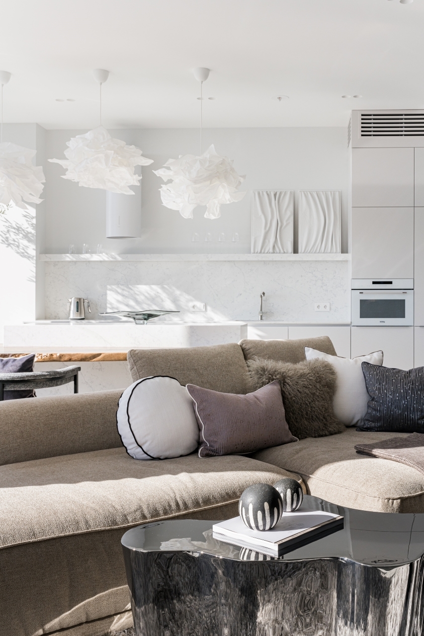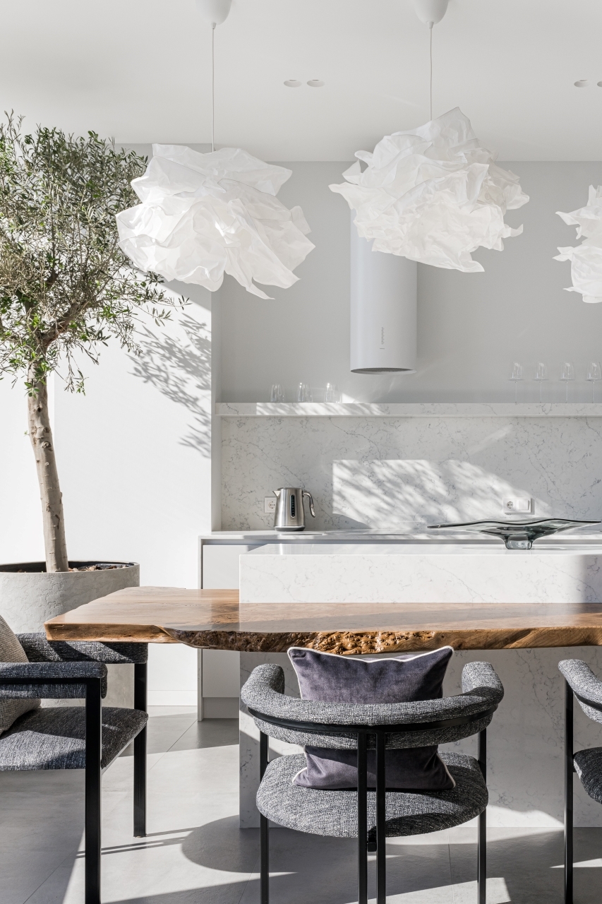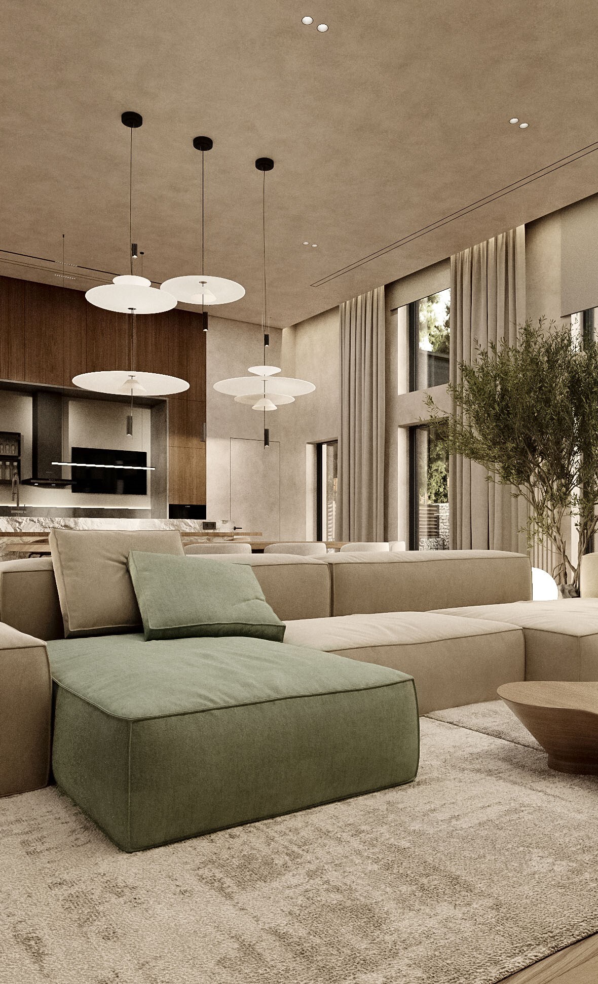 Концепция: Основная идея проекта — формирование вневременного интерьера, где каждый объект не только функционален, но и символичен. В центральной зоне кухни-гостиной акцентами служат воздушная люстра Nelson Ball и пластичный модульный диван Flow+, создающие мягкую и уютную атмосферу. Деревянные акценты и кресла добавляют теплоту и структуру, а изысканный контраст камня и древесины подчеркивает минималистичную эстетику, привнося естественность и утонченность.