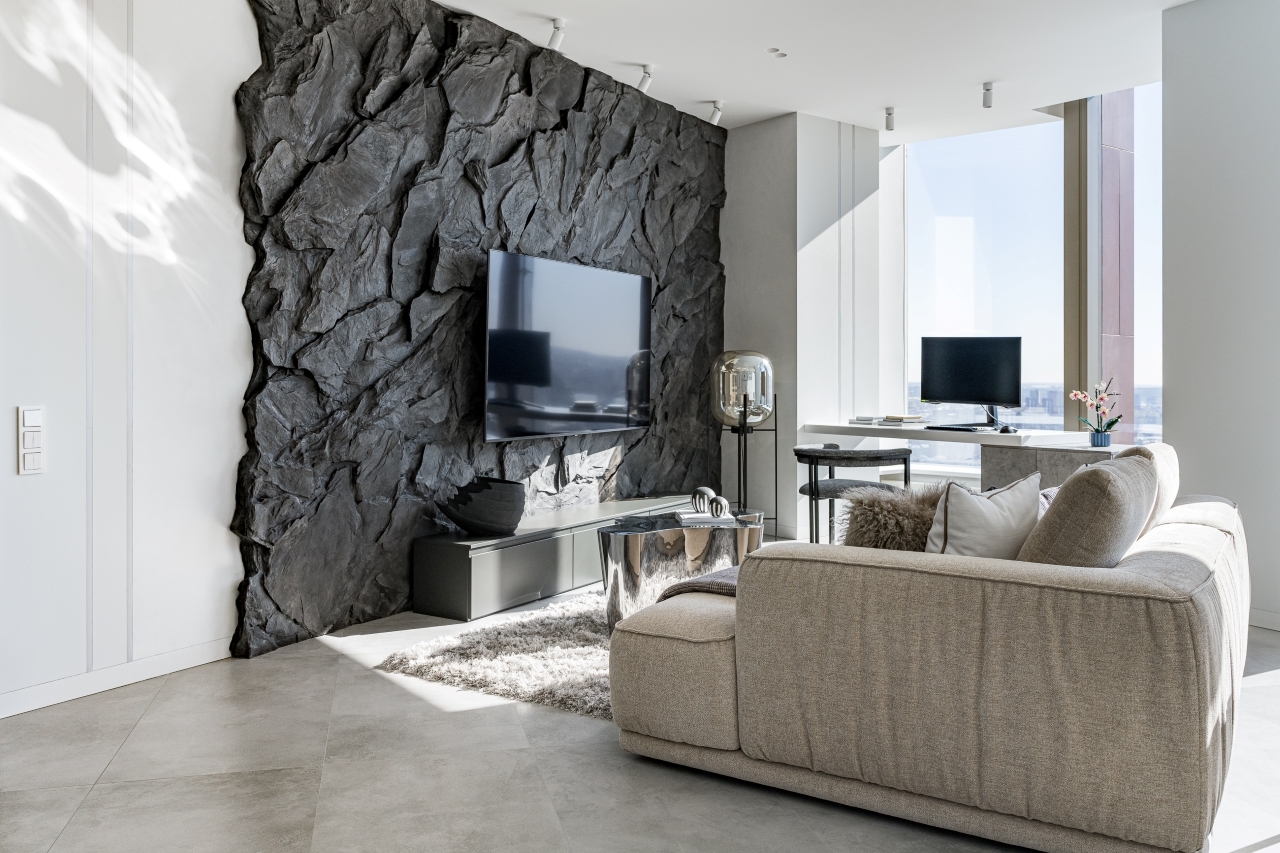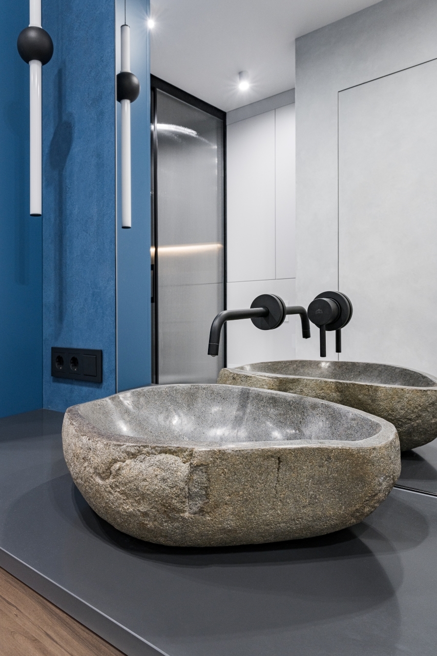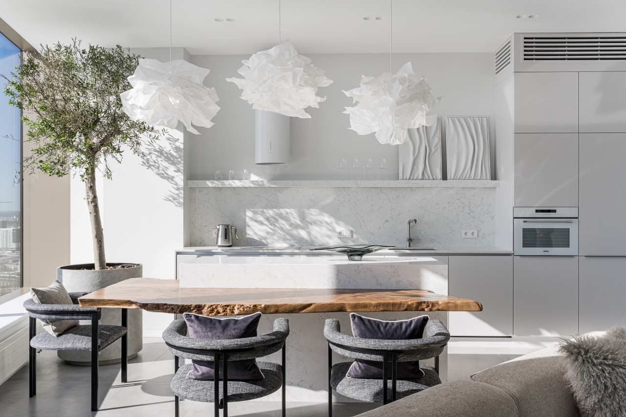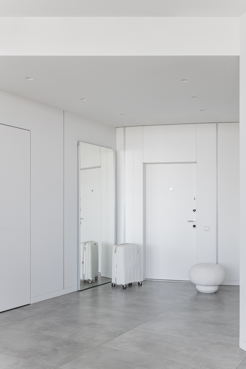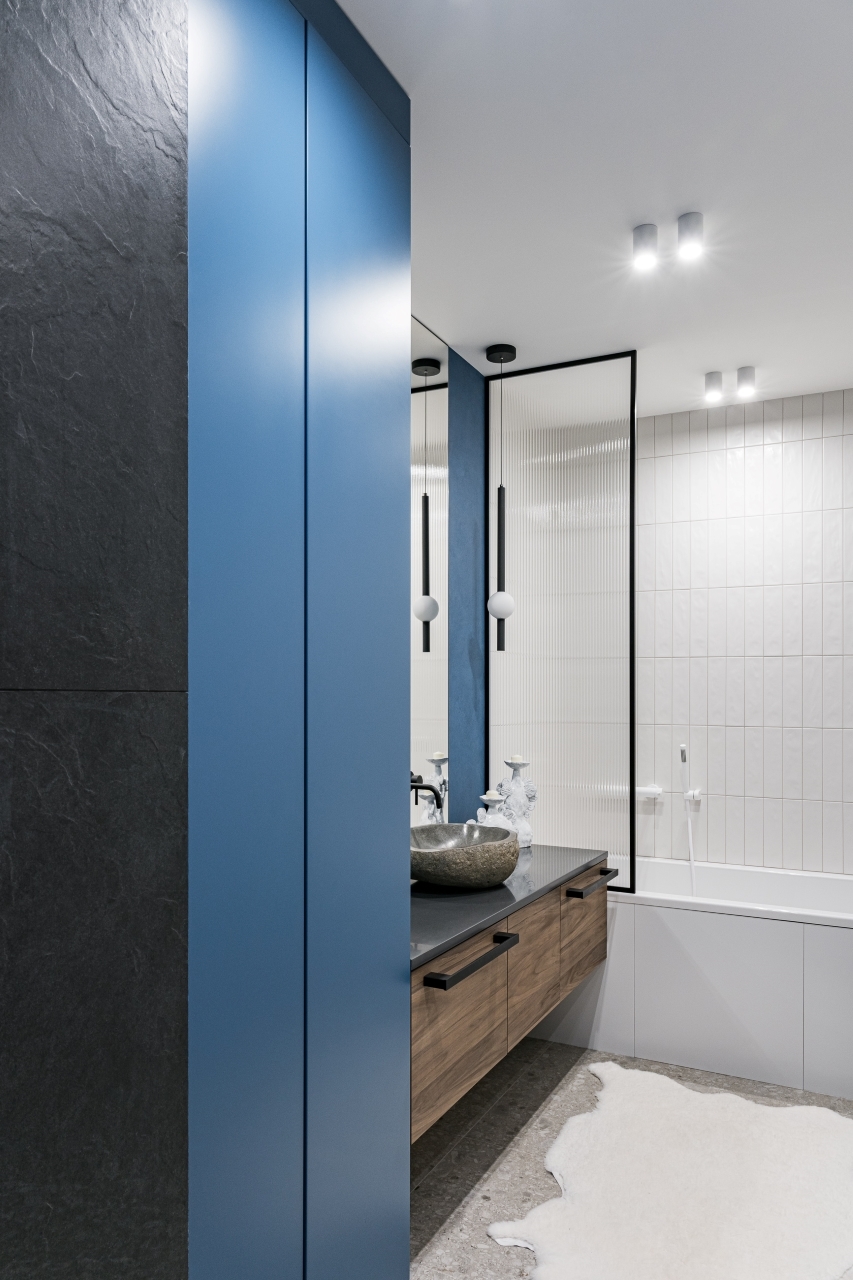 Концепция: Основная идея проекта — воссоздание атмосферы 'зимнего дня в горах' с высоты птичьего полета, аналогичной швейцарским альпийским ландшафтам. Концепция реализована через тщательно подобранную цветовую палитру из оттенков белого, серого и синего, дополненную теплыми акцентами натурального дерева и динамичной игрой контрастных фактур – от грубых до глянцевых. Планировочные решения включают трансформацию геометрии: объединение прихожей с кухней-гостиной для создания единого, просторного пространства, а также оптимизацию мастер-спальни с проходной гардеробной для увеличения площади ванной комнаты и повышения эргономики. Каждый элемент, от скрытых плинтусов и уникальной столешницы из карагача, устойчивого к УФ-излучению, до панно из натурального камня и кастомной мебели, подчеркивает эксклюзивность и внимание к деталям.