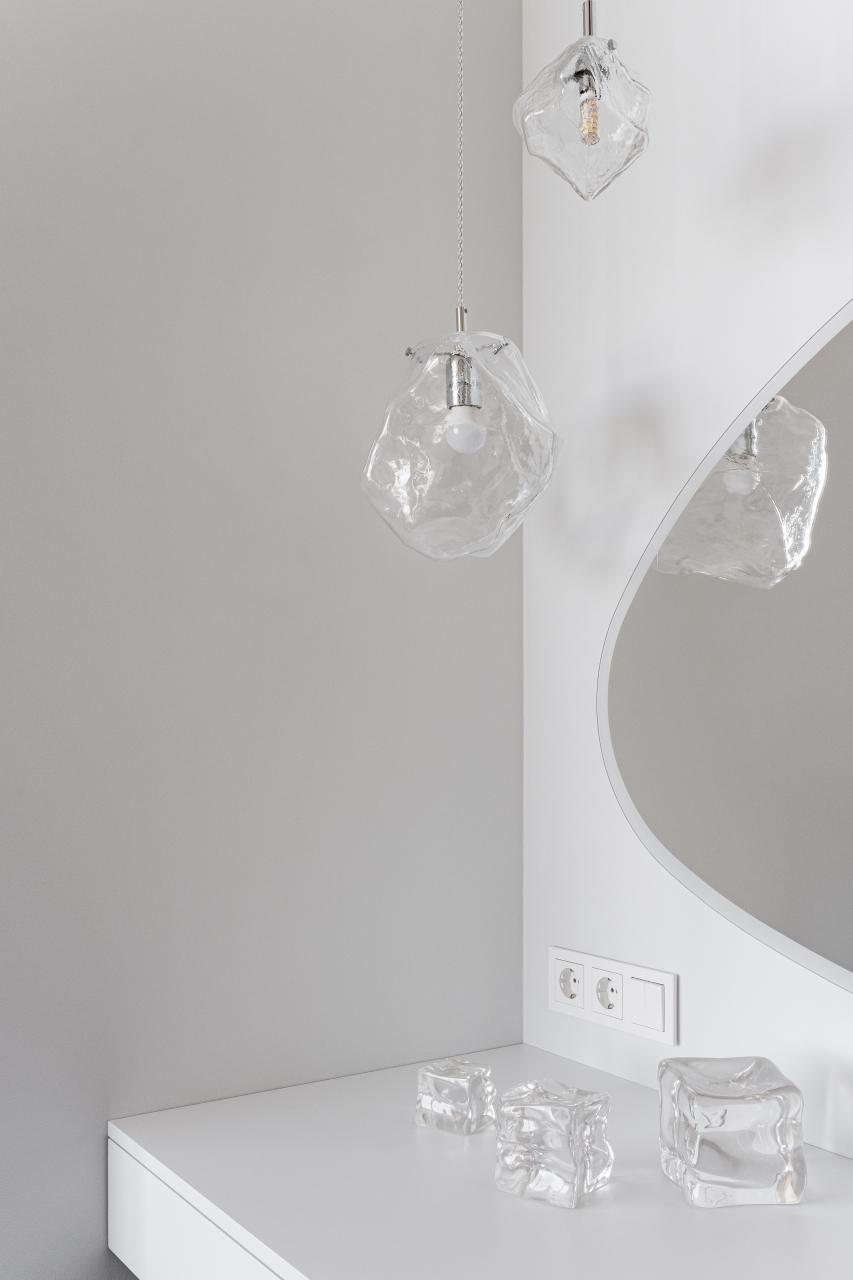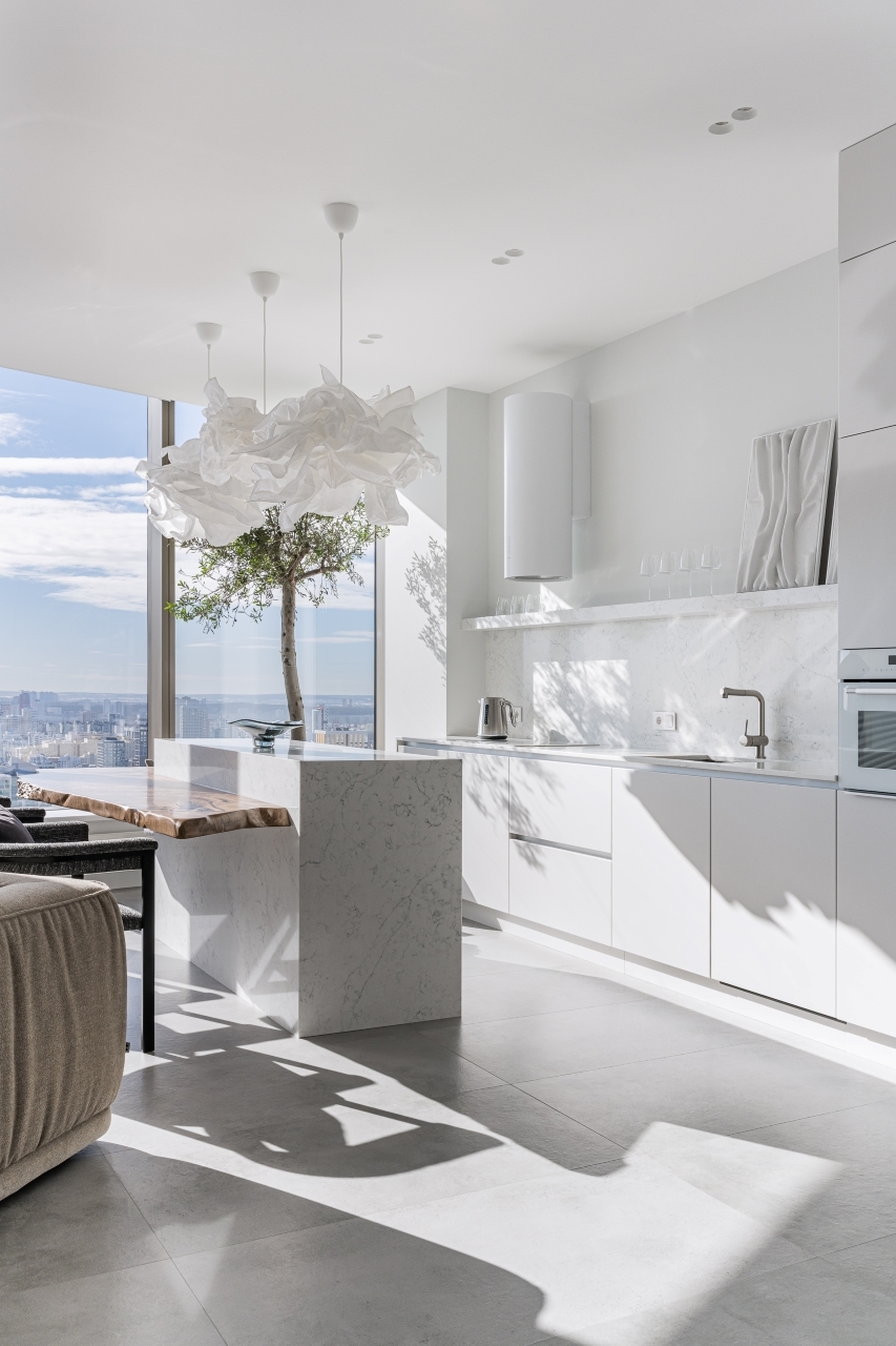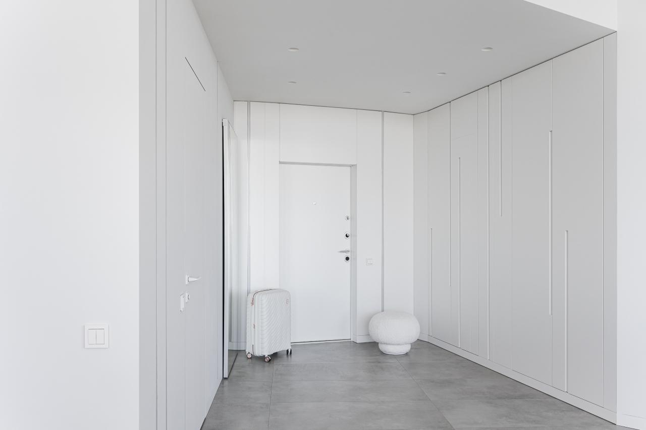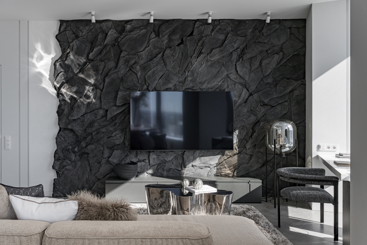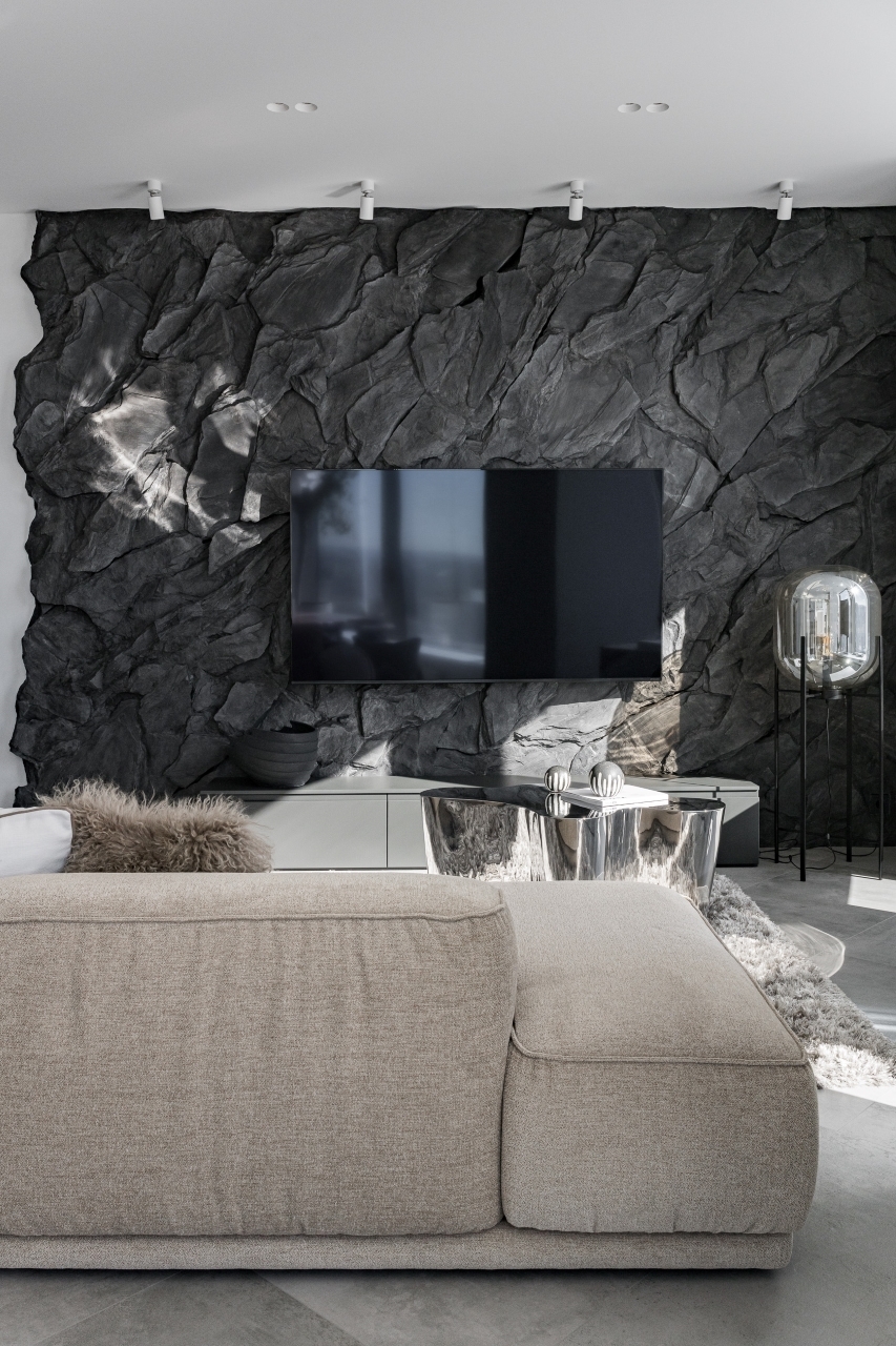 Концепция: Основная идея проекта — воссоздание атмосферы 'зимнего дня в горах' с высоты птичьего полета, аналогичной швейцарским альпийским ландшафтам. Концепция реализована через тщательно подобранную цветовую палитру из оттенков белого, серого и синего, дополненную теплыми акцентами натурального дерева и динамичной игрой контрастных фактур – от грубых до глянцевых. Планировочные решения включают трансформацию геометрии: объединение прихожей с кухней-гостиной для создания единого, просторного пространства, а также оптимизацию мастер-спальни с проходной гардеробной для увеличения площади ванной комнаты и повышения эргономики. Каждый элемент, от скрытых плинтусов и уникальной столешницы из карагача, устойчивого к УФ-излучению, до панно из натурального камня и кастомной мебели, подчеркивает эксклюзивность и внимание к деталям.