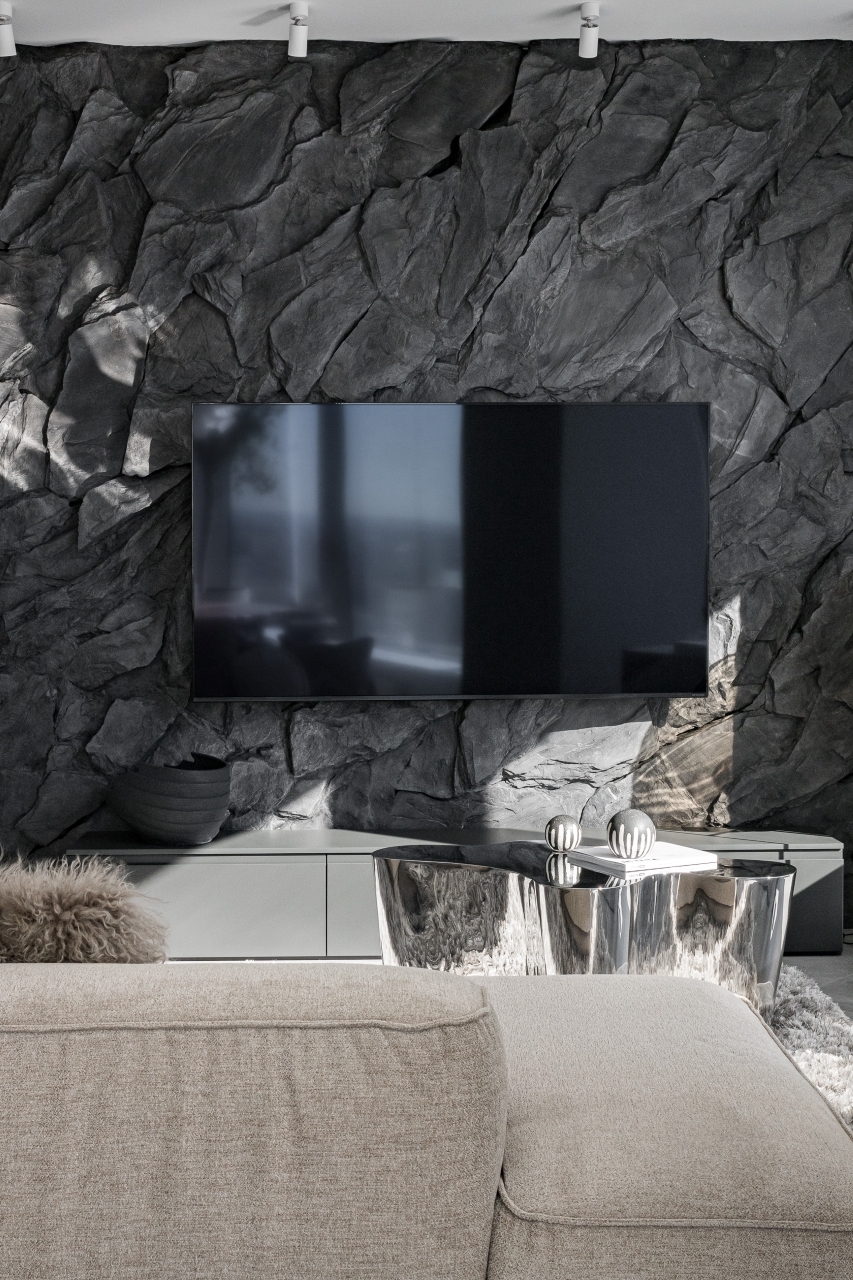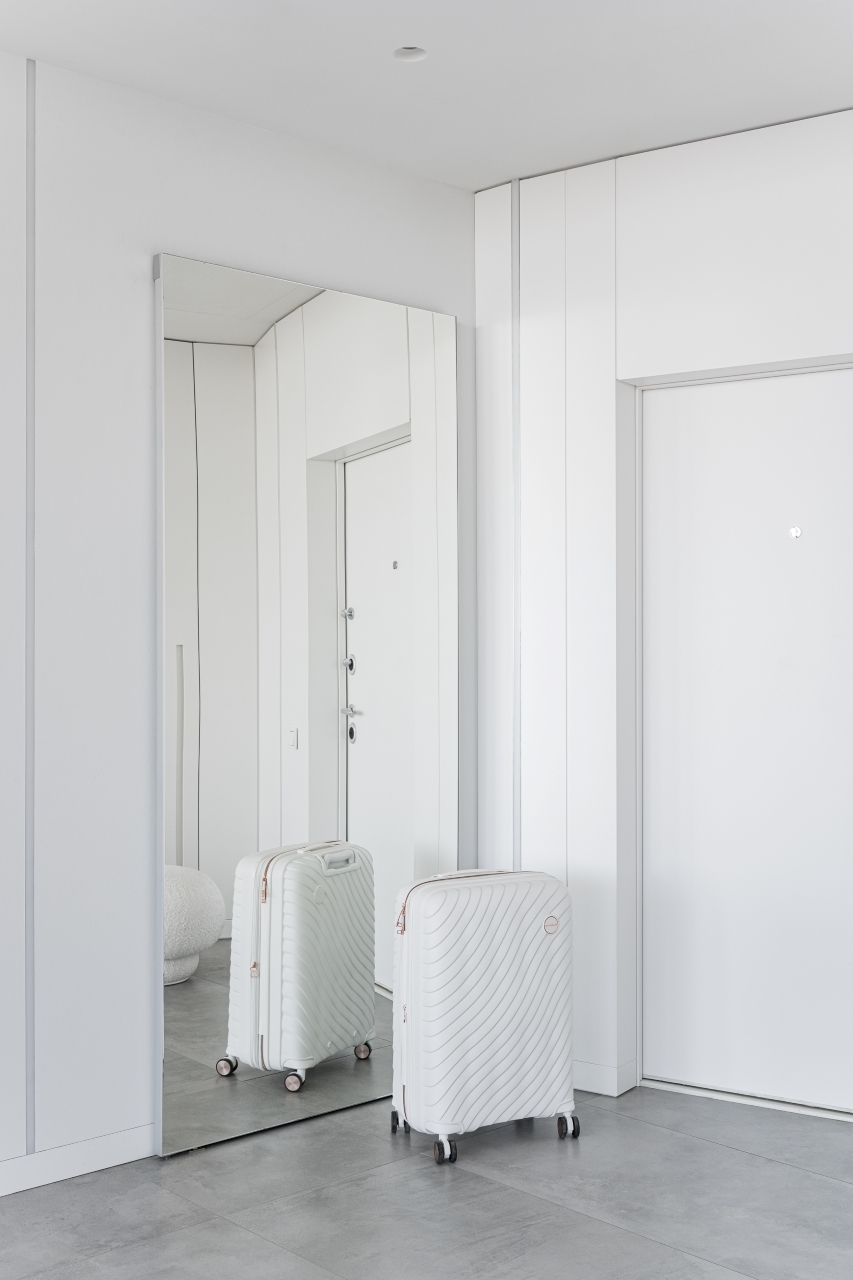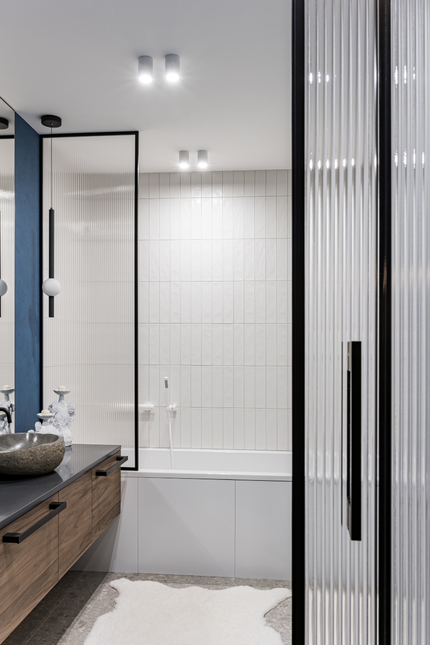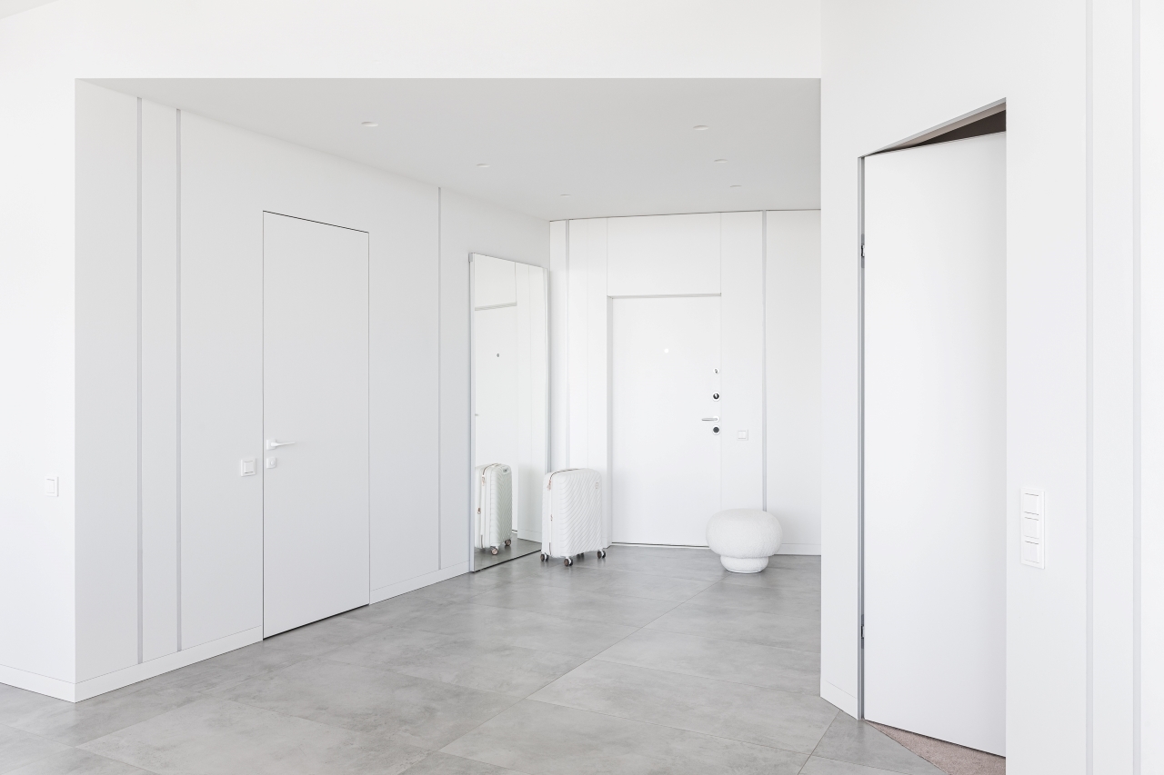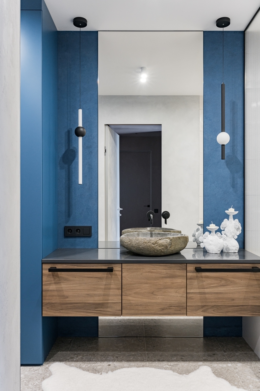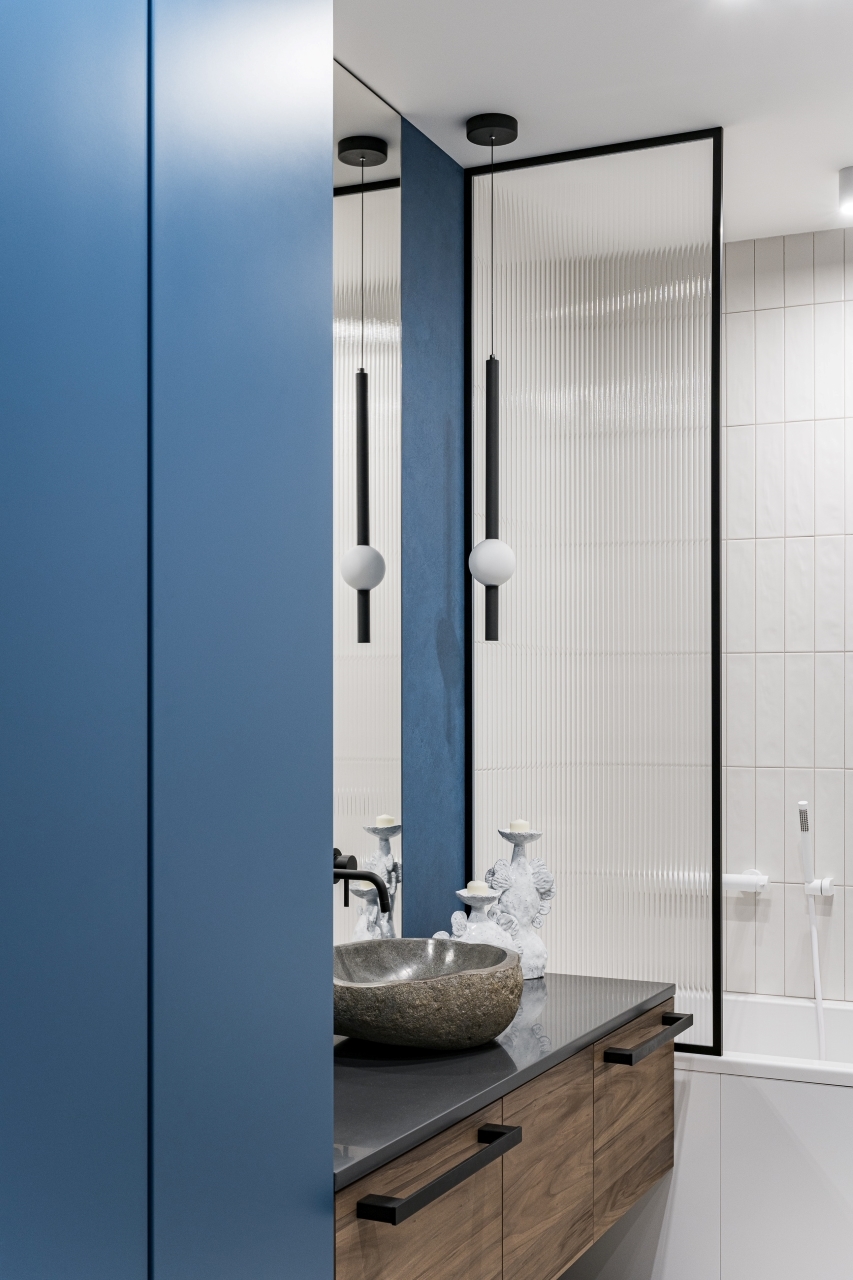 Концепция: Основная идея проекта — воссоздание атмосферы 'зимнего дня в горах' с высоты птичьего полета, аналогичной швейцарским альпийским ландшафтам. Концепция реализована через тщательно подобранную цветовую палитру из оттенков белого, серого и синего, дополненную теплыми акцентами натурального дерева и динамичной игрой контрастных фактур – от грубых до глянцевых. Планировочные решения включают трансформацию геометрии: объединение прихожей с кухней-гостиной для создания единого, просторного пространства, а также оптимизацию мастер-спальни с проходной гардеробной для увеличения площади ванной комнаты и повышения эргономики. Каждый элемент, от скрытых плинтусов и уникальной столешницы из карагача, устойчивого к УФ-излучению, до панно из натурального камня и кастомной мебели, подчеркивает эксклюзивность и внимание к деталям.