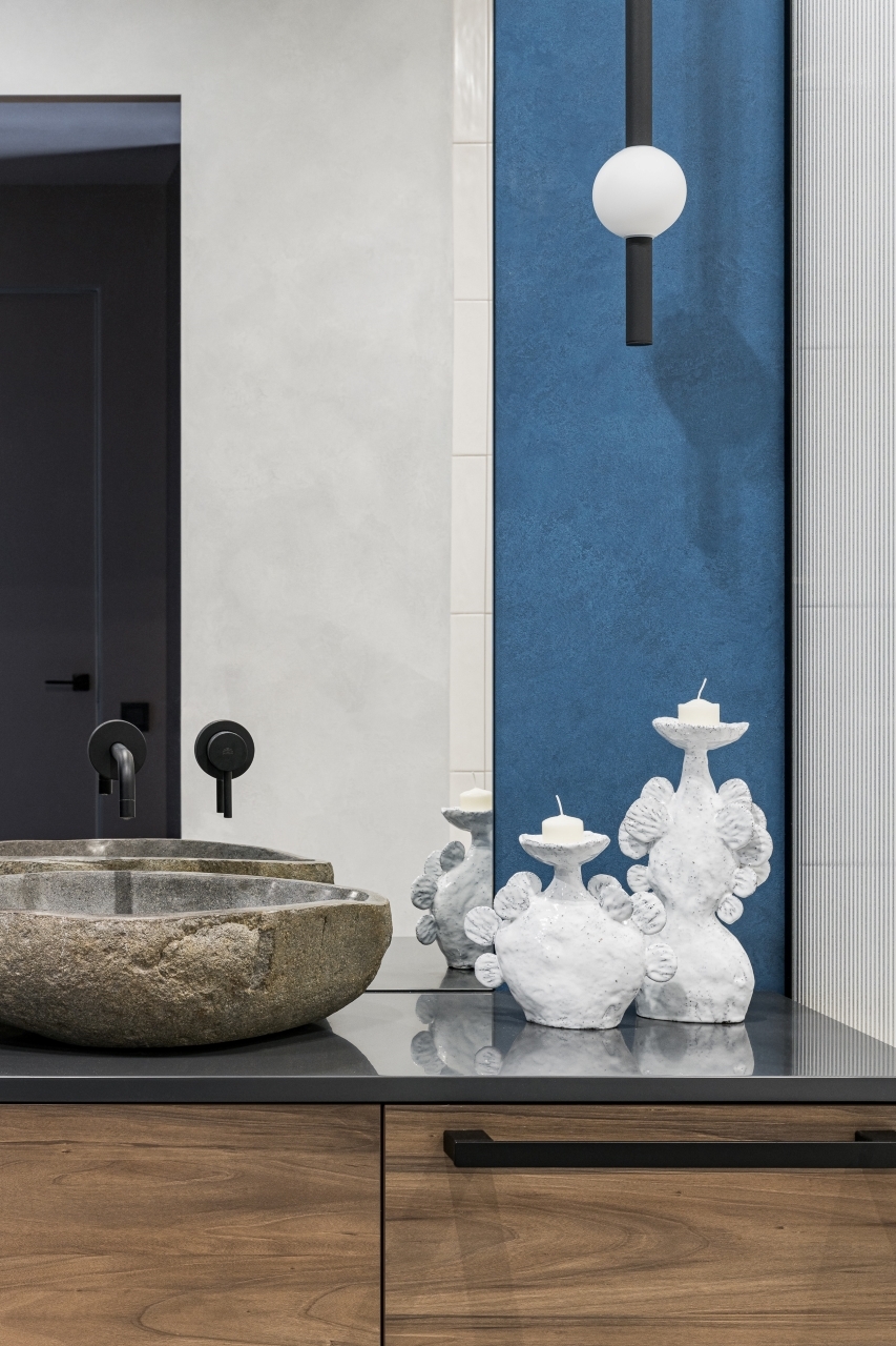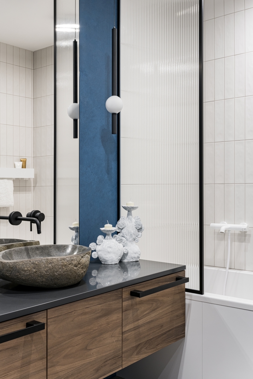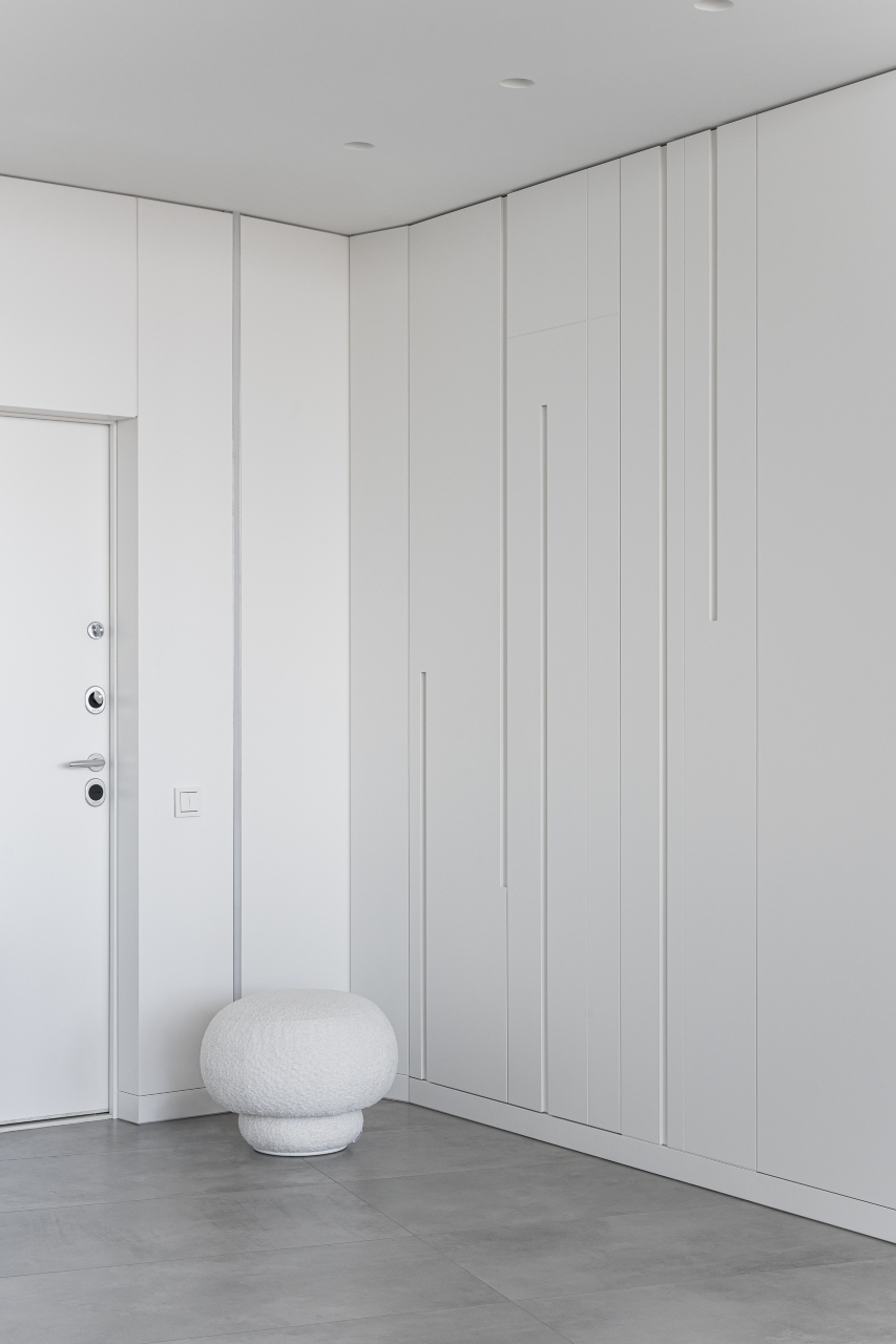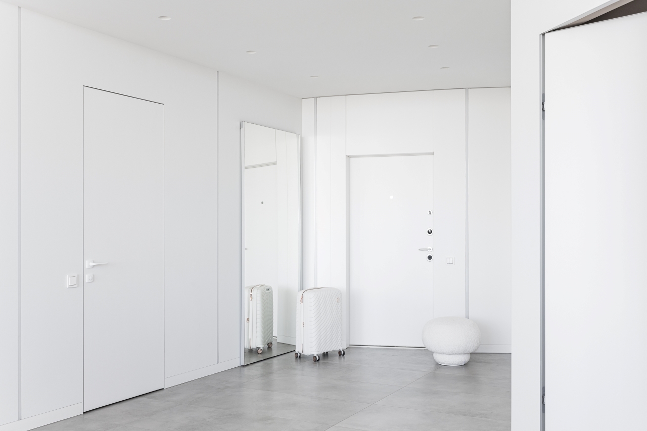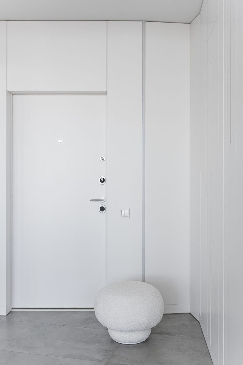 Концепция: Основная идея проекта — воссоздание атмосферы 'зимнего дня в горах' с высоты птичьего полета, аналогичной швейцарским альпийским ландшафтам. Концепция реализована через тщательно подобранную цветовую палитру из оттенков белого, серого и синего, дополненную теплыми акцентами натурального дерева и динамичной игрой контрастных фактур – от грубых до глянцевых. Планировочные решения включают трансформацию геометрии: объединение прихожей с кухней-гостиной для создания единого, просторного пространства, а также оптимизацию мастер-спальни с проходной гардеробной для увеличения площади ванной комнаты и повышения эргономики. Каждый элемент, от скрытых плинтусов и уникальной столешницы из карагача, устойчивого к УФ-излучению, до панно из натурального камня и кастомной мебели, подчеркивает эксклюзивность и внимание к деталям.