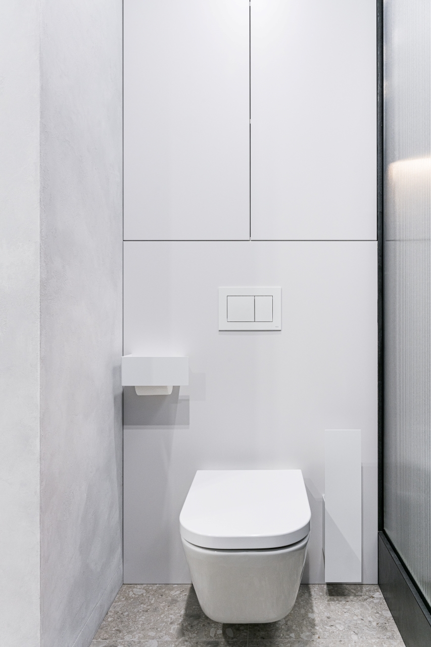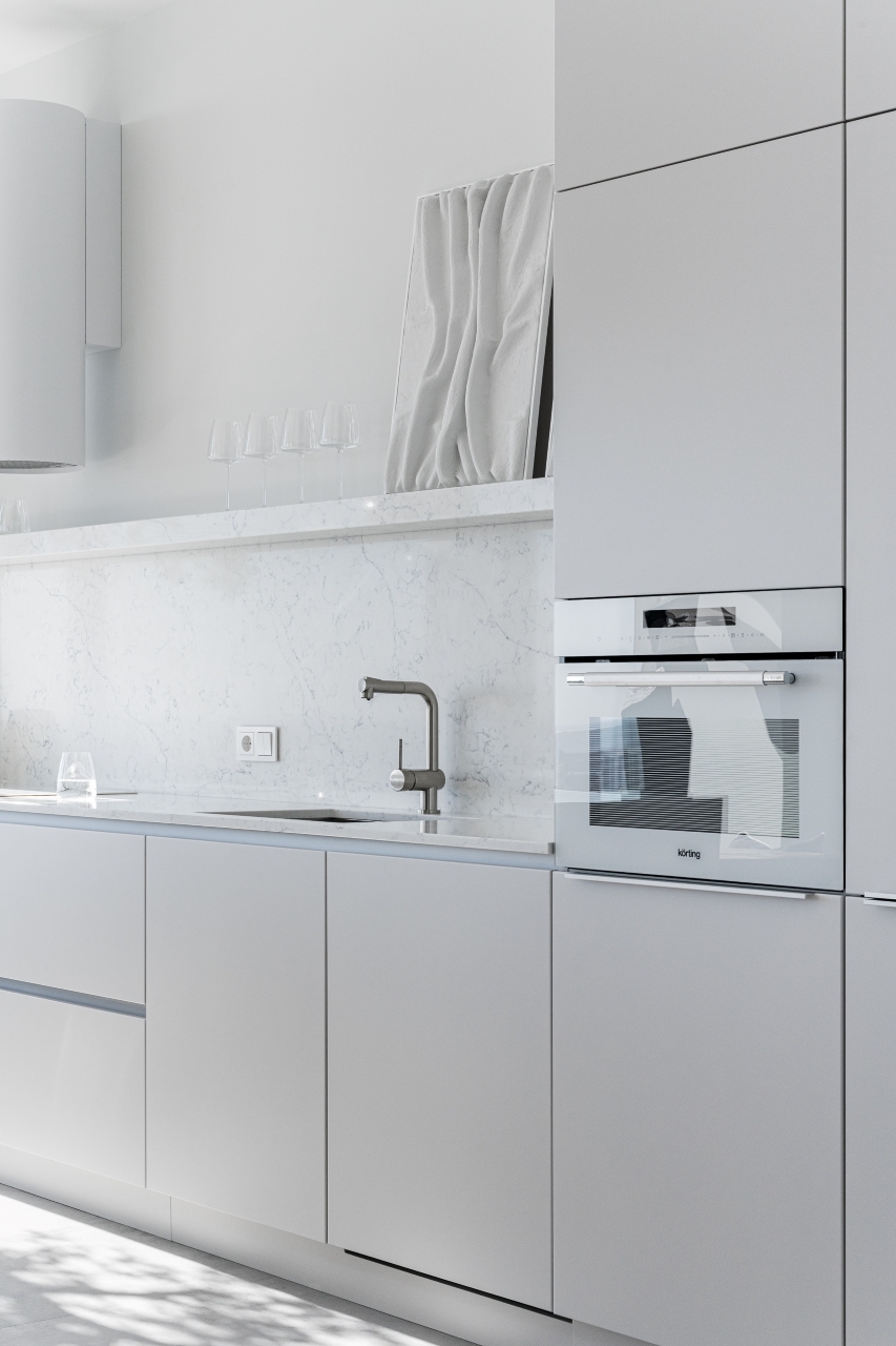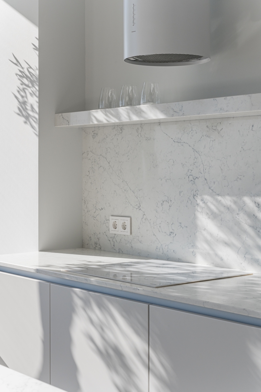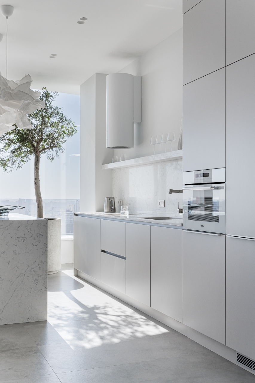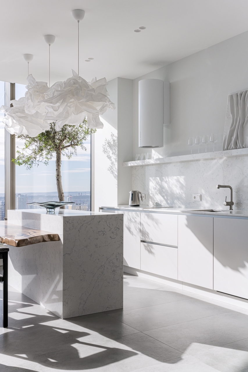 Концепция: Основная идея проекта — воссоздание атмосферы 'зимнего дня в горах' с высоты птичьего полета, аналогичной швейцарским альпийским ландшафтам. Концепция реализована через тщательно подобранную цветовую палитру из оттенков белого, серого и синего, дополненную теплыми акцентами натурального дерева и динамичной игрой контрастных фактур – от грубых до глянцевых. Планировочные решения включают трансформацию геометрии: объединение прихожей с кухней-гостиной для создания единого, просторного пространства, а также оптимизацию мастер-спальни с проходной гардеробной для увеличения площади ванной комнаты и повышения эргономики. Каждый элемент, от скрытых плинтусов и уникальной столешницы из карагача, устойчивого к УФ-излучению, до панно из натурального камня и кастомной мебели, подчеркивает эксклюзивность и внимание к деталям.
