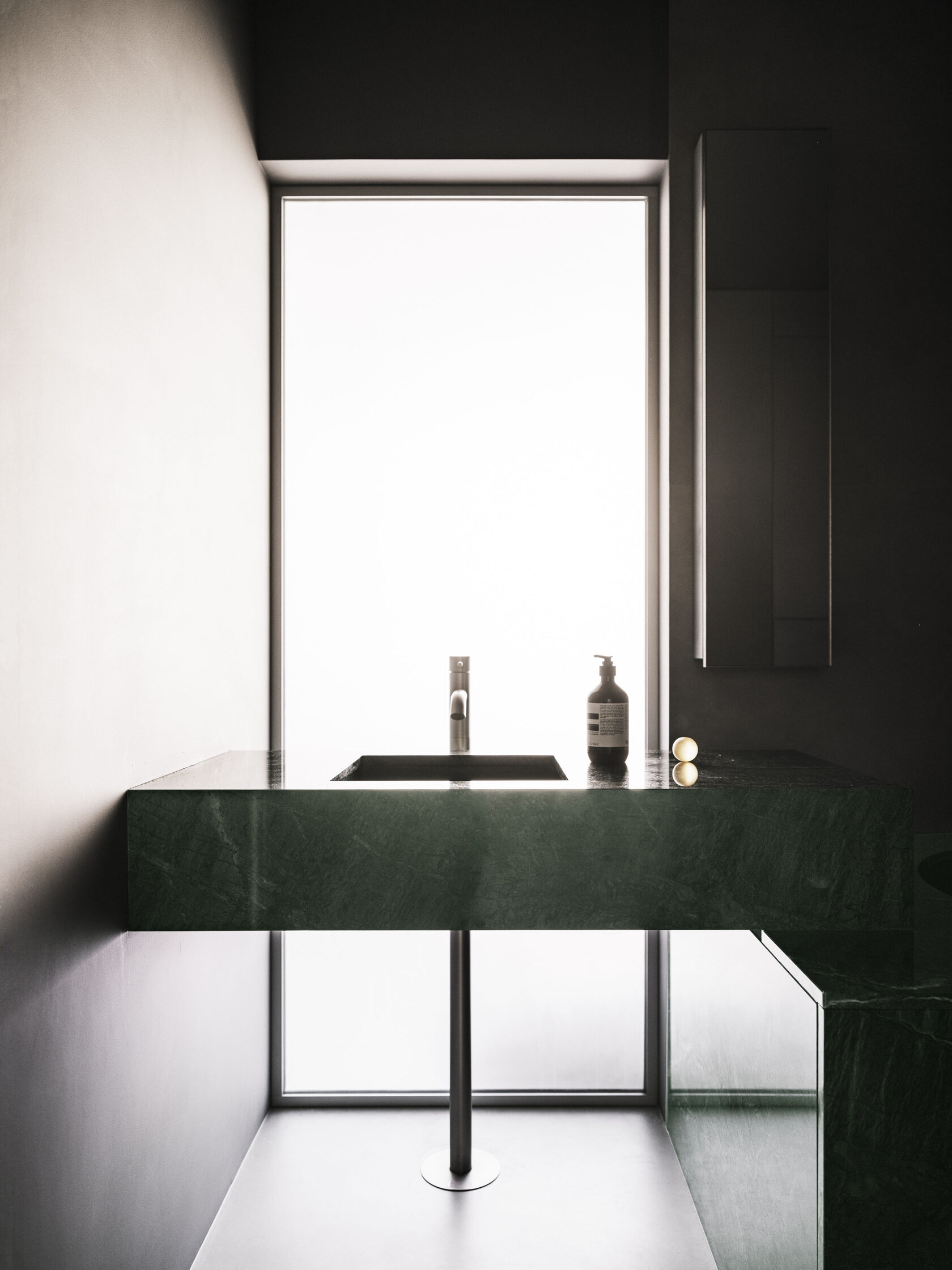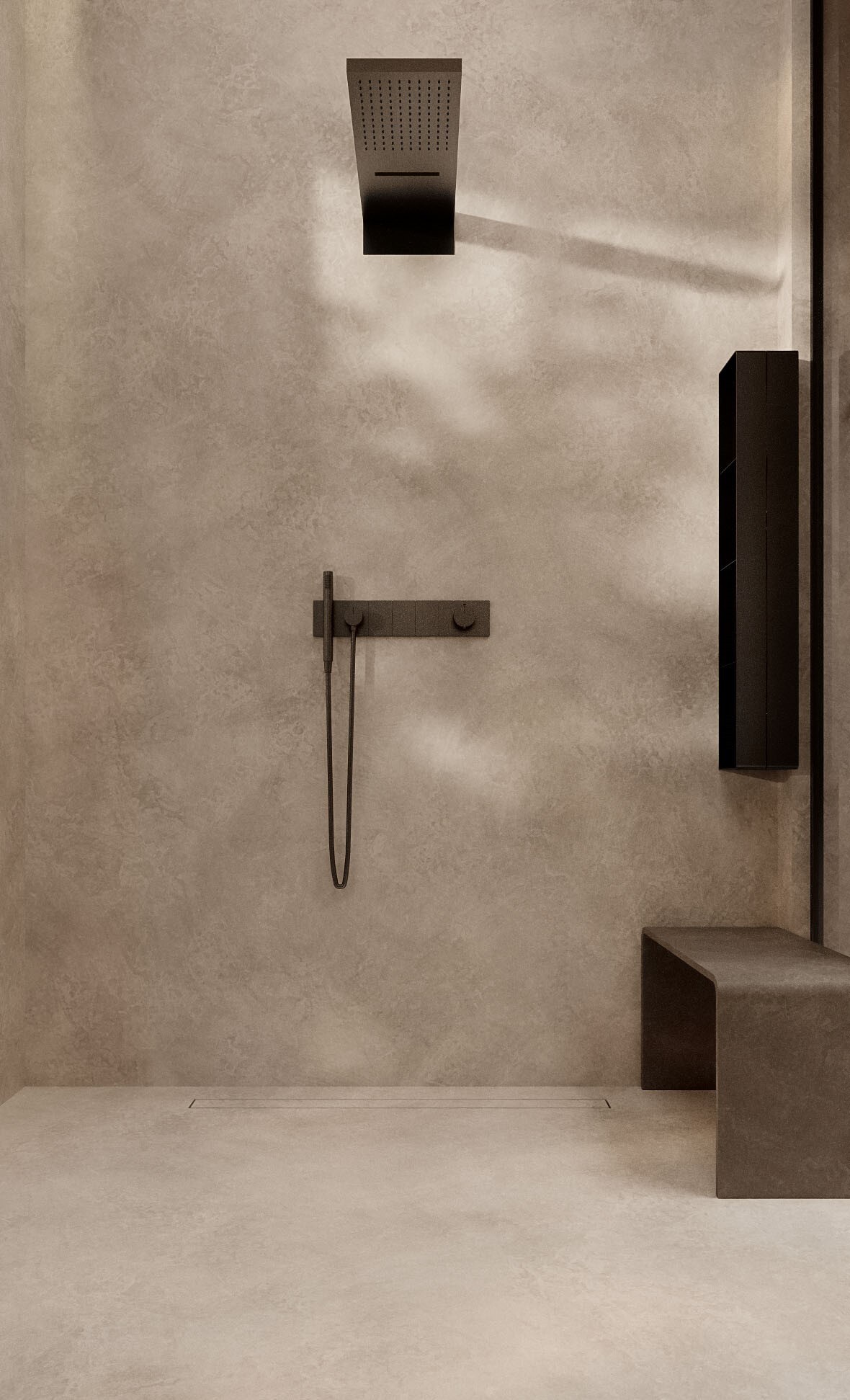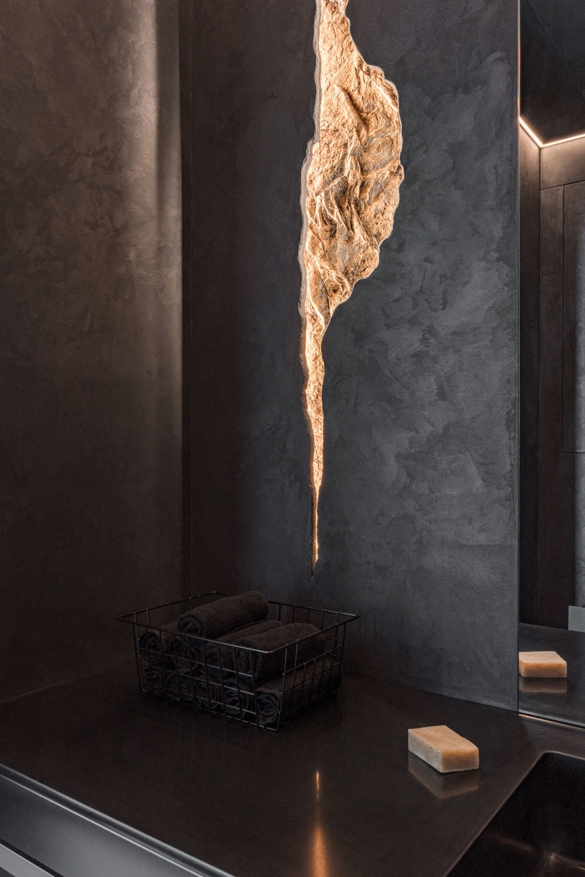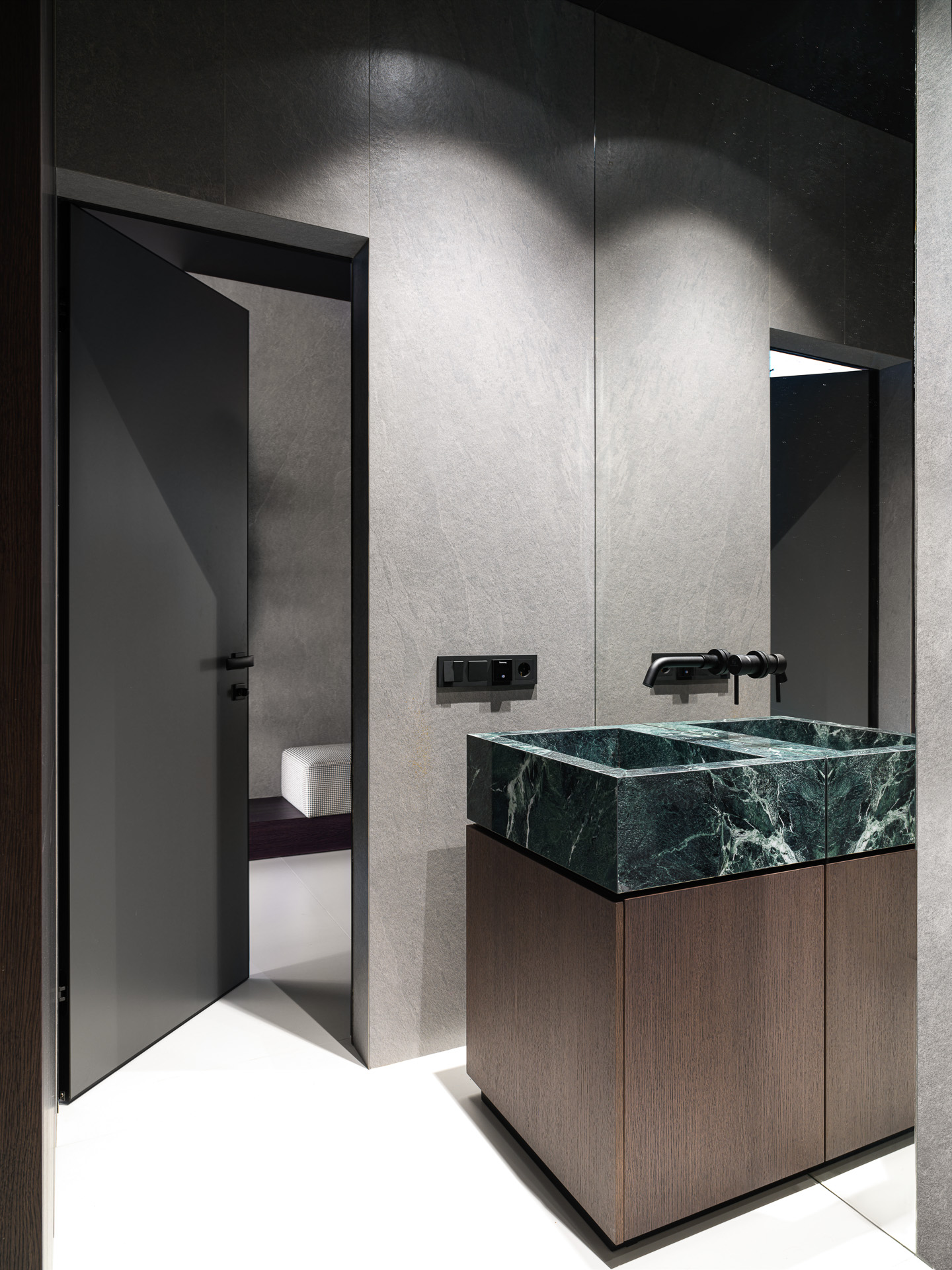 Концепция: В основе проекта лежит идея гармоничного синтеза современности и богатого культурного наследия. Строгий минимализм дизайна тонко уравновешен природными мотивами — травами, вырезанными на стенах, и натуральным камнем, символизирующими связь с корнями и подлинностью. Эта философия отражает ценности бренда: простота форм, чистота силуэта, уважение к материалам и ручному труду, выражая язык русской культуры через тактильность и стремление к естественности.