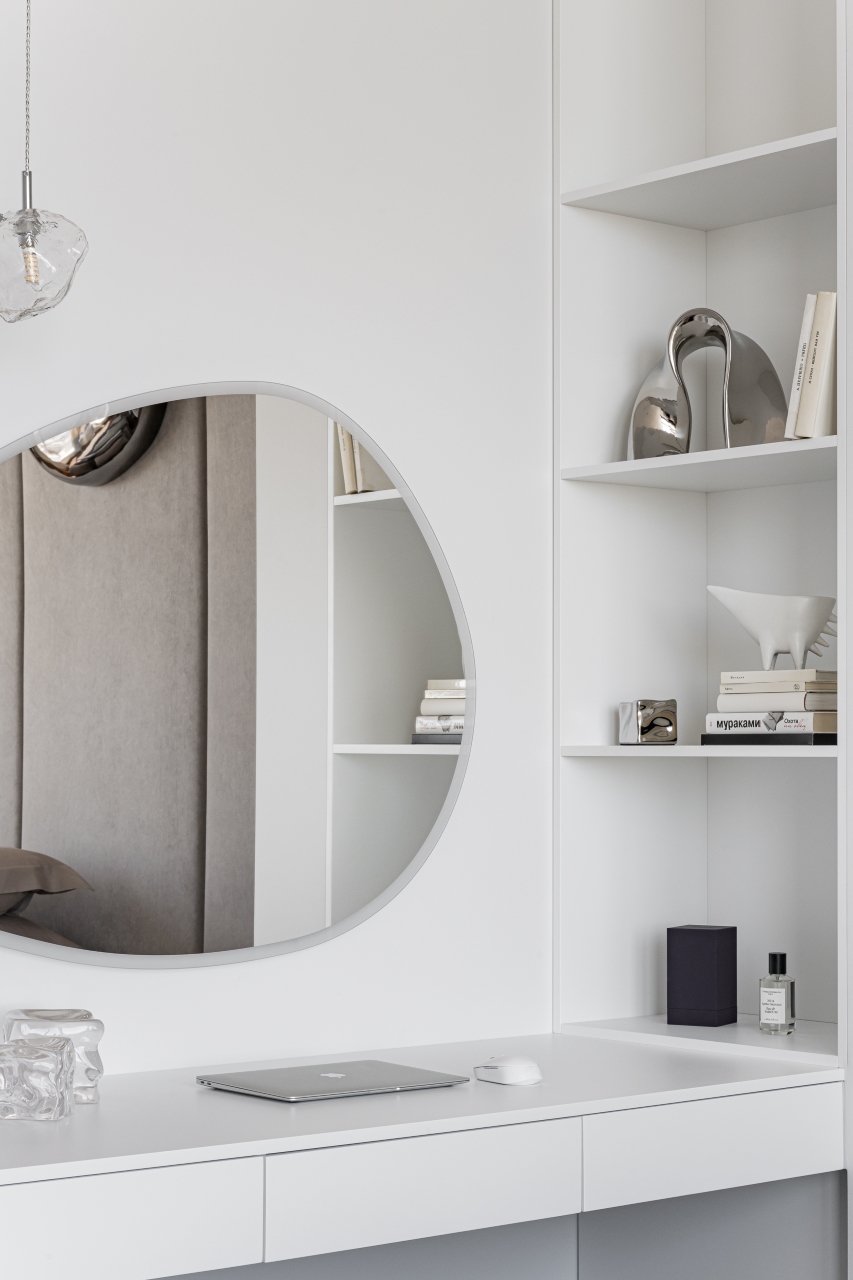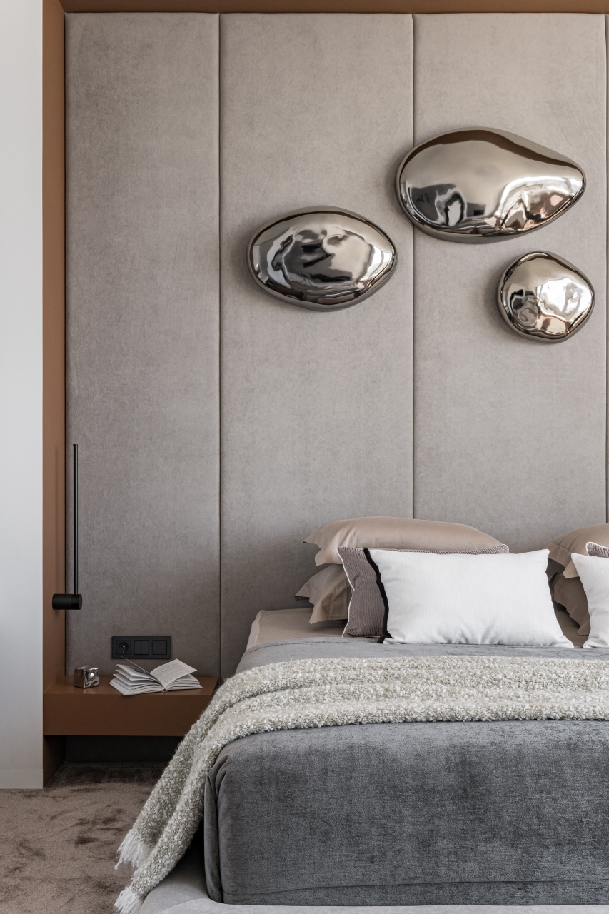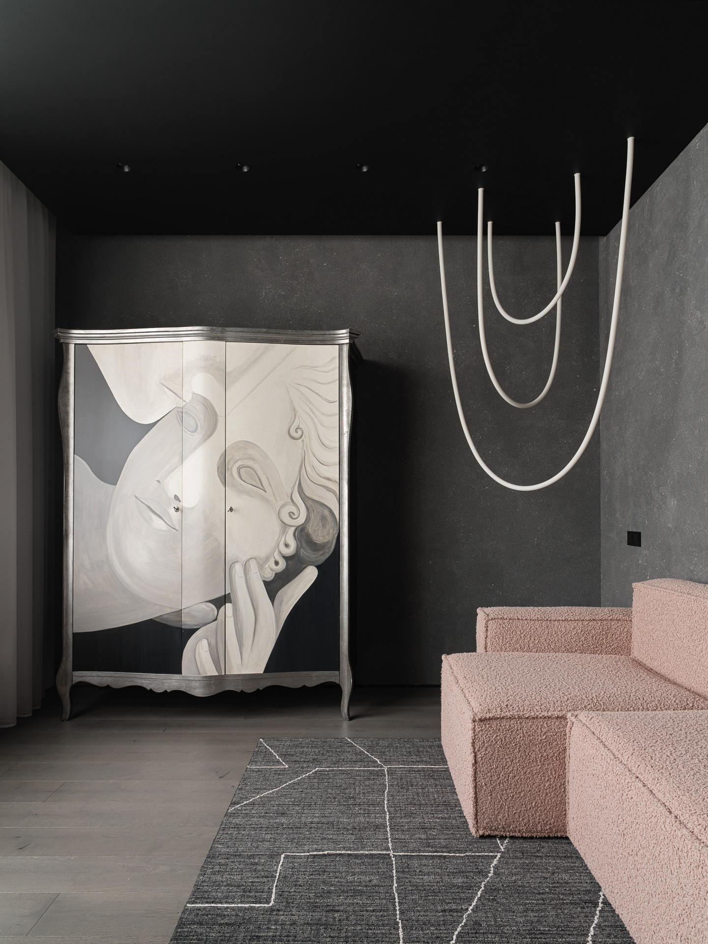 Искусство занимает особое место в этом интерьере. Картины и скульптуры, выбранные с любовью, создают атмосферу изысканности и утонченности. Лейтмотивом проекта стали изящные женские формы, которые так точно характеризуют нашу заказчицу. Мы предложили снять бюст с нашей заказчицы как с модели, и скульптор создал шедевр, который уже готов занять свое почетное место в квартире.