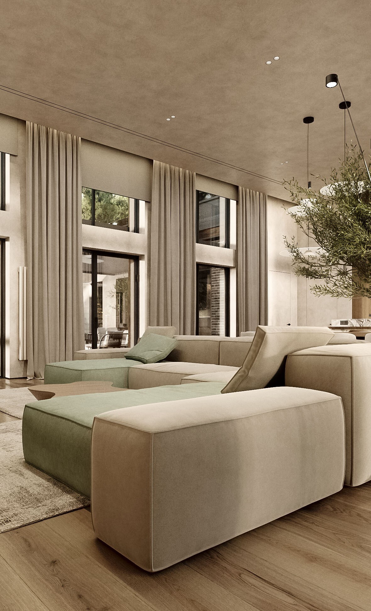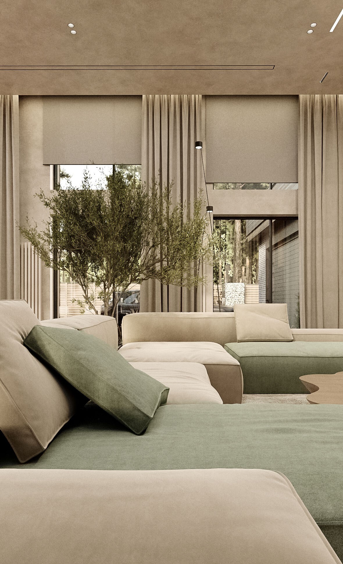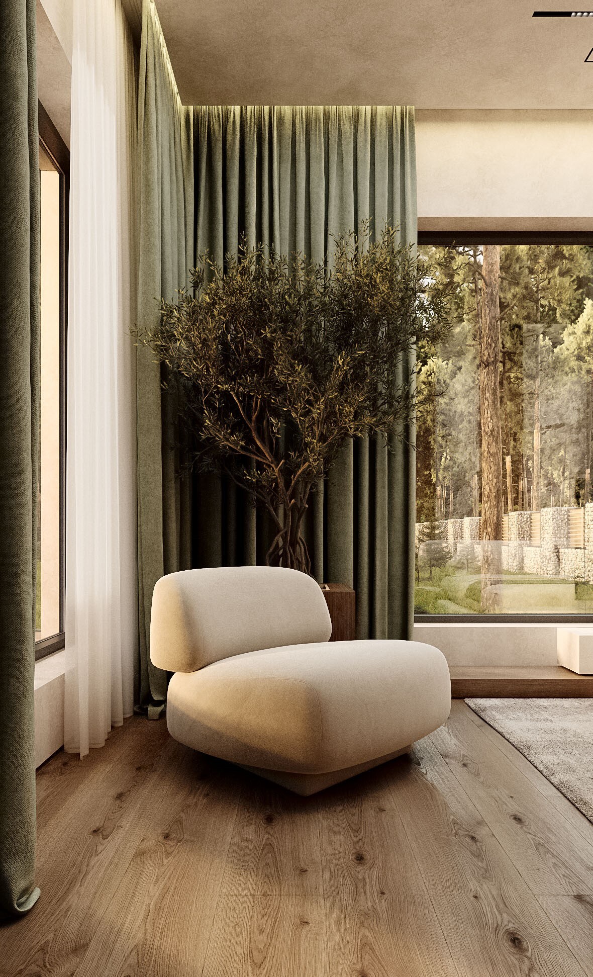 Концепция: Основная идея проекта — создание глубокой интеграции архитектуры и интерьера с окружающей природой Волги. Планировочное решение в виде удлиненной, изогнутой формы ориентировано на максимальное использование солнечного света и захватывающих видов, обеспечивая приватность. Интерьер продолжает эту философию через мягкие линии, природные текстуры камня и дерева, а также элементы растительности, создавая атмосферу спокойствия. Цветовая палитра основана на естественных оттенках, усиливающих ощущение уюта и гармонии.