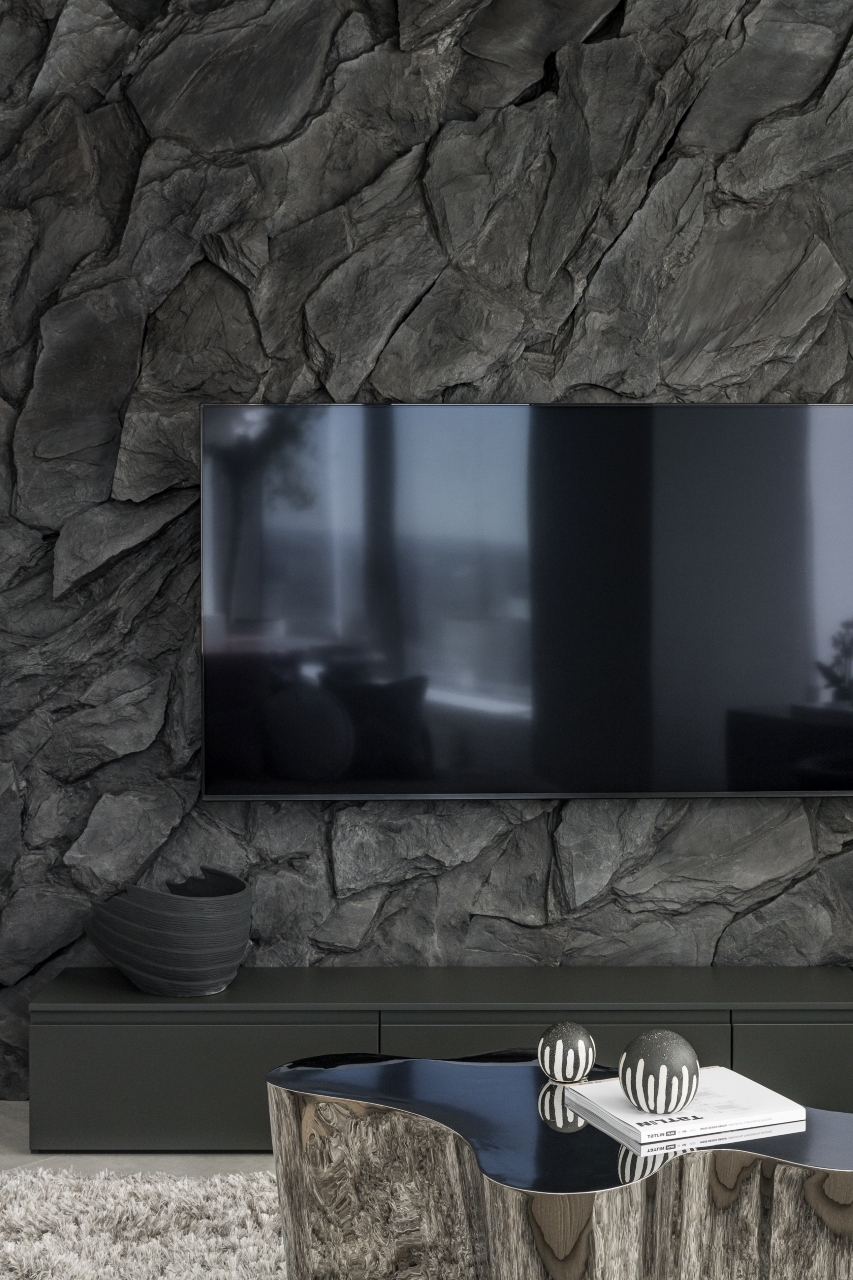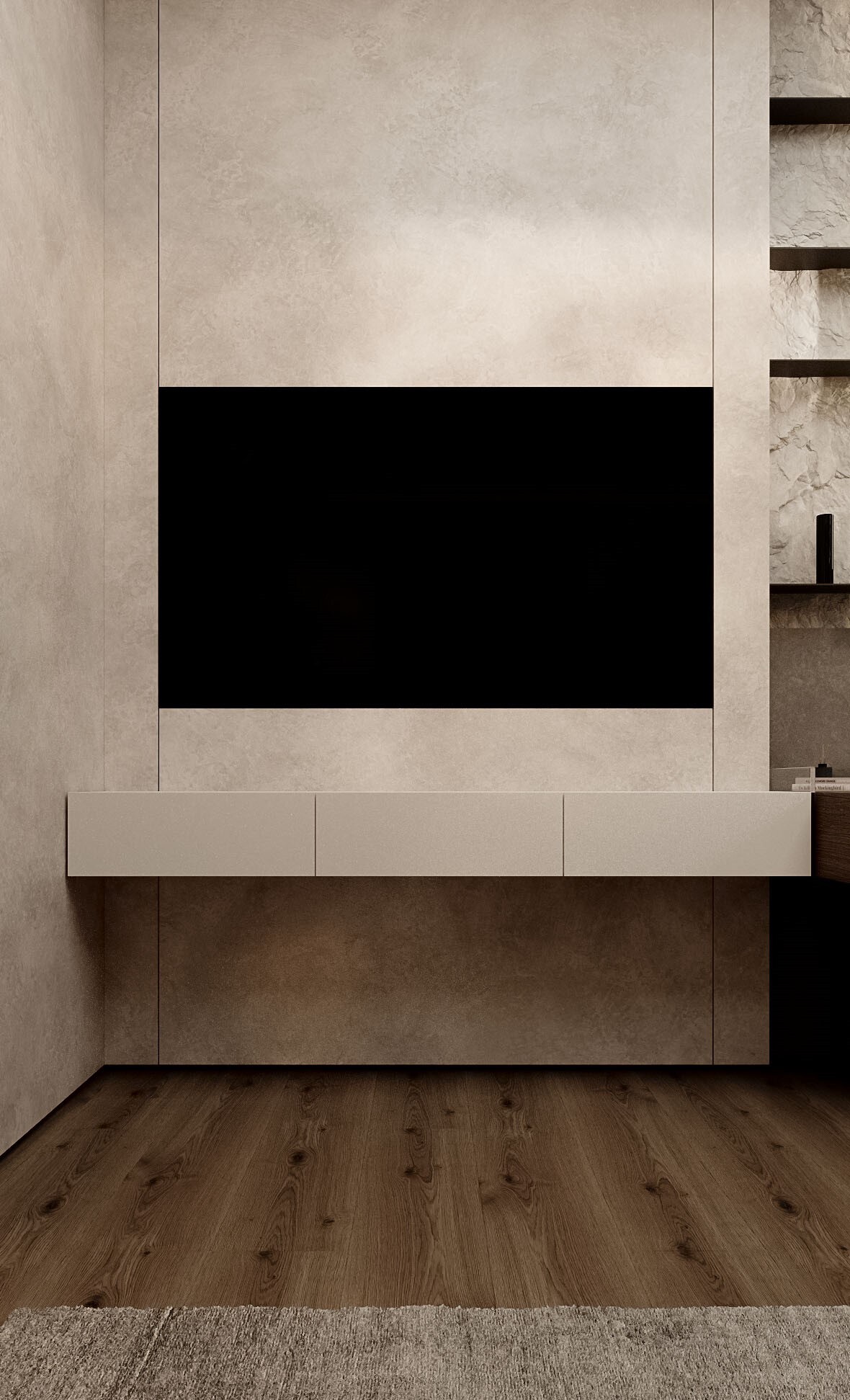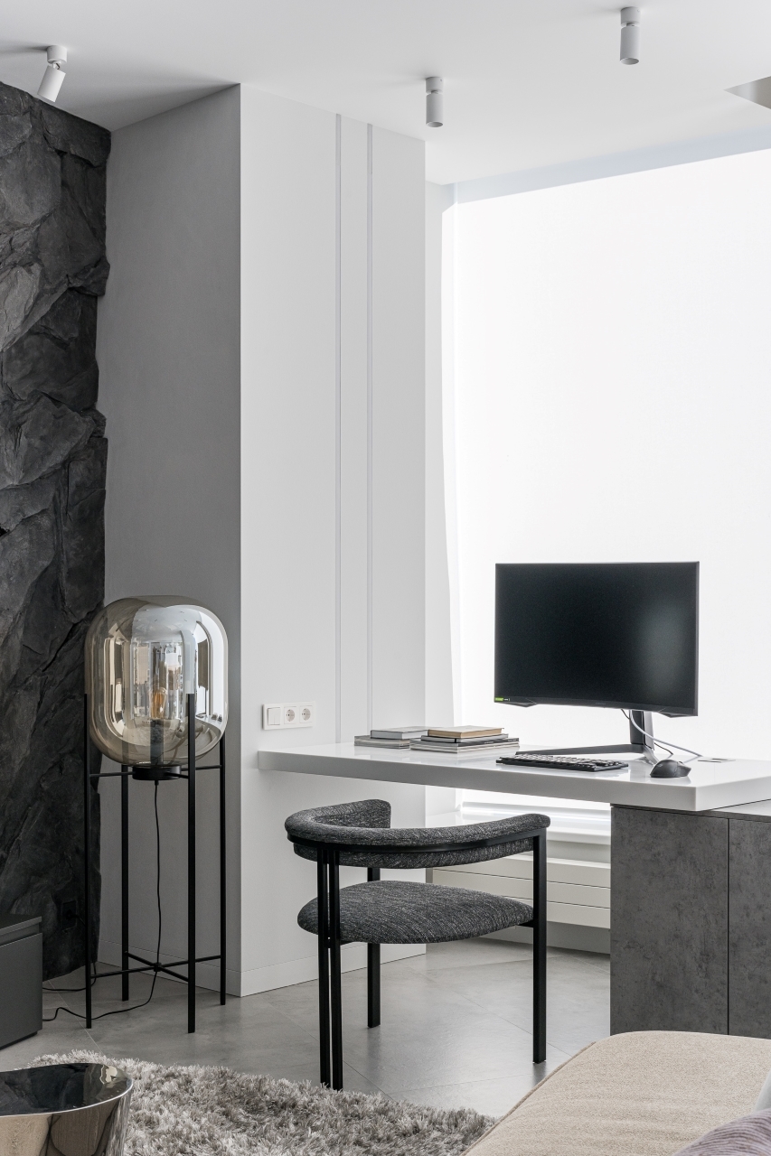 Концепция: Основная идея проекта — формирование динамичного и стильного пространства, отражающего современный ритм жизни. Дизайнерская концепция строится на игре контрастов: светлый пол и темный потолок создают графичную основу, в то время как текстуры камня, стекла и дерева добавляют глубину и природную эстетику. Интеграция функциональных зон и продуманных деталей, таких как рабочий камин, направлена на создание комфортной и вдохновляющей среды, идеально подходящей для молодой и активной личности.