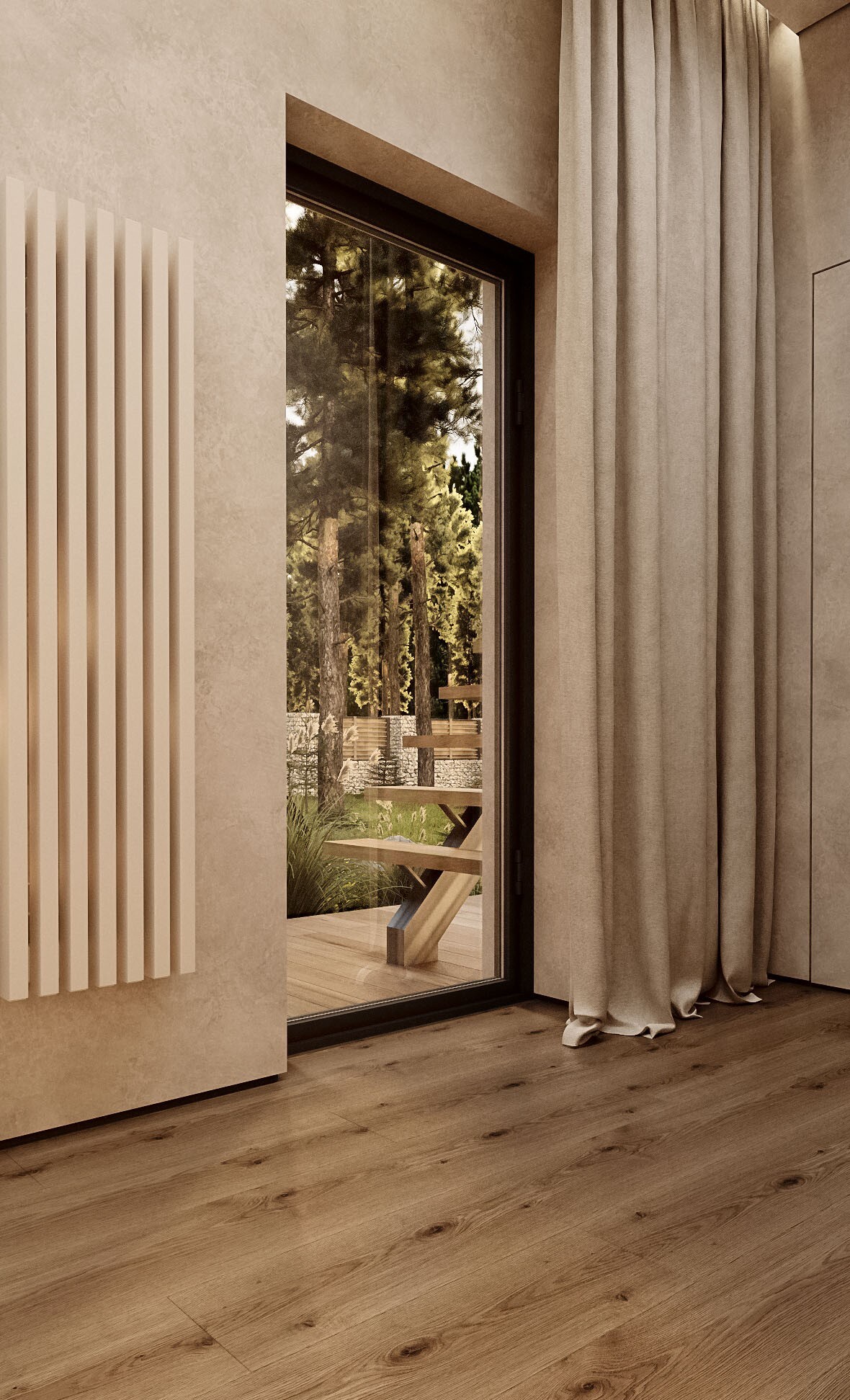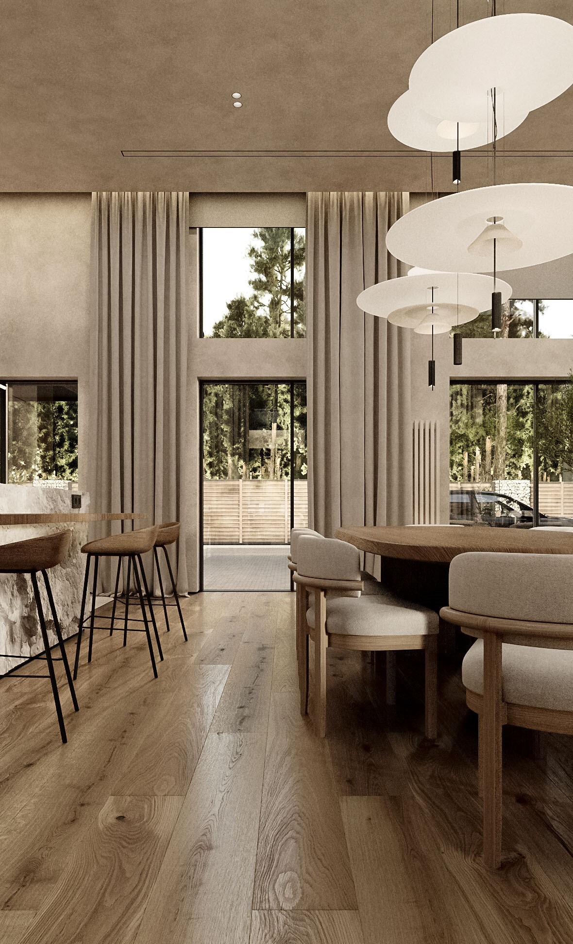 Этот проект – истинное воплощение гармонии и умиротворения, где каждая деталь, от органических форм до мягких природных оттенков, призвана создать атмосферу уюта. Каждая комната предлагает уникальный опыт, от уединенной мастер-спальни до светлой кухни с панорамными видами на сосновый лес.