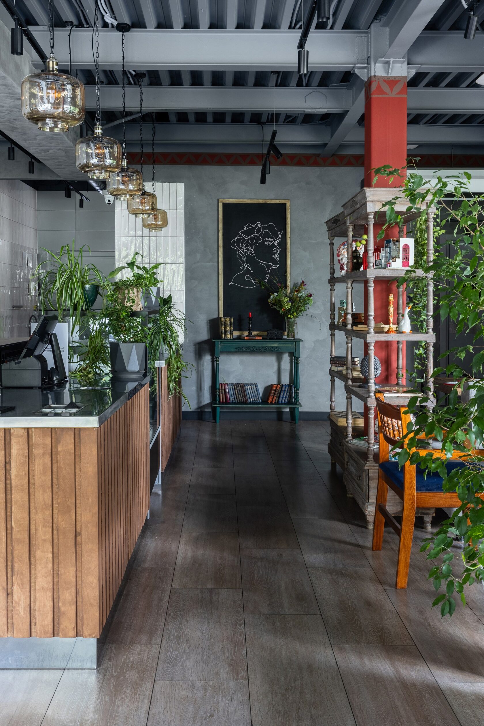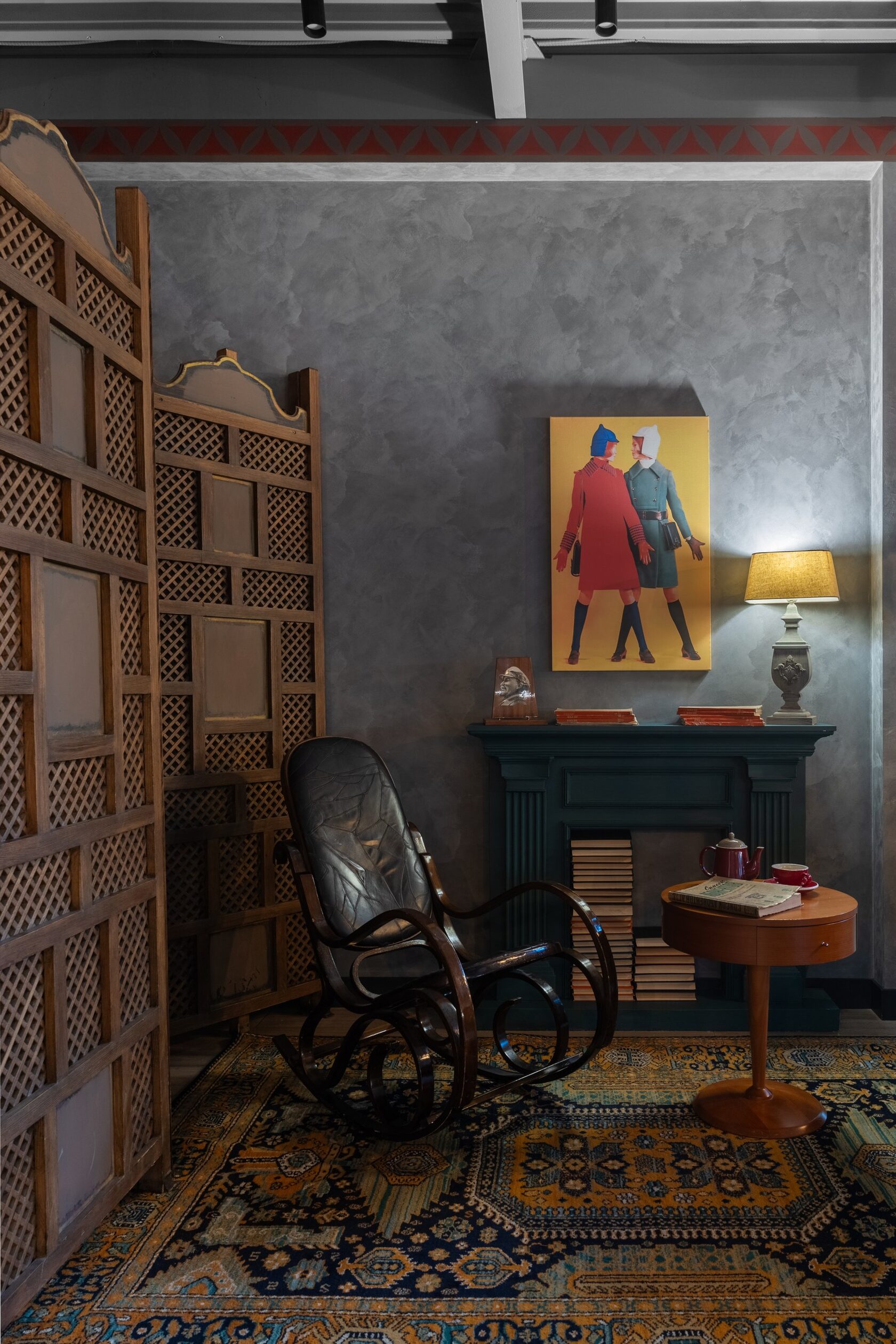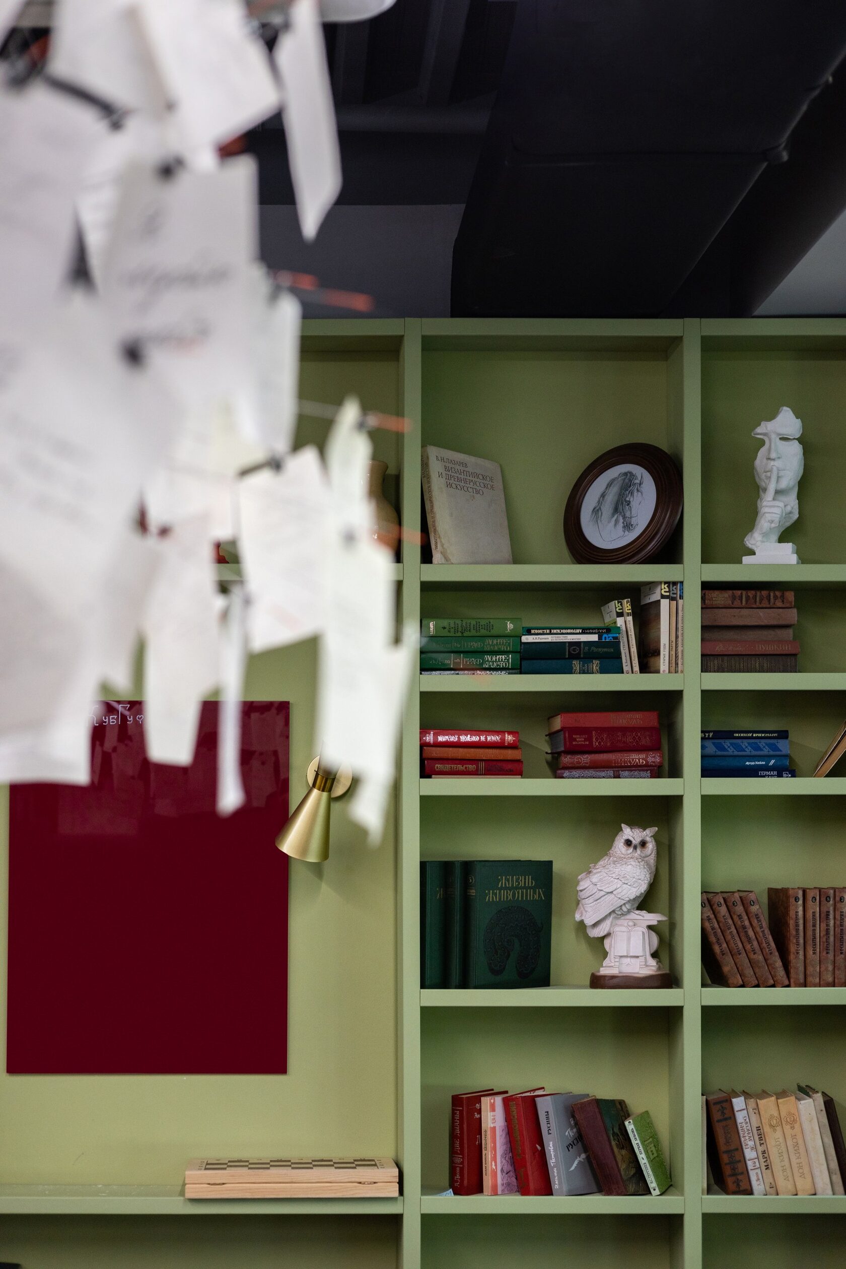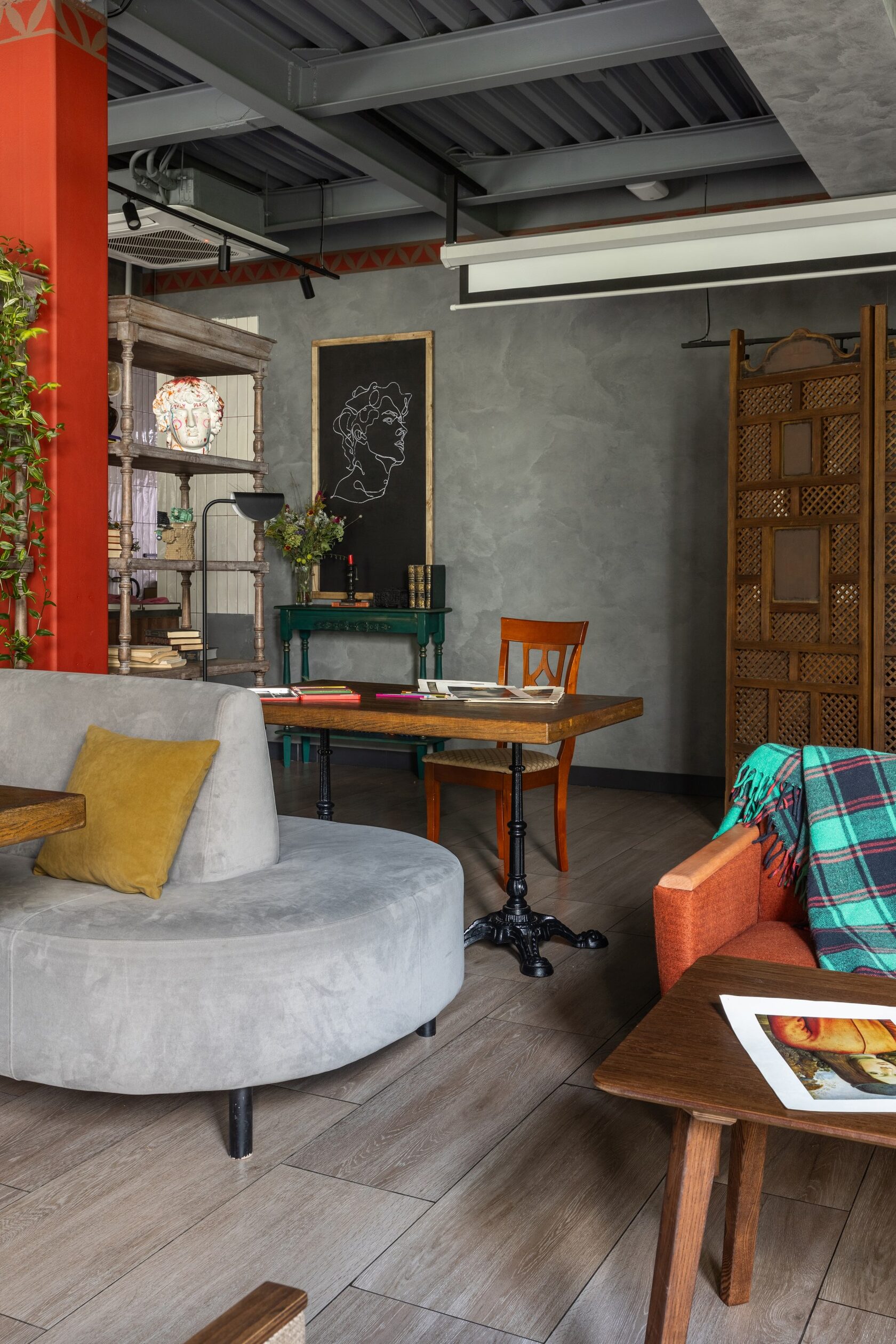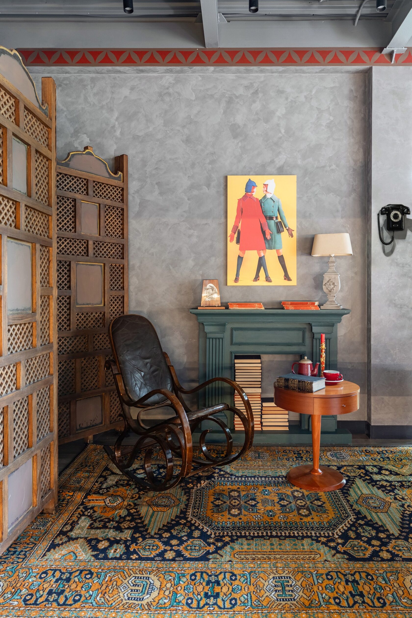 Концепция: Концепция проекта глубоко укоренена в сочетании образовательной тематики и мотивов древнерусского стиля, символизируя идею «Учение — свет». Это позволило сформировать теплую, обволакивающую атмосферу, лишенную холодной новизны, что особенно ценно для целевой аудитории — студентов. Пространство трансформировалось исключительно за счет декоративных приемов: стратегически расположенные зеркала, расширяющие библиотеку и корректирующие геометрию зала; палитра, основанная на традиционных красно-зелено-коричневых оттенках с серым фоном; и обилие винтажных предметов, собранных по всей стране, включая уникальные резные элементы и авторскую плитку. Каждая деталь, от подвесного светильника с записками до старинного крымского панно, стремится воссоздать образ гостеприимного русского дома, наполненного историей и индивидуальностью.