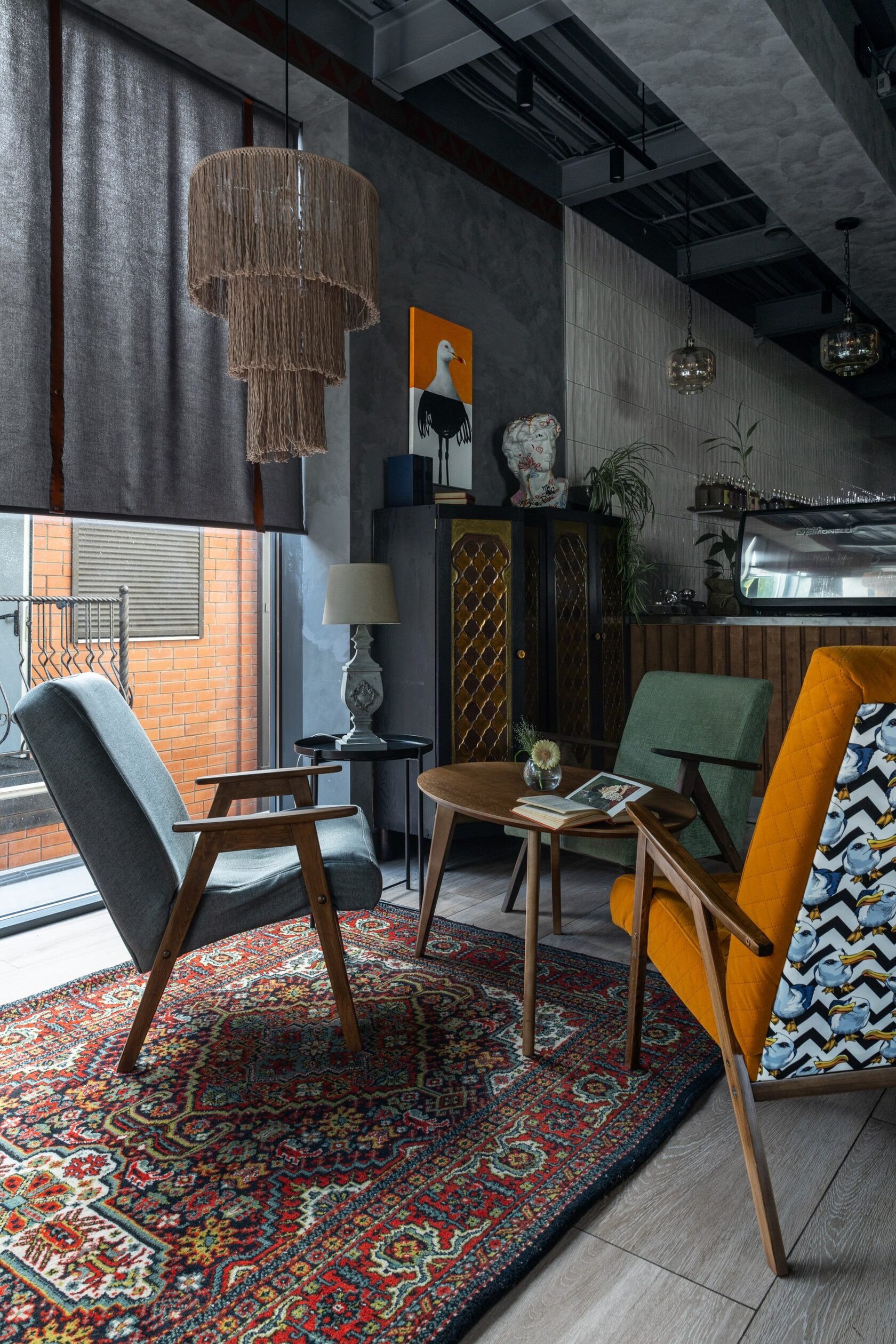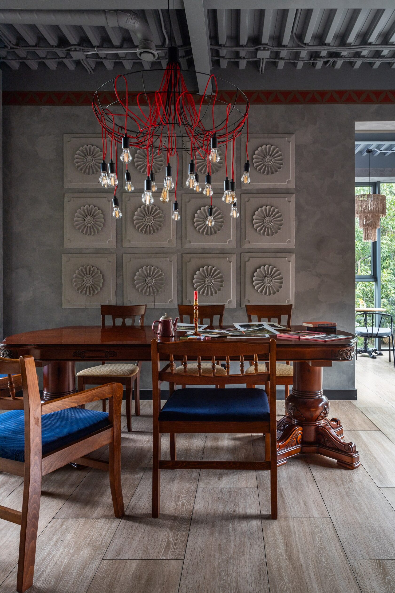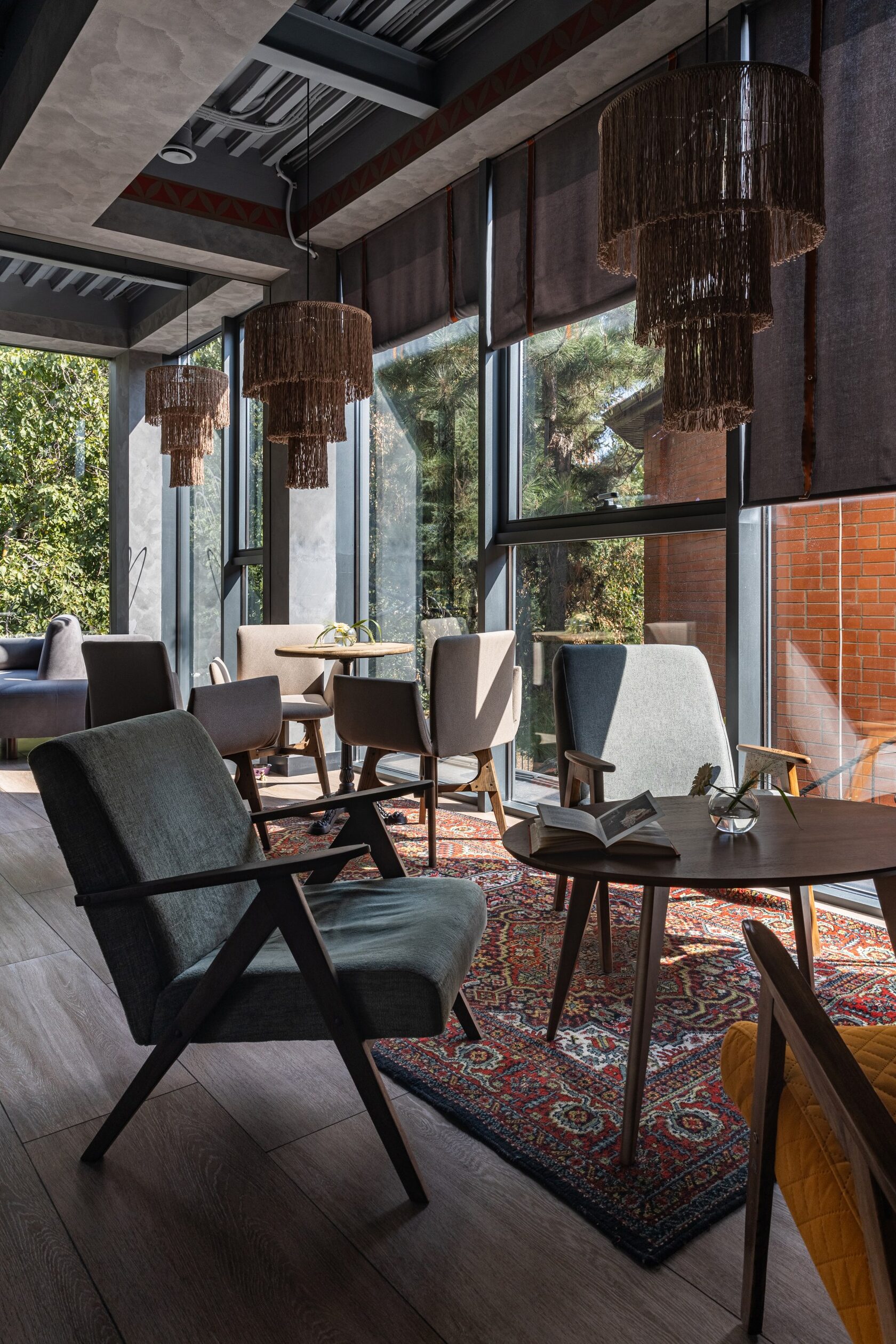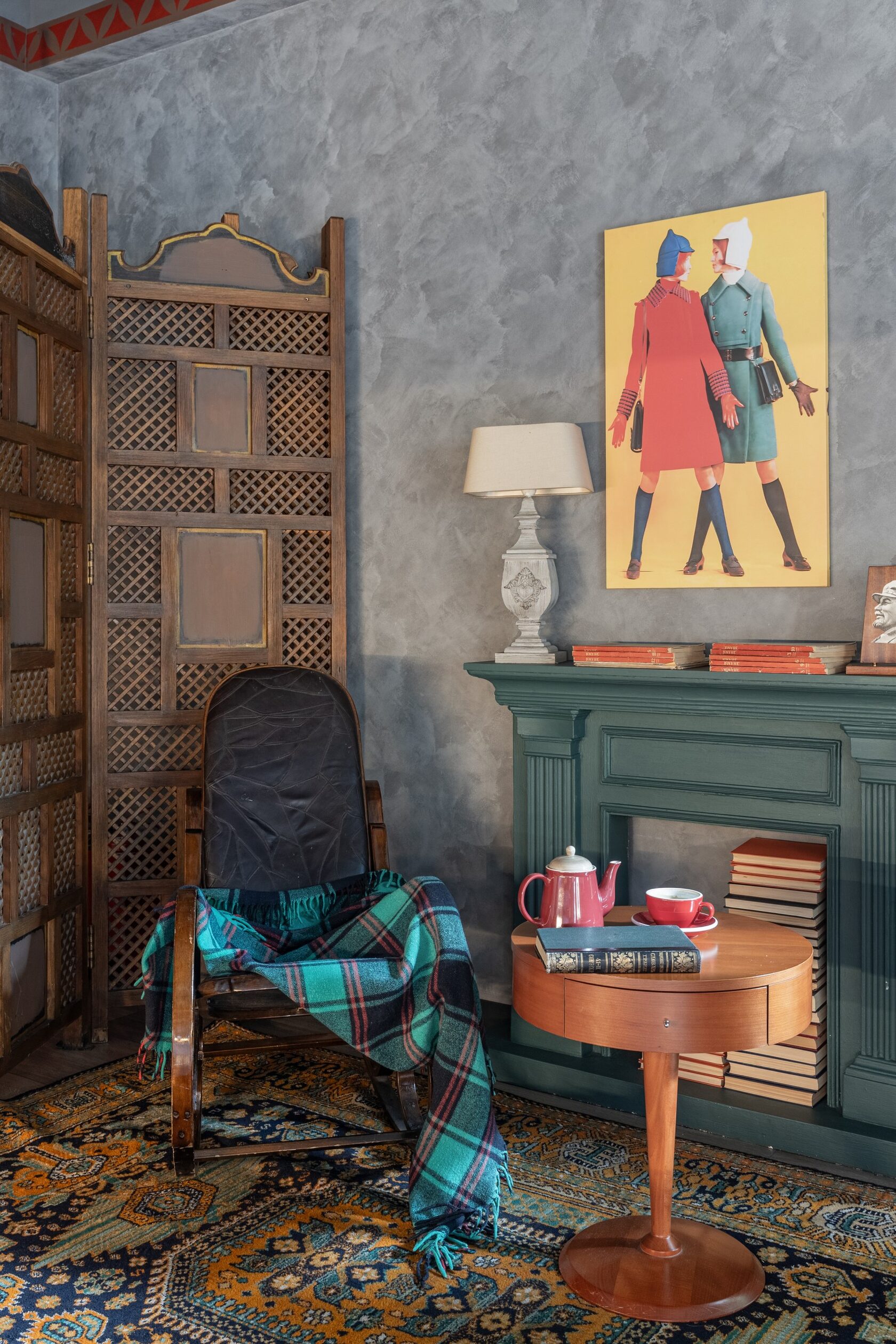 Концепция: Концепция проекта глубоко укоренена в сочетании образовательной тематики и мотивов древнерусского стиля, символизируя идею «Учение — свет». Это позволило сформировать теплую, обволакивающую атмосферу, лишенную холодной новизны, что особенно ценно для целевой аудитории — студентов. Пространство трансформировалось исключительно за счет декоративных приемов: стратегически расположенные зеркала, расширяющие библиотеку и корректирующие геометрию зала; палитра, основанная на традиционных красно-зелено-коричневых оттенках с серым фоном; и обилие винтажных предметов, собранных по всей стране, включая уникальные резные элементы и авторскую плитку. Каждая деталь, от подвесного светильника с записками до старинного крымского панно, стремится воссоздать образ гостеприимного русского дома, наполненного историей и индивидуальностью.