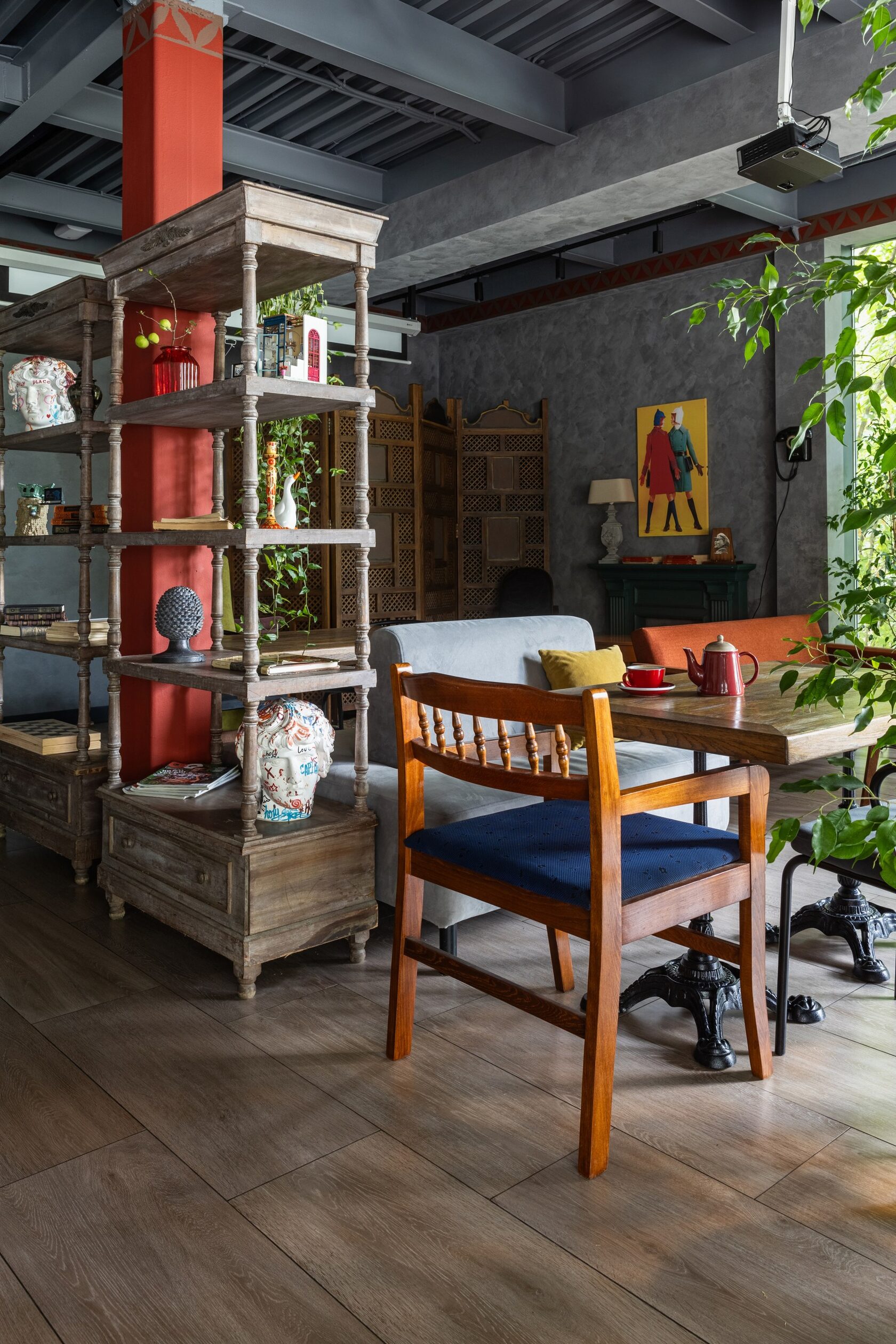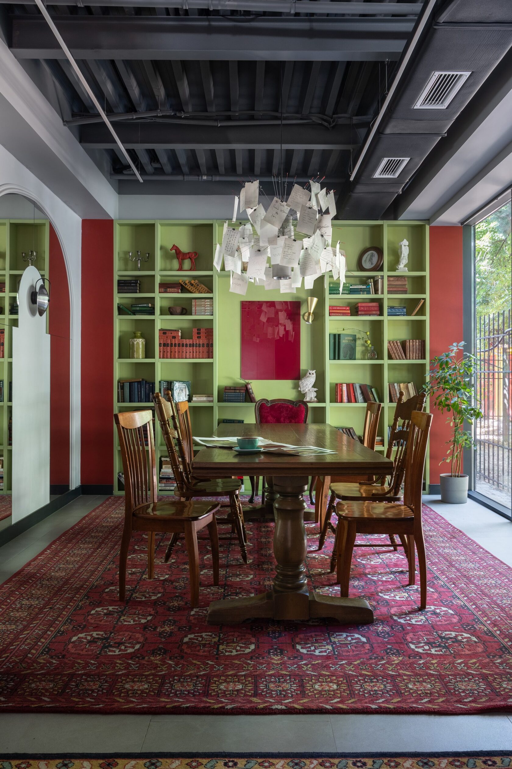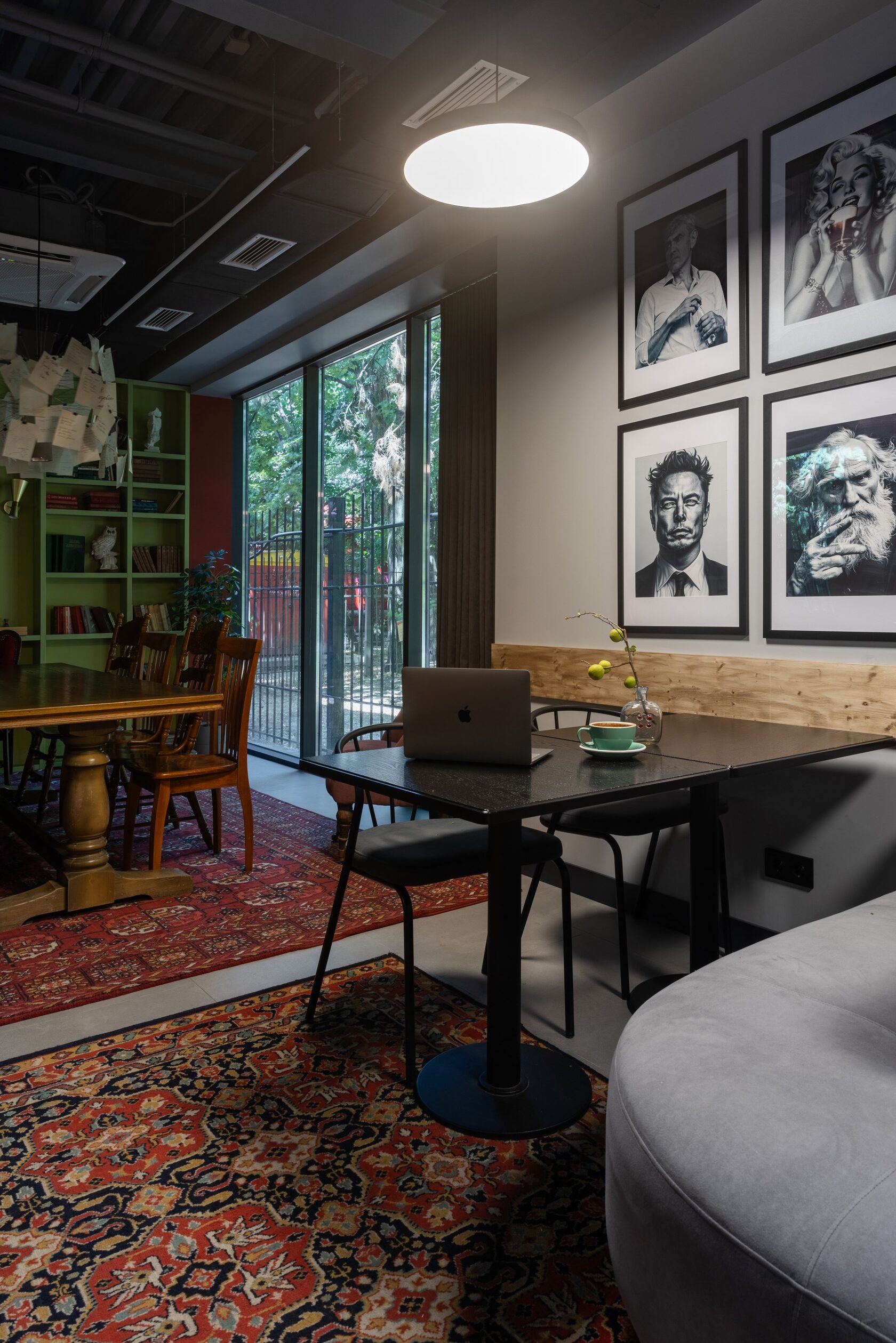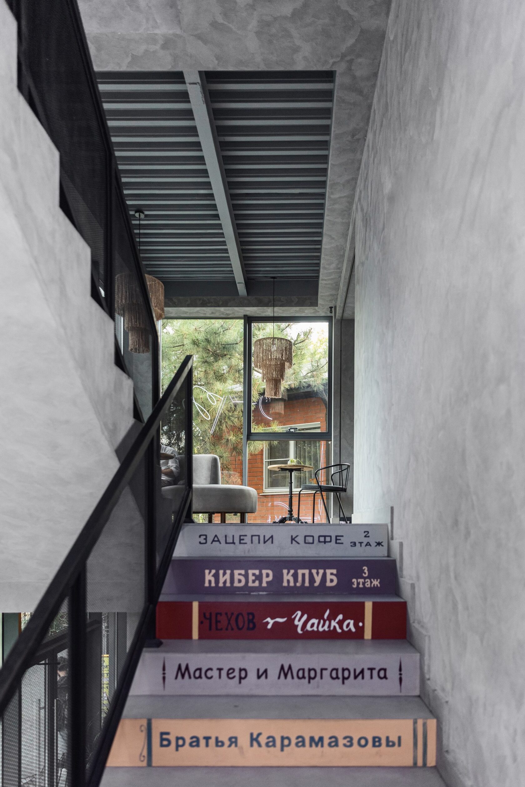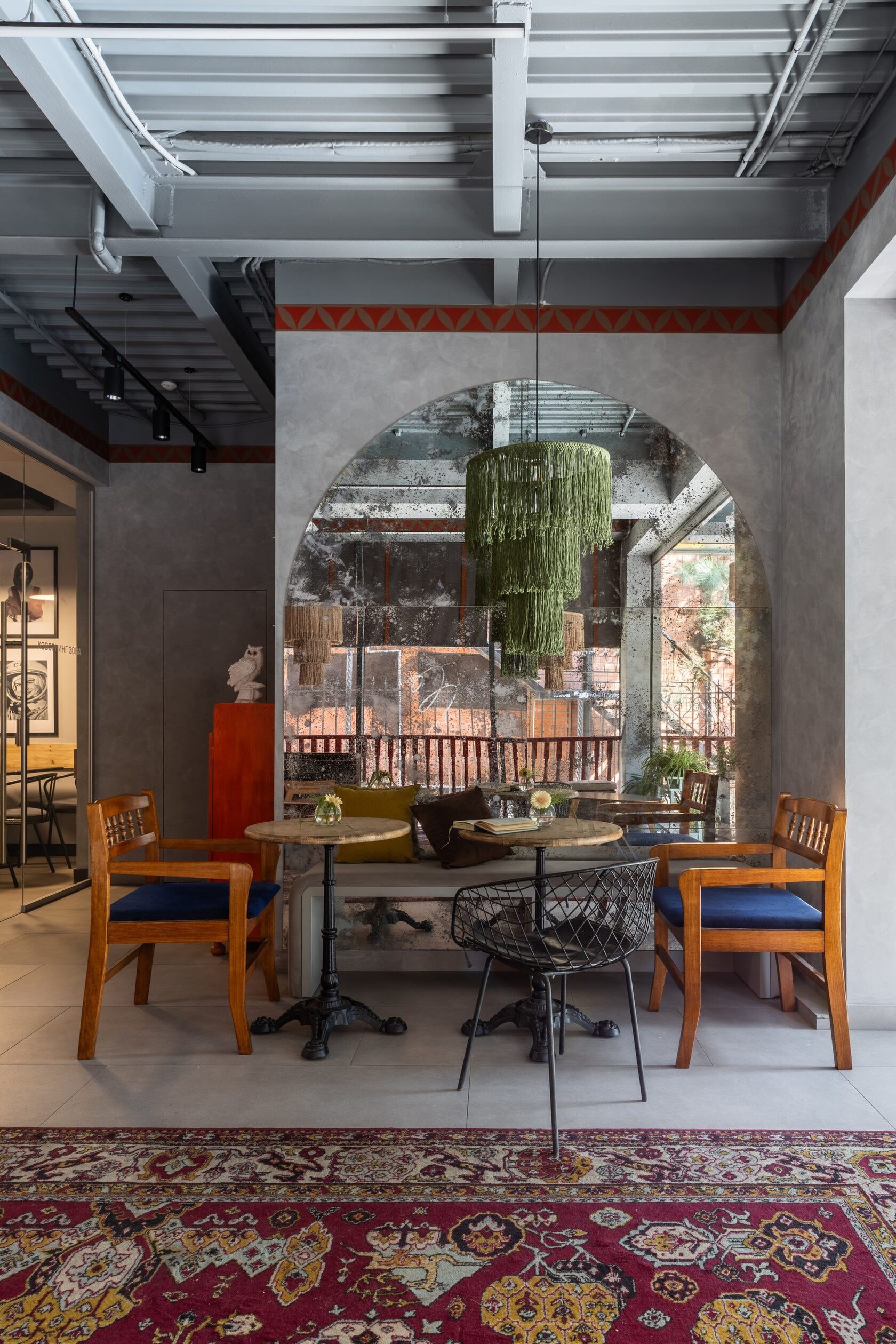 Концепция: Концепция проекта глубоко укоренена в сочетании образовательной тематики и мотивов древнерусского стиля, символизируя идею «Учение — свет». Это позволило сформировать теплую, обволакивающую атмосферу, лишенную холодной новизны, что особенно ценно для целевой аудитории — студентов. Пространство трансформировалось исключительно за счет декоративных приемов: стратегически расположенные зеркала, расширяющие библиотеку и корректирующие геометрию зала; палитра, основанная на традиционных красно-зелено-коричневых оттенках с серым фоном; и обилие винтажных предметов, собранных по всей стране, включая уникальные резные элементы и авторскую плитку. Каждая деталь, от подвесного светильника с записками до старинного крымского панно, стремится воссоздать образ гостеприимного русского дома, наполненного историей и индивидуальностью.