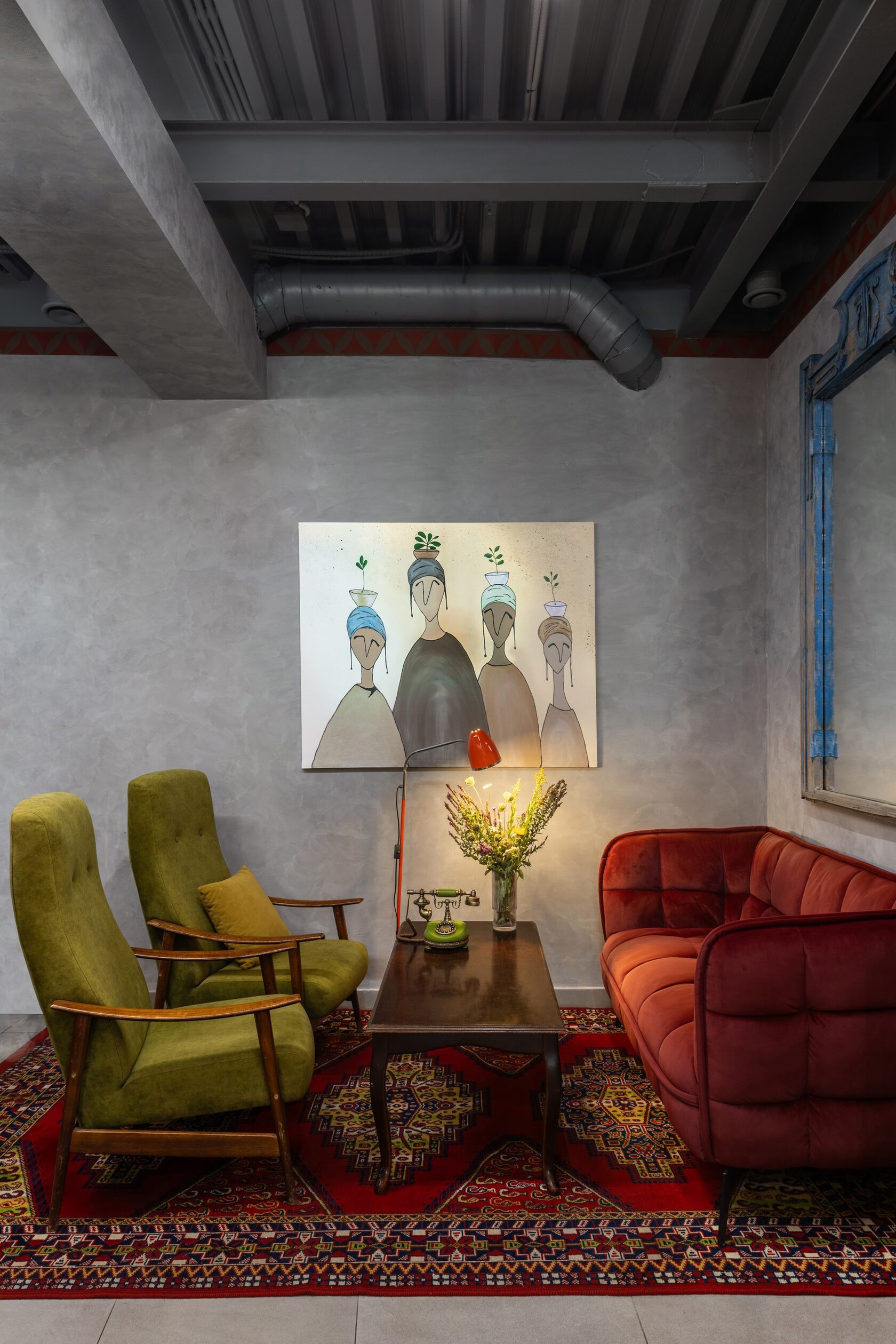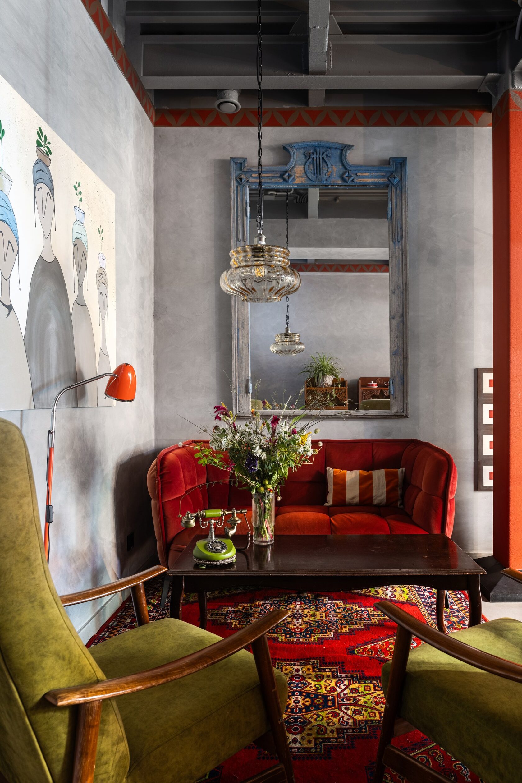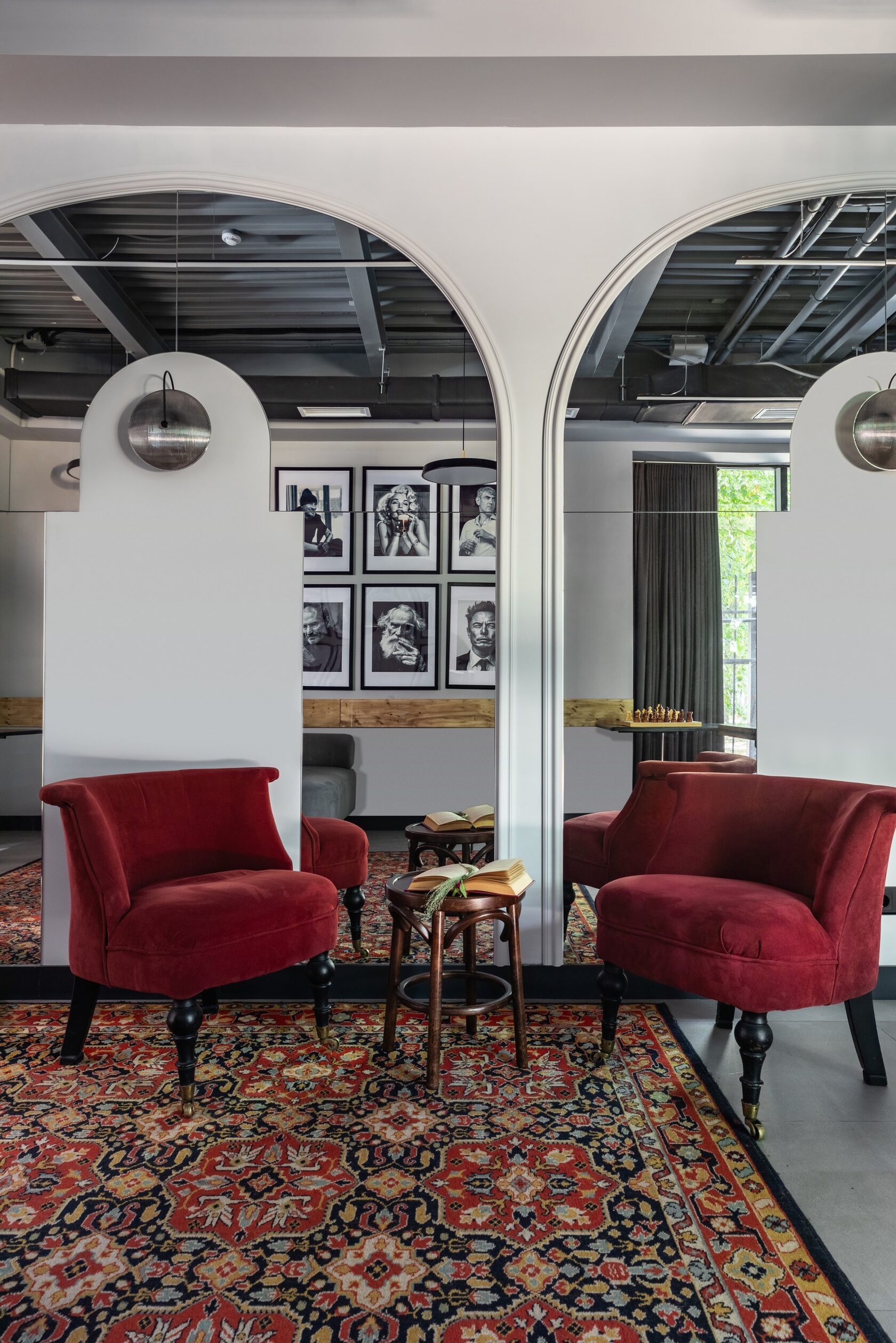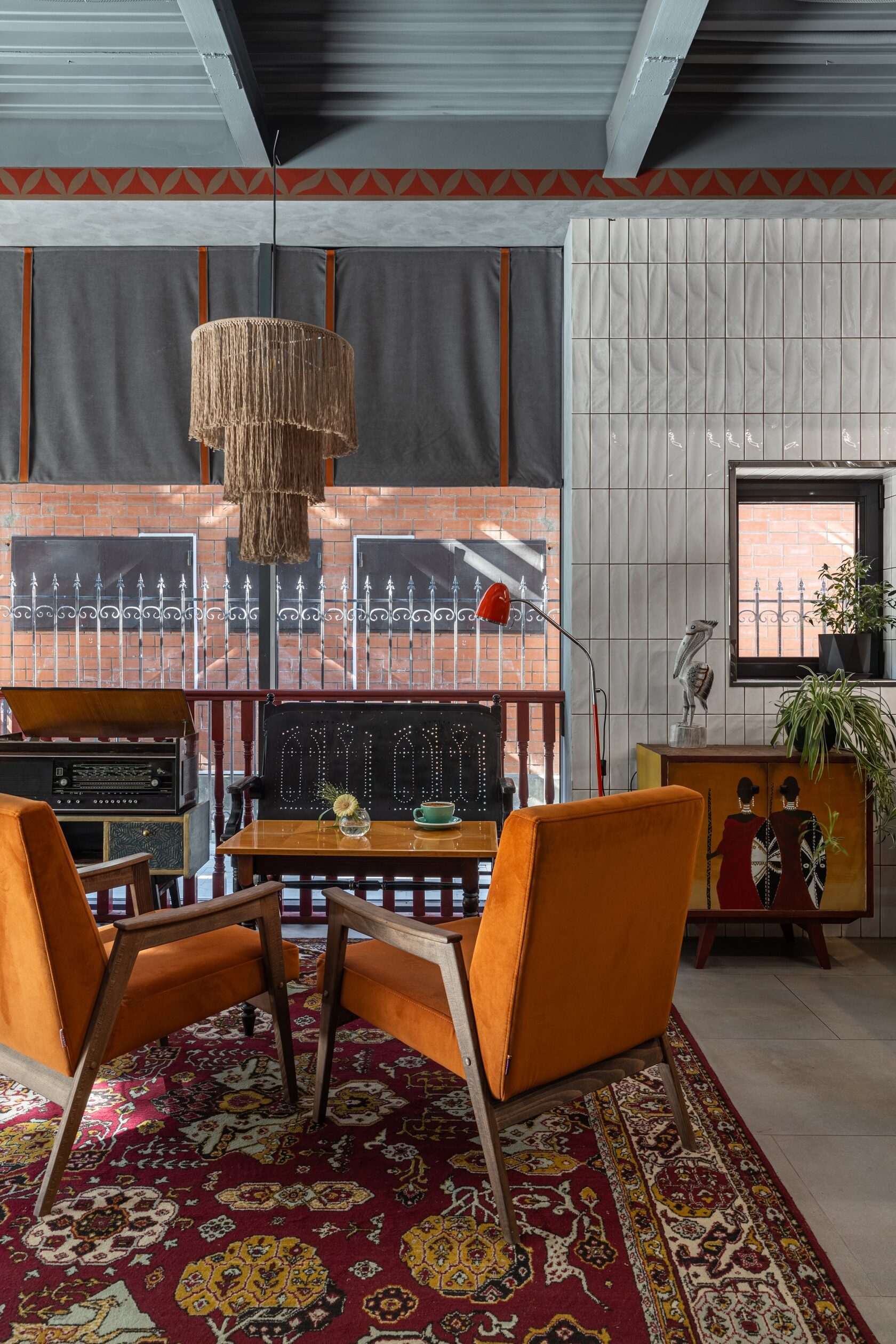 Концепция: Концепция проекта глубоко укоренена в сочетании образовательной тематики и мотивов древнерусского стиля, символизируя идею «Учение — свет». Это позволило сформировать теплую, обволакивающую атмосферу, лишенную холодной новизны, что особенно ценно для целевой аудитории — студентов. Пространство трансформировалось исключительно за счет декоративных приемов: стратегически расположенные зеркала, расширяющие библиотеку и корректирующие геометрию зала; палитра, основанная на традиционных красно-зелено-коричневых оттенках с серым фоном; и обилие винтажных предметов, собранных по всей стране, включая уникальные резные элементы и авторскую плитку. Каждая деталь, от подвесного светильника с записками до старинного крымского панно, стремится воссоздать образ гостеприимного русского дома, наполненного историей и индивидуальностью.
