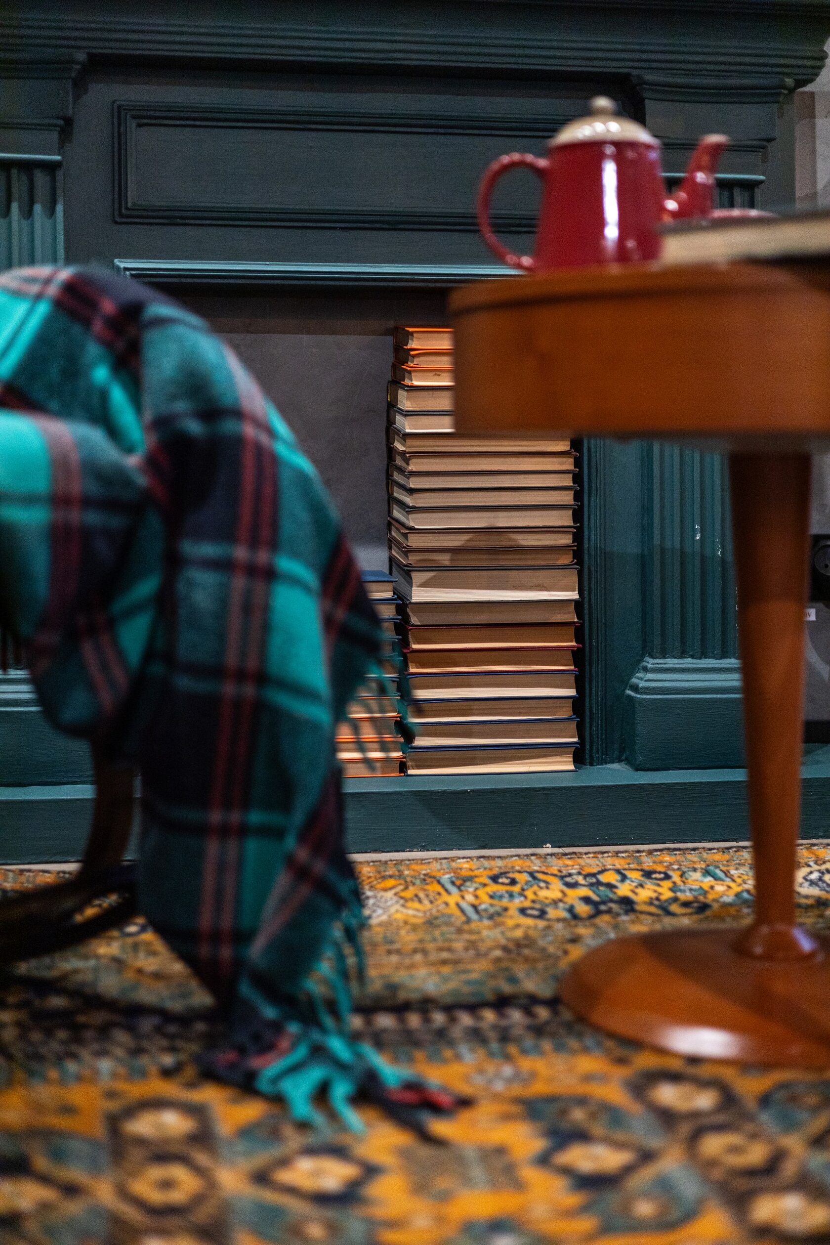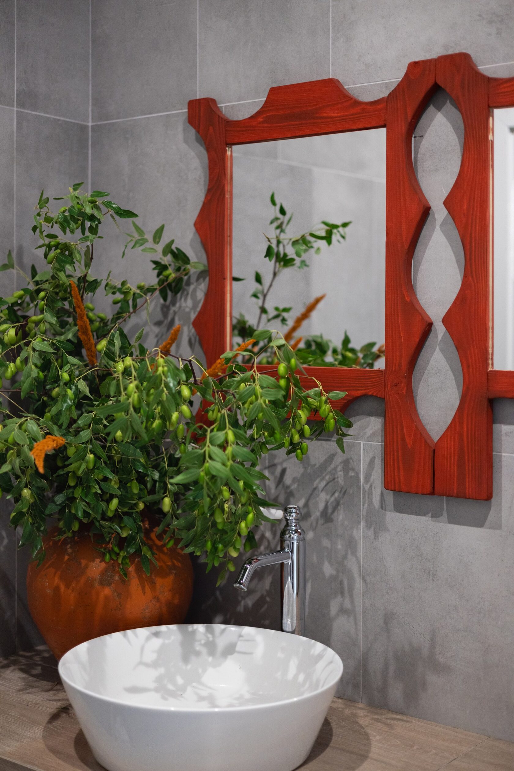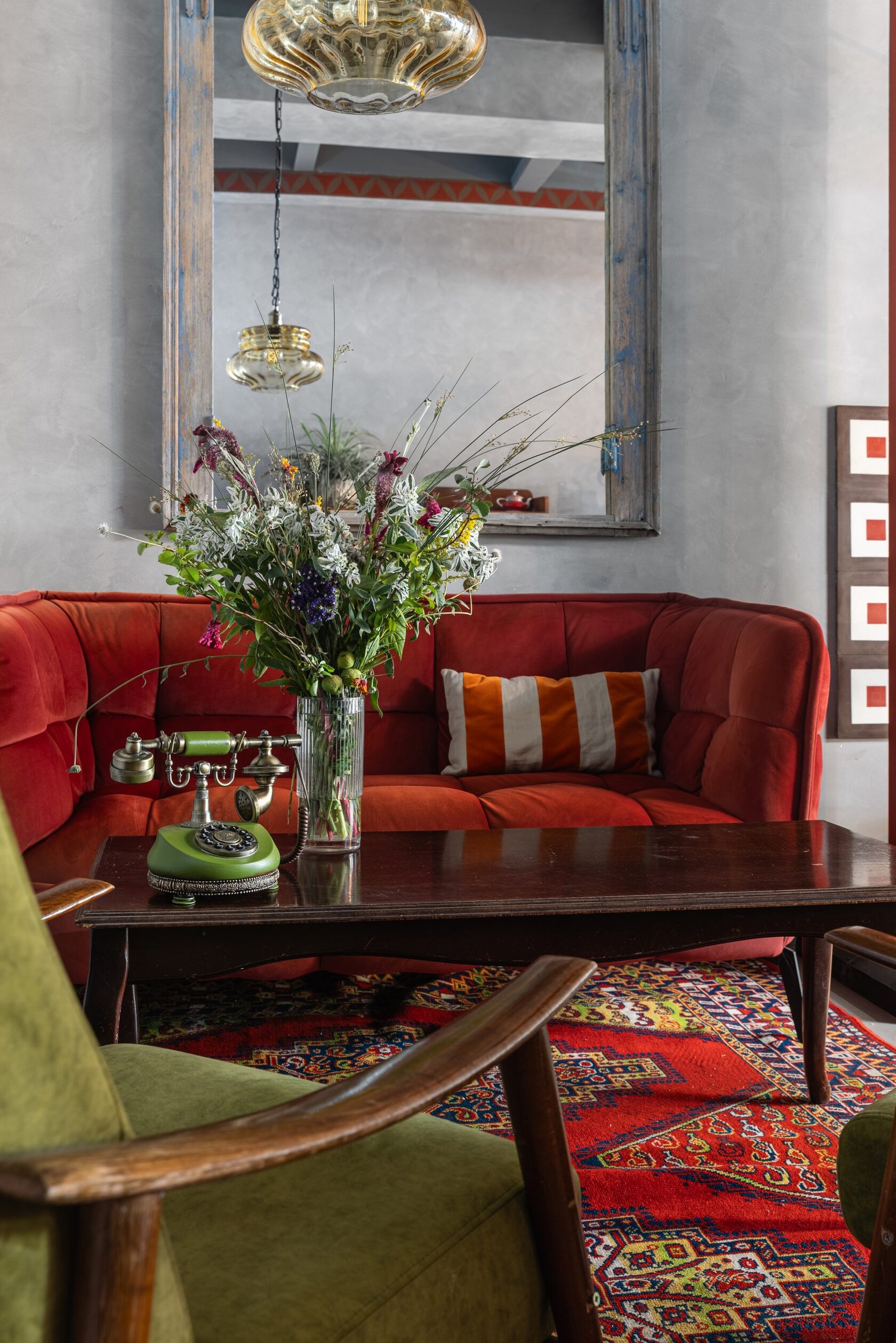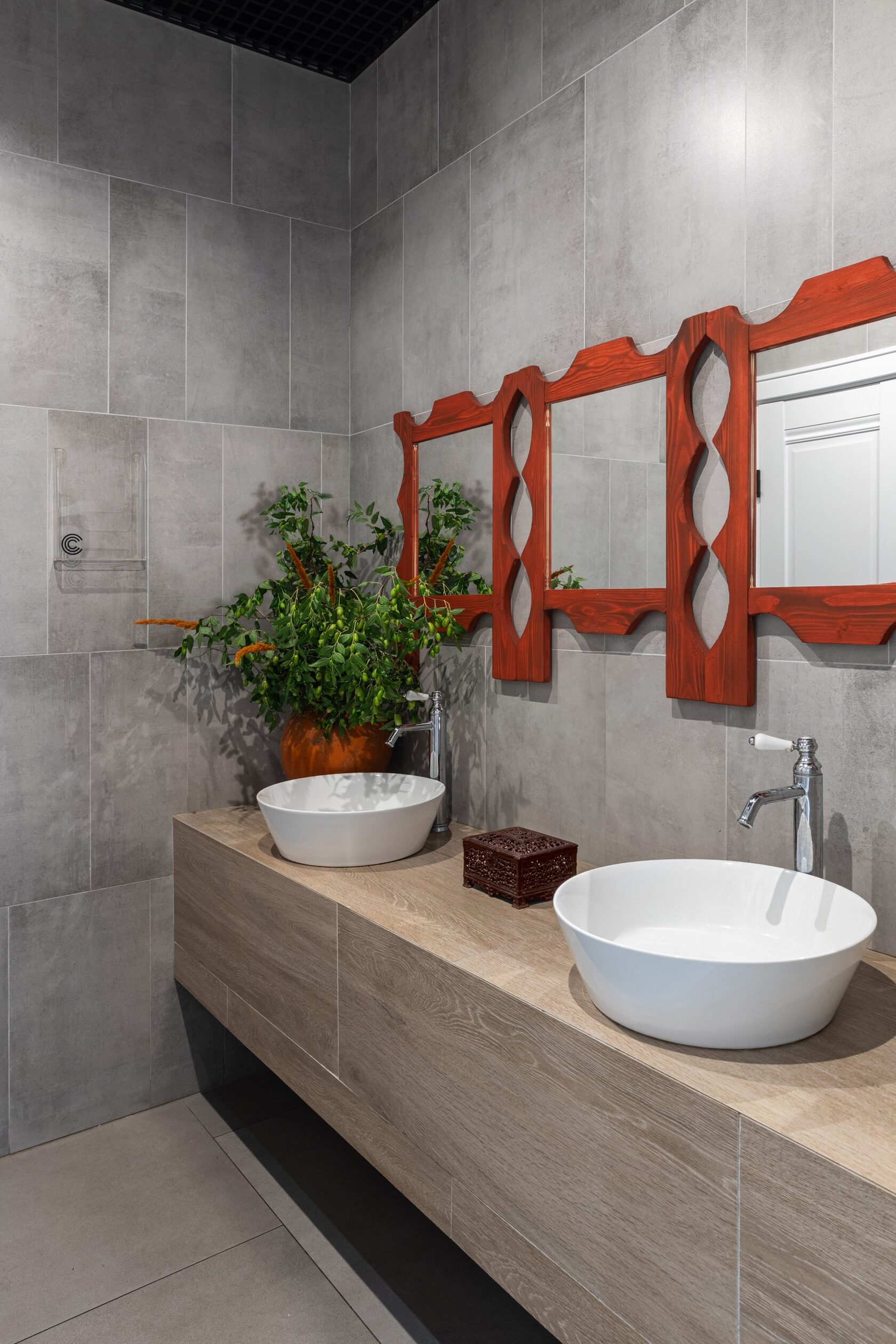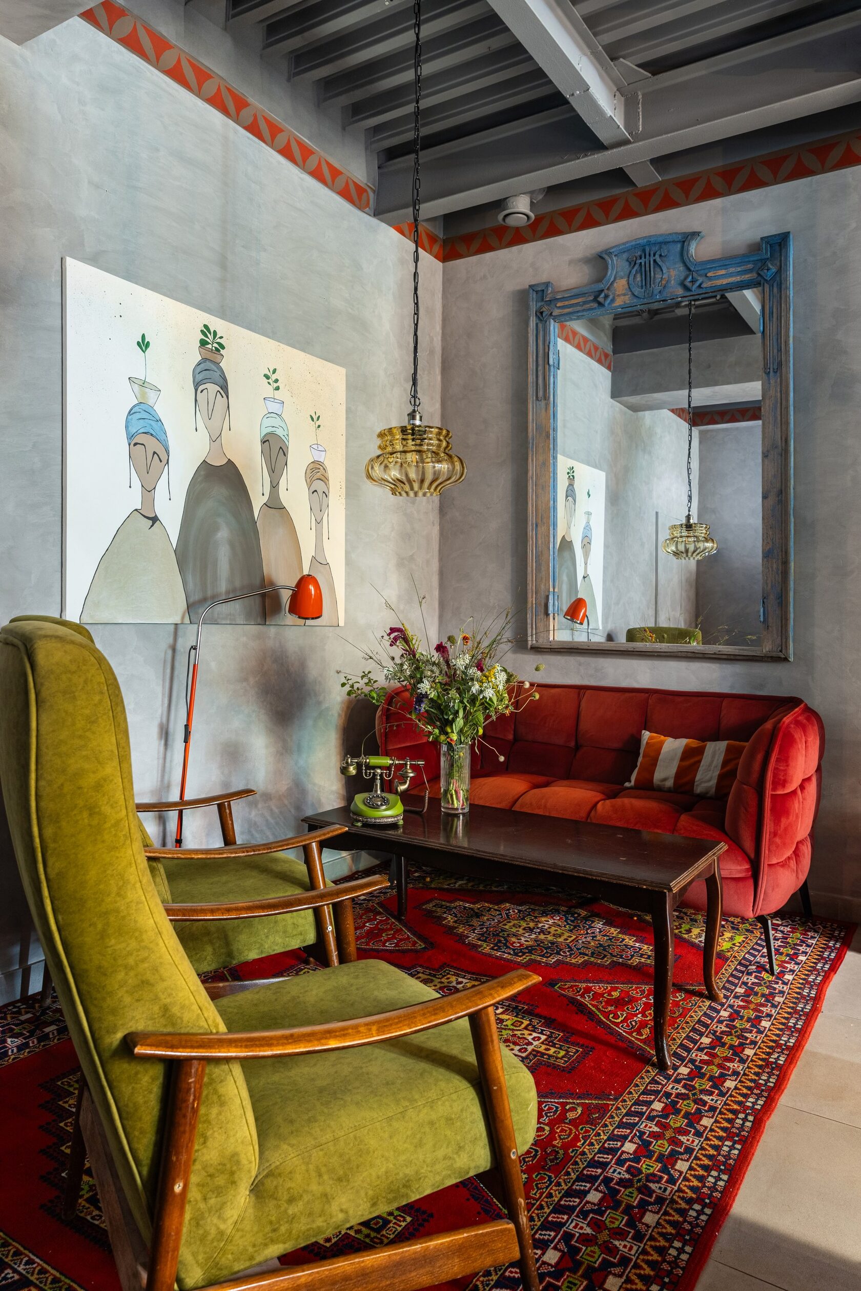 Концепция: Концепция проекта глубоко укоренена в сочетании образовательной тематики и мотивов древнерусского стиля, символизируя идею «Учение — свет». Это позволило сформировать теплую, обволакивающую атмосферу, лишенную холодной новизны, что особенно ценно для целевой аудитории — студентов. Пространство трансформировалось исключительно за счет декоративных приемов: стратегически расположенные зеркала, расширяющие библиотеку и корректирующие геометрию зала; палитра, основанная на традиционных красно-зелено-коричневых оттенках с серым фоном; и обилие винтажных предметов, собранных по всей стране, включая уникальные резные элементы и авторскую плитку. Каждая деталь, от подвесного светильника с записками до старинного крымского панно, стремится воссоздать образ гостеприимного русского дома, наполненного историей и индивидуальностью.