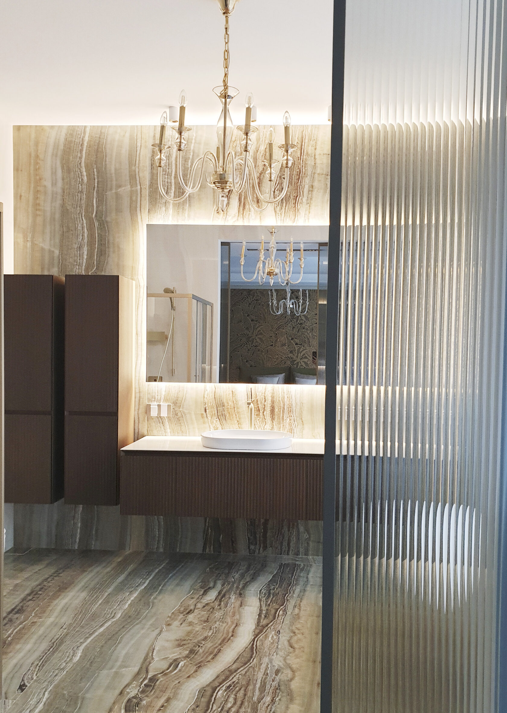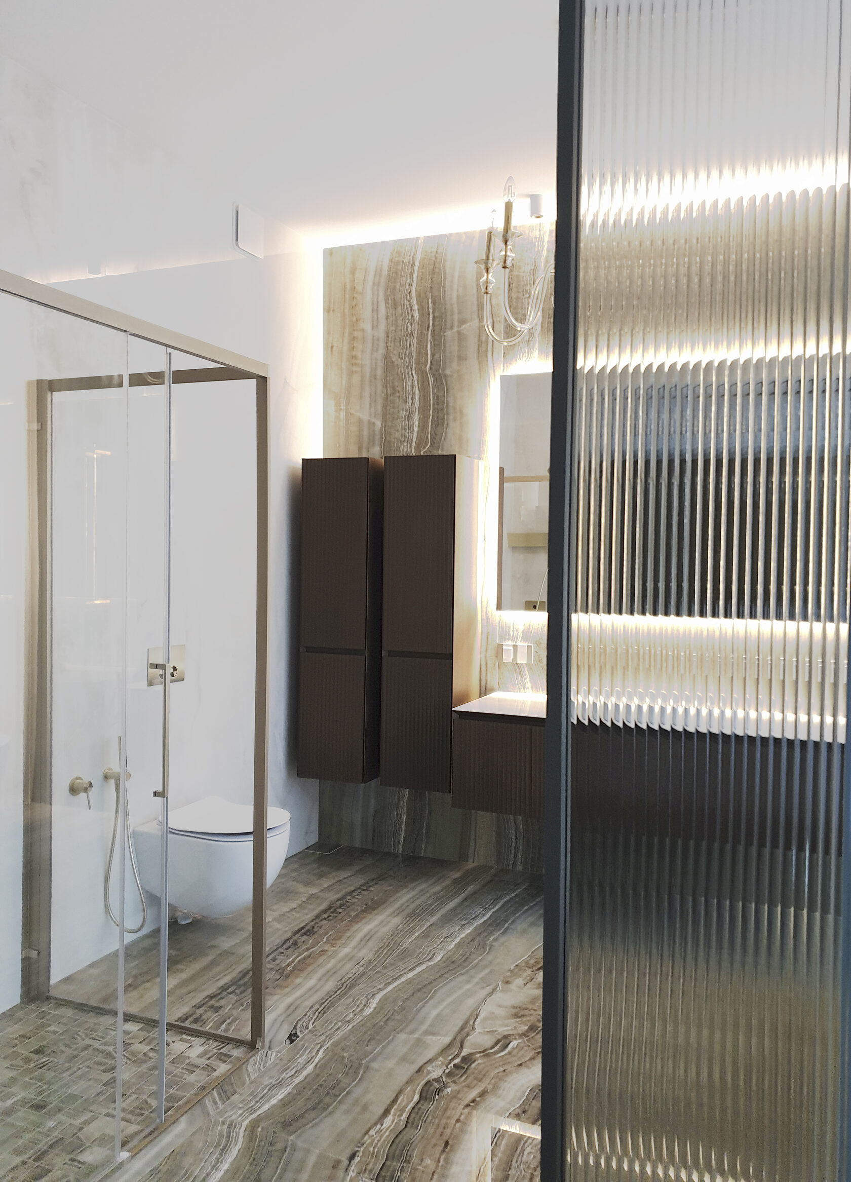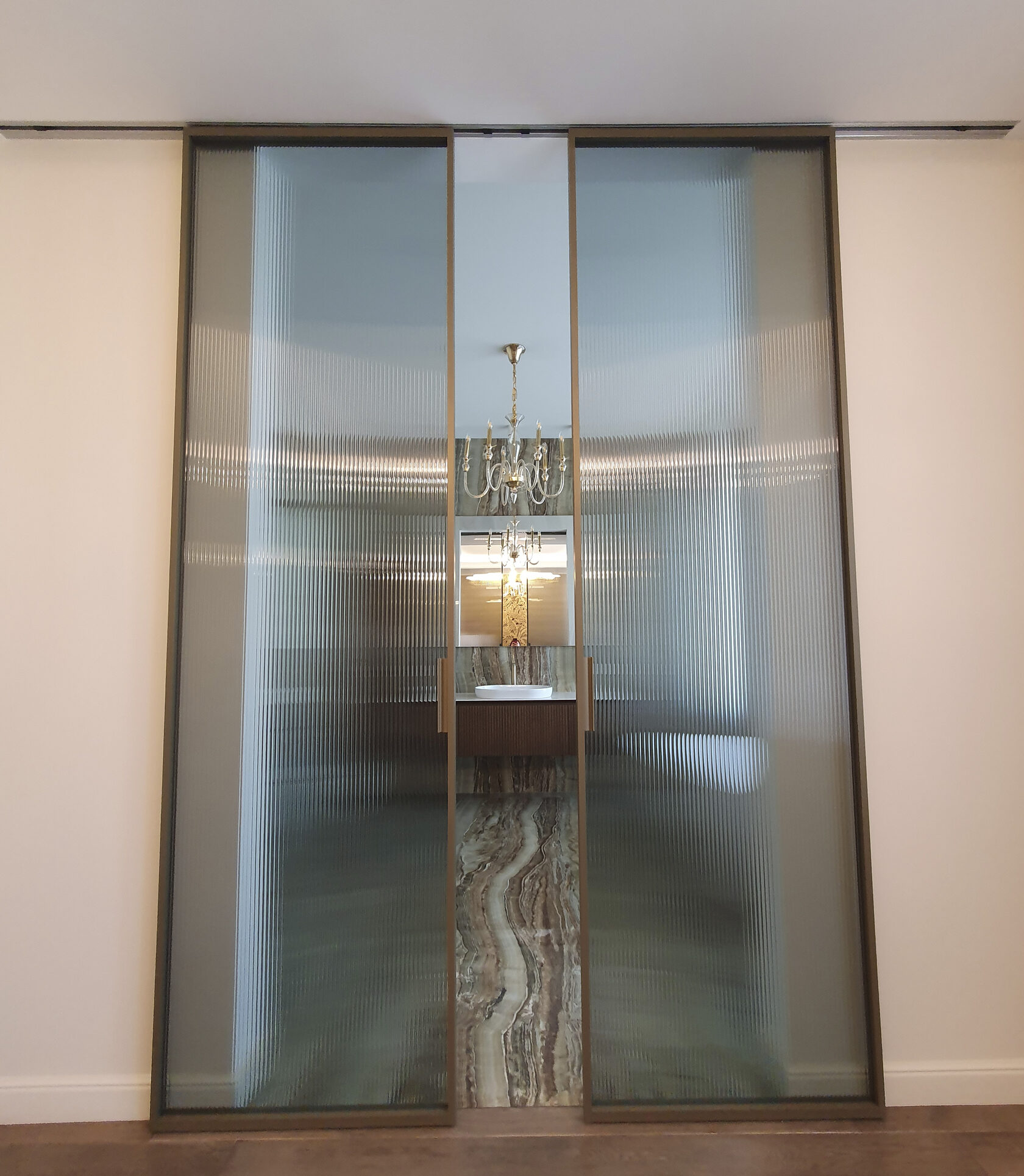 Концепция: В основе концепции лежит стремление к созданию максимально функционального и визуально расширенного пространства. Раздвижные двери из рифленого стекла от пола до потолка выбраны как идеальное решение для избежания визуального загромождения и сохранения беспрепятственного светового потока между комнатами. Они обеспечивают четкое физическое и визуальное разделение «влажной» и «сухой» зон, при этом поддерживая ощущение единого объема. Рифленое стекло, пропускающее до 80% света, создает мягкое, рассеянное освещение, придает интерьеру глубину и текстуру, а также гарантирует деликатную приватность. Подвесная беспороговая система монтажа подчеркивает чистоту линий и безопасность. Дополнительные акценты, такие как strategically расположенное зеркало, закарнизная подсветка и изящные металлические ручки, усиливают общую эстетику и функциональность.