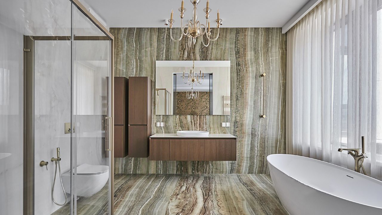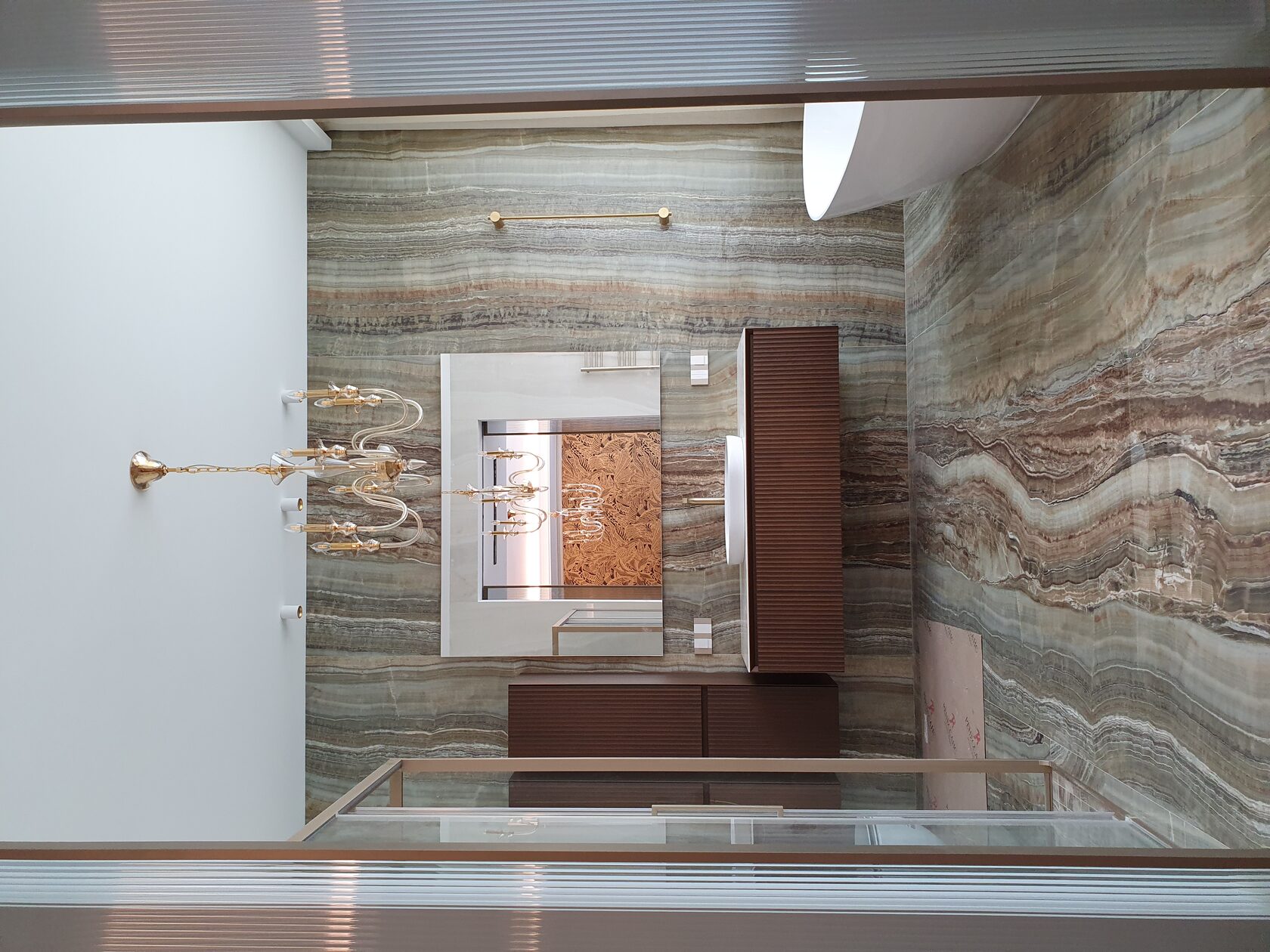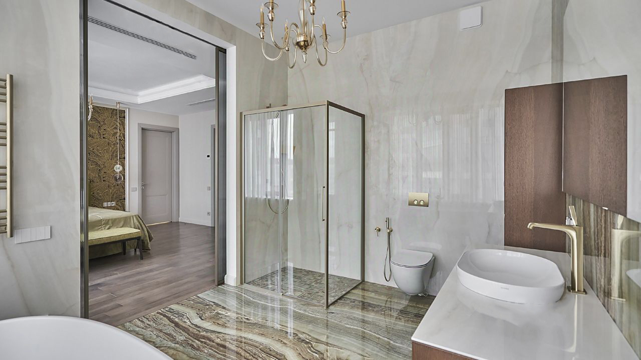 Концепция: В основе концепции лежит стремление к созданию максимально функционального и визуально расширенного пространства. Раздвижные двери из рифленого стекла от пола до потолка выбраны как идеальное решение для избежания визуального загромождения и сохранения беспрепятственного светового потока между комнатами. Они обеспечивают четкое физическое и визуальное разделение «влажной» и «сухой» зон, при этом поддерживая ощущение единого объема. Рифленое стекло, пропускающее до 80% света, создает мягкое, рассеянное освещение, придает интерьеру глубину и текстуру, а также гарантирует деликатную приватность. Подвесная беспороговая система монтажа подчеркивает чистоту линий и безопасность. Дополнительные акценты, такие как strategically расположенное зеркало, закарнизная подсветка и изящные металлические ручки, усиливают общую эстетику и функциональность.