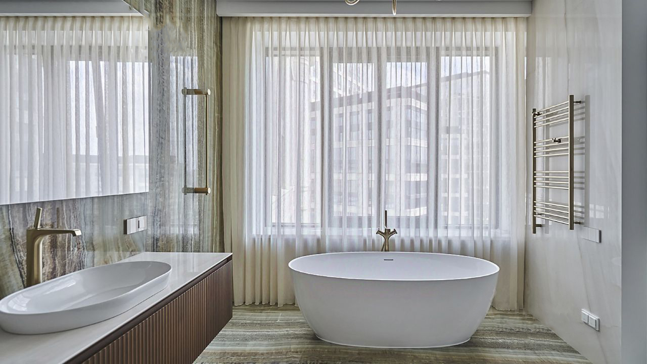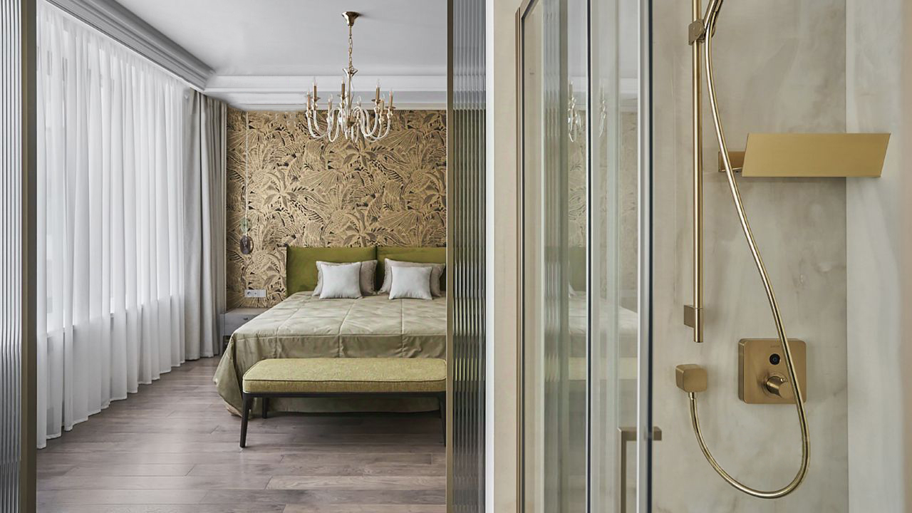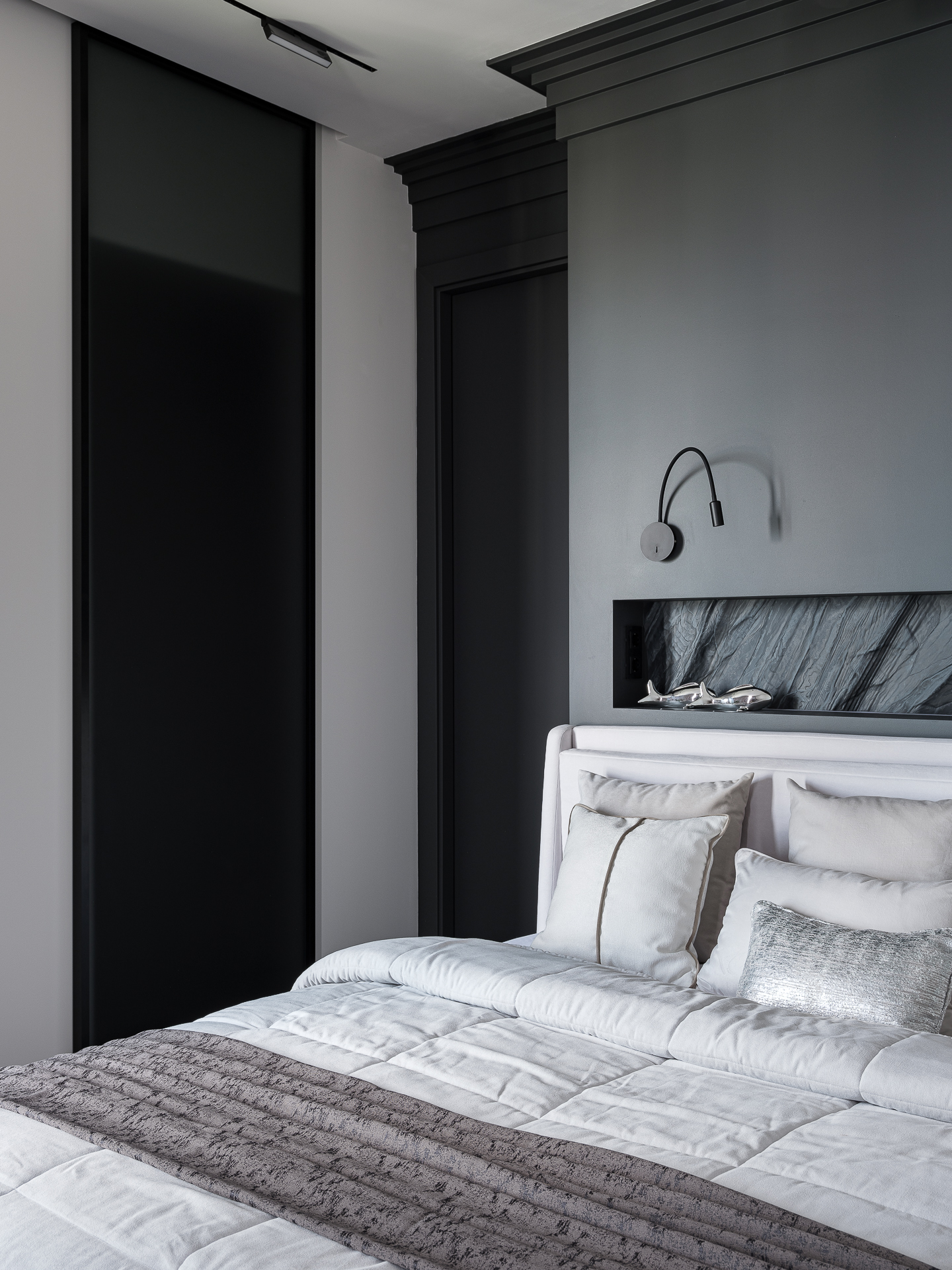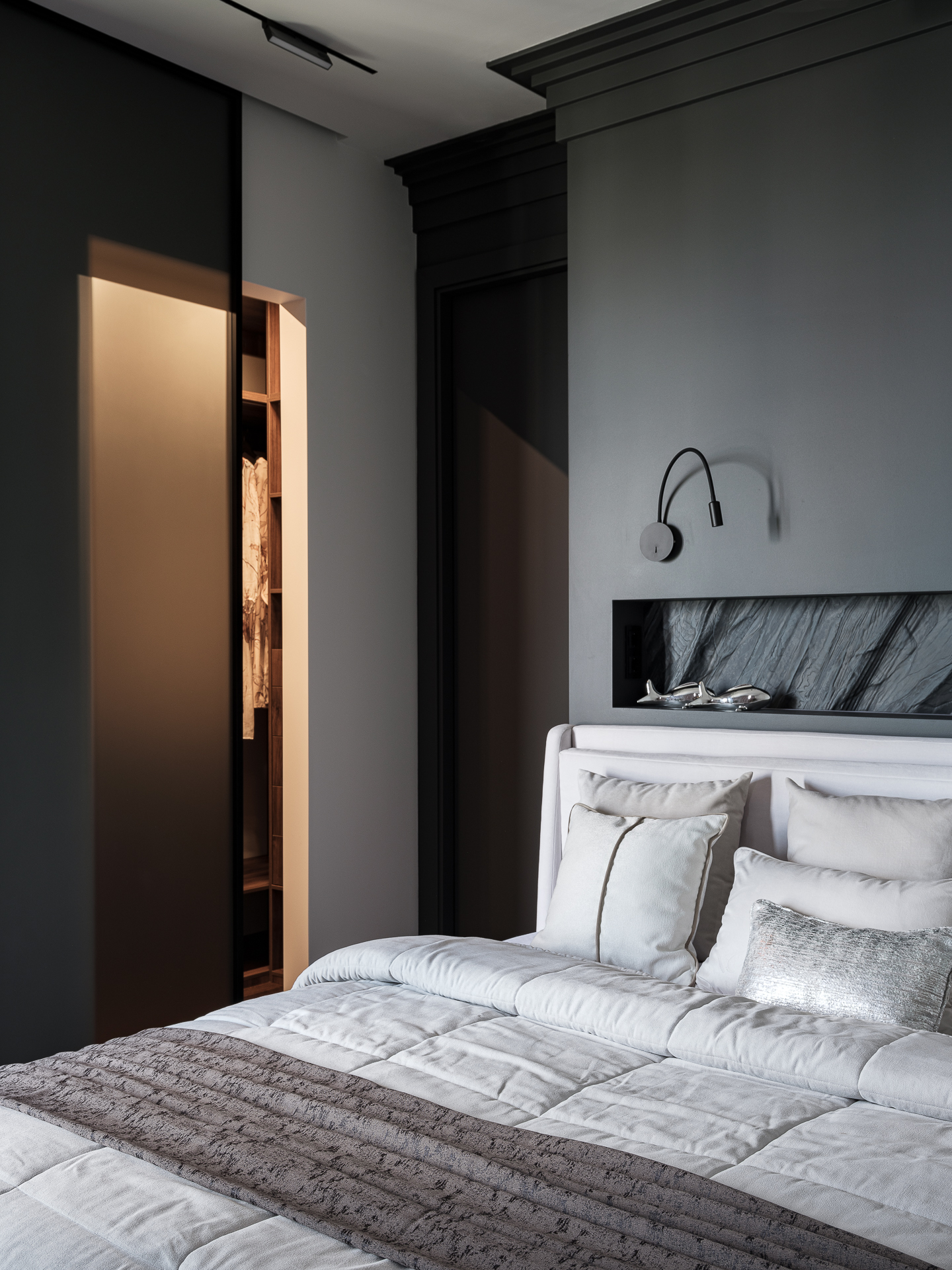 Концепция: Основой концепции является максимальная оптимизация пространства через внедрение гибких и эстетичных решений. Было разработано уникальное сдвижное матовое полотно, которое позволяет функционально зонировать пространство. Это полотно может закрывать либо ванную комнату, либо гардероб, а также располагаться между проемами, обеспечивая одновременный беспрепятственный доступ к обоим помещениям. Такой подход исключает визуальный шум и рационально использует каждый сантиметр.