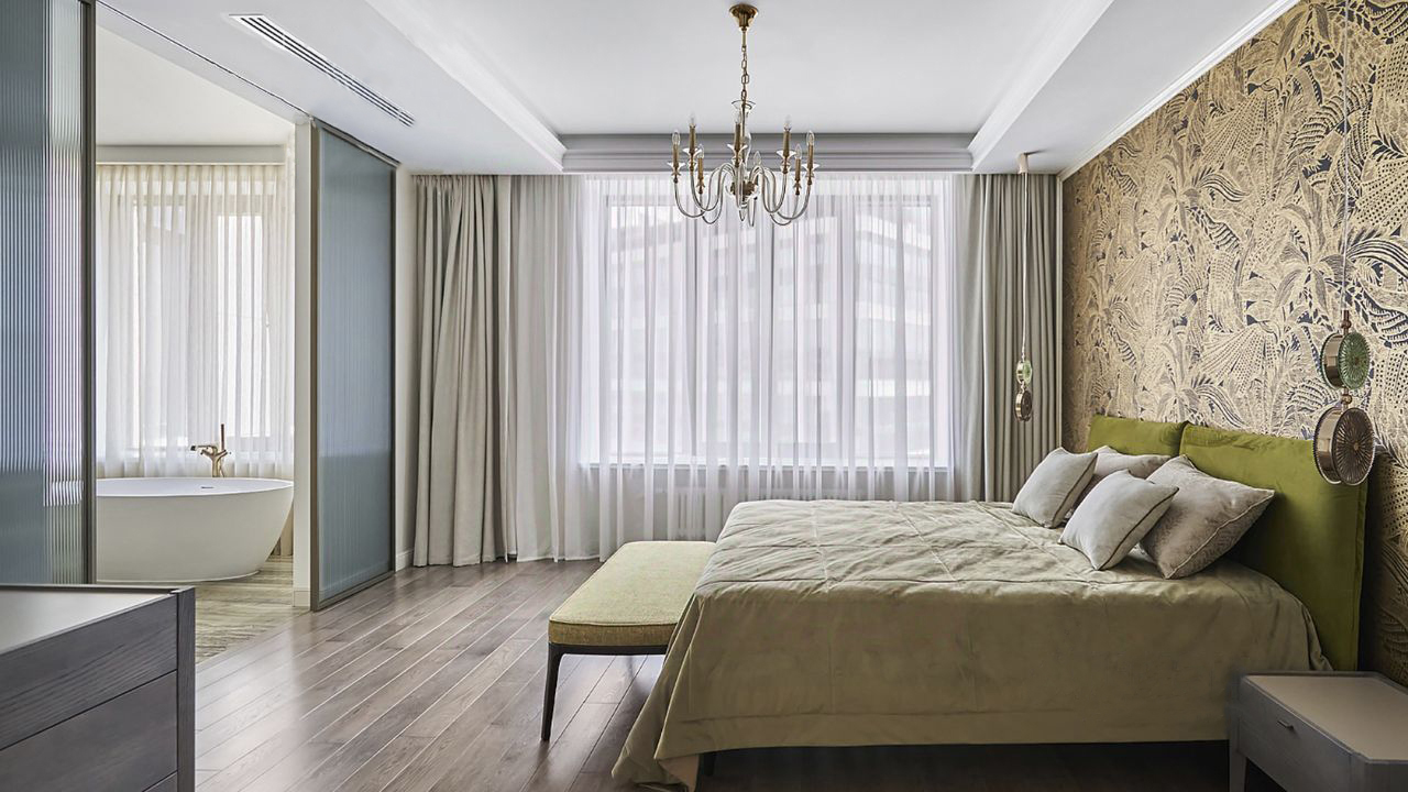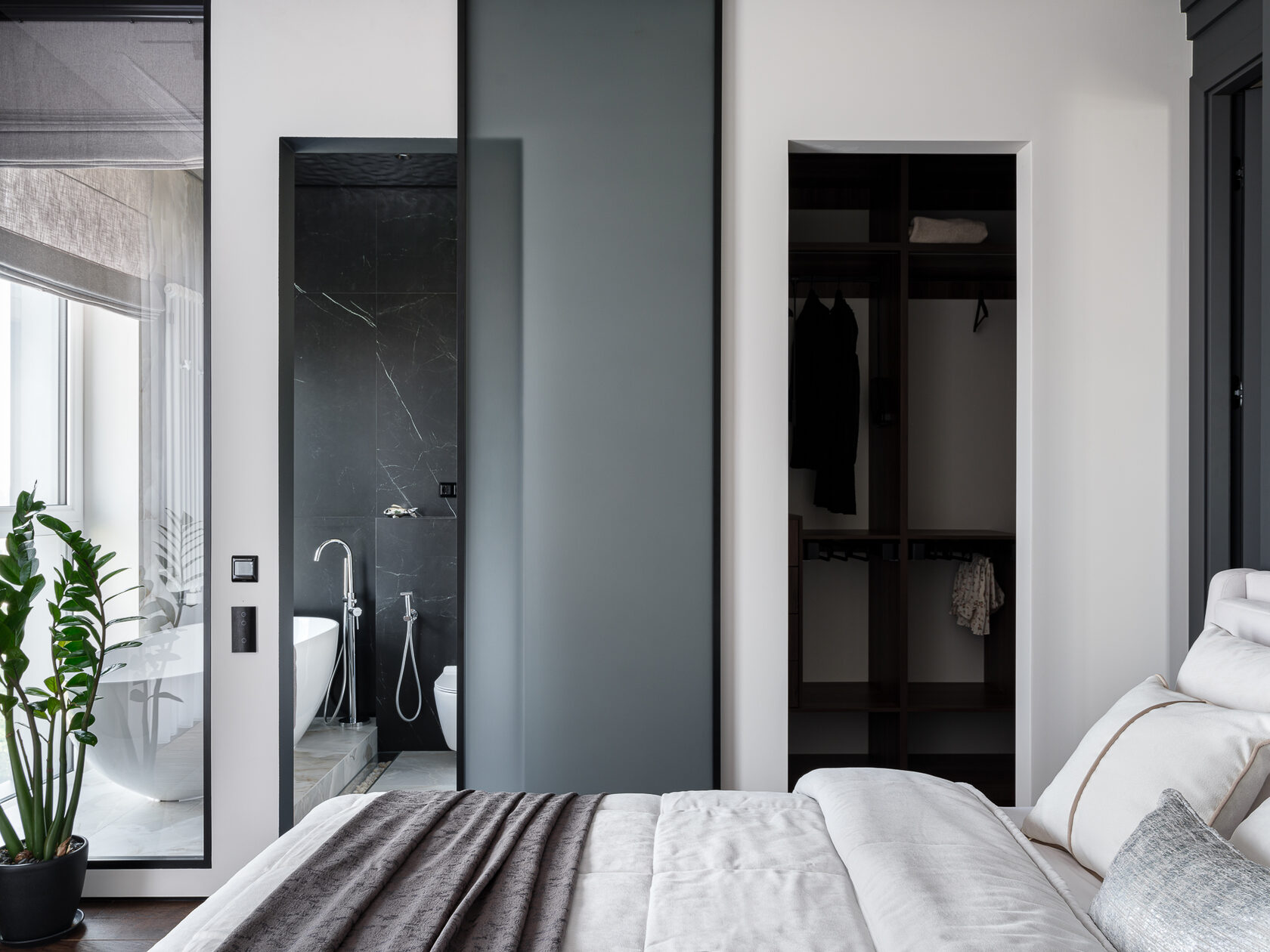В данном проекте было реализовано продуманное решение для организации доступа к ванной комнате с окном и гардеробной непосредственно из спальни. Ключевой задачей было избежать создания 'галереи дверных полотен' и превращения гардеробной в проходную зону в условиях ограниченной площади.