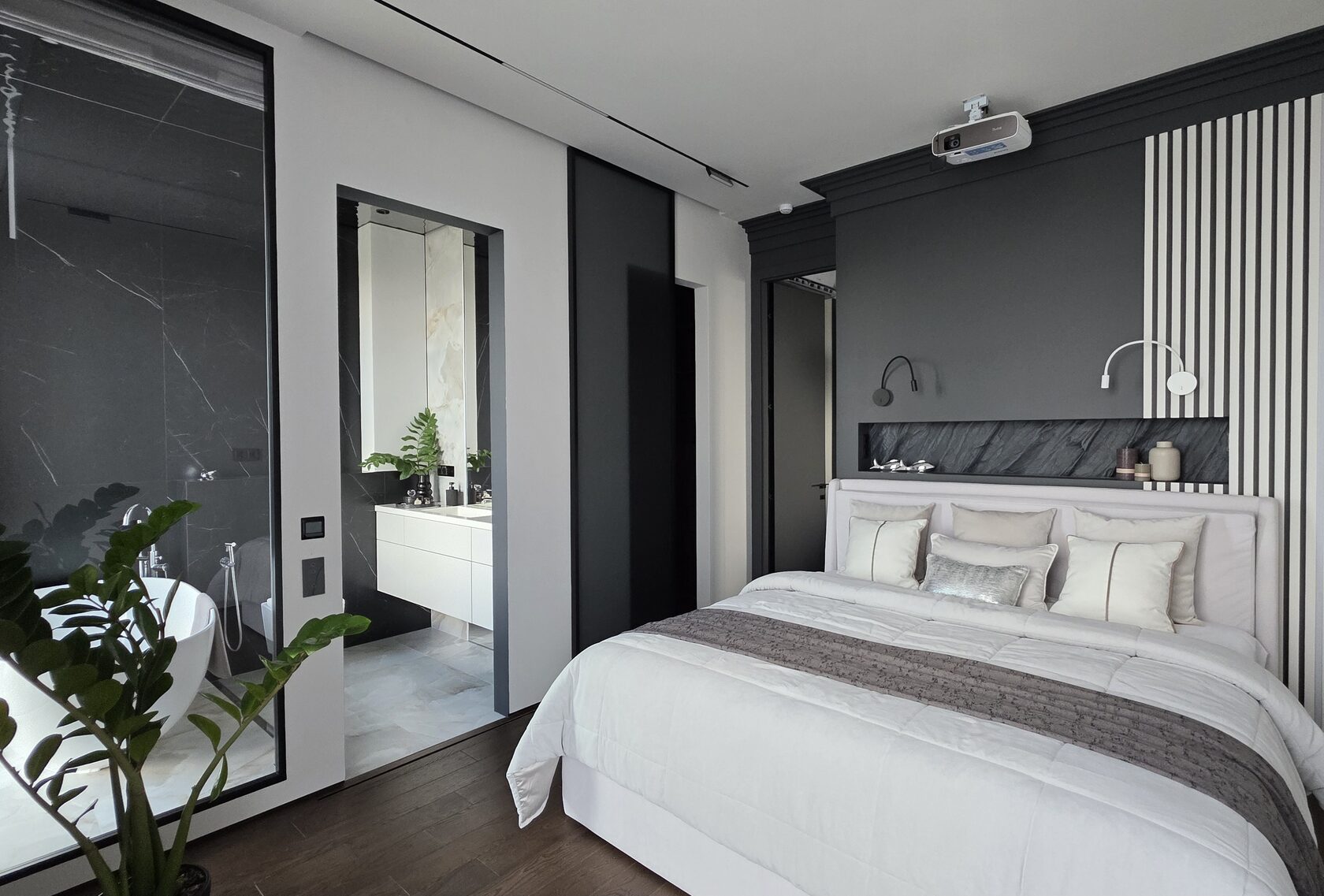 Итог: Результатом стало элегантное и высокофункциональное решение, которое эффективно решает проблему зонирования в компактной спальной зоне. Оно обеспечивает необходимую приватность, сохраняет целостность интерьера, минимизирует количество дверей и предлагает беспрецедентную гибкость в использовании пространства, воплощая принципы современного и продуманного дизайна.