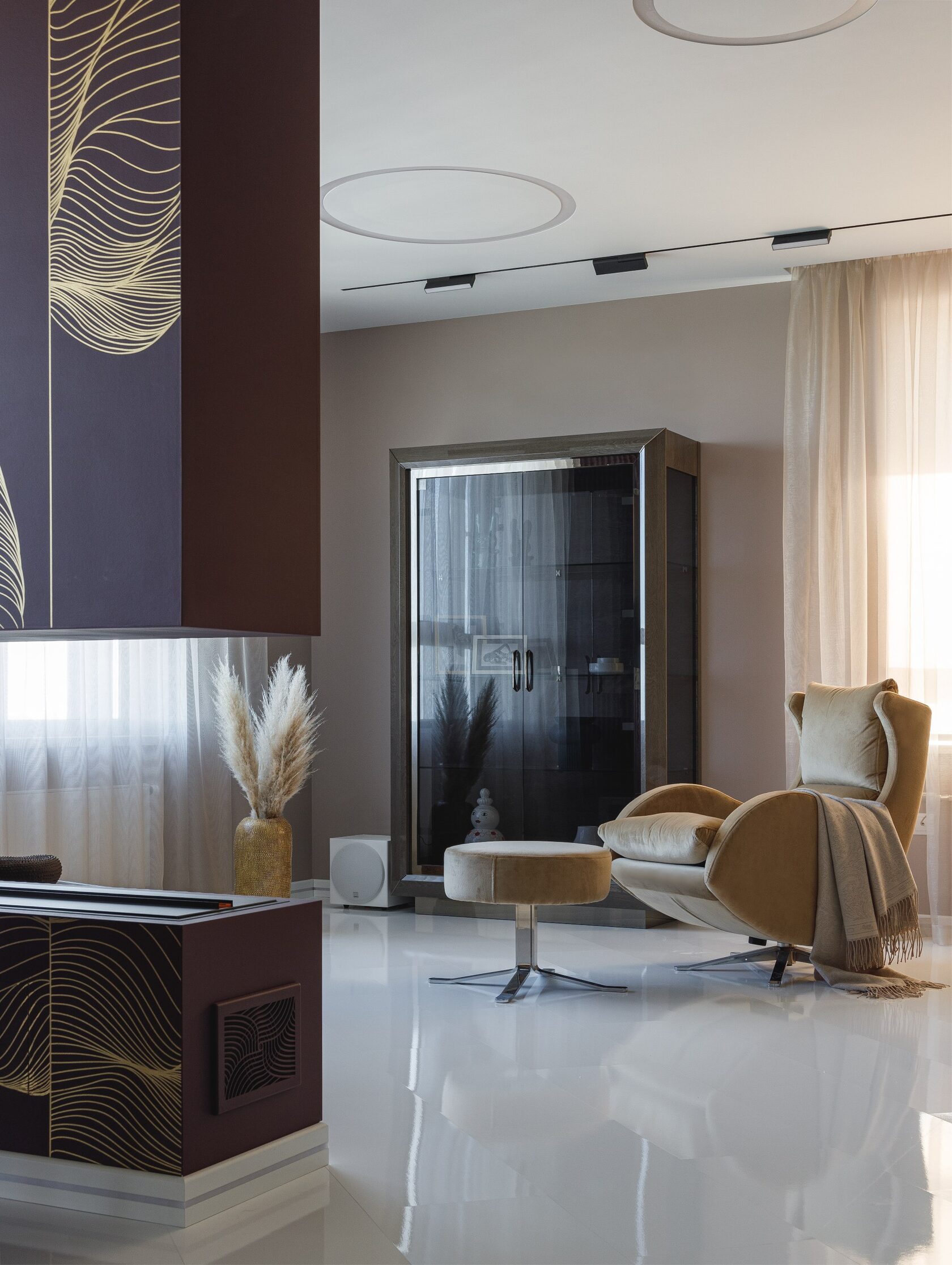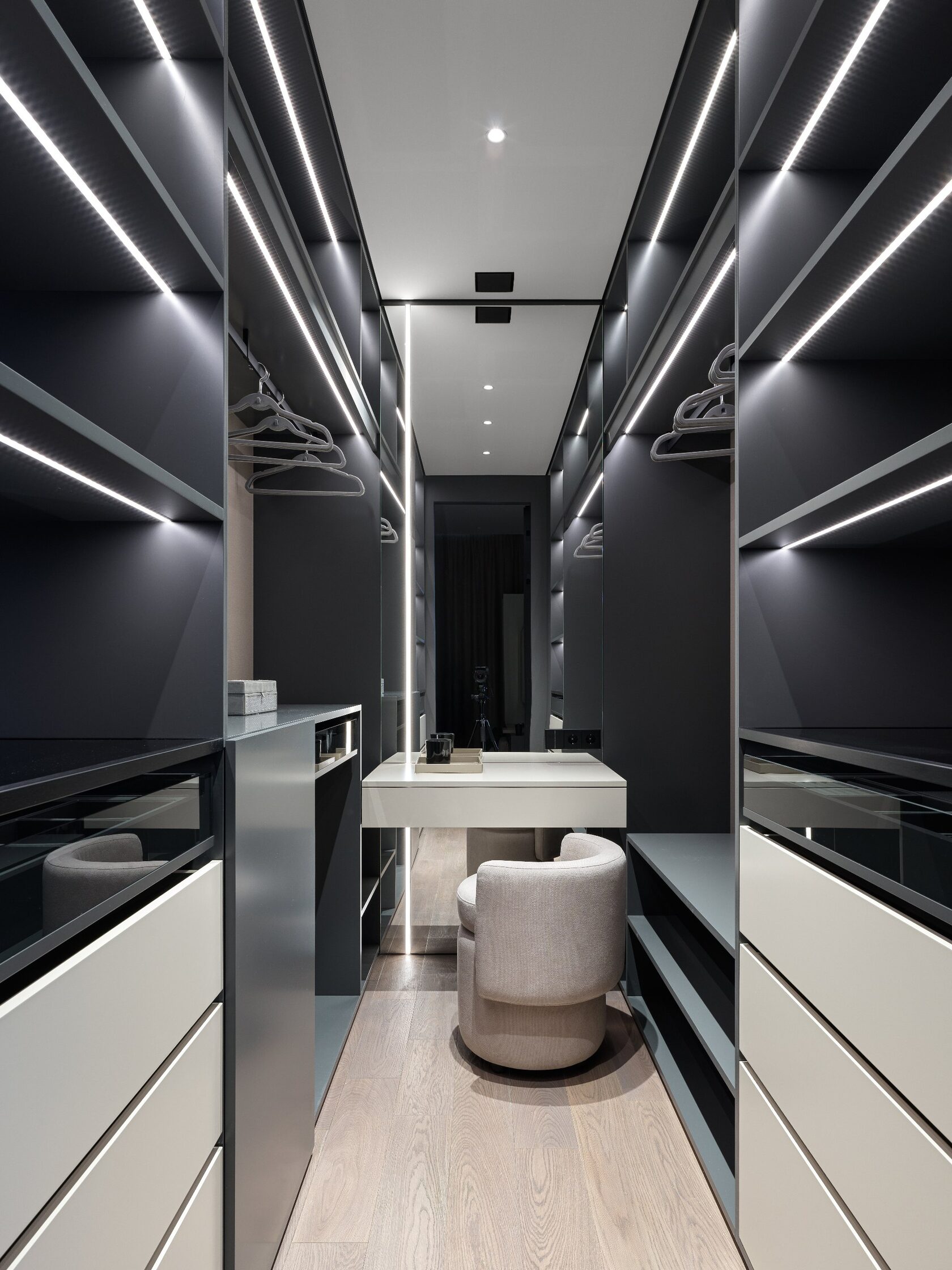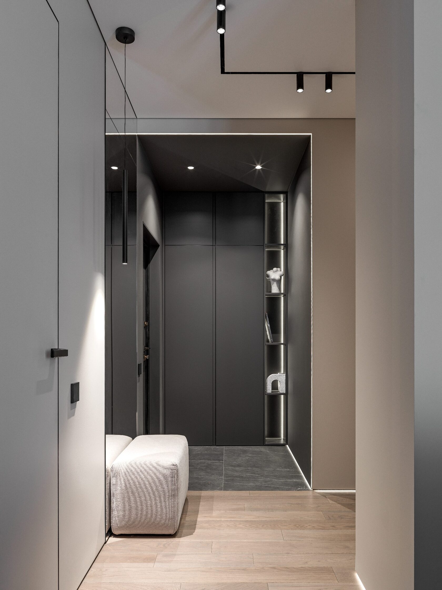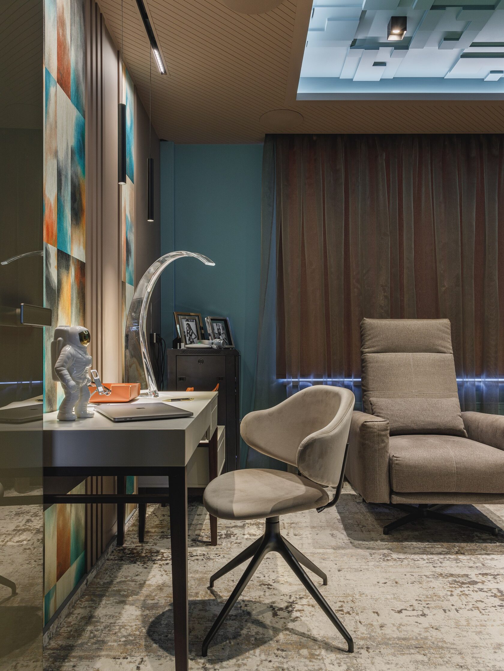 Атмосфера: Интерьер создаёт ощущение интеллектуального уединения. Это пространство — будто персональная станция в открытом космосе, где каждый элемент говорит о внимании к будущему. Здесь хочется думать, чувствовать, отдыхать и вдохновляться. Эмоциональный эффект усиливают многослойные световые сценарии и кинематографичное зонирование. Получилась квартира с характером, которая приглашает в мир новых ощущений.