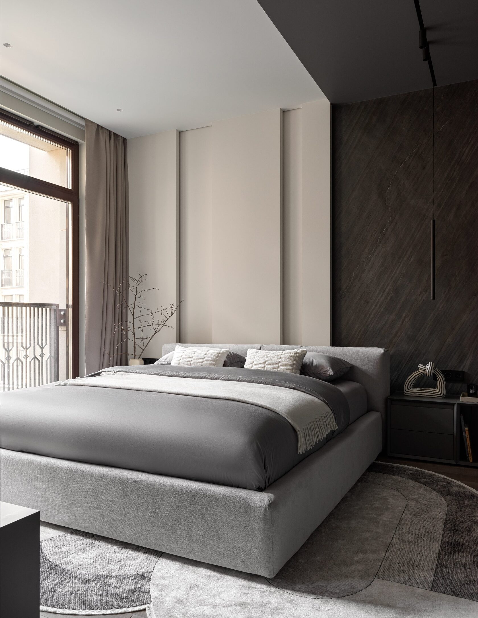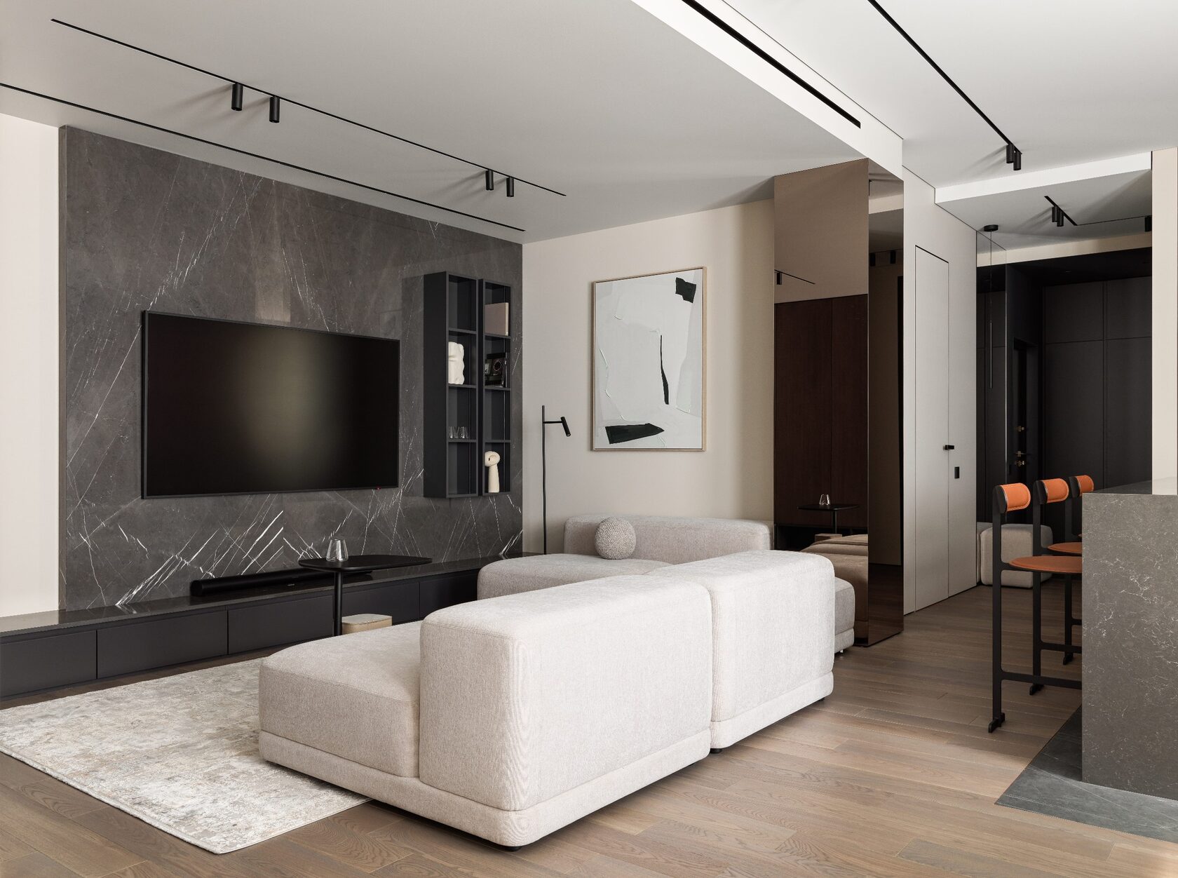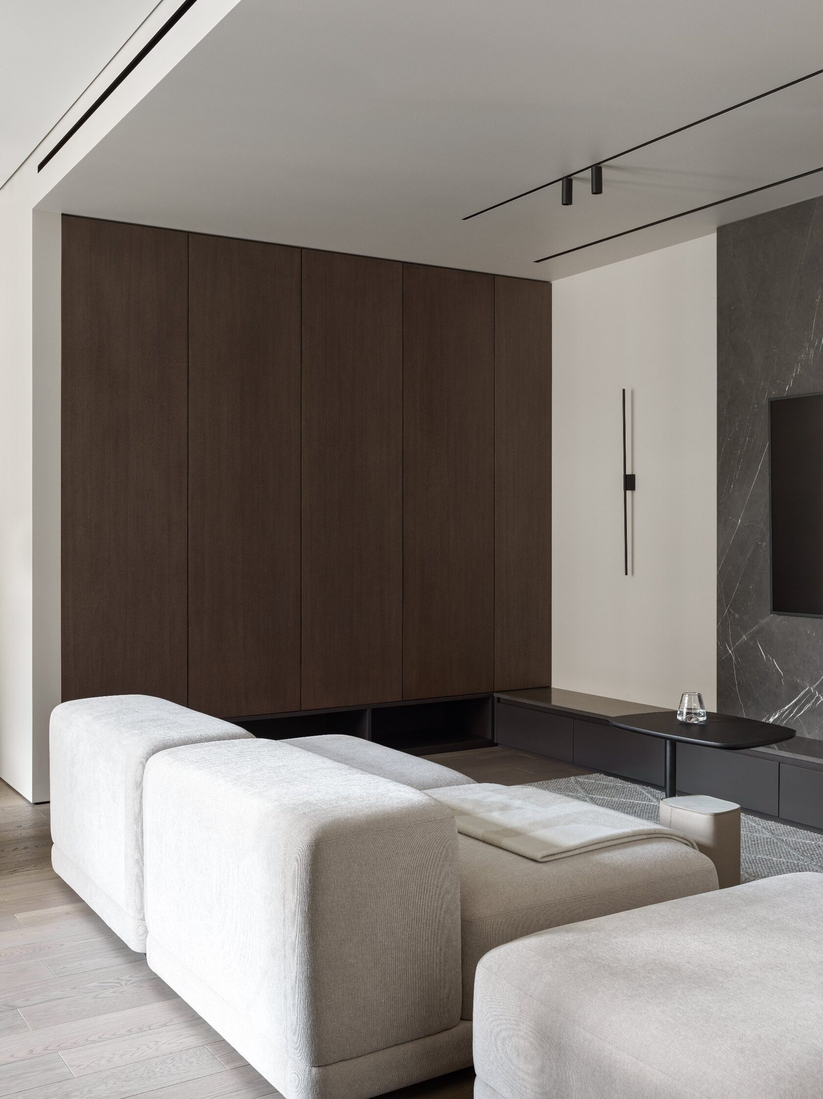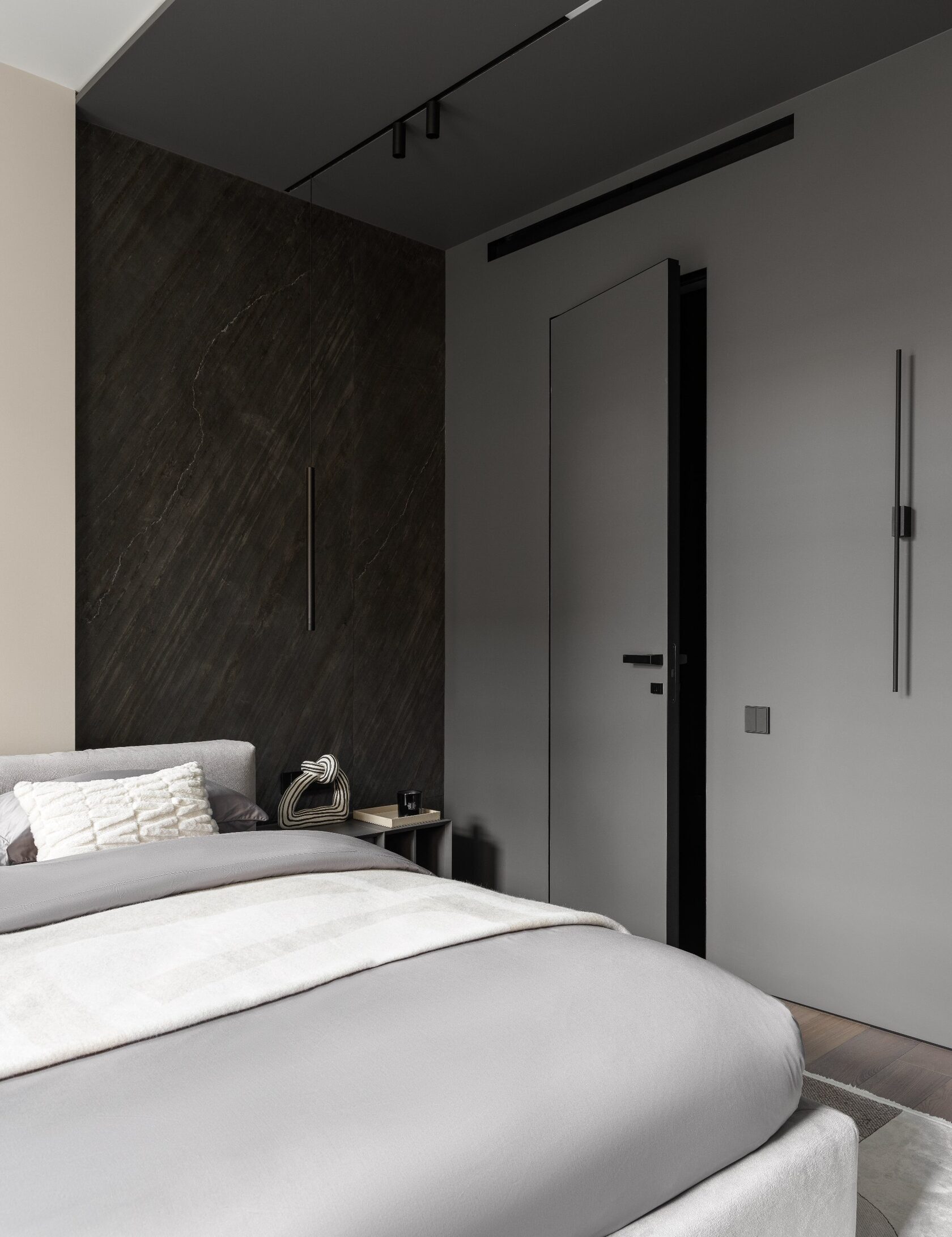 Дизайн выполнен в тёмной палитре с элементами минимализма, но при этом далёк от стереотипа «квартиры холостяка». Он тёплый, уютный, семейный — с богатой фактурностью, мягким светом и продуманными акцентами. Натуральный камень, шпон дуба, тёплый текстиль, авторские тумбы и мягкие контрасты создают эффект глубокого, обволакивающего интерьера.