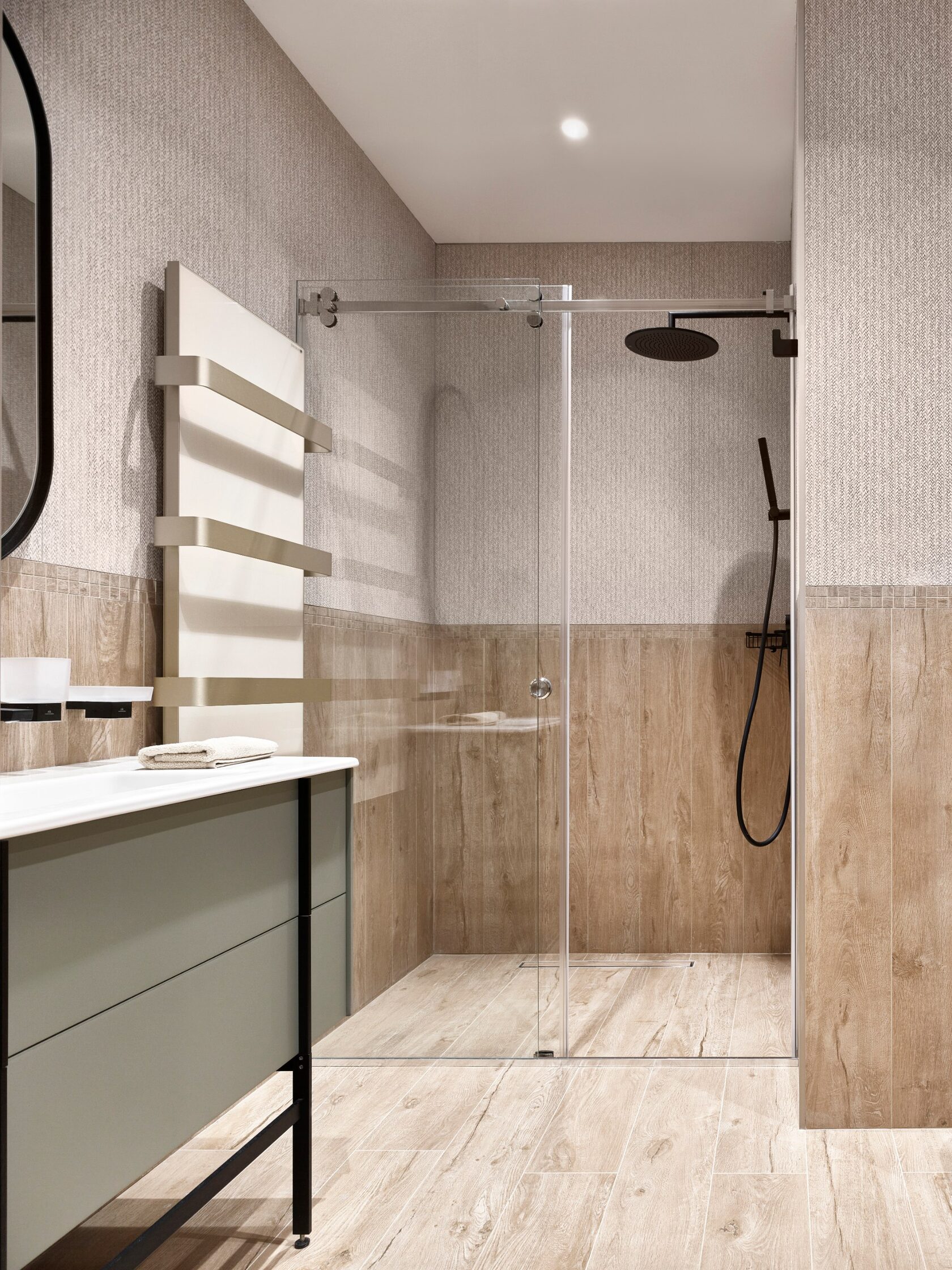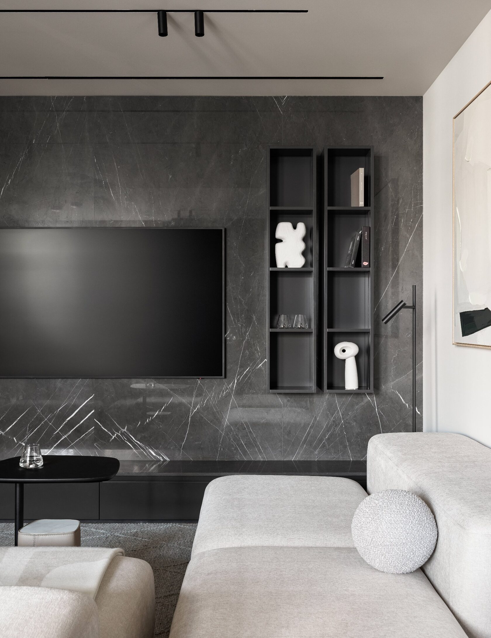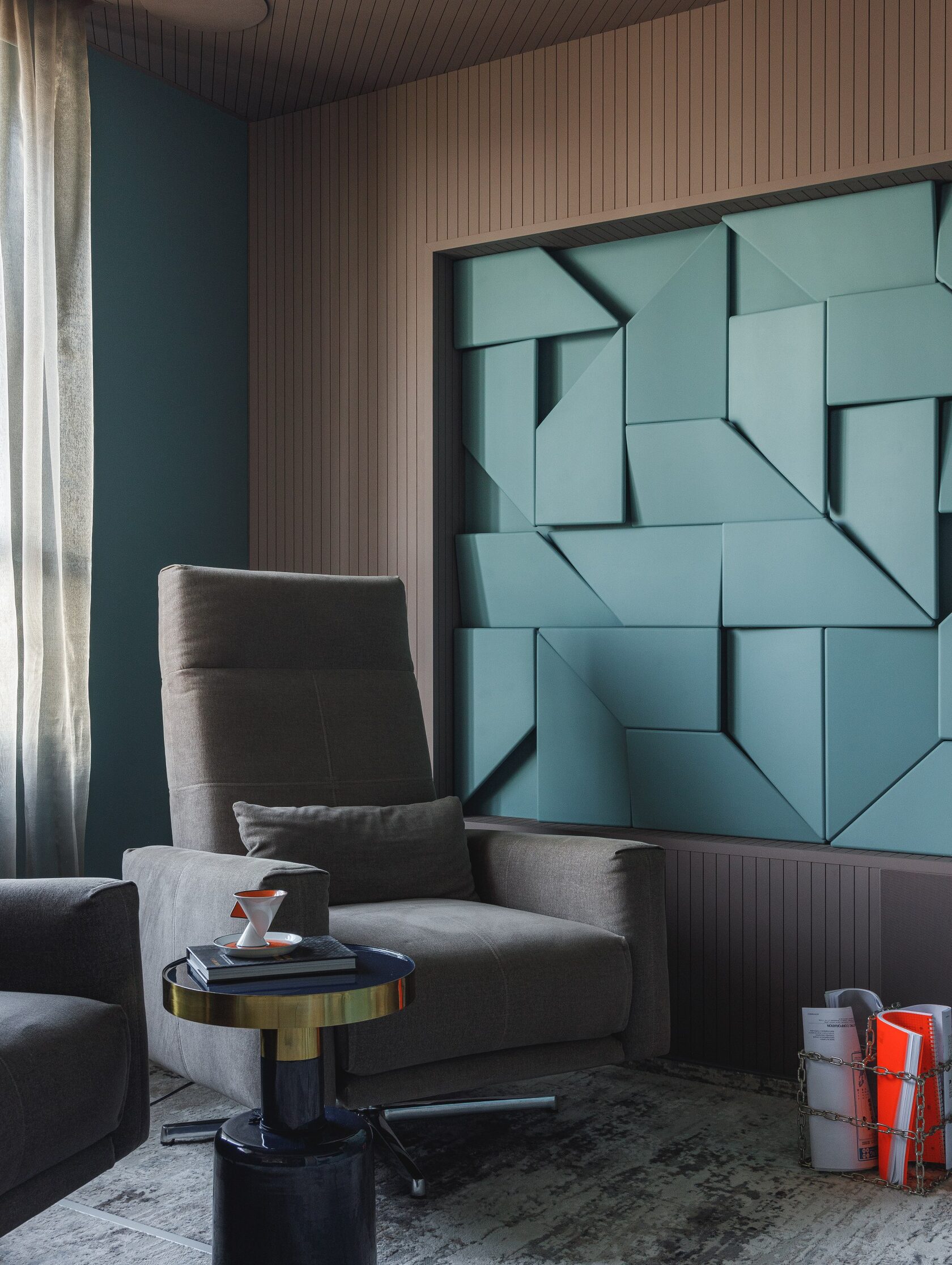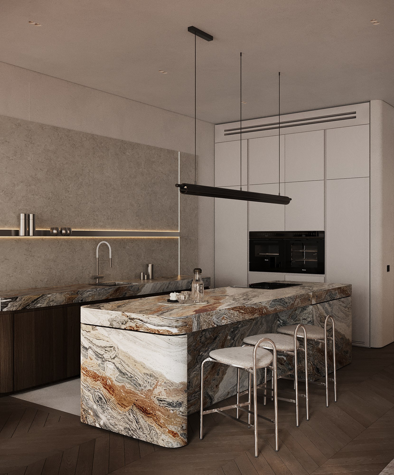 Дизайн выполнен в тёмной палитре с элементами минимализма, но при этом далёк от стереотипа «квартиры холостяка». Он тёплый, уютный, семейный — с богатой фактурностью, мягким светом и продуманными акцентами. Натуральный камень, шпон дуба, тёплый текстиль, авторские тумбы и мягкие контрасты создают эффект глубокого, обволакивающего интерьера.