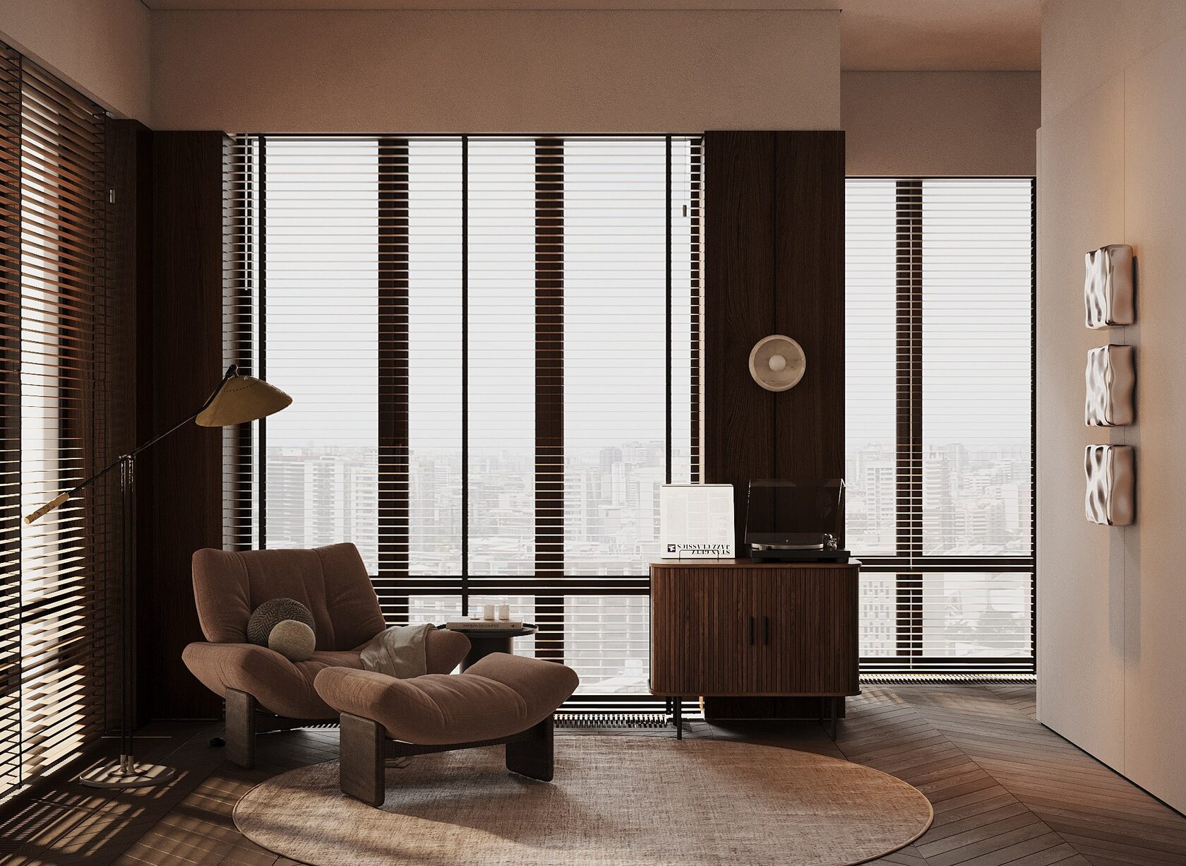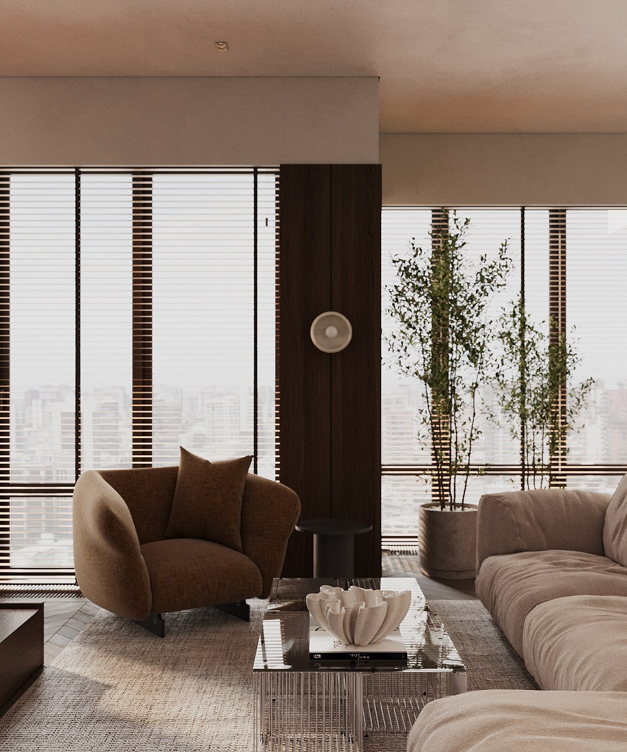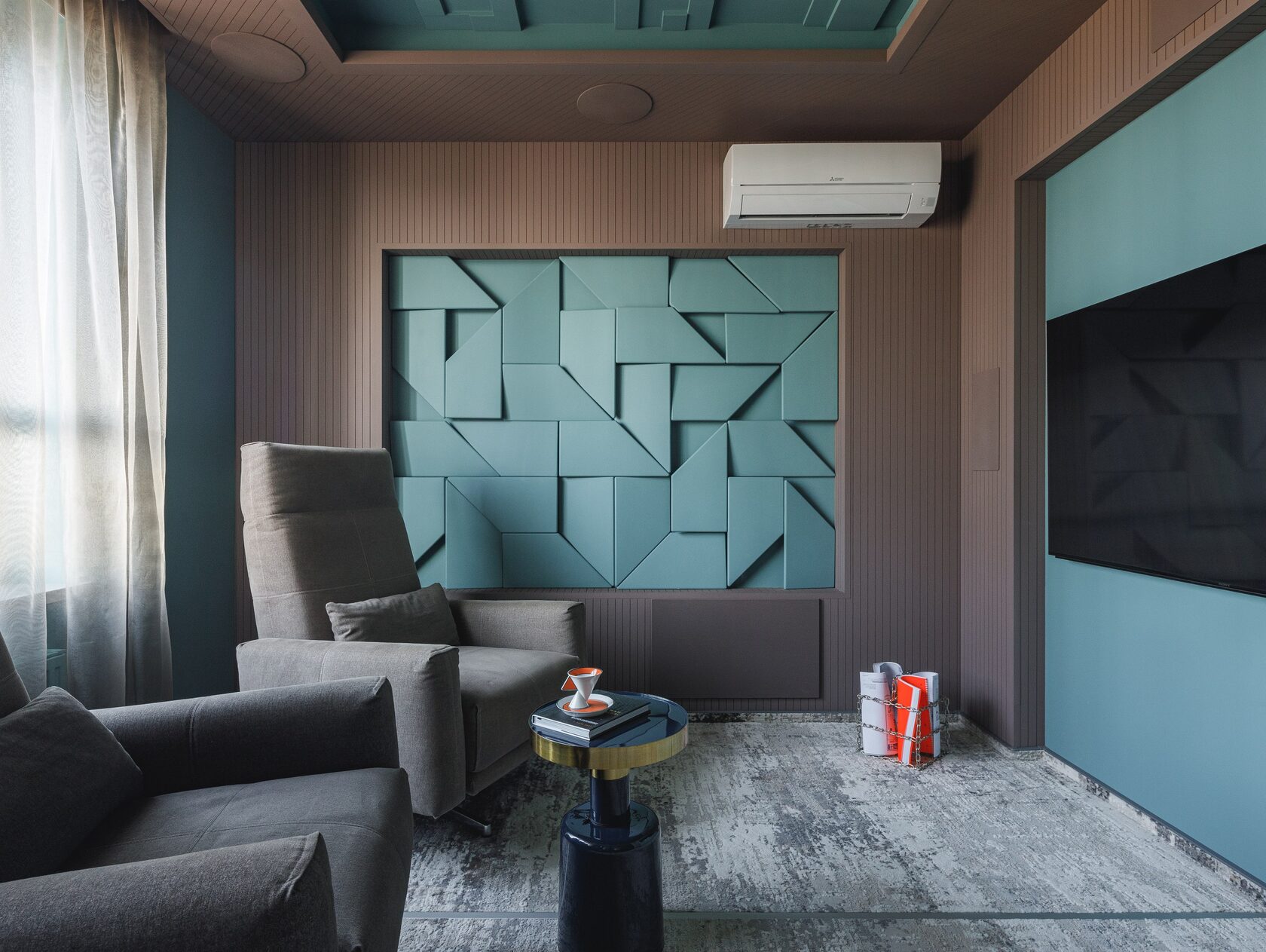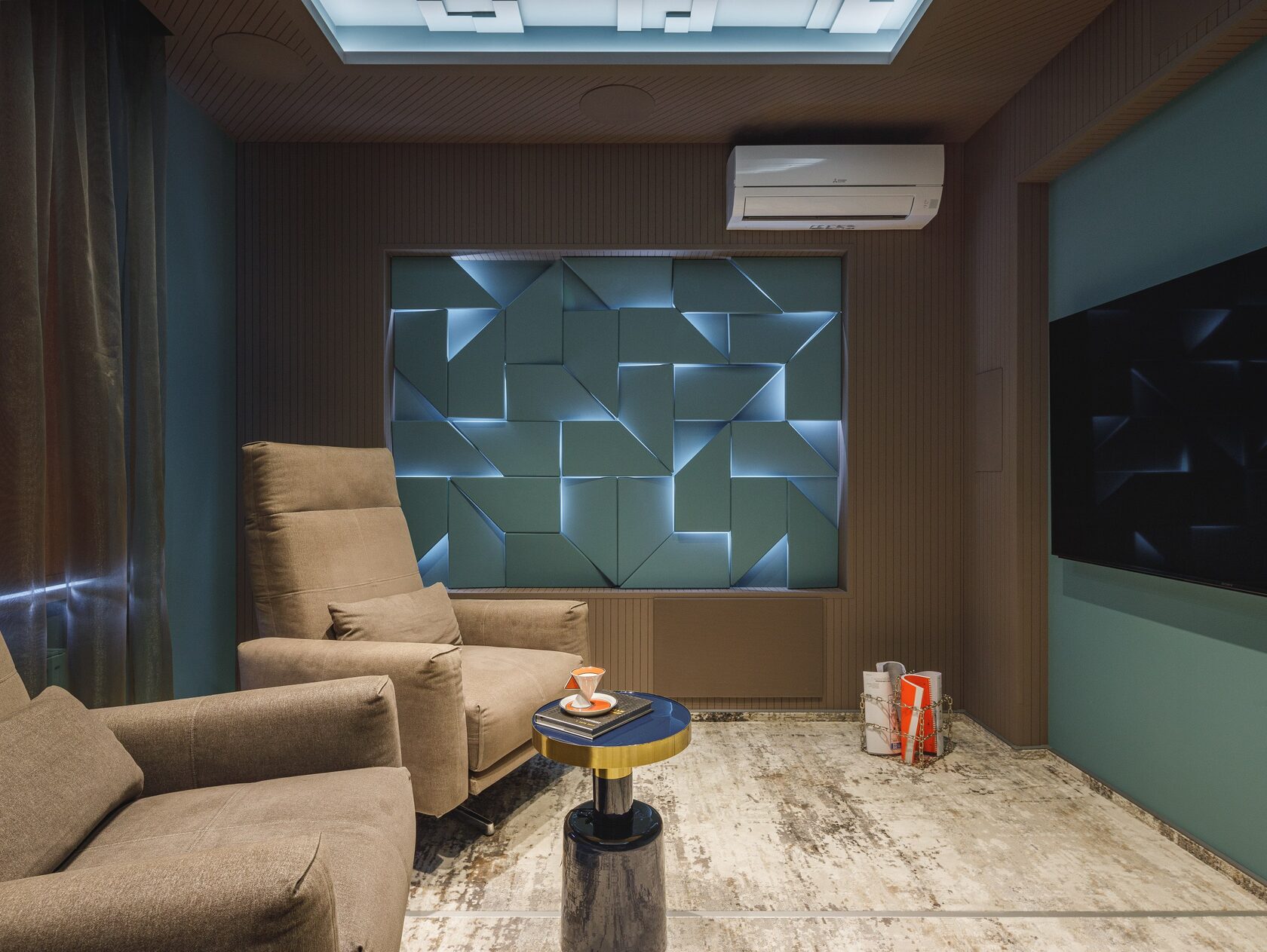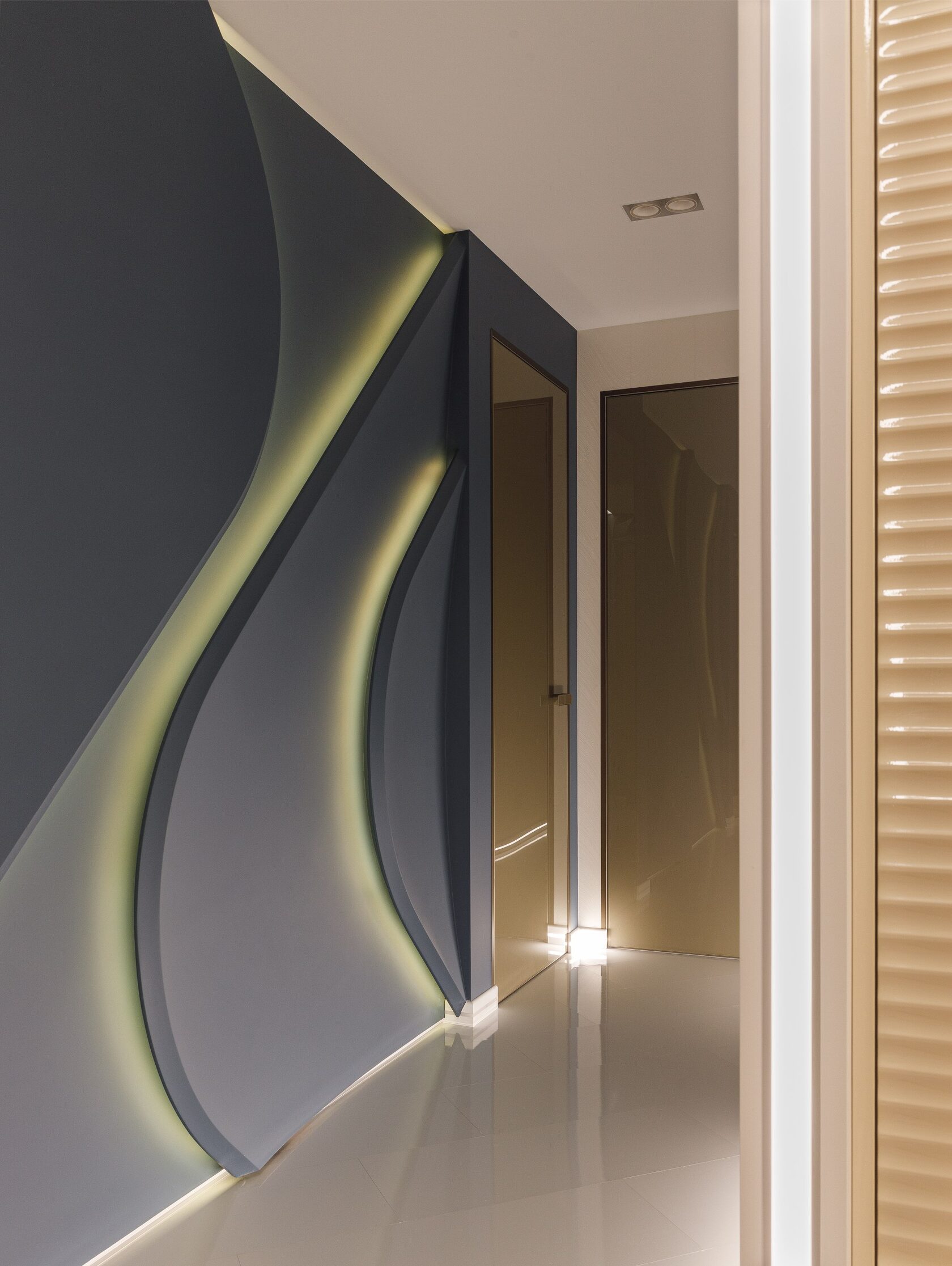 Идея и концепция: Основная идея интерьера — создать дом будущего, в котором технология сочетается с атмосферой уюта. Каждый блок пространства задумывался как самостоятельный визуальный мир: со своим светом, формой и настроением. Вдохновением послужили кадры из научной фантастики: мягкие линии, глубокие оттенки, управляемое освещение и обволакивающая пластика поверхностей. Пространство — как сцена для жизни, где можно переживать разные сценарии.