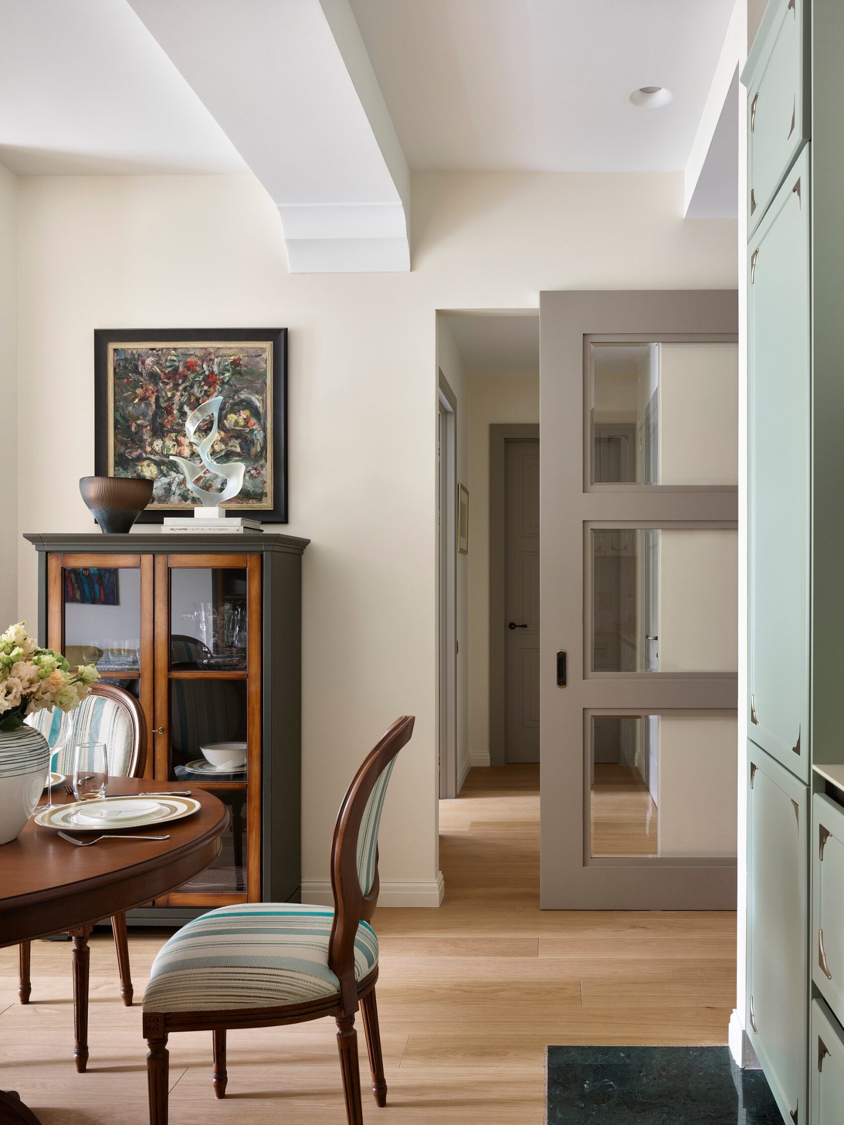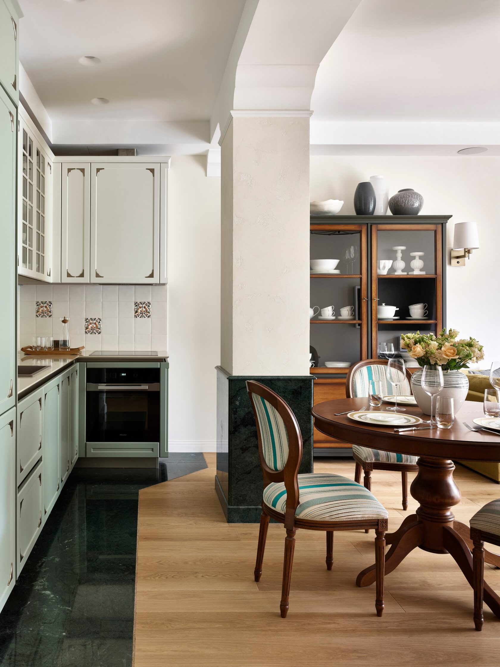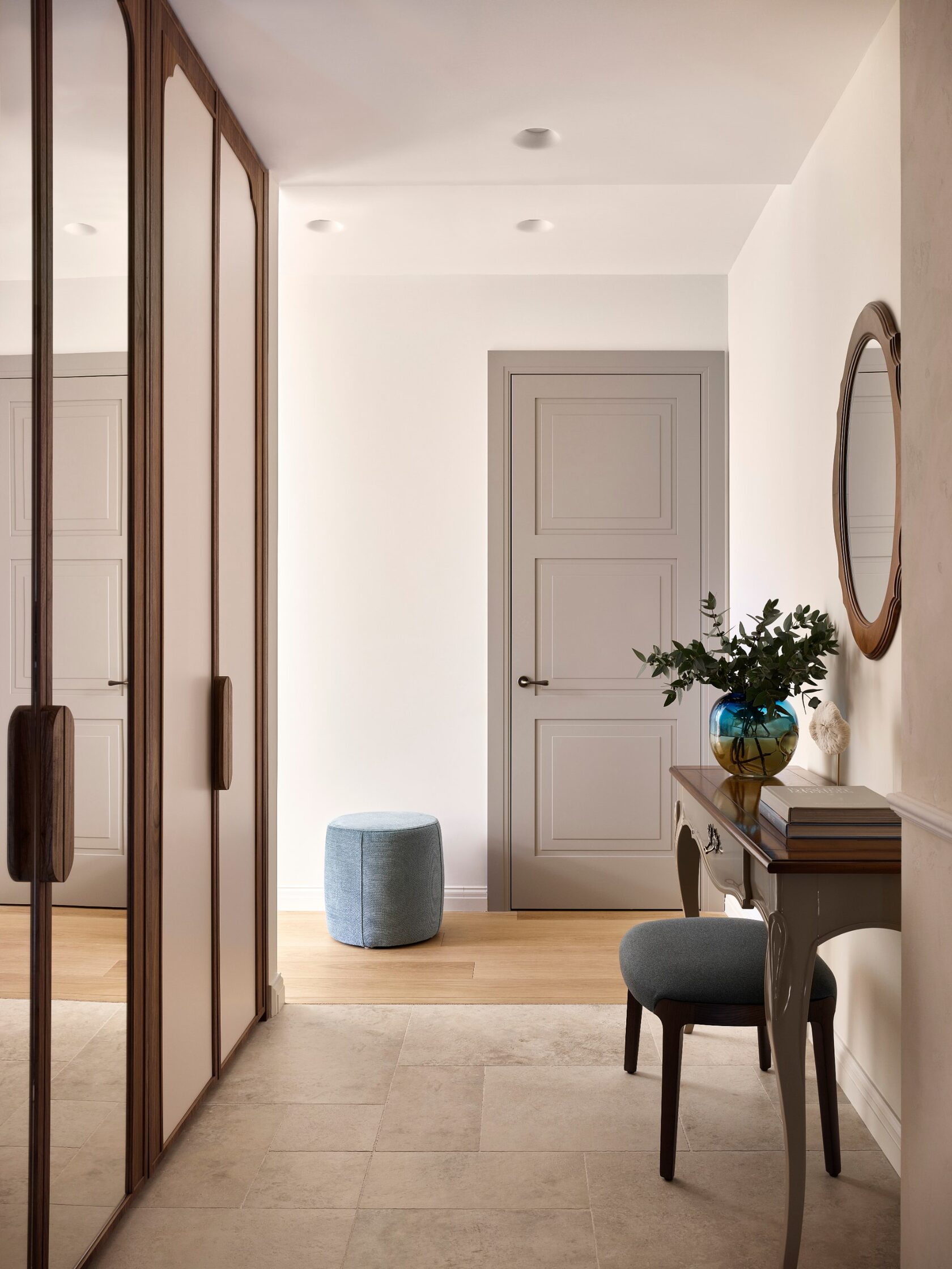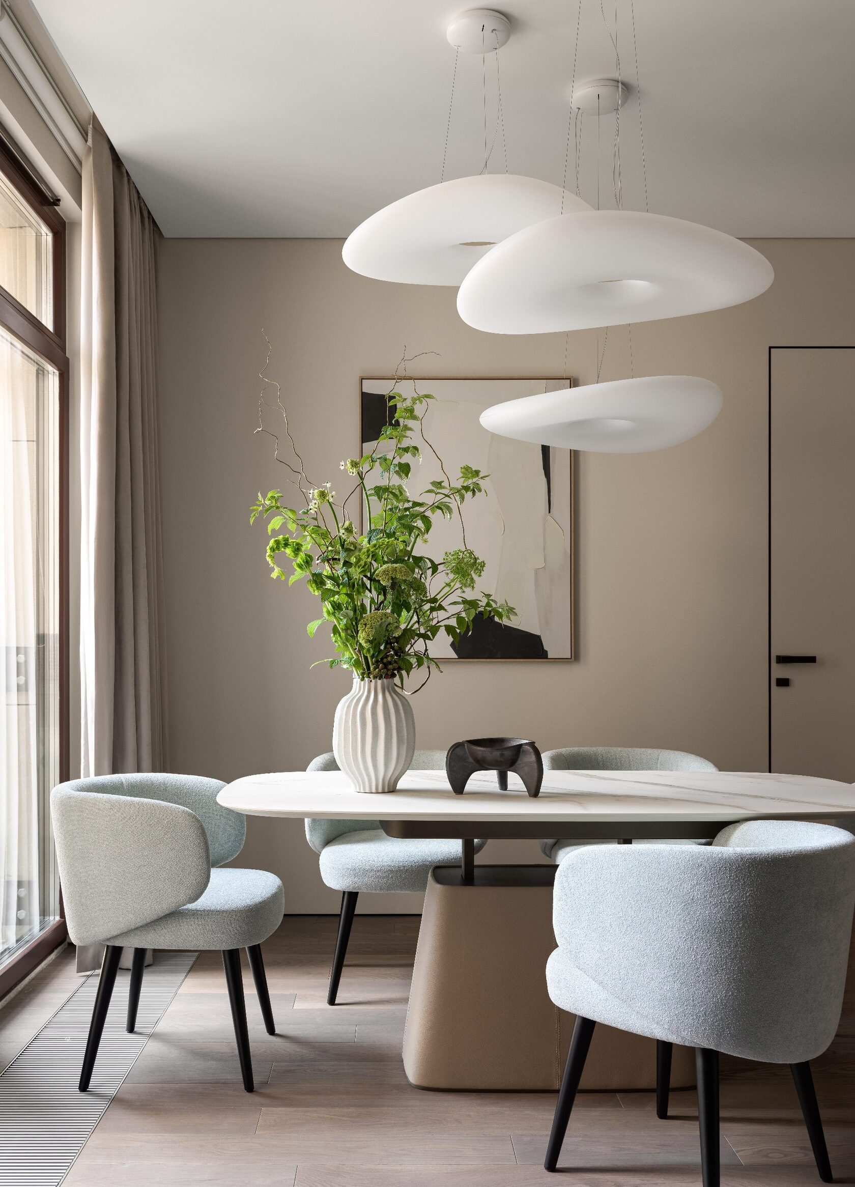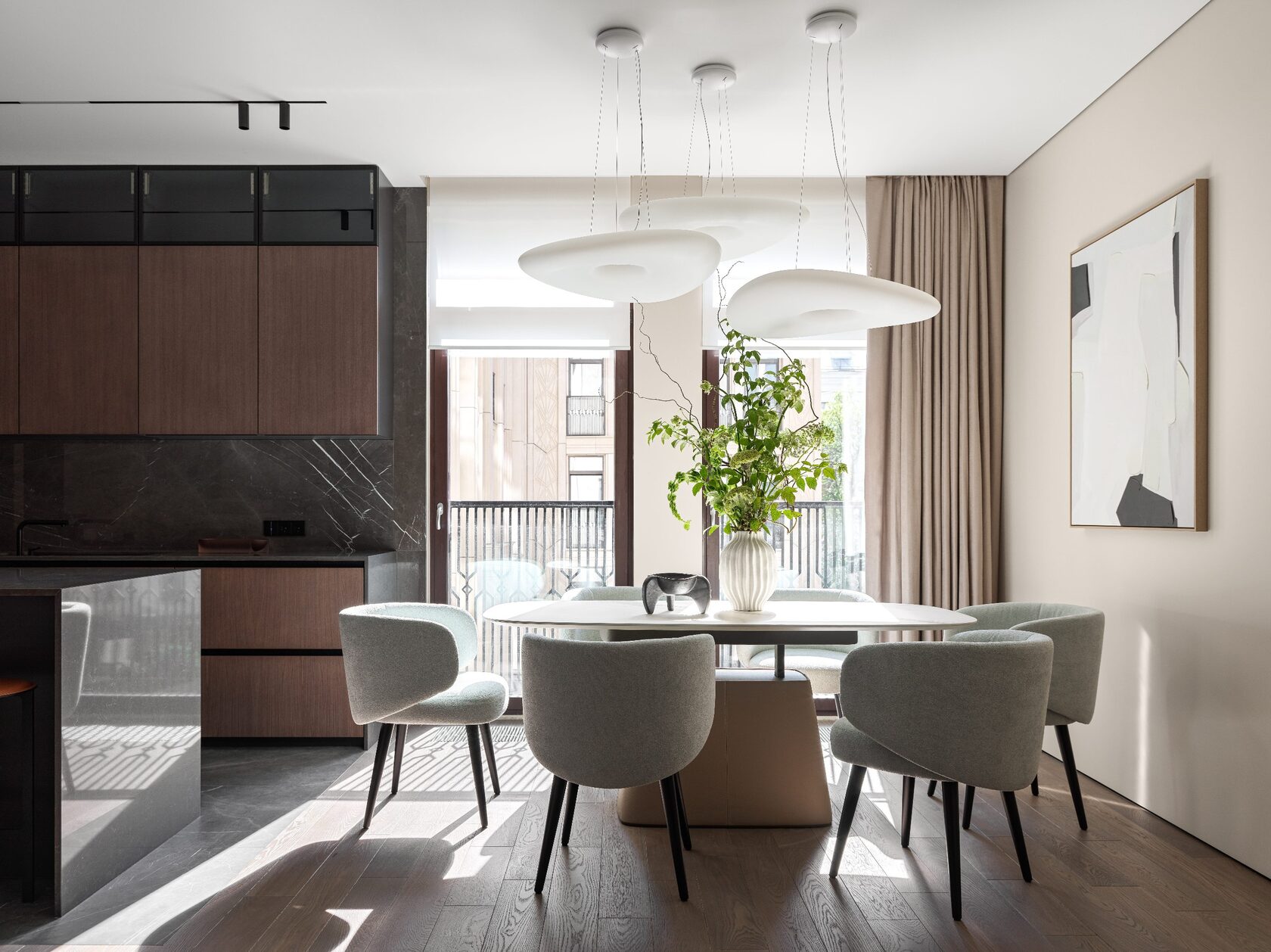 Главная особенность — продуманная организация детских комнат. Их соединяет мебельная дверь, создавая гибкое пространство для игр и учебы. Скругленные порталы и симметричные композиции добавляют интерьеру мягкости и цельности. В отделке использованы премиальные материалы: крупноформатный керамогранит, натуральный камень на кухонном острове, паркет высокой селекции. Мебель подбирали с акцентом на европейский дизайн — EDRA, CASSINA, BONALDO, — разбавляя ее винтажными находками. Техническая часть включает канальное кондиционирование, систему вентиляции с увлажнением и умный дом KNX. Сантехника Gessi с дизайнерскими коллекциями дополняет общую концепцию.