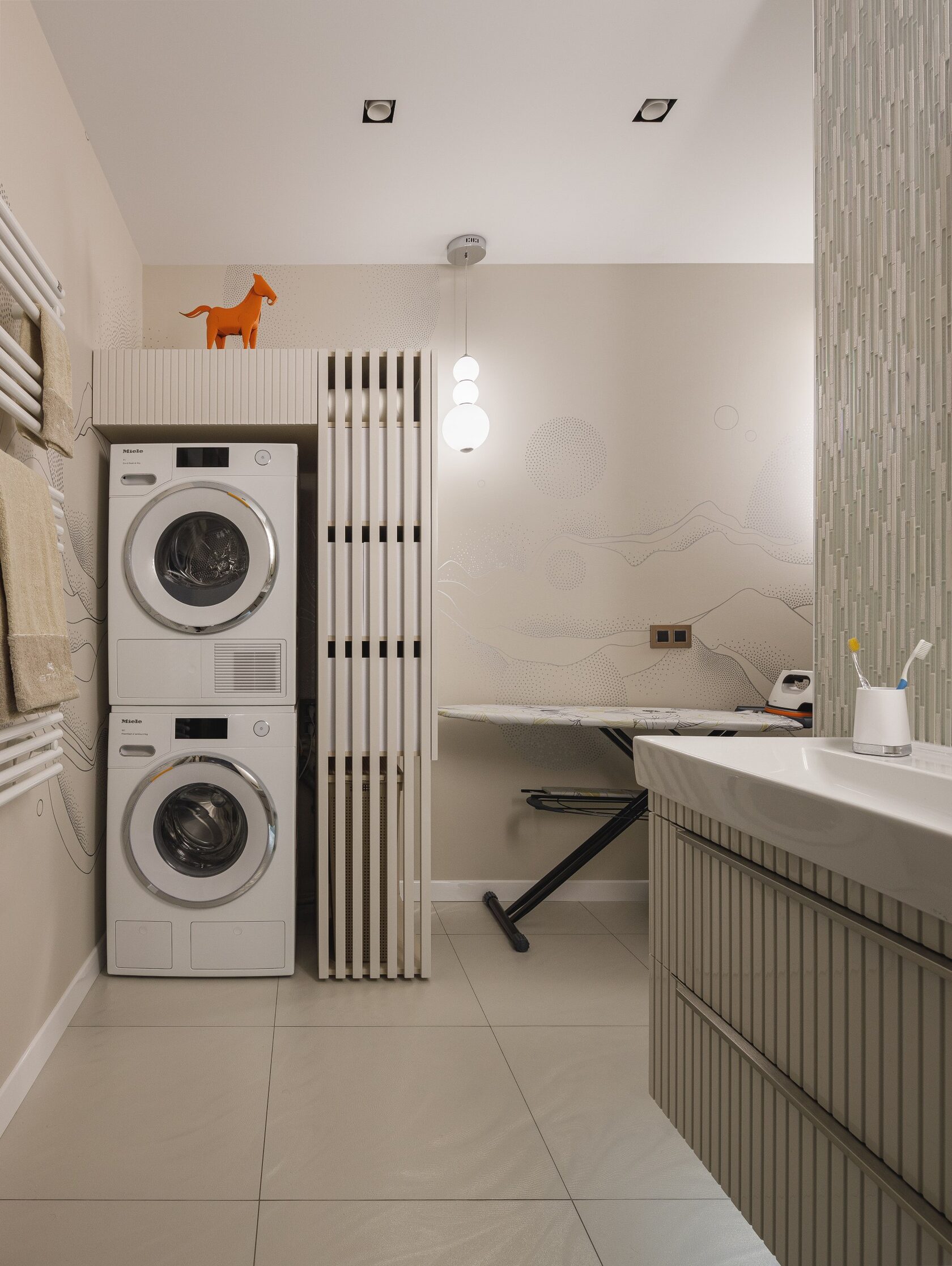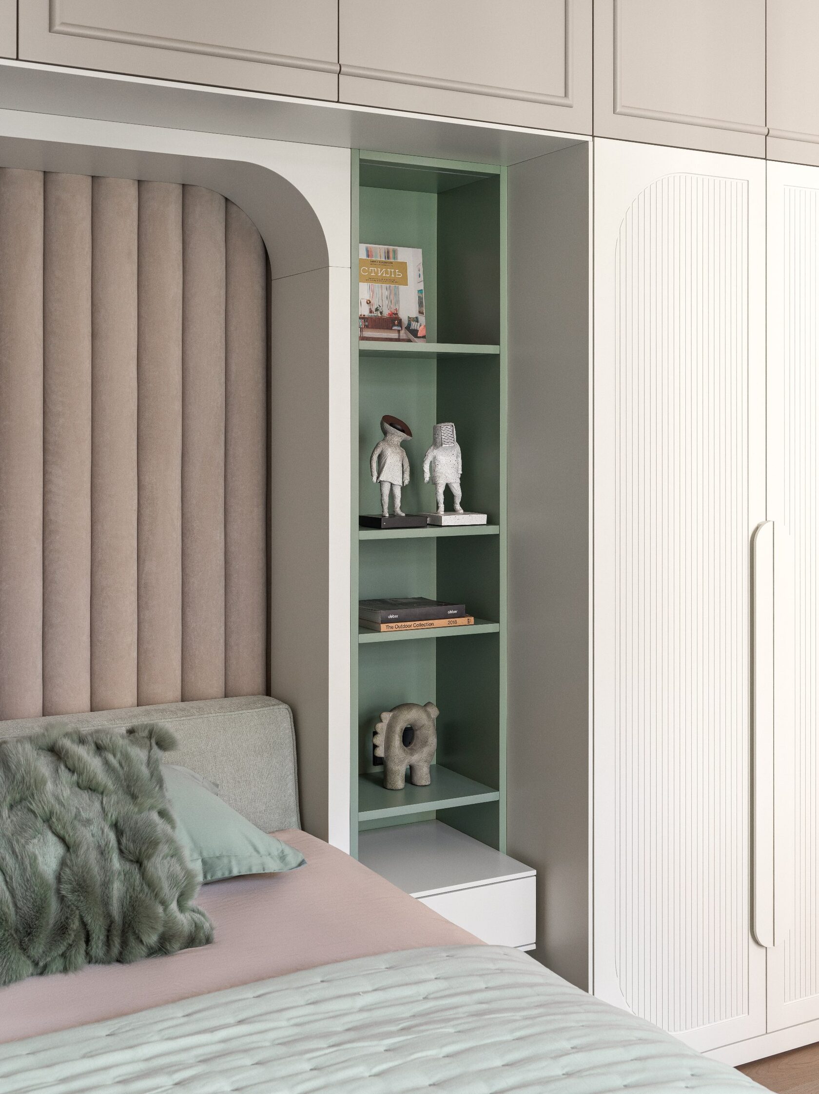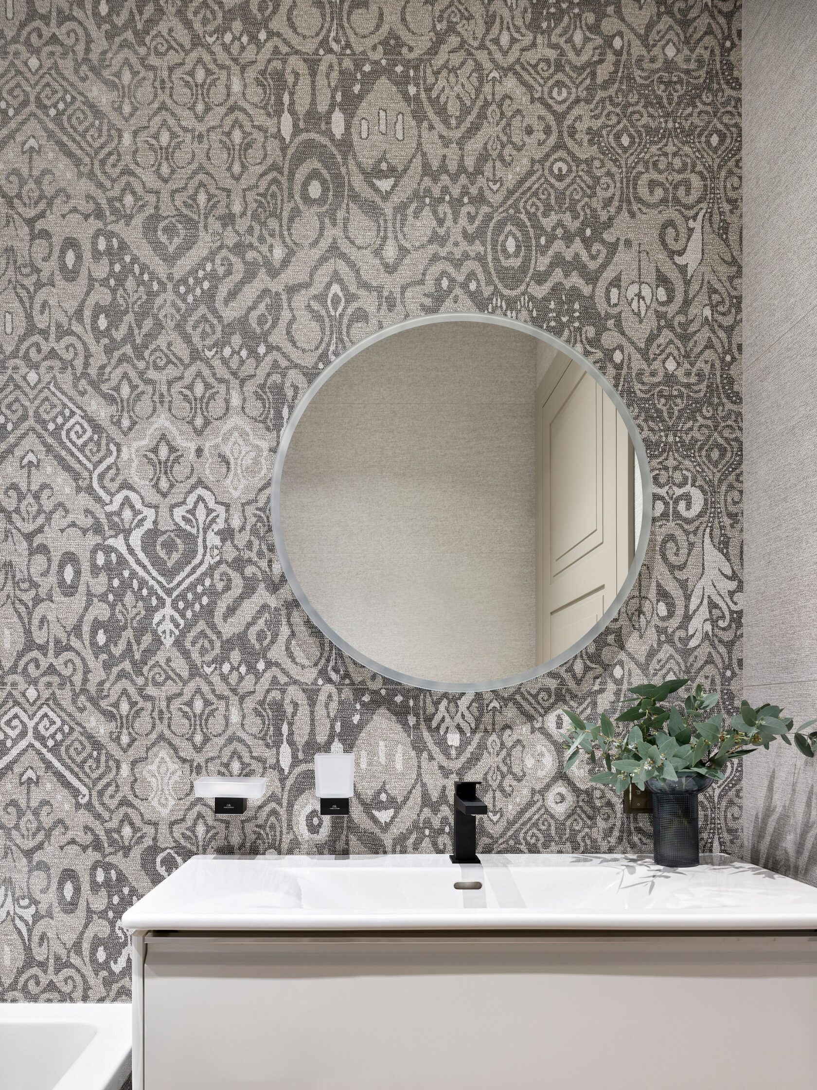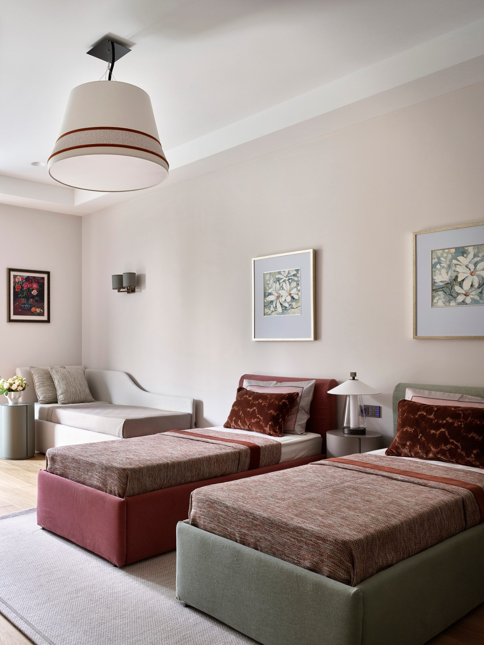 Главная особенность — продуманная организация детских комнат. Их соединяет мебельная дверь, создавая гибкое пространство для игр и учебы. Скругленные порталы и симметричные композиции добавляют интерьеру мягкости и цельности. В отделке использованы премиальные материалы: крупноформатный керамогранит, натуральный камень на кухонном острове, паркет высокой селекции. Мебель подбирали с акцентом на европейский дизайн — EDRA, CASSINA, BONALDO, — разбавляя ее винтажными находками. Техническая часть включает канальное кондиционирование, систему вентиляции с увлажнением и умный дом KNX. Сантехника Gessi с дизайнерскими коллекциями дополняет общую концепцию.