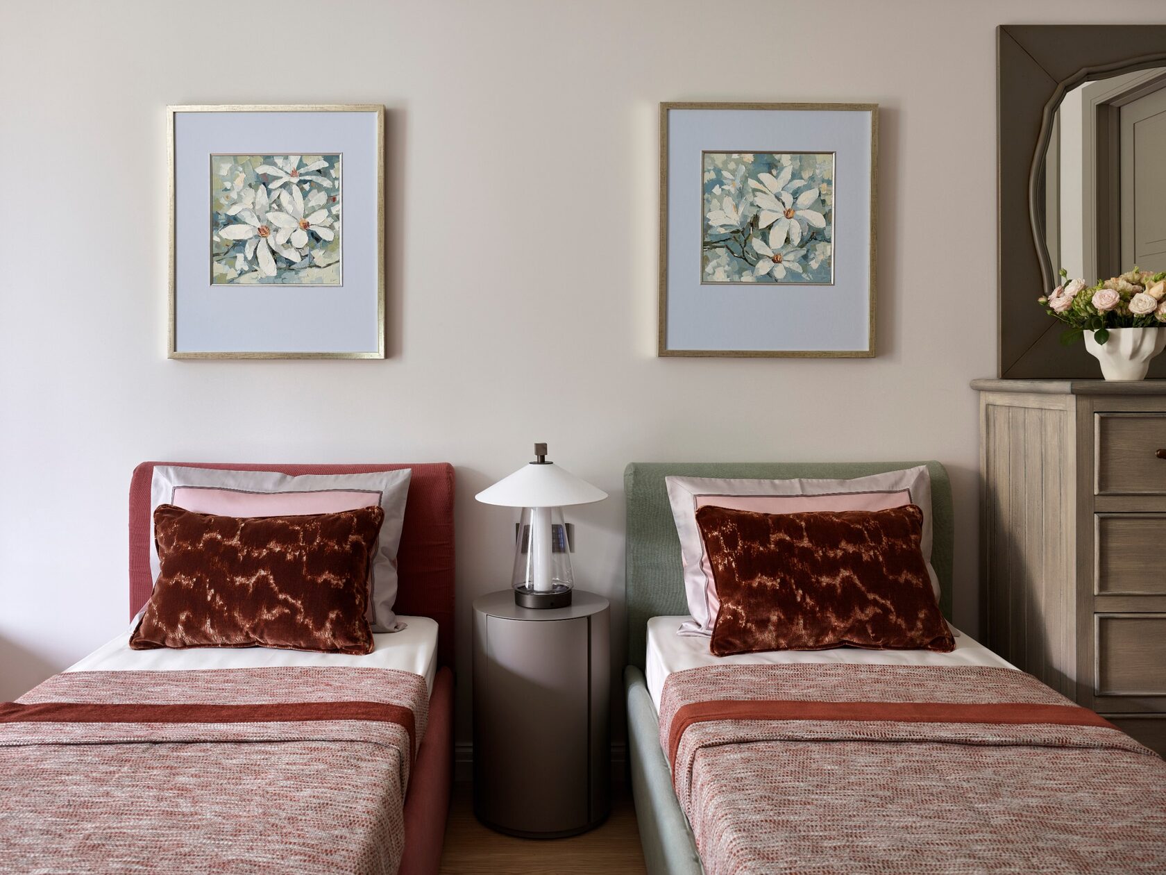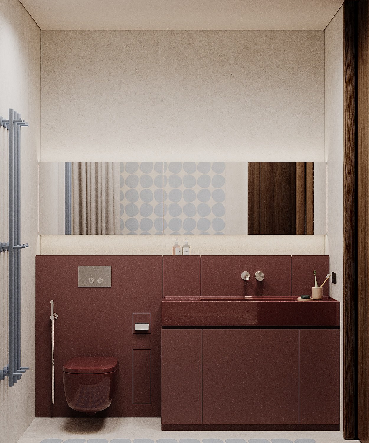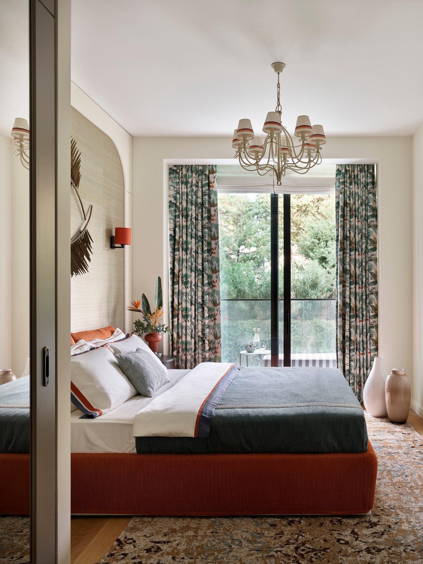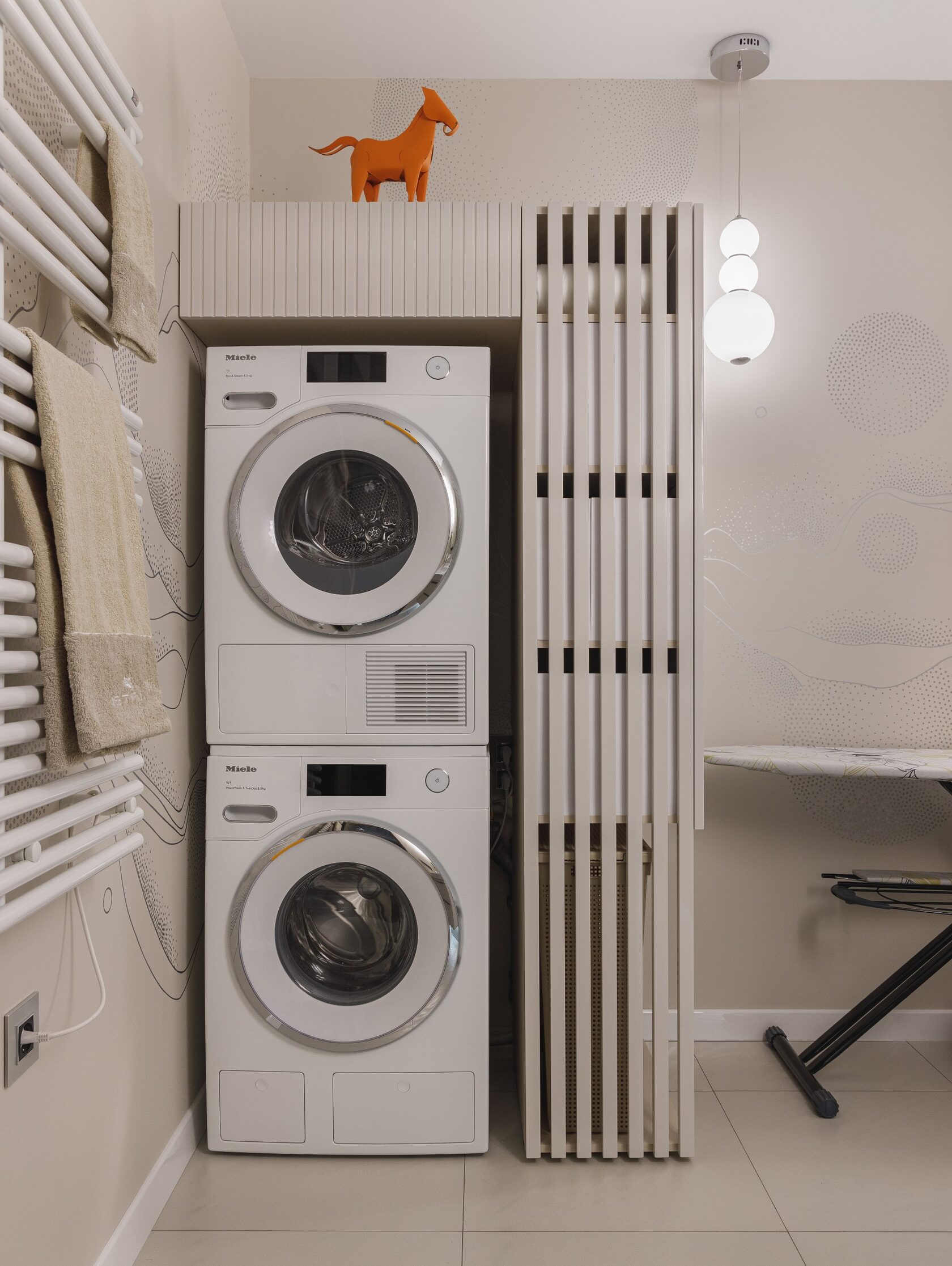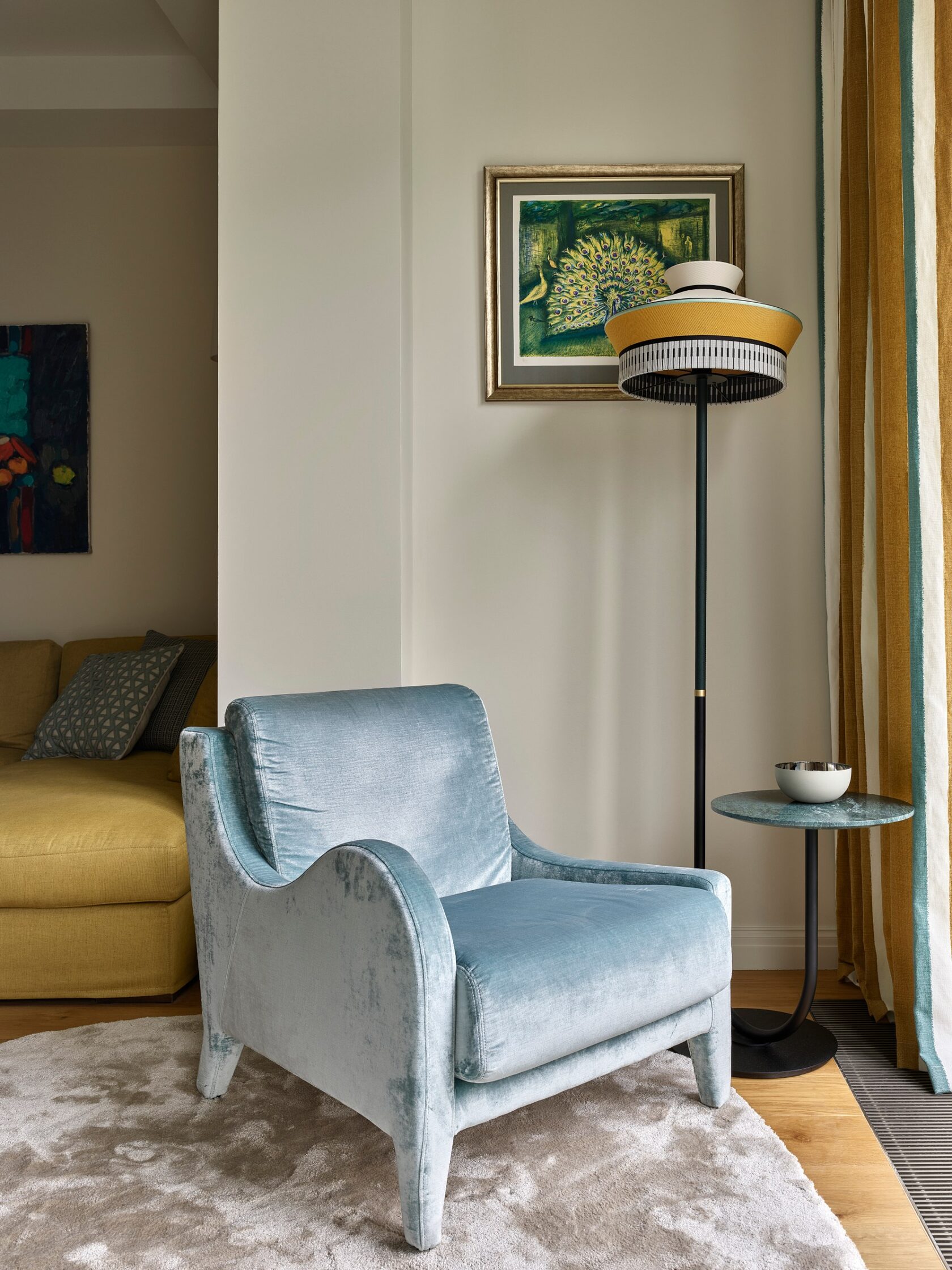 Главная особенность — продуманная организация детских комнат. Их соединяет мебельная дверь, создавая гибкое пространство для игр и учебы. Скругленные порталы и симметричные композиции добавляют интерьеру мягкости и цельности. В отделке использованы премиальные материалы: крупноформатный керамогранит, натуральный камень на кухонном острове, паркет высокой селекции. Мебель подбирали с акцентом на европейский дизайн — EDRA, CASSINA, BONALDO, — разбавляя ее винтажными находками. Техническая часть включает канальное кондиционирование, систему вентиляции с увлажнением и умный дом KNX. Сантехника Gessi с дизайнерскими коллекциями дополняет общую концепцию.