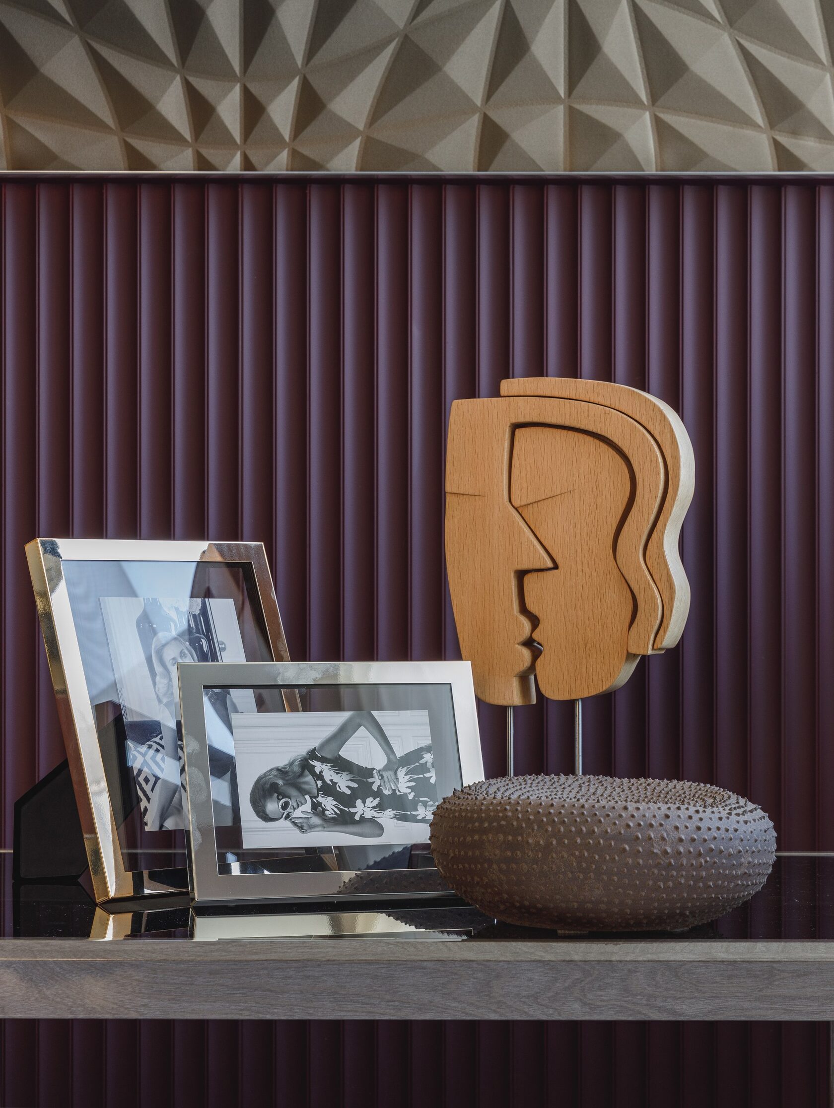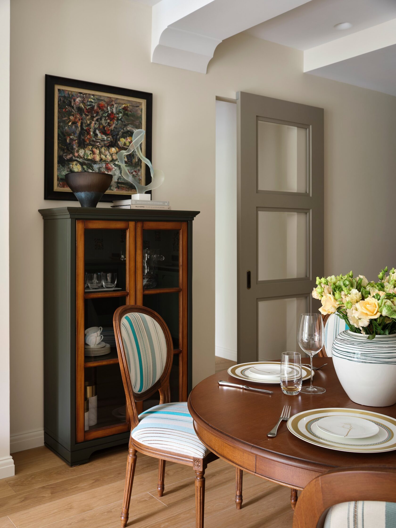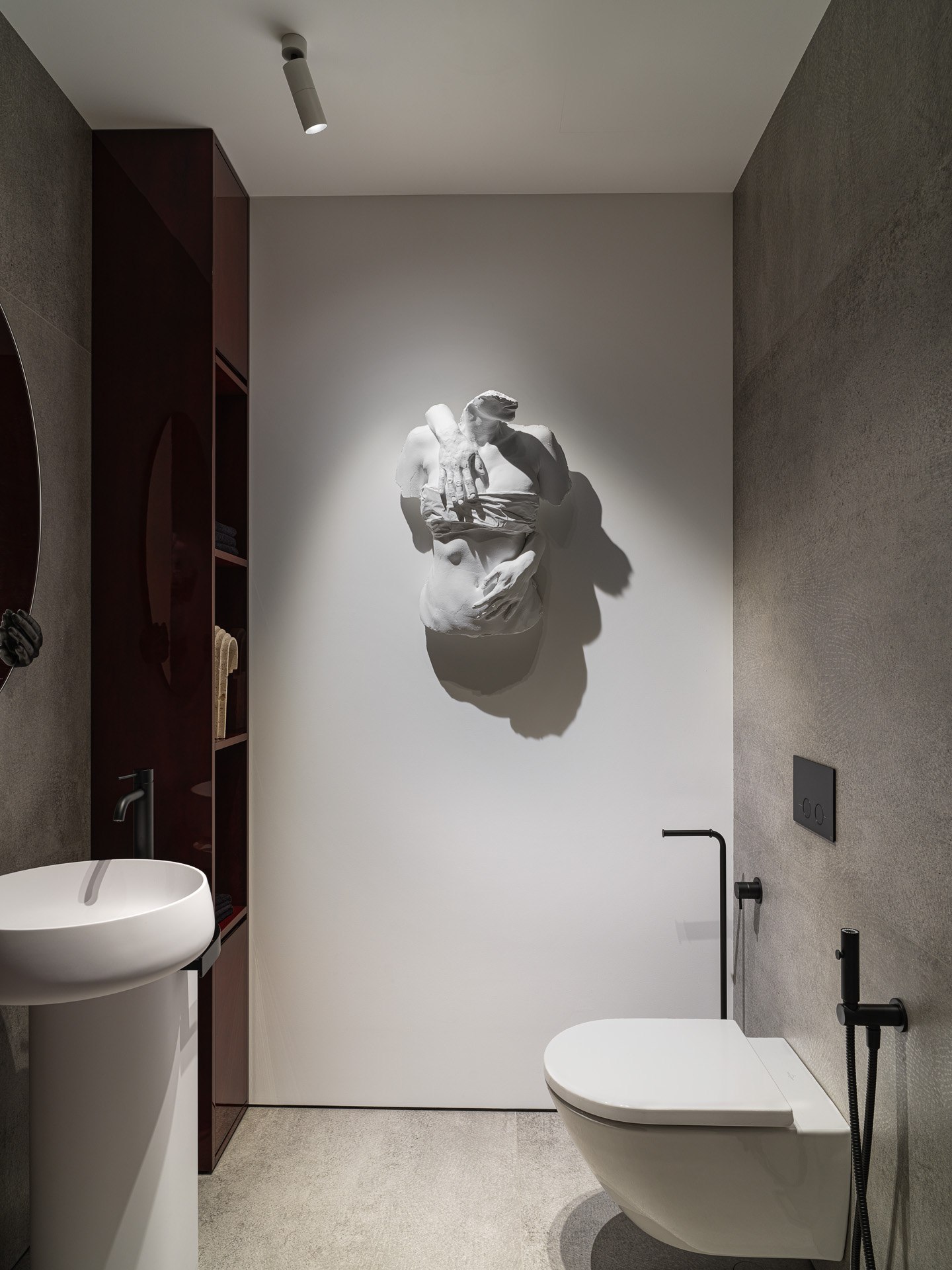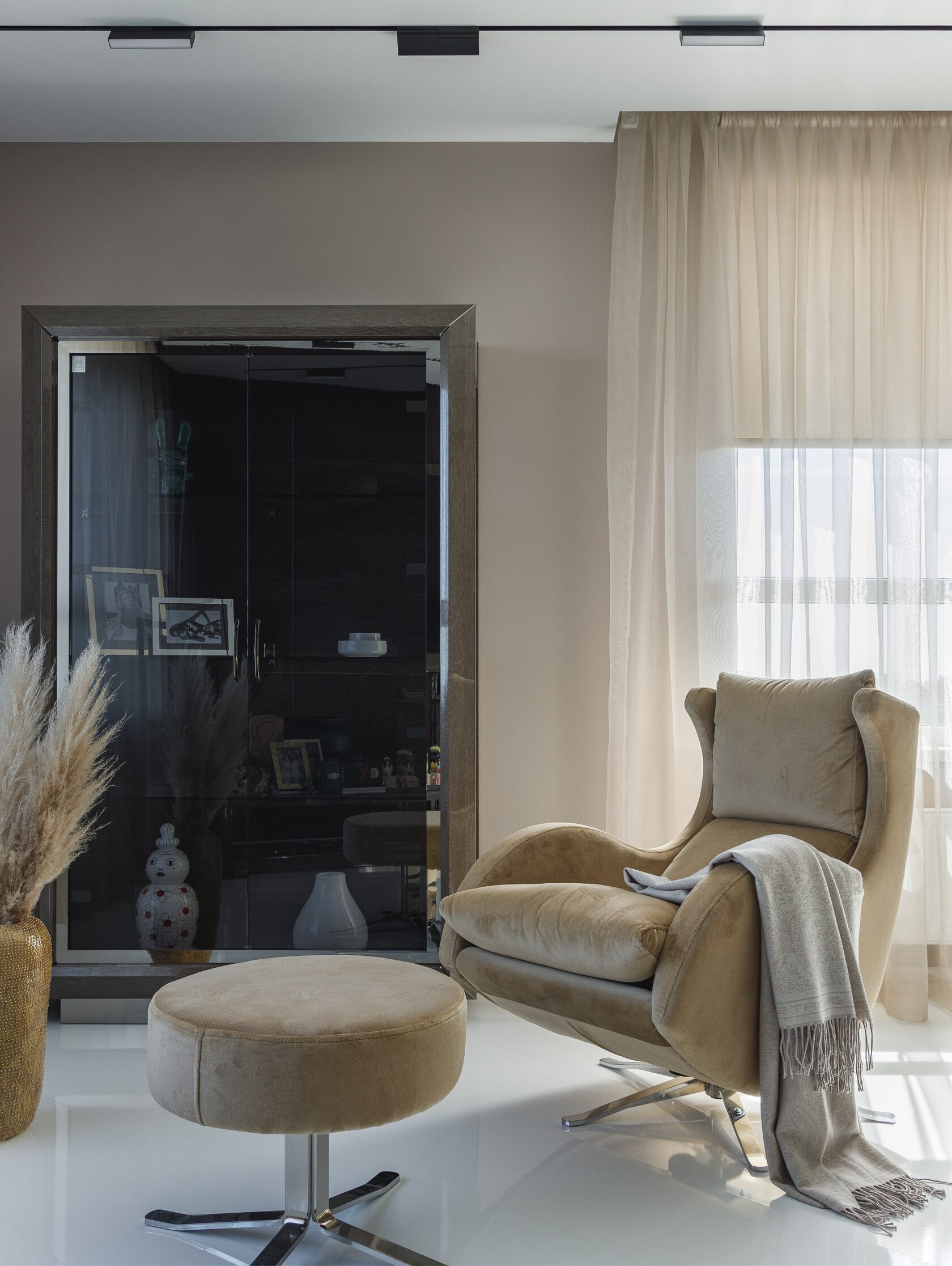 Искусство занимает особое место в этом интерьере. Картины и скульптуры, выбранные с любовью, создают атмосферу изысканности и утонченности. Лейтмотивом проекта стали изящные женские формы, которые так точно характеризуют нашу заказчицу. Мы предложили снять бюст с нашей заказчицы как с модели, и скульптор создал шедевр, который уже готов занять свое почетное место в квартире.