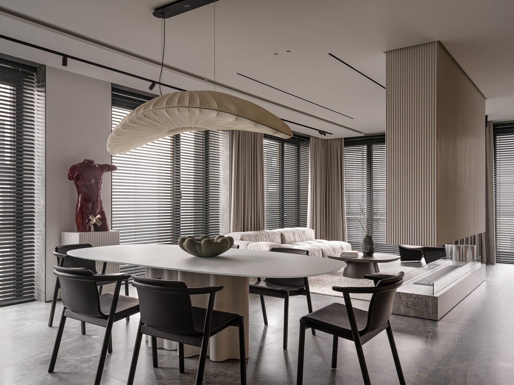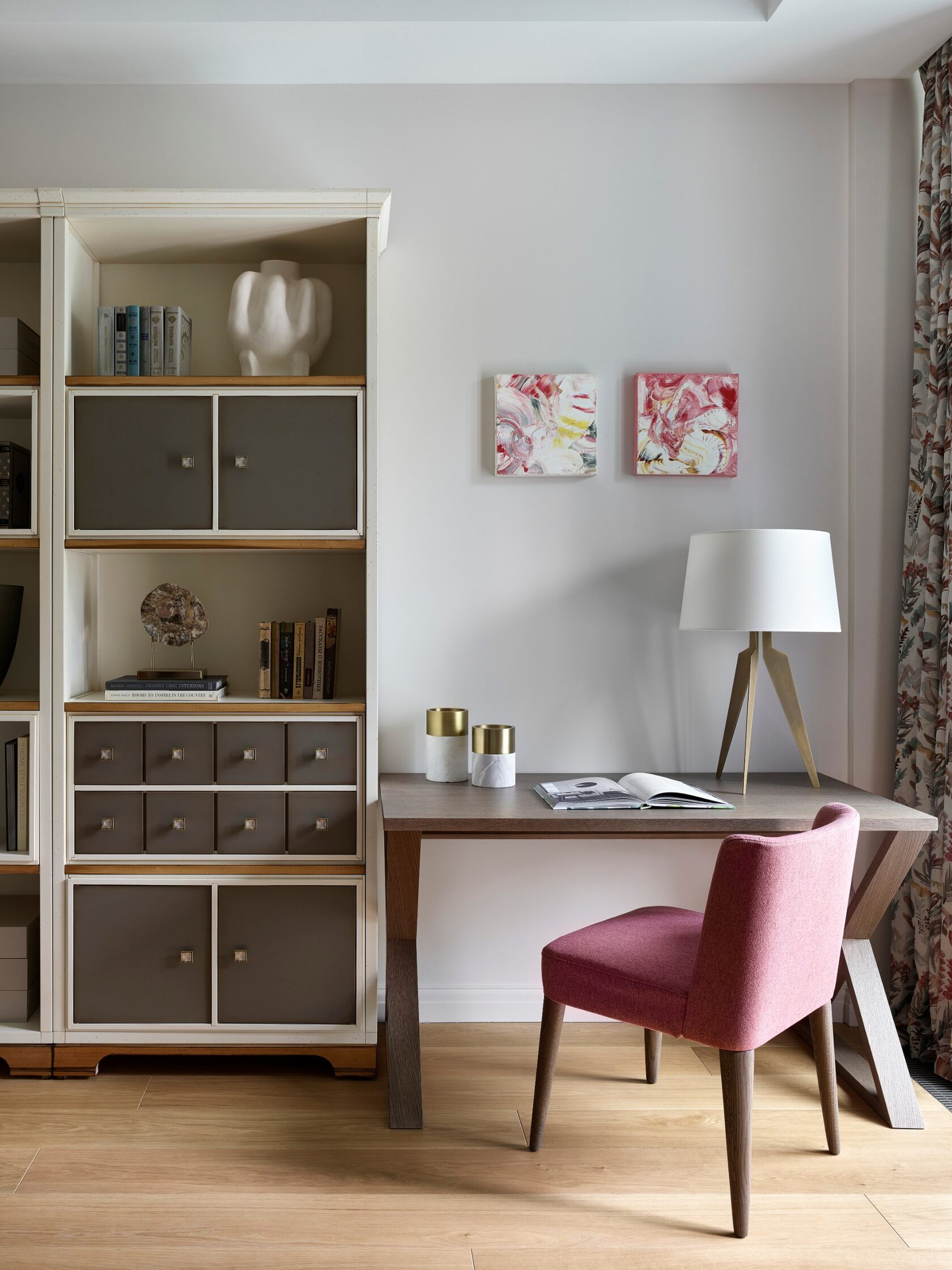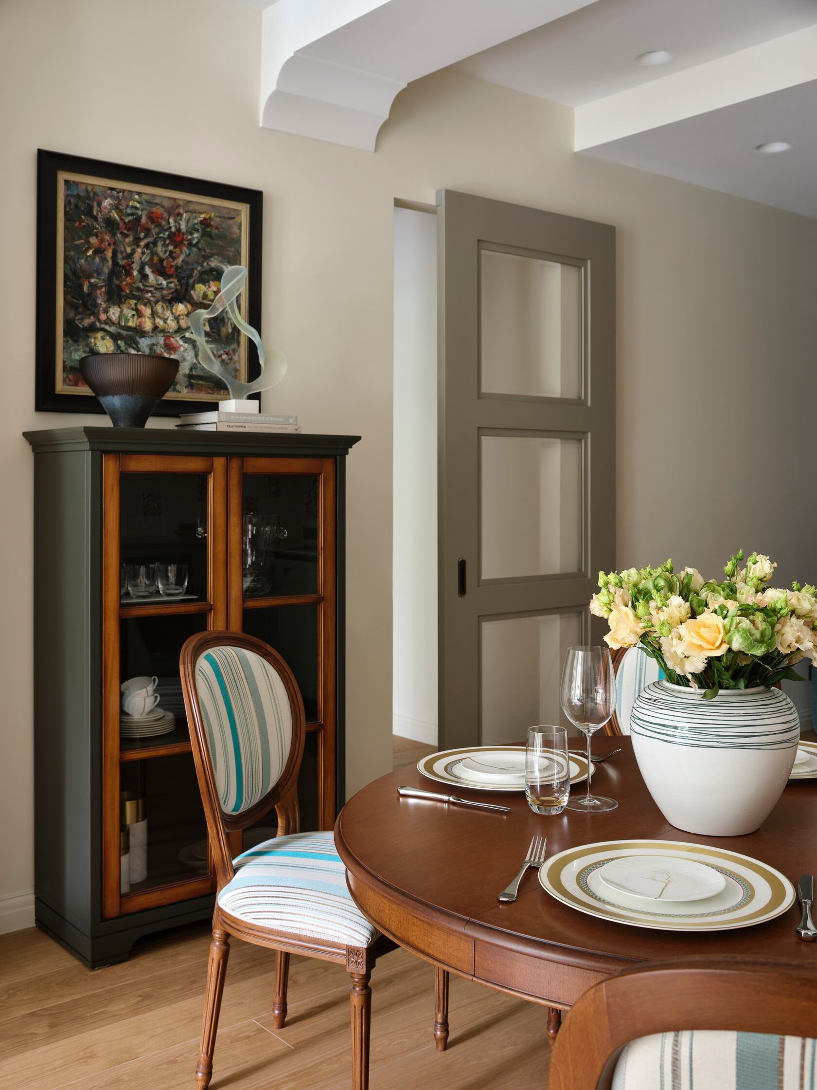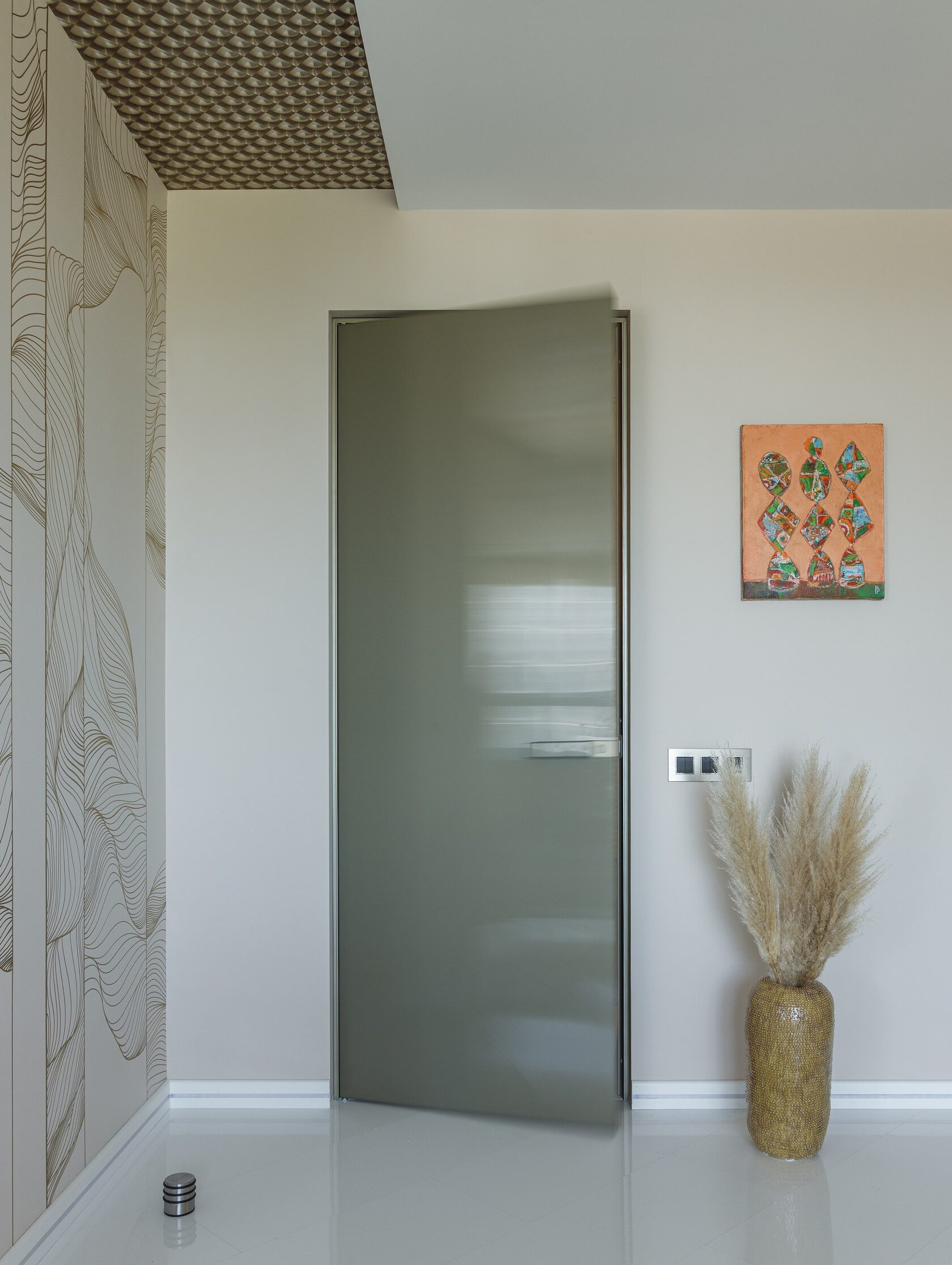 Искусство занимает особое место в этом интерьере. Картины и скульптуры, выбранные с любовью, создают атмосферу изысканности и утонченности. Лейтмотивом проекта стали изящные женские формы, которые так точно характеризуют нашу заказчицу. Мы предложили снять бюст с нашей заказчицы как с модели, и скульптор создал шедевр, который уже готов занять свое почетное место в квартире.