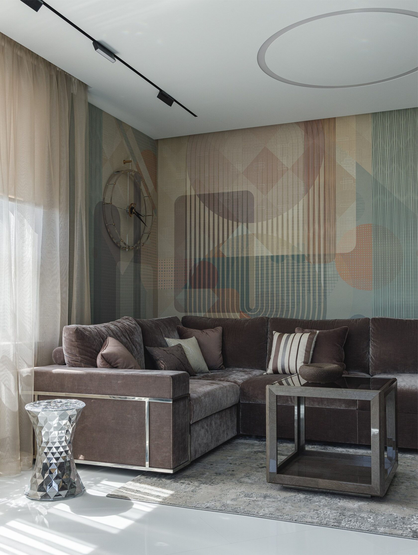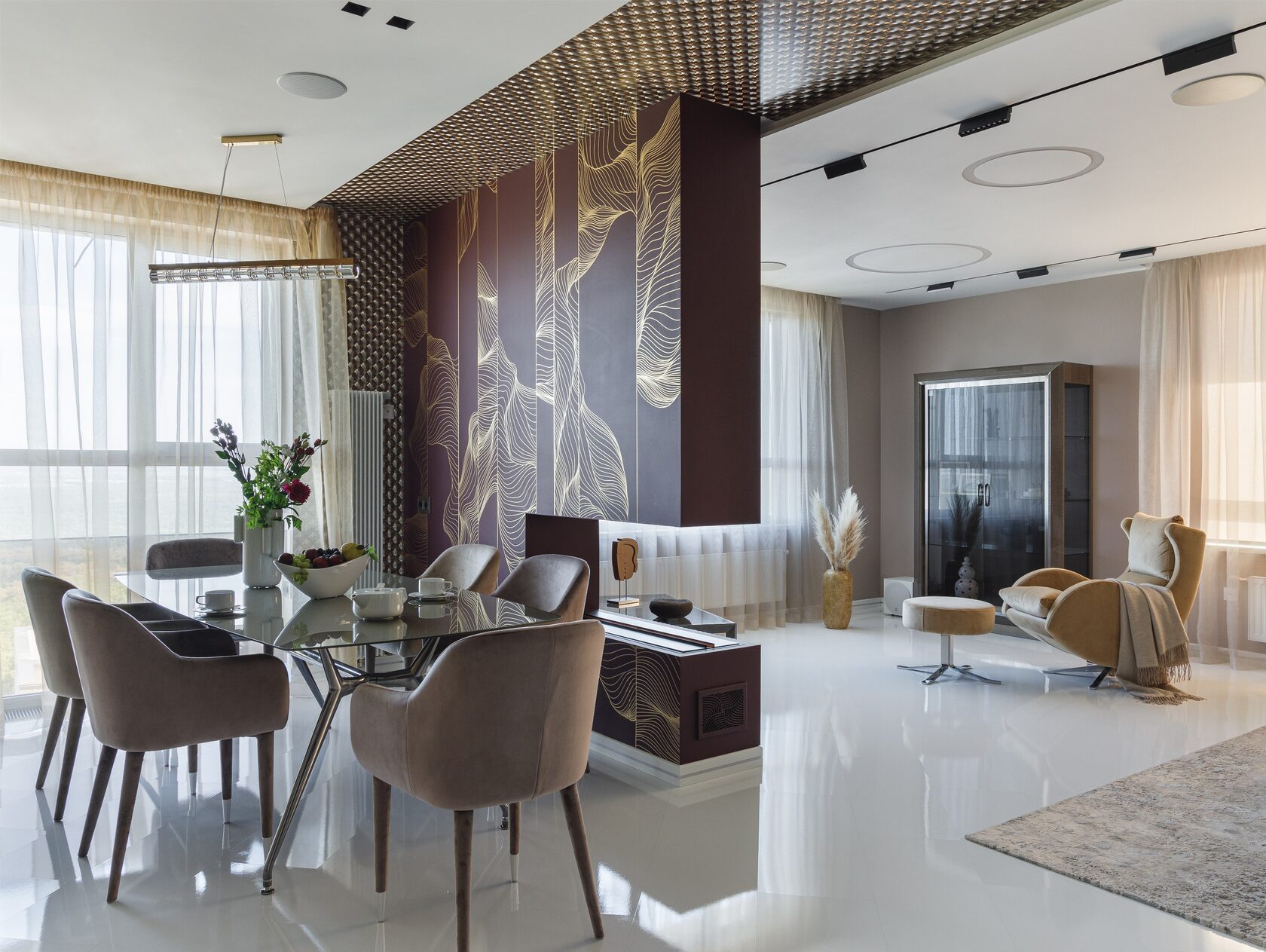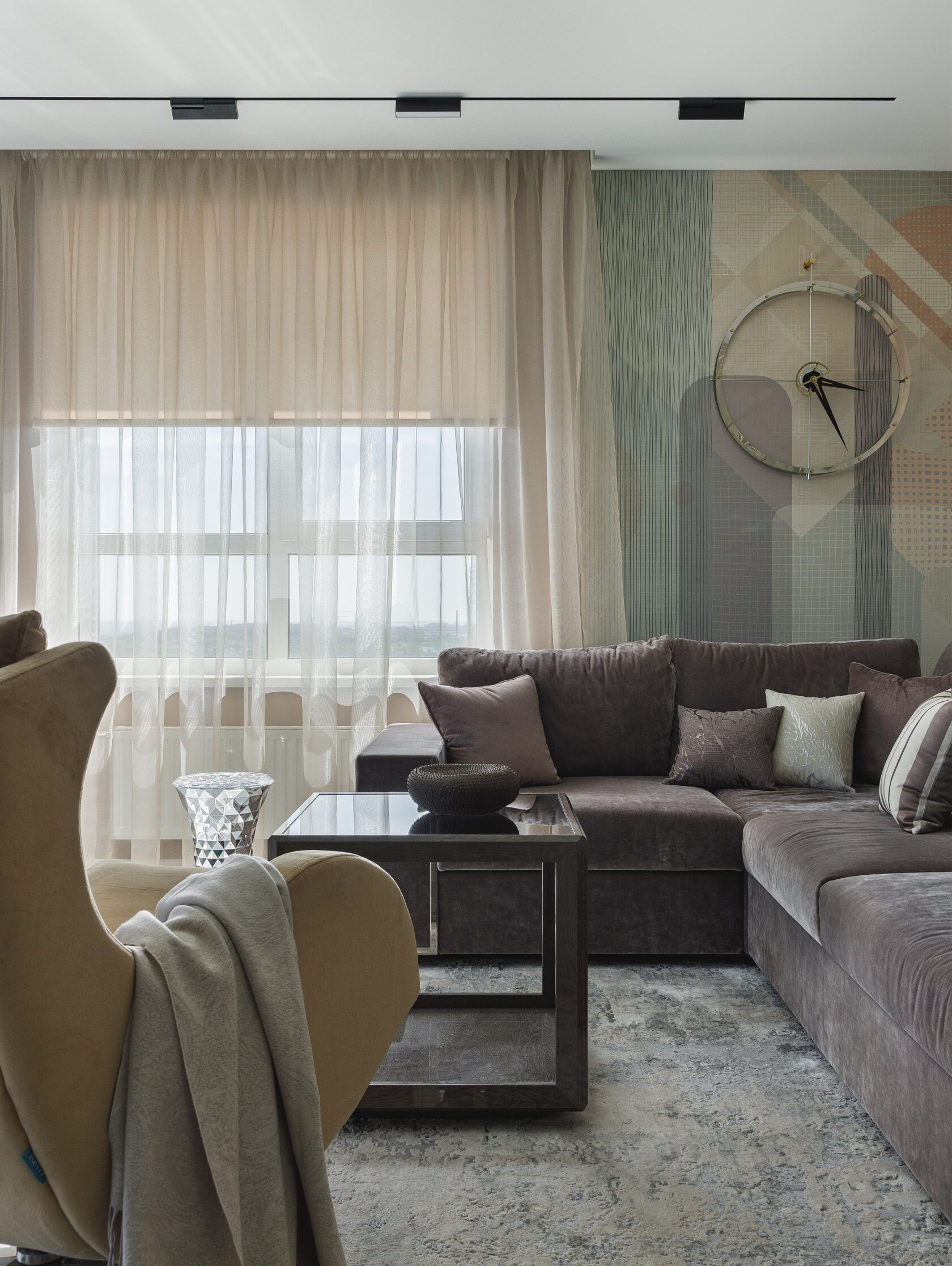 Интерьер К-48 — это современное пространство площадью 100 м² с потолками 6,2 м, где масштаб подчеркивают люстра Vargov и лестница из дерева и керамогранита с подсветкой и стеклянными перилами. Основная палитра — сложные серо-бежевые оттенки, дополненные глубокими тёмными тонами и элементами ар-деко: зеркала, стекло, декоративные панели под камень.