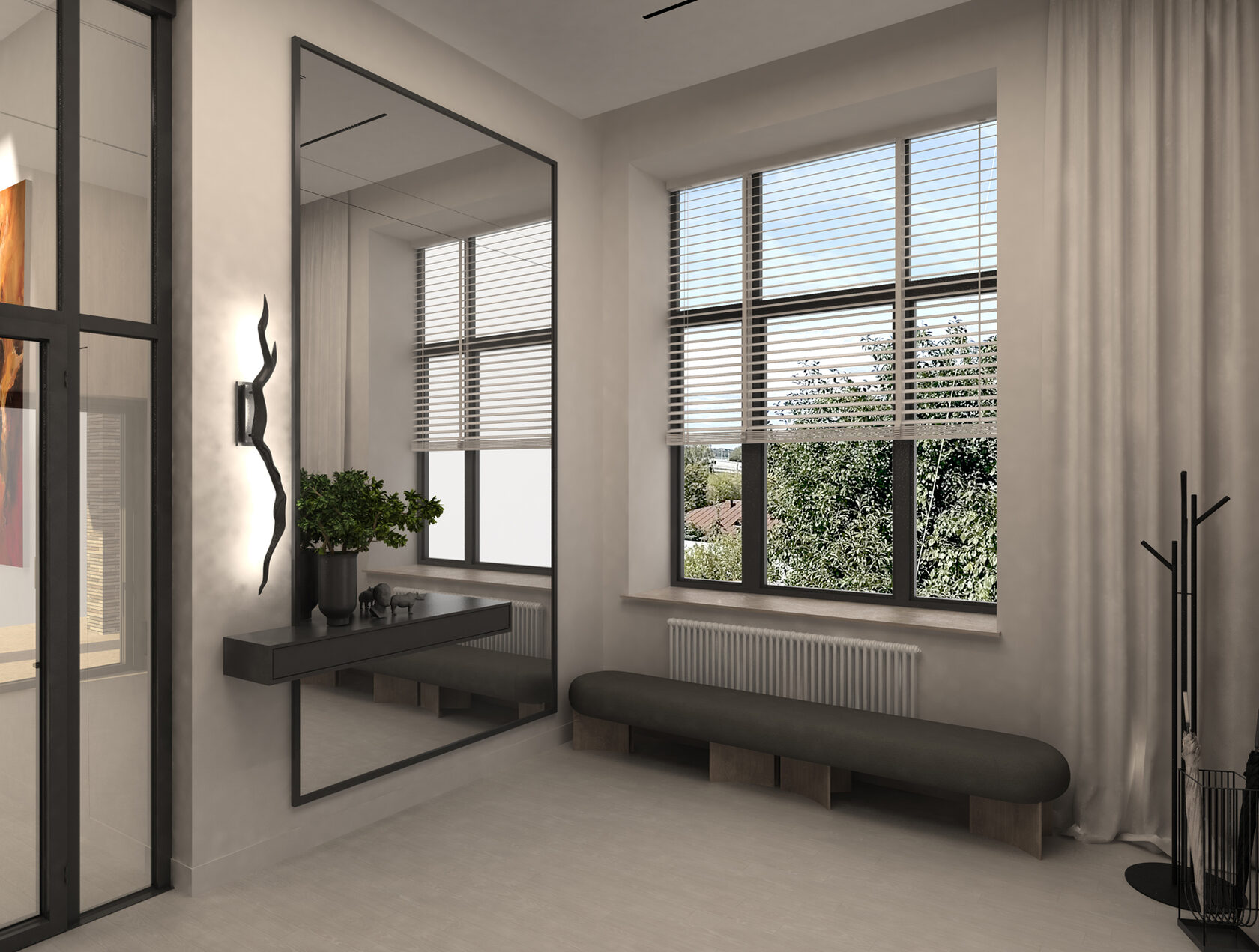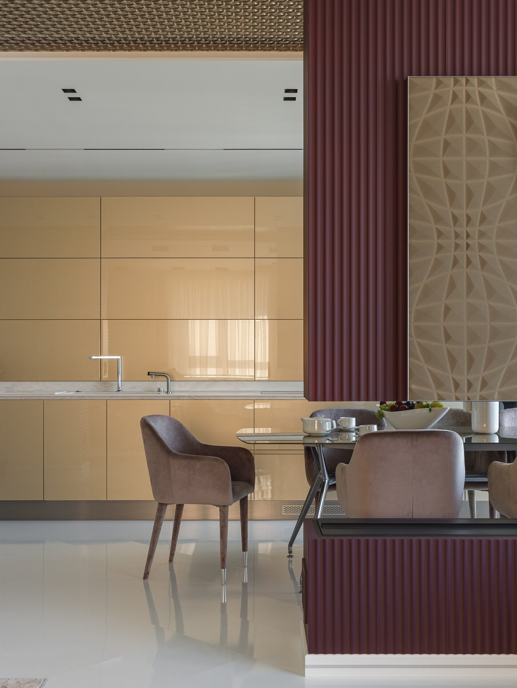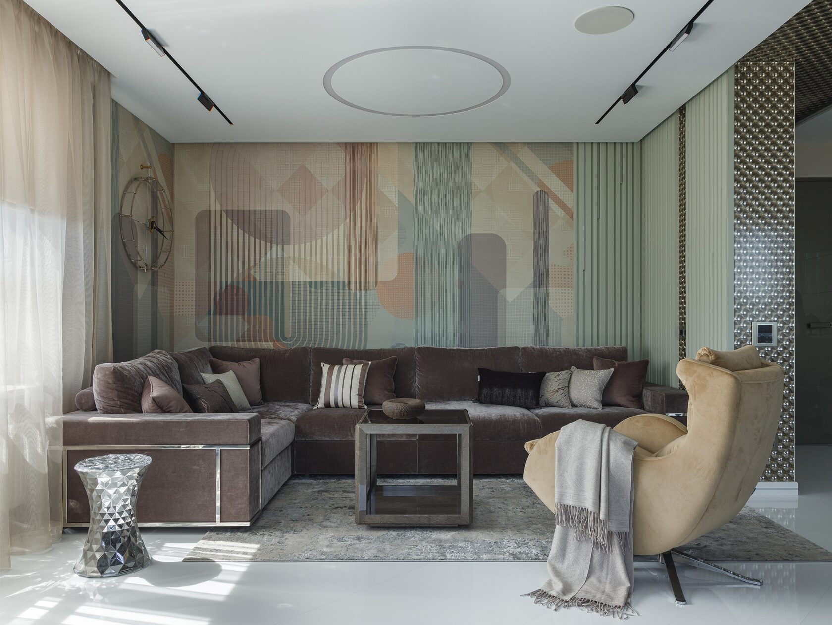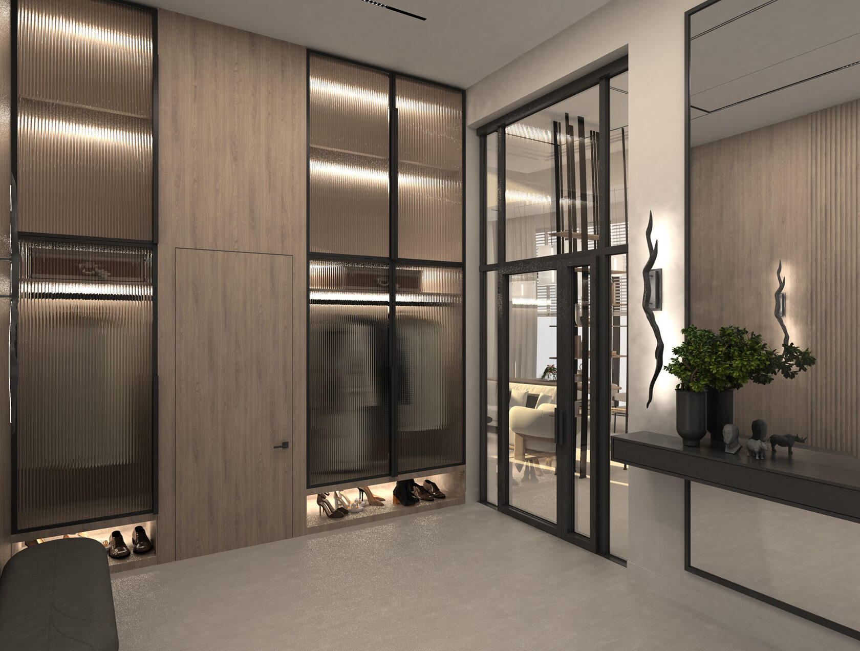 Интерьер К-48 — это современное пространство площадью 100 м² с потолками 6,2 м, где масштаб подчеркивают люстра Vargov и лестница из дерева и керамогранита с подсветкой и стеклянными перилами. Основная палитра — сложные серо-бежевые оттенки, дополненные глубокими тёмными тонами и элементами ар-деко: зеркала, стекло, декоративные панели под камень.