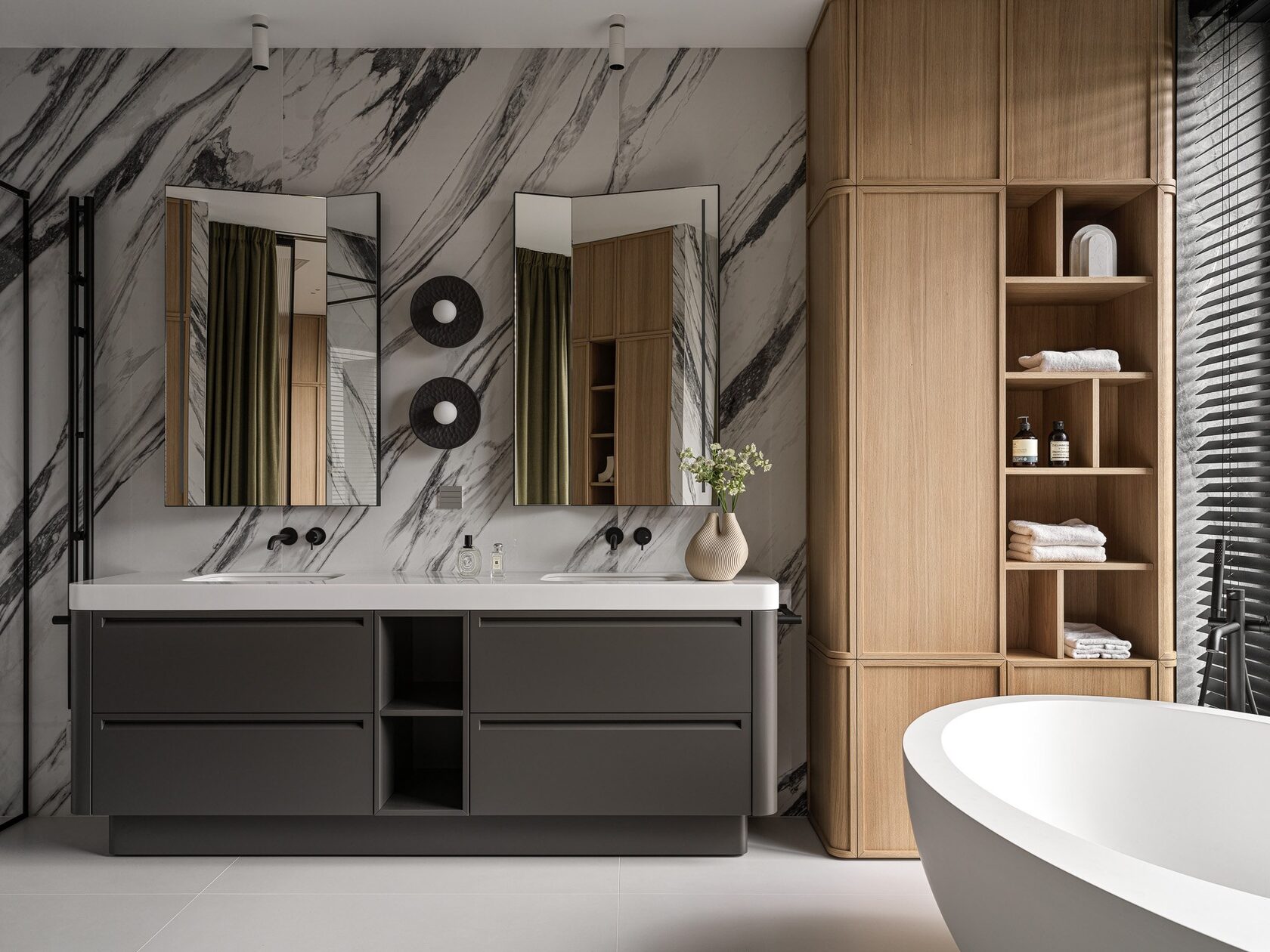 Ключевые зоны: кухня с итальянскими фасадами, кабинет и спальня в тёмных оттенках, санузел с мотивами Бали, ванная с отдельно стоящей ванной и бронзовыми зеркалами, детская — лёгкая и жизнерадостная.