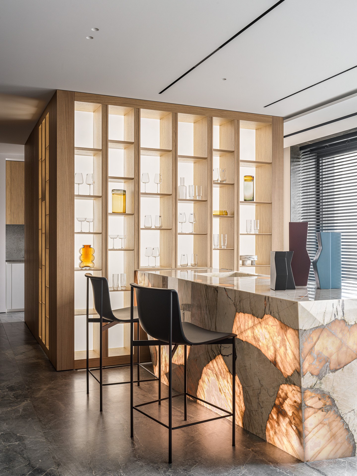 Каждый наш проект уникален, и эта квартира не стала исключением. Здесь каждая деталь продумана до мелочей, каждая комната наполнена смыслом и эмоциями. Заказчица мечтала о книжной библиотеке с панорамным камином, и мы создали это уютное пространство, где можно провести часы за чтением любимых книг. Каменный остров из кварцита с подсветкой и стеллажом для коллекционного алкоголя стал настоящим украшением гостиной, добавив ей роскоши и элегантности.