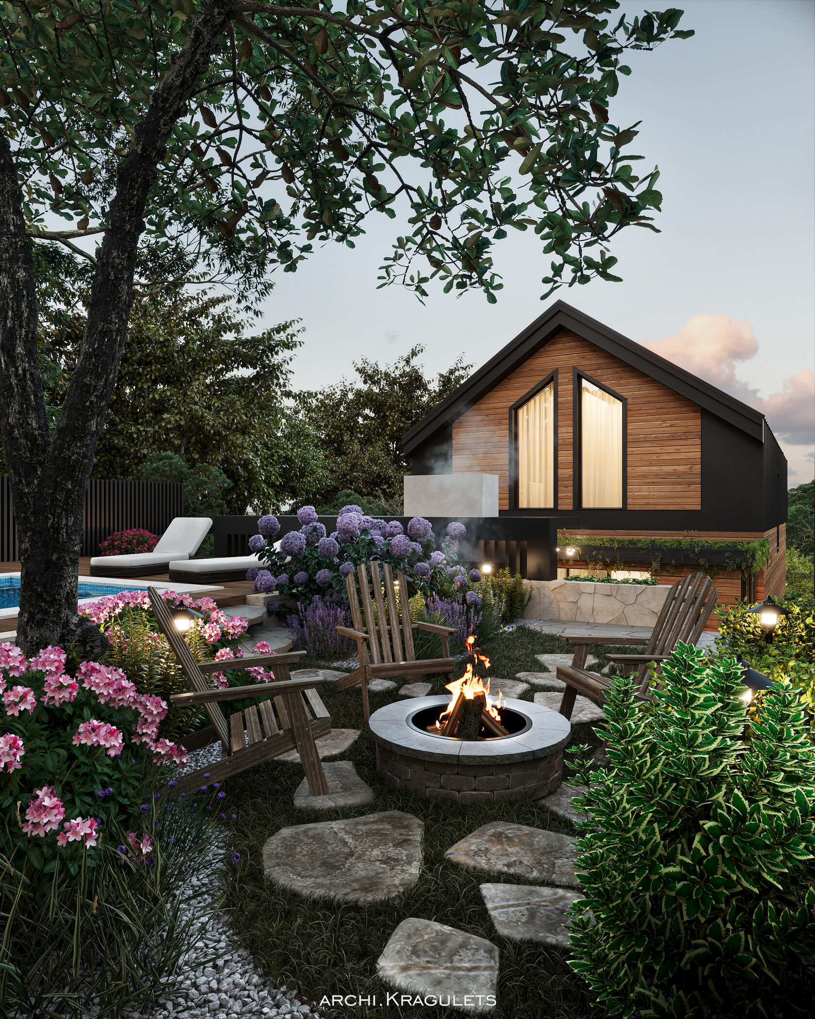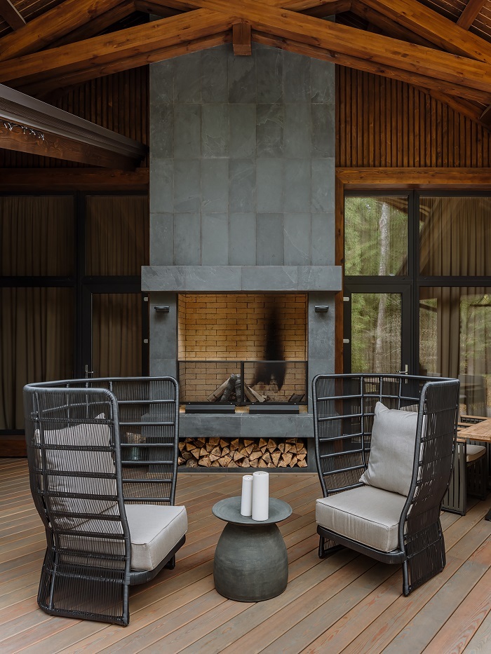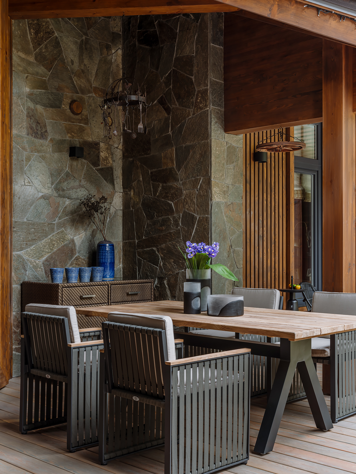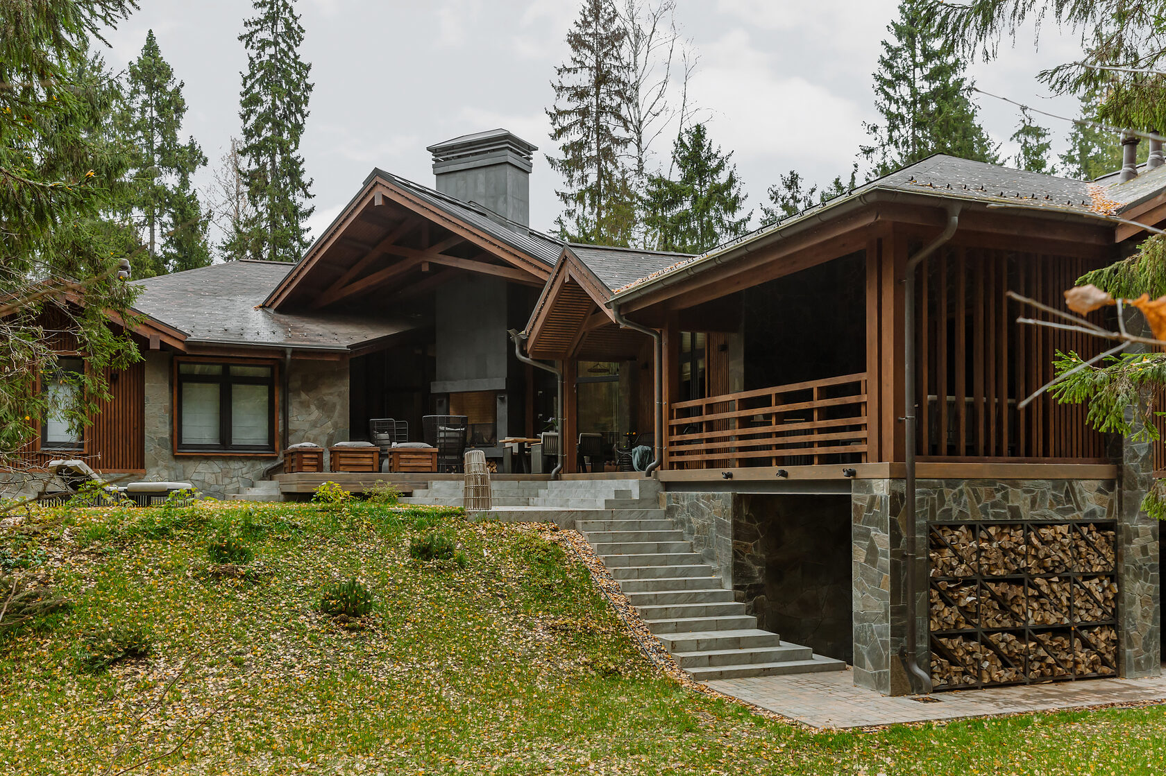 Концепция: Главной задачей было создание пространства, где каждый элемент функционален и имеет глубокий смысл. Центральным ядром дома является светлая общественная зона – гостиная, столовая и кухня, максимально наполненные естественным светом благодаря панорамному остеклению. Она плавно переходит в приватную террасу с камином и зоной барбекю, становясь продолжением интерьера. Оригинальное планировочное решение, вдохновленное особенностями участка, предусматривает два функциональных блока, расходящихся от центра: приватный – со спальнями, санузлами и кабинетом, и блок для досуга и хозяйства – с творческой мастерской, баней и отдельным выходом. Использование натуральных материалов – дерева, камня и стекла – подчеркивает стремление к единению с природой и экологичность проекта.