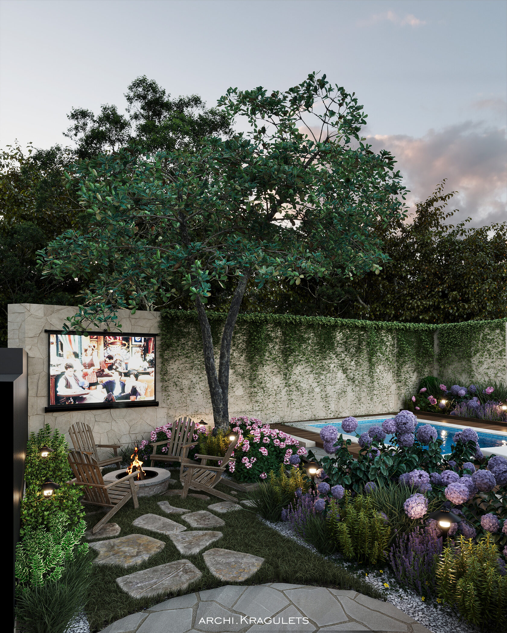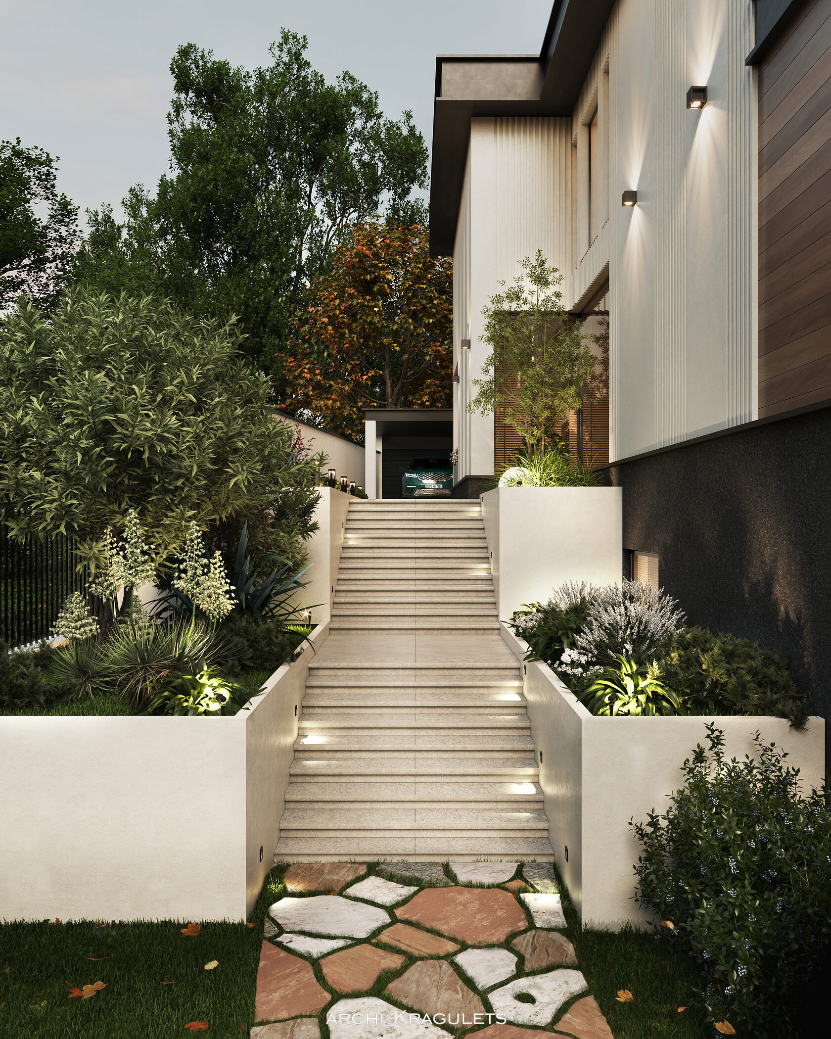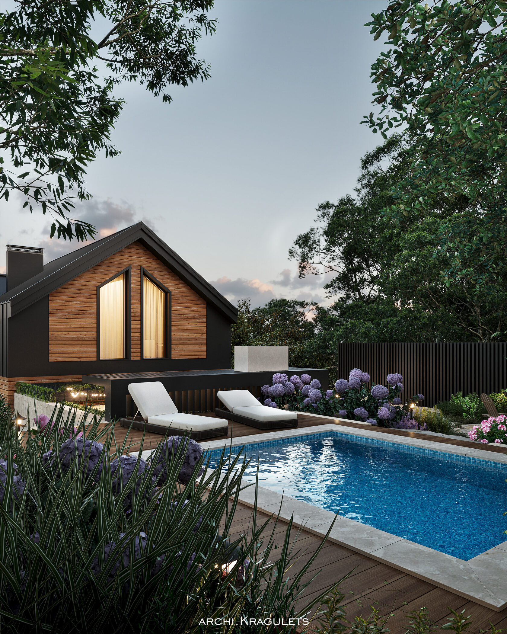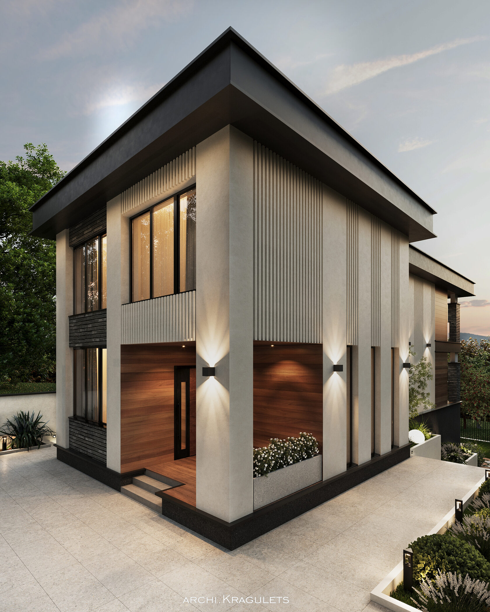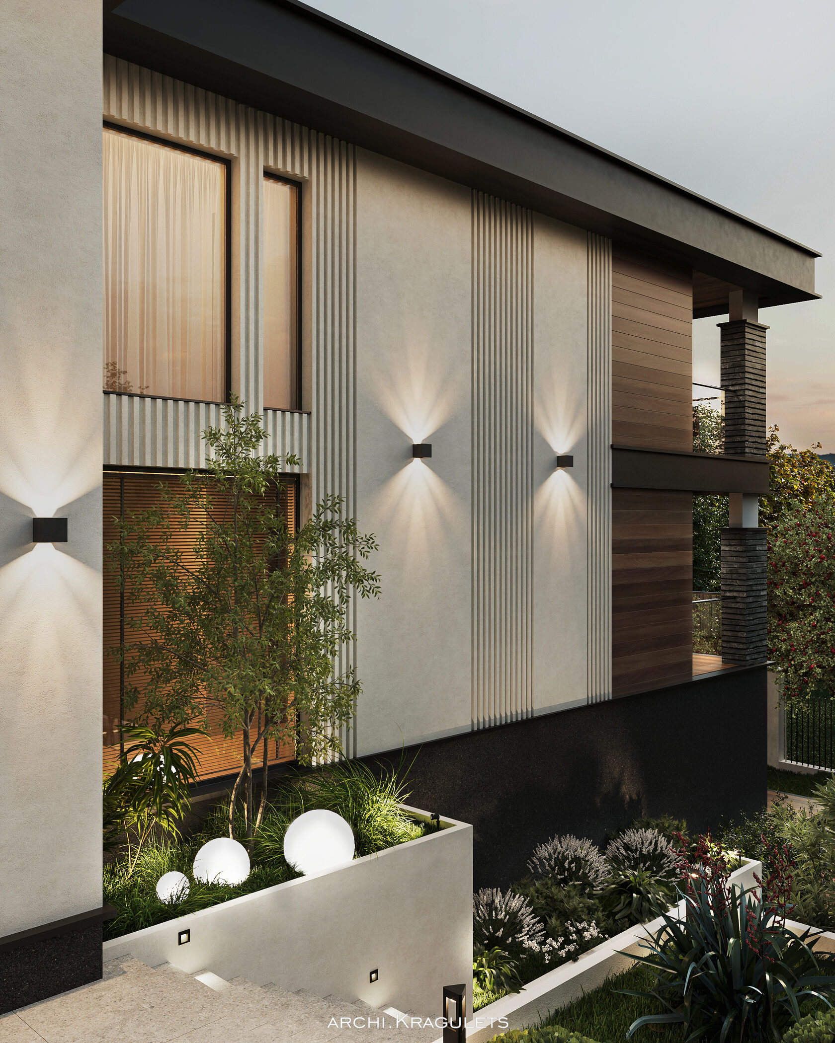 Концепция: Ключевая концепция проекта заключалась в трансформации сложного рельефа участка из вызова в уникальное архитектурное преимущество. Дизайн коттеджа виртуозно сочетает строгий минимализм – лаконичные формы, чистые линии и безупречное внимание к деталям – с выразительными элементами стиля арт-деко. Геометрические орнаменты, металлические вставки и утонченная игра света и тени на фасадных поверхностях создают динамичный и неповторимый облик, подчеркивая функциональность и эстетику объекта в его природном окружении.