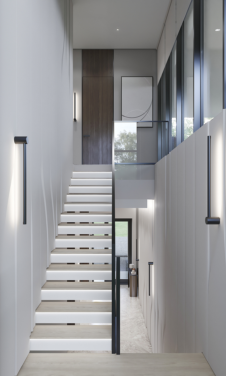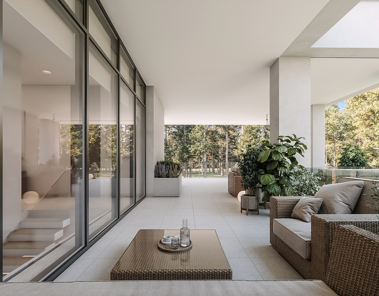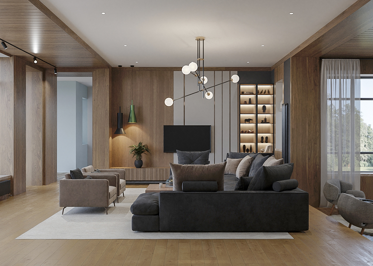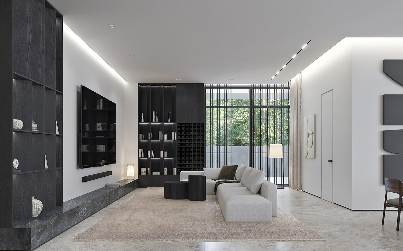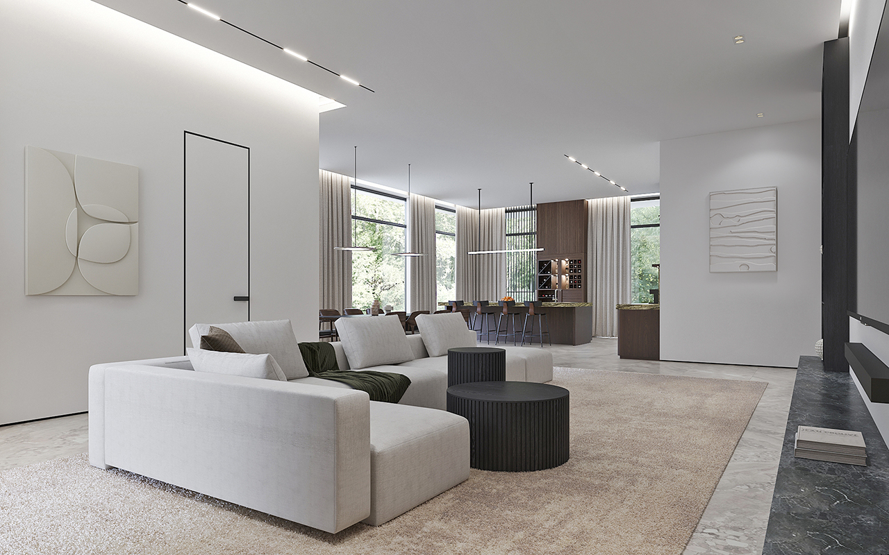 Итог: Результатом стало создание функционального и эстетически совершенного интерьера, который идеально резонирует с архитектурным замыслом и естественным контекстом. Пространство ощущается легким, открытым и приглашающим, предлагая жильцам атмосферу спокойствия и гармонии, где каждая деталь подчеркивает целостность проекта.