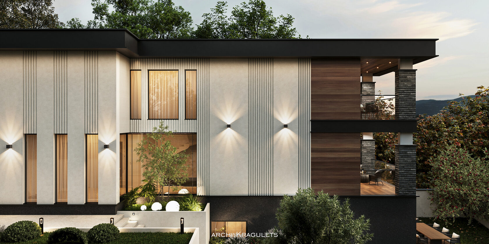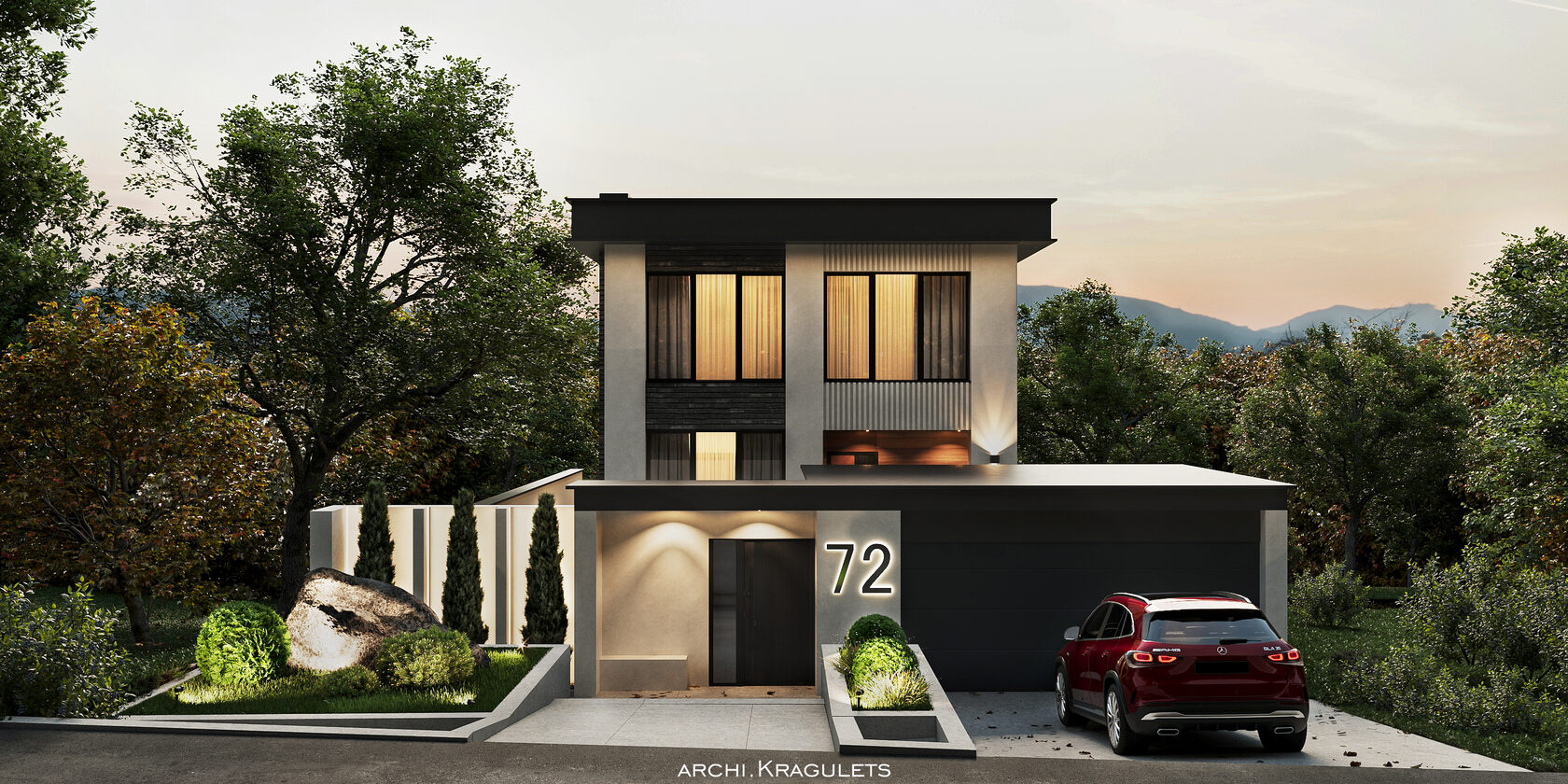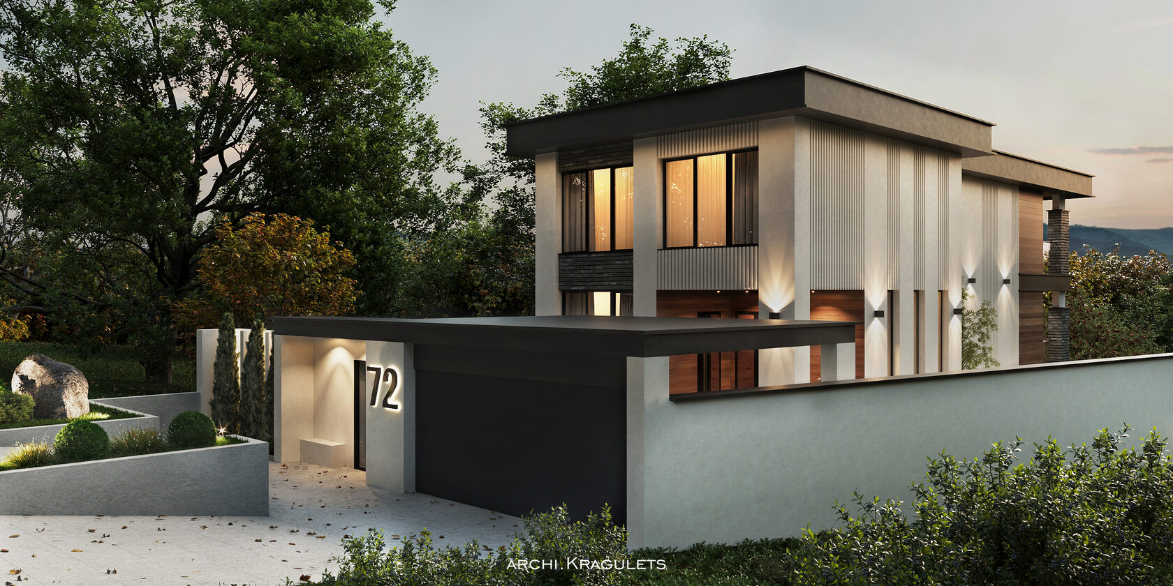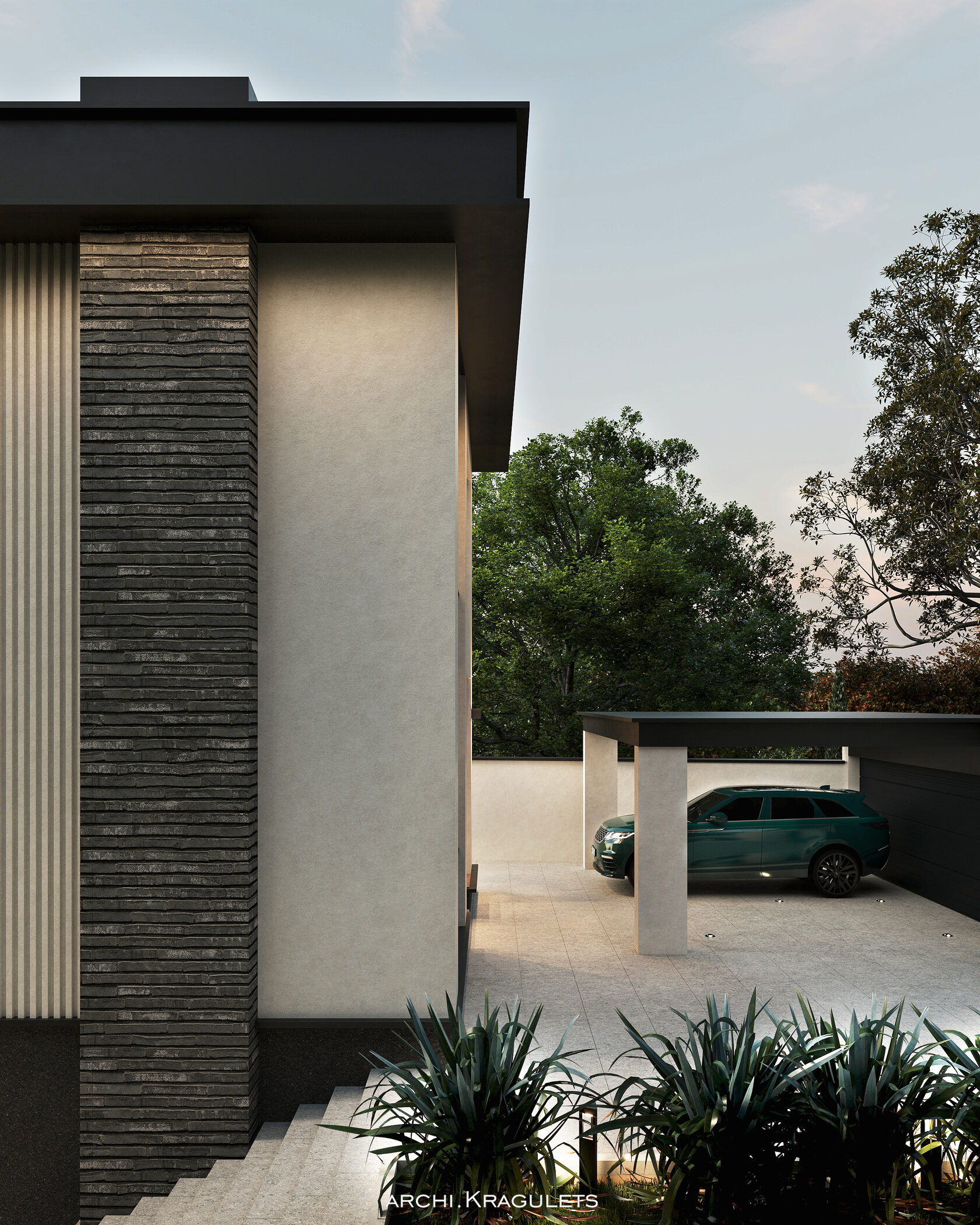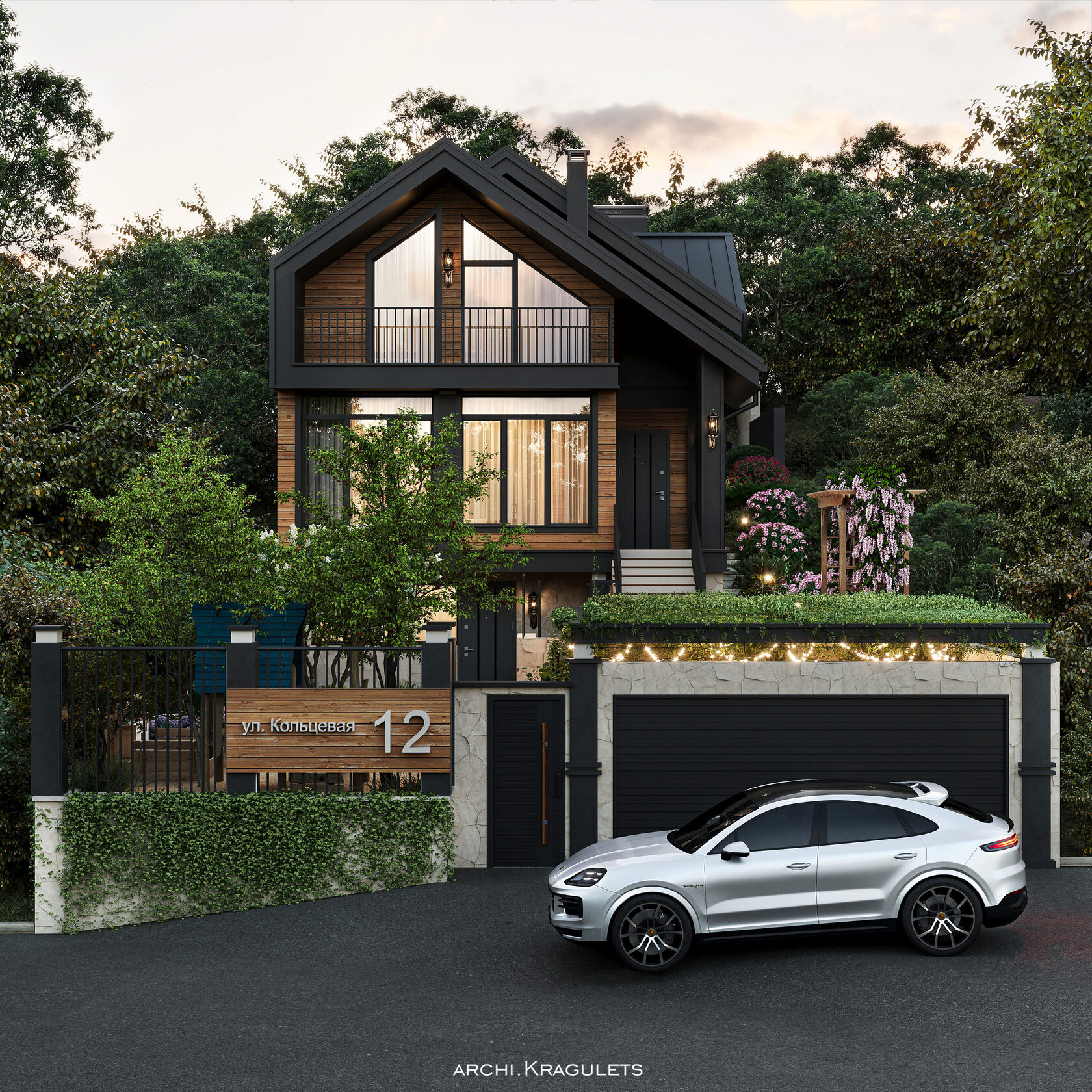 Представленный проект – это жилой коттедж, мастерски интегрированный в уникальный ландшафт с перепадом высот до 6 метров. Главной целью стало создание функционального и эстетичного пространства, гармонично взаимодействующего с природой, при этом обеспечивающего высокий уровень комфорта для проживания. Фасады дома, выполненные в чистом минималистичном стиле, дополнены выразительными акцентами арт-деко, придающими зданию исключительную индивидуальность.