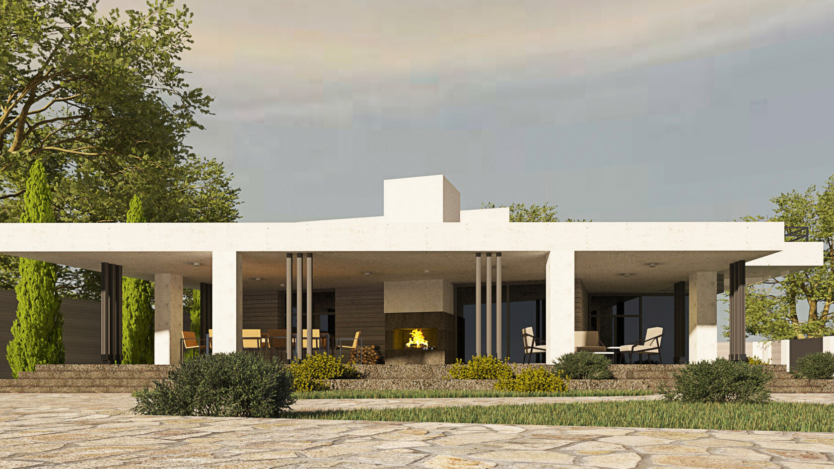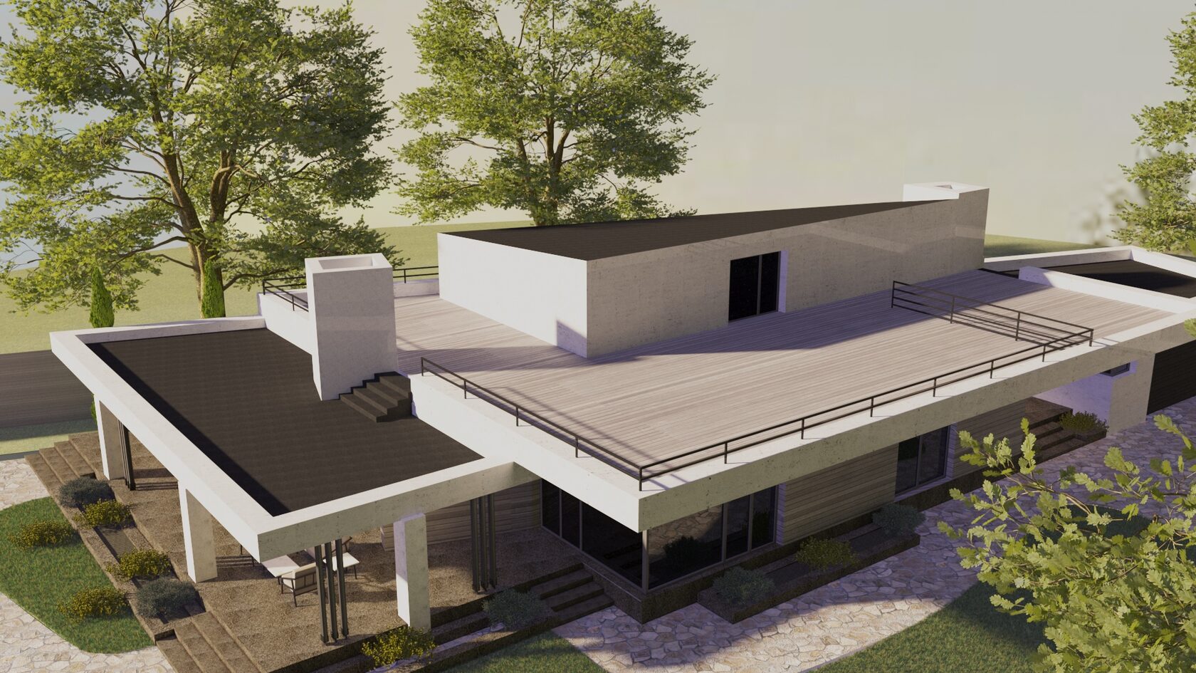Этот проект воплощает идею гармоничного слияния современного дома с окружающим лесным массивом. Архитектура, построенная на прямых линиях и геометрических формах, создает ощущение легкости и невесомости. Одноэтажное строение и невысокие формы позволили дому деликатно 'раствориться' в сложном, но живописном природном ландшафте, становясь его неотъемлемой частью.