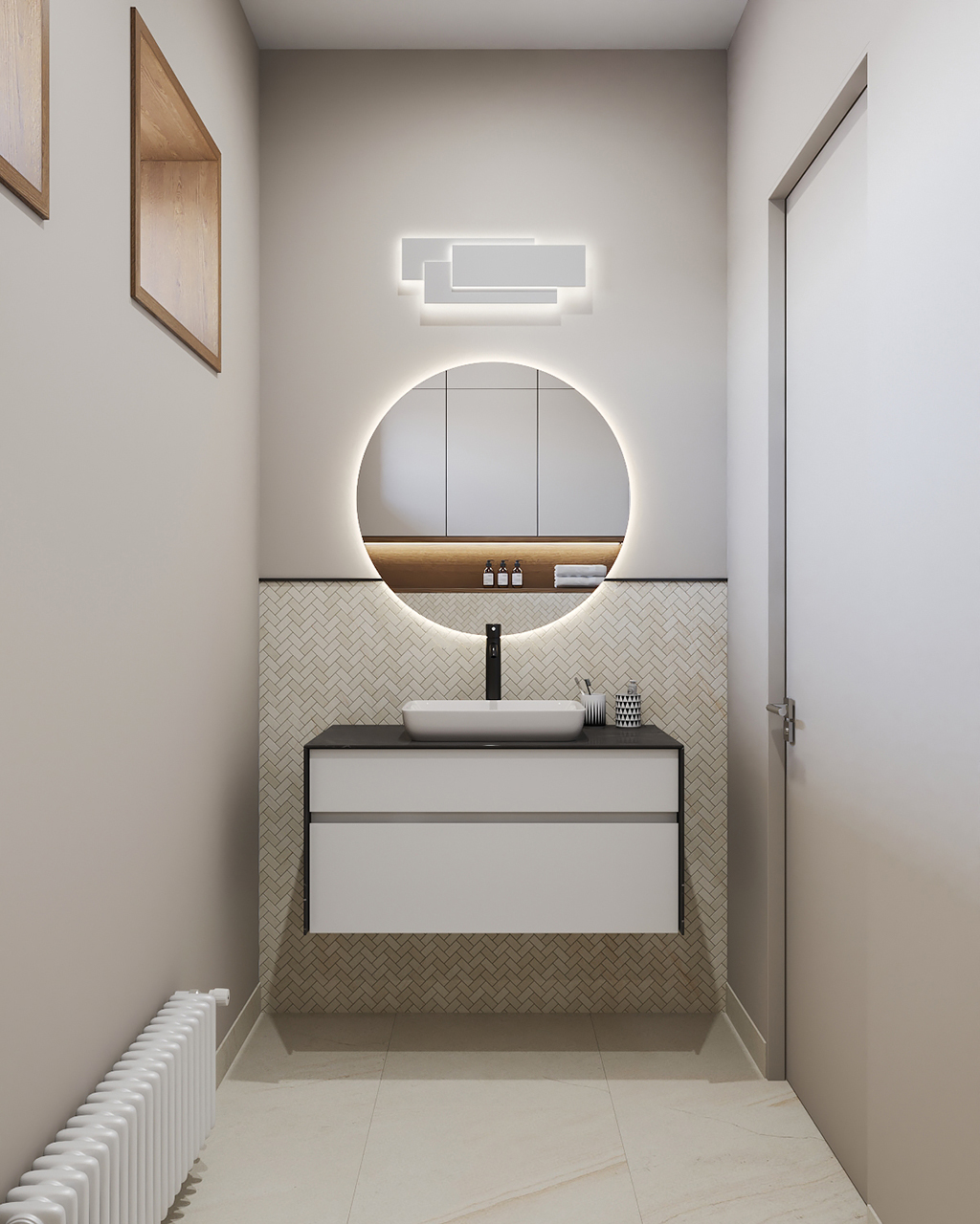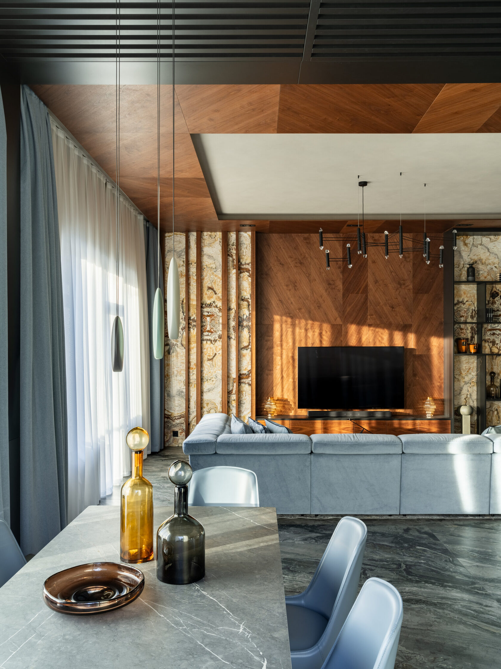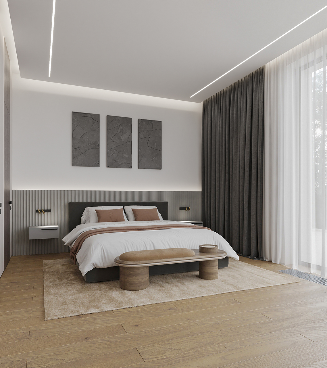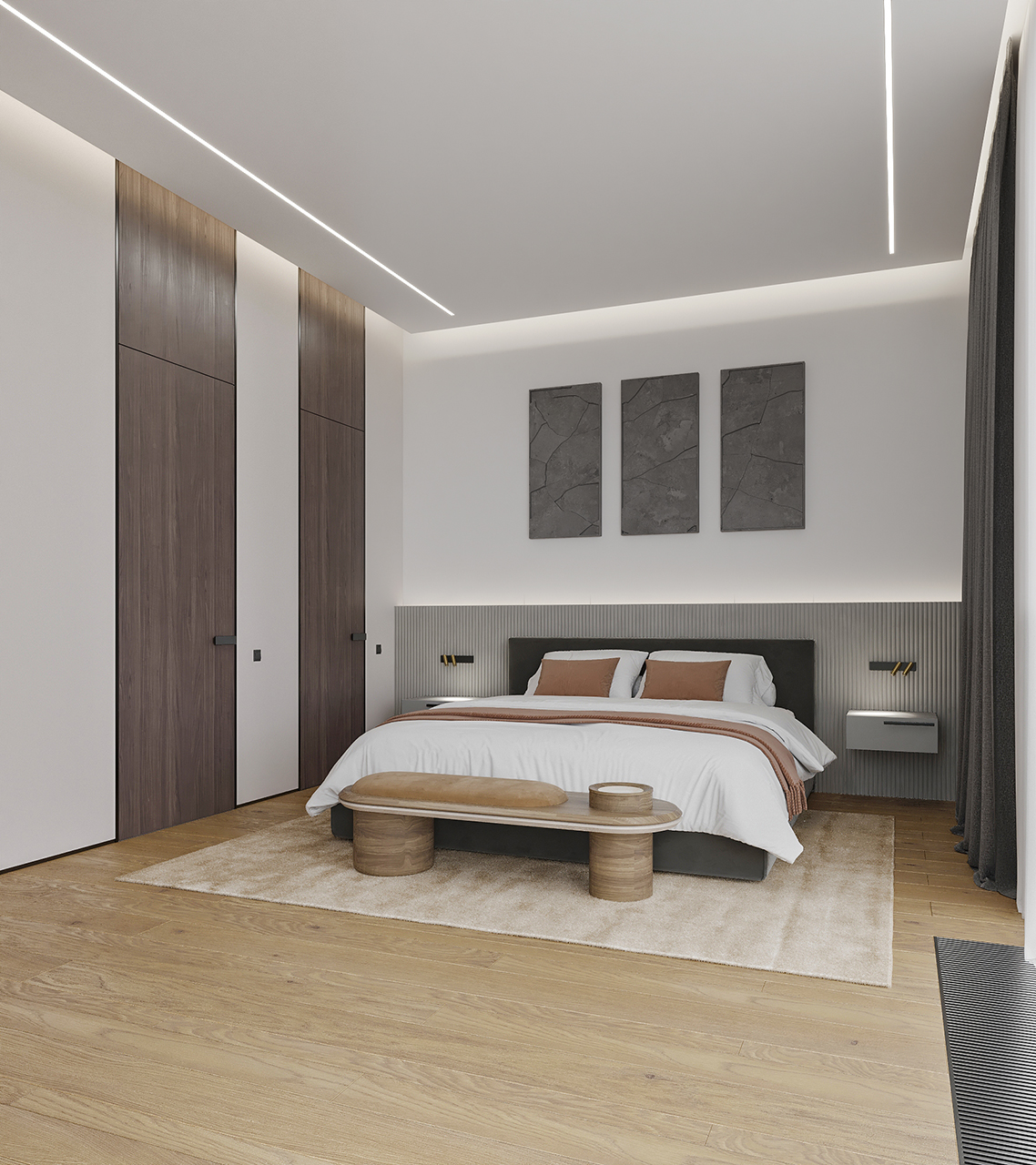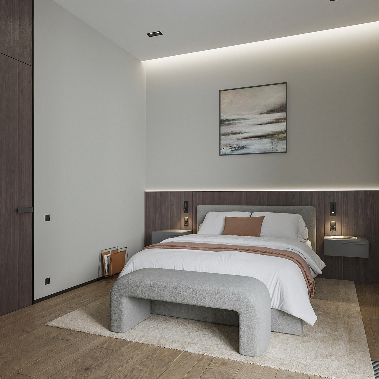 Концепция: Вневременной дизайн, сочетающий минималистичную эстетику и теплую, гостеприимную атмосферу, где пространство продумано для комфортной жизни и гармоничного распределения общественных и приватных зон.